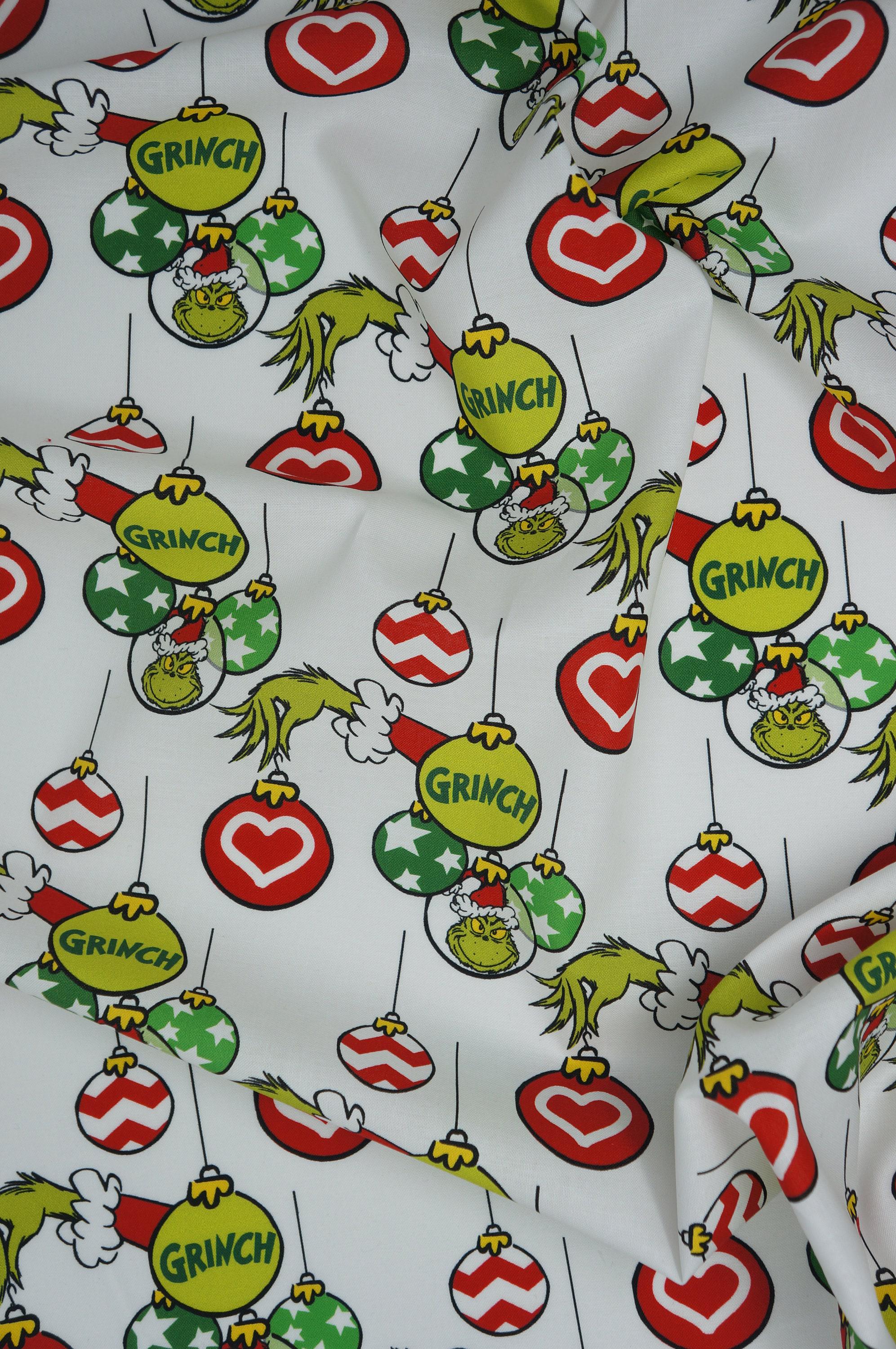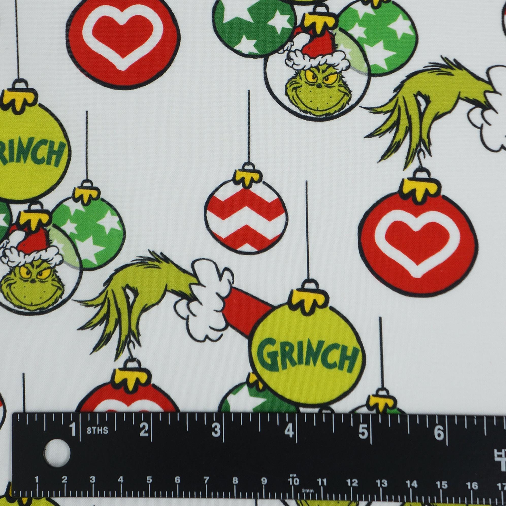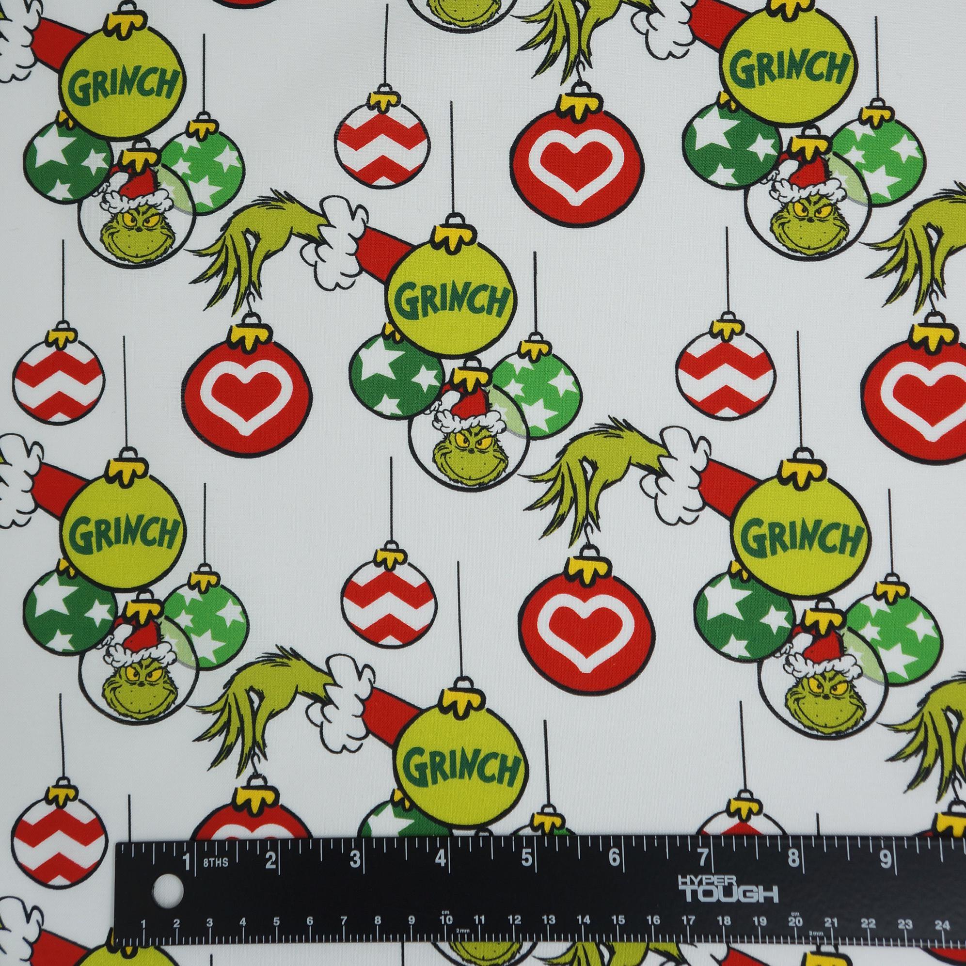 Celebrate the festive season with this adorable Grinch Holiday Ornaments on White fabric! This quilt shop quality quilting cotton fabric features colorful images of the Grinch and his friends from the classic Dr. Seuss book How the Grinch Stole Christmas. The high-quality fabric is designed by Robert Kaufman and has a soft and smooth texture. Whether you want to make a quilt, a pillow, a table runner, or a gift bag, this fabric will add some whimsy and cheer to your projects. Don't let the Grinch steal your holiday spirit - order this fabric today and enjoy the magic of Dr. Seuss!