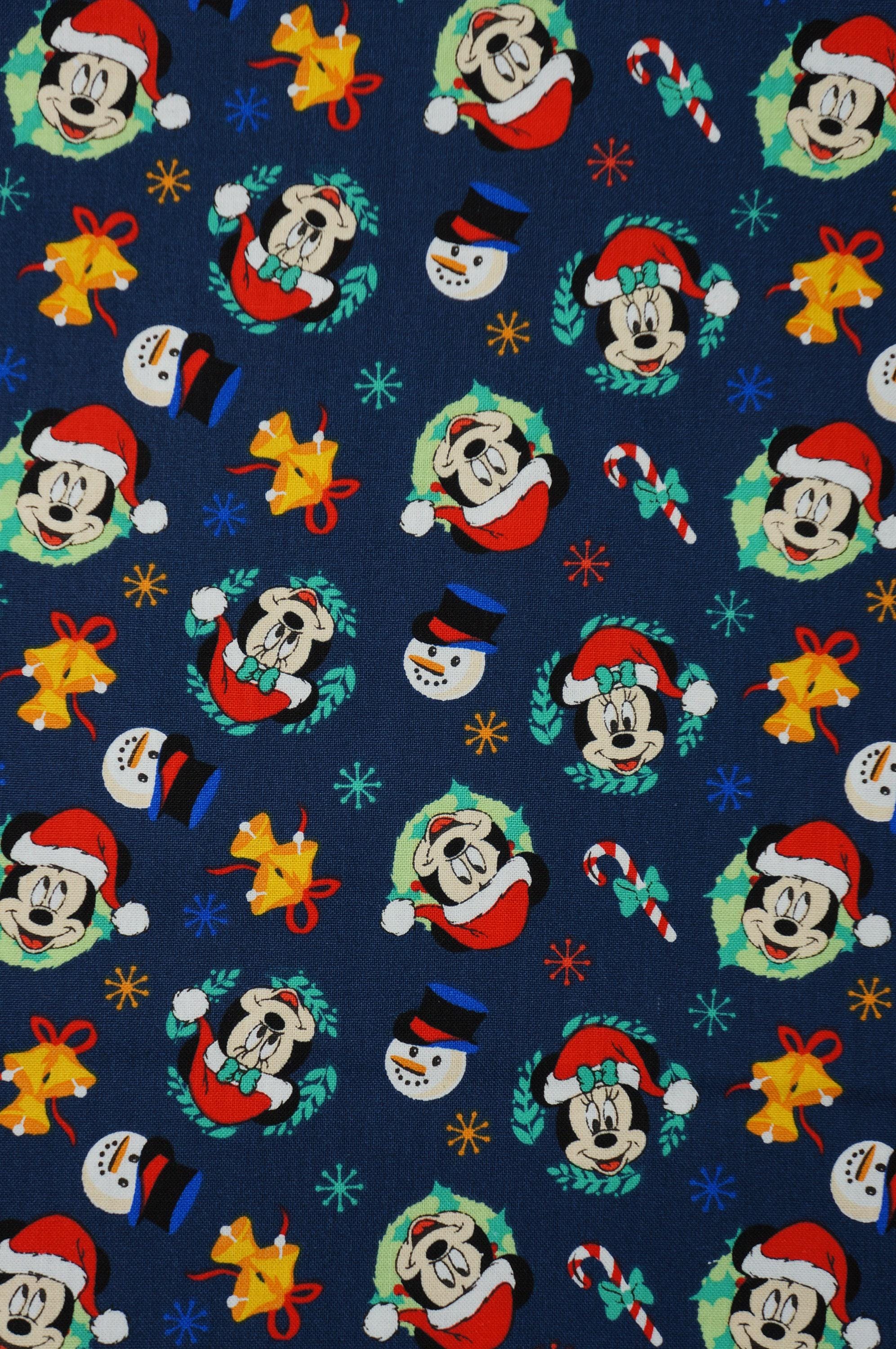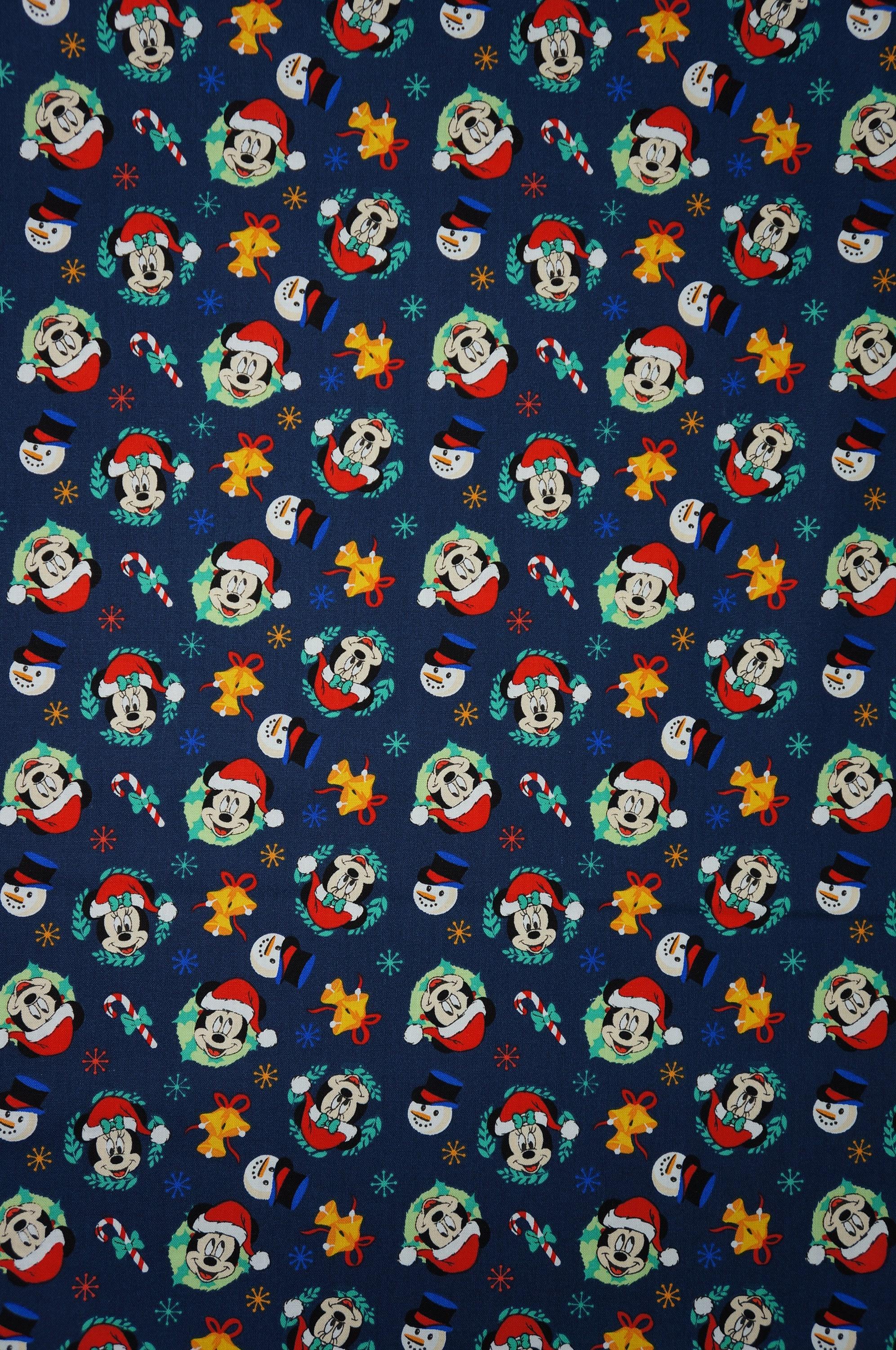 Celebrate the festive season with this adorable Disney Licensed by Camelot Fabrics Christmas Quilting Cotton Fabric. It features Minnie, Mickey and Snowman Heads on a dark blue background with tossed candy canes snowflakes and bells. This 100% Cotton quilt shop quality fabric is perfect for making quilts, pillows, table runners, stockings and more. You'll love the joy and magic that this fabric brings to your home.