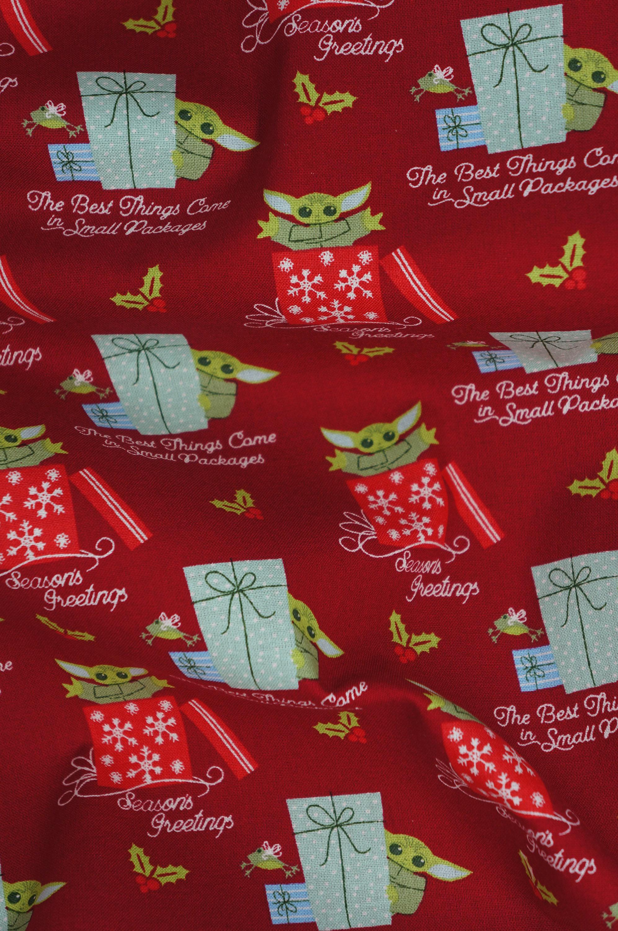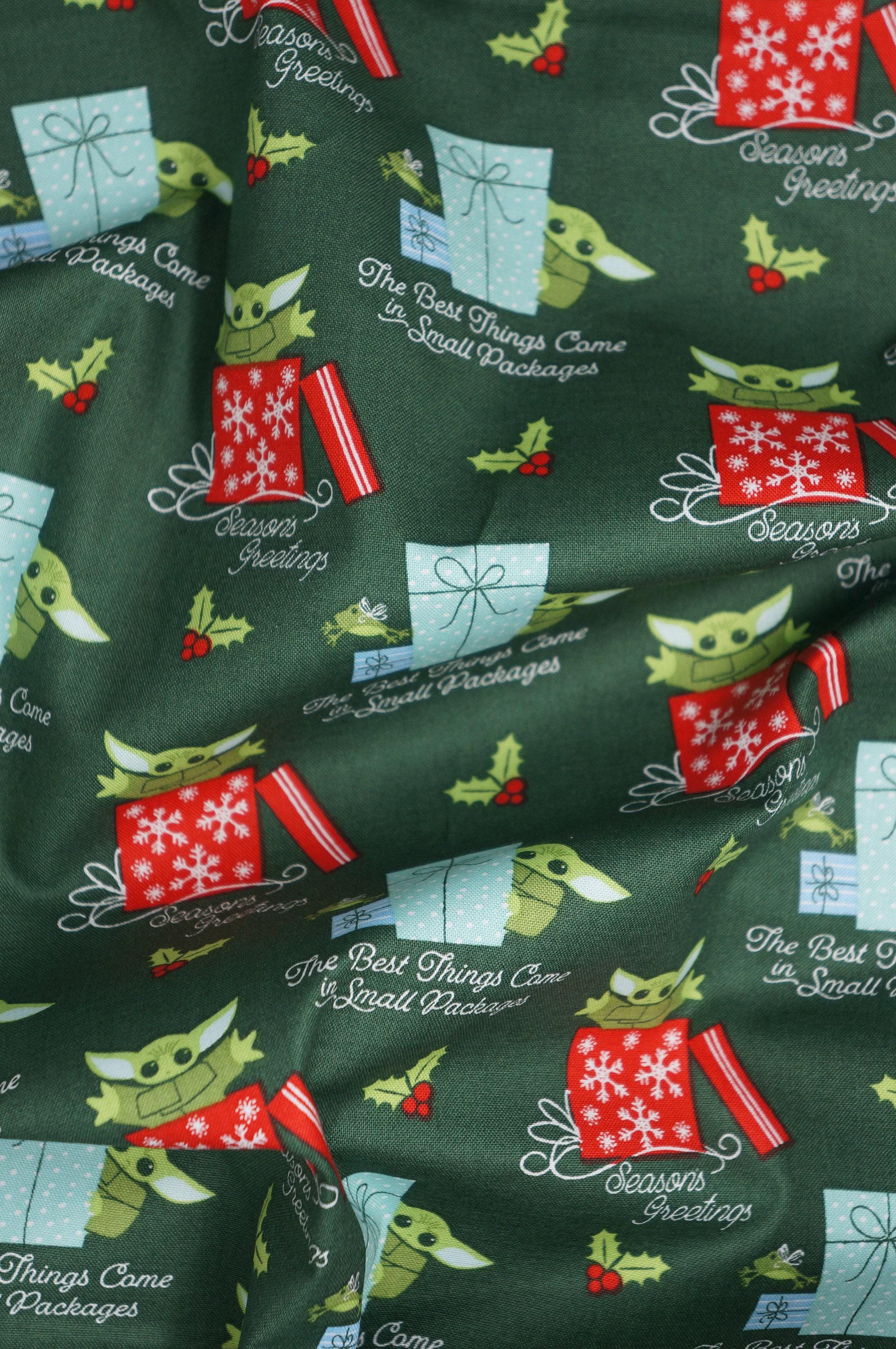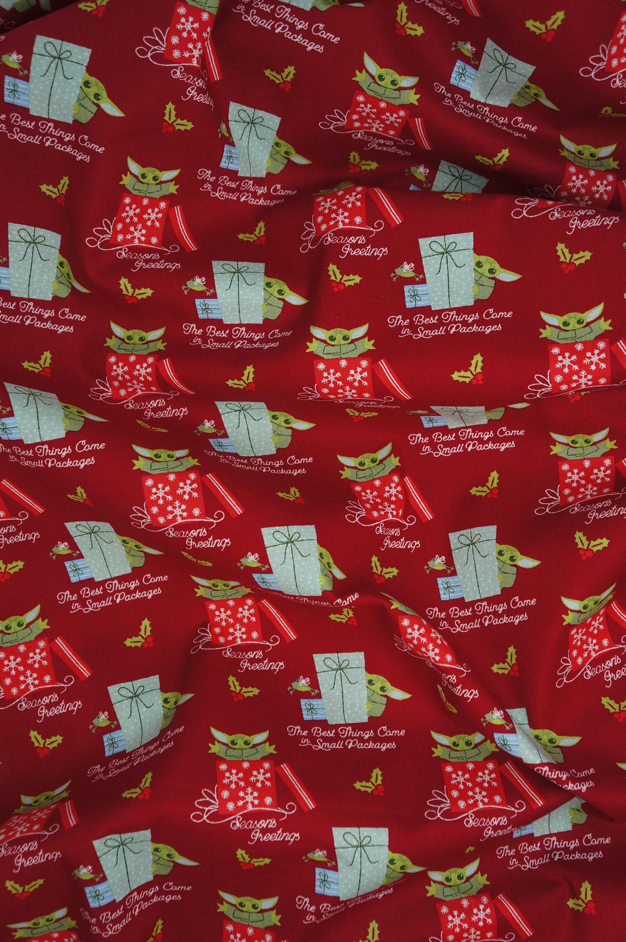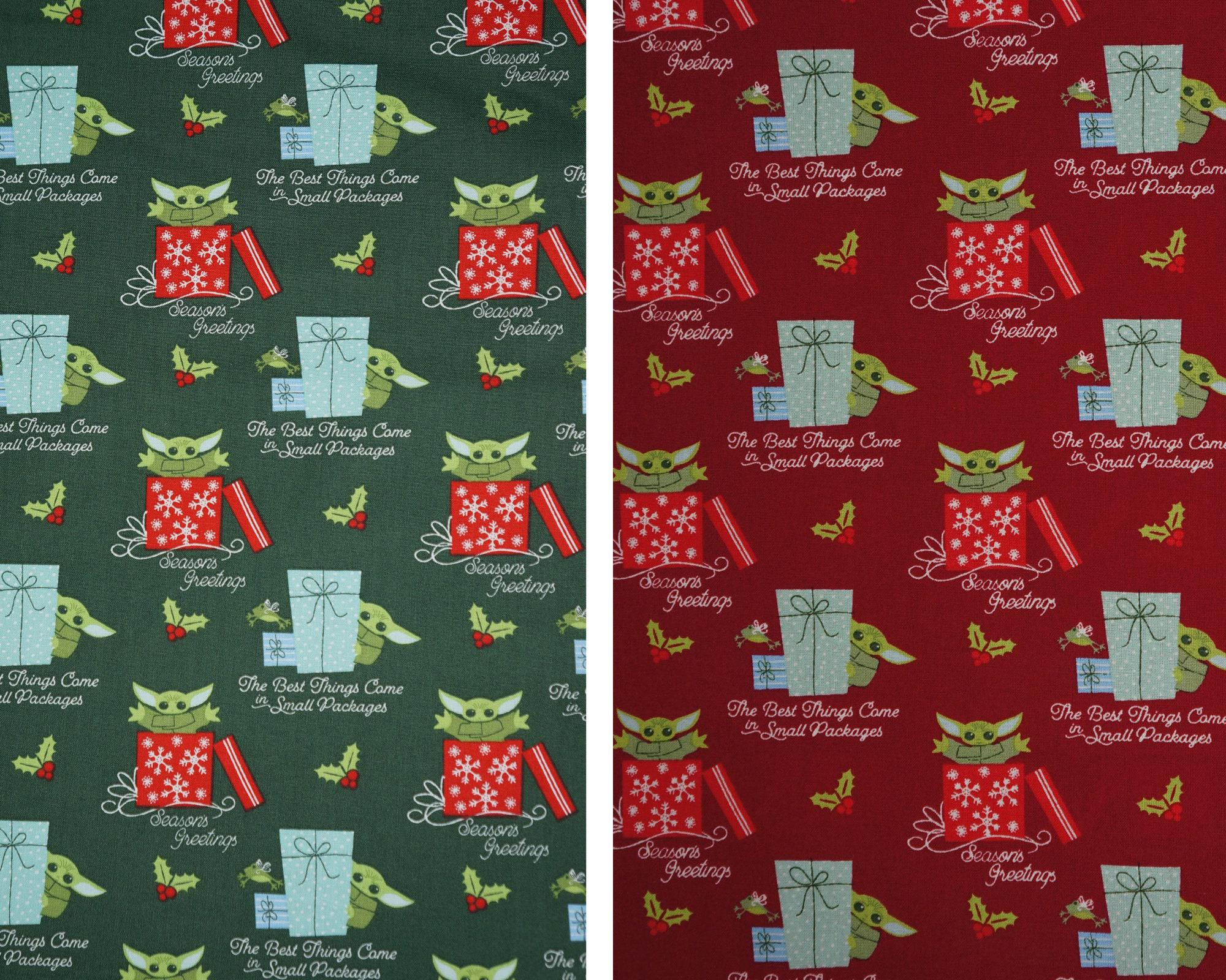 If you love Star Wars and Baby Yoda, you will adore this fabric! It features the adorable Child from The Mandalorian in festive packages and hiding behind holiday gifts. This fabric is 100% cotton and licensed by Camelot Fabrics. It comes in green or red background and is perfect for quilting, crafting, or decorating your home for Christmas. You can make a cozy blanket, a cute pillow, a fun stocking, or a whimsical wall hanging with this fabric. Celebrate the holidays with Baby Yoda and Star Wars!