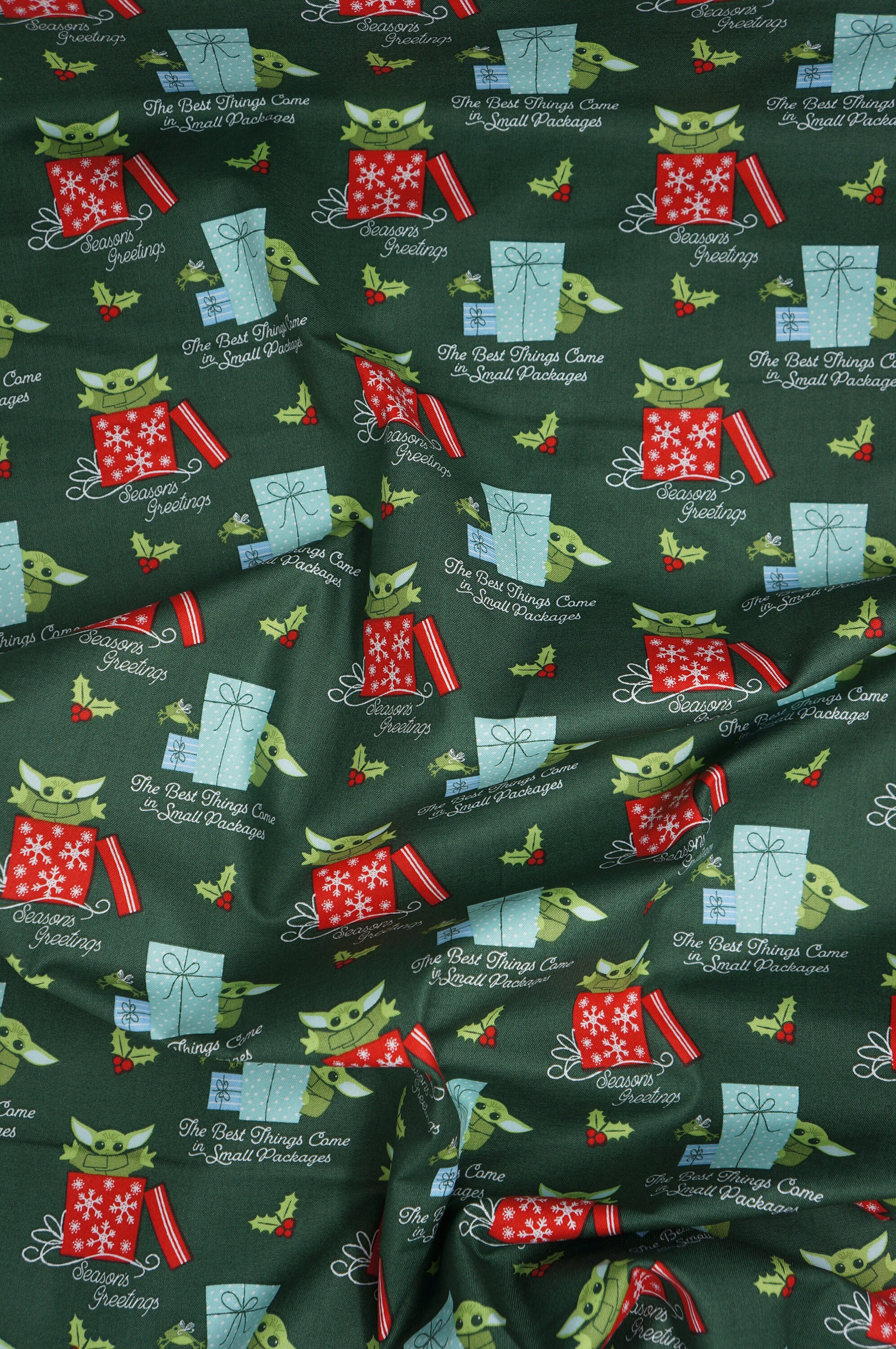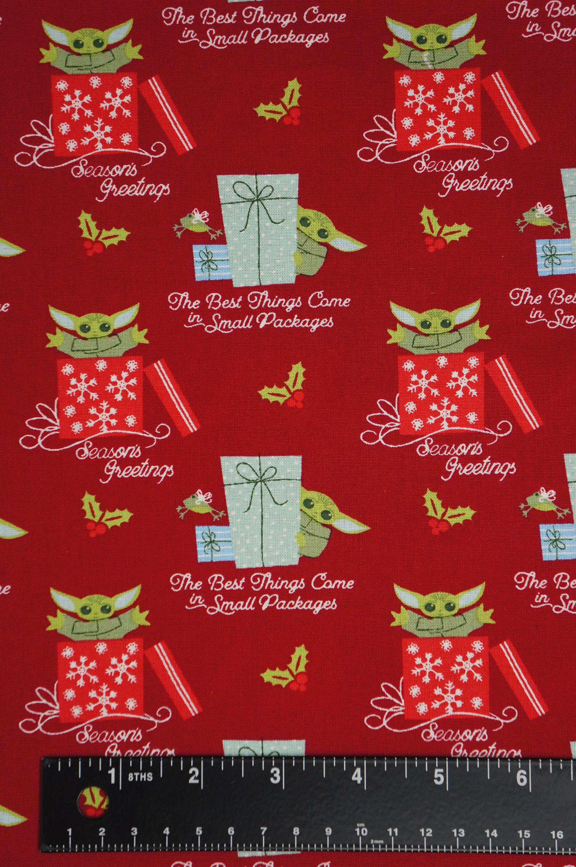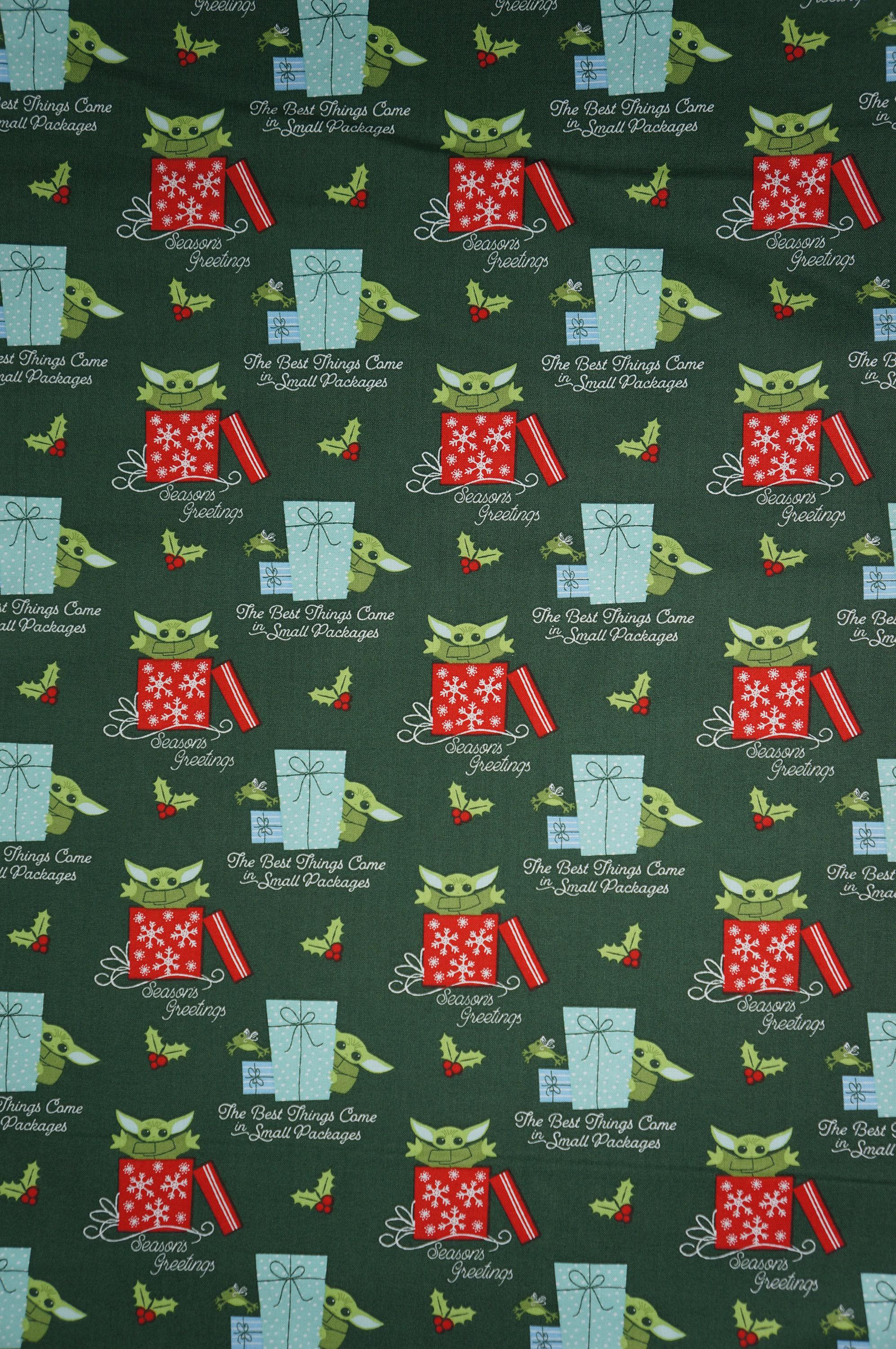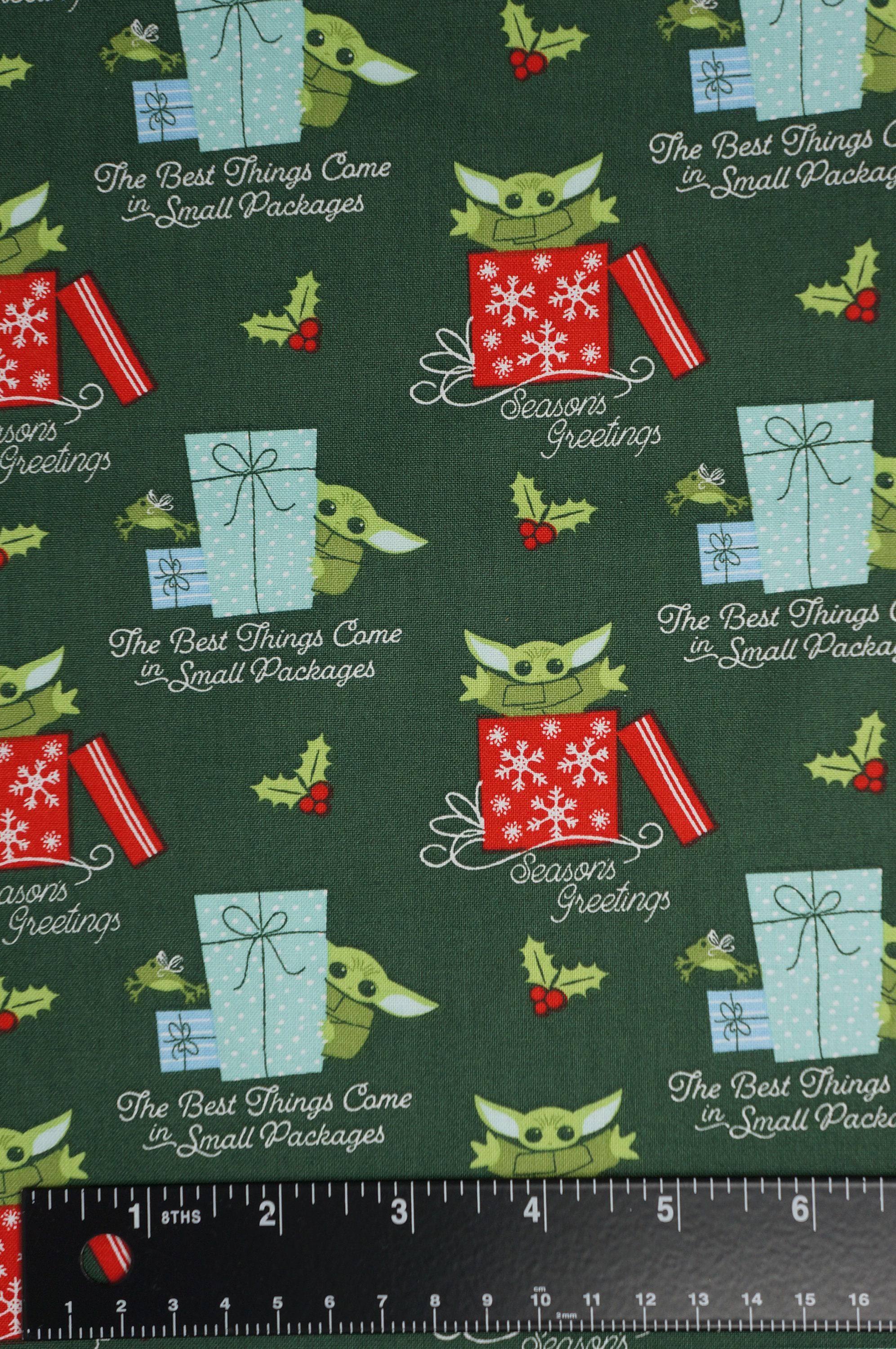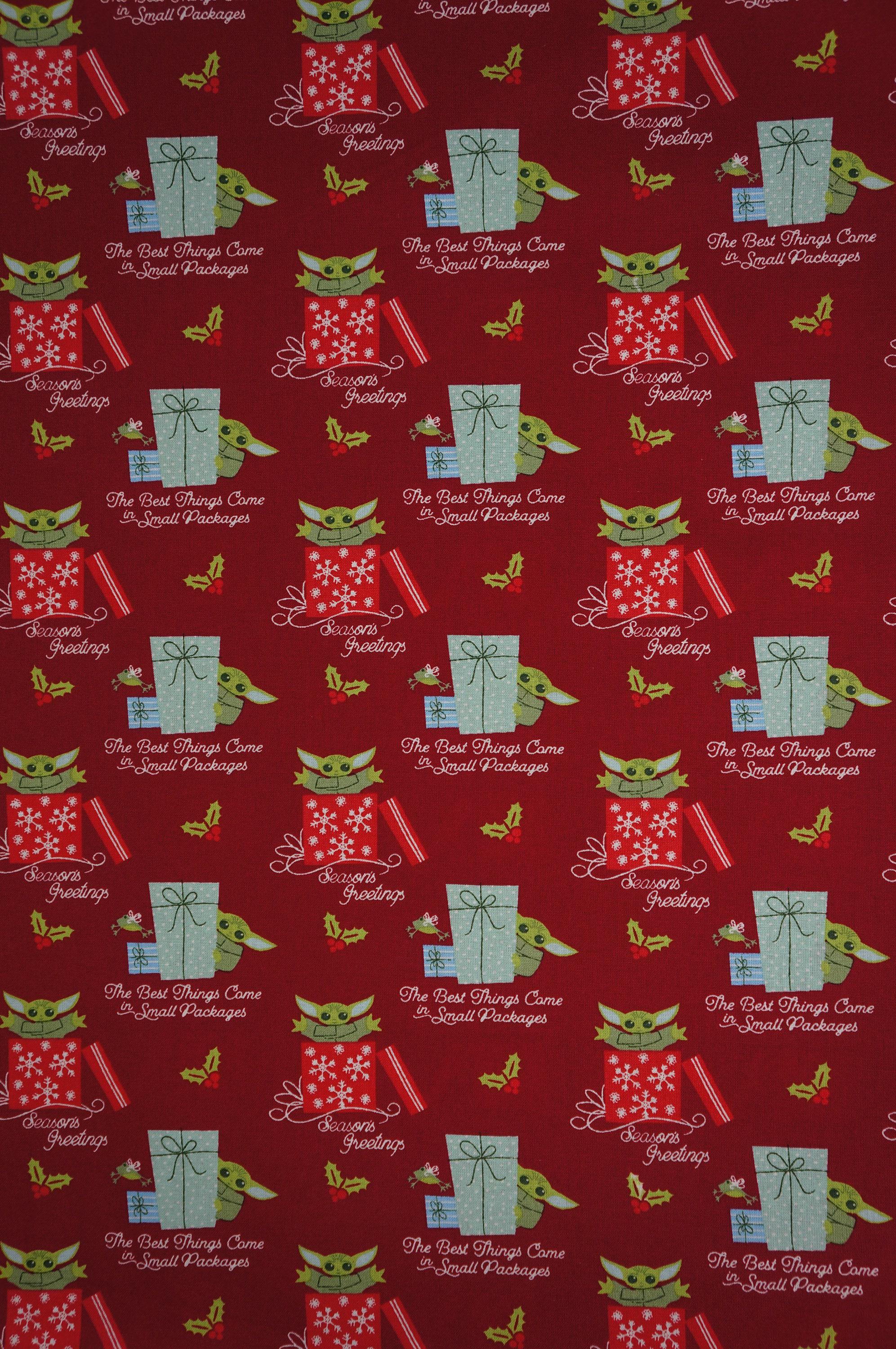 If you love Star Wars and Baby Yoda, you will adore this fabric! It features the adorable Child from The Mandalorian in festive packages and hiding behind holiday gifts. This fabric is 100% cotton and licensed by Camelot Fabrics. It comes in green or red background and is perfect for quilting, crafting, or decorating your home for Christmas. You can make a cozy blanket, a cute pillow, a fun stocking, or a whimsical wall hanging with this fabric. Celebrate the holidays with Baby Yoda and Star Wars!