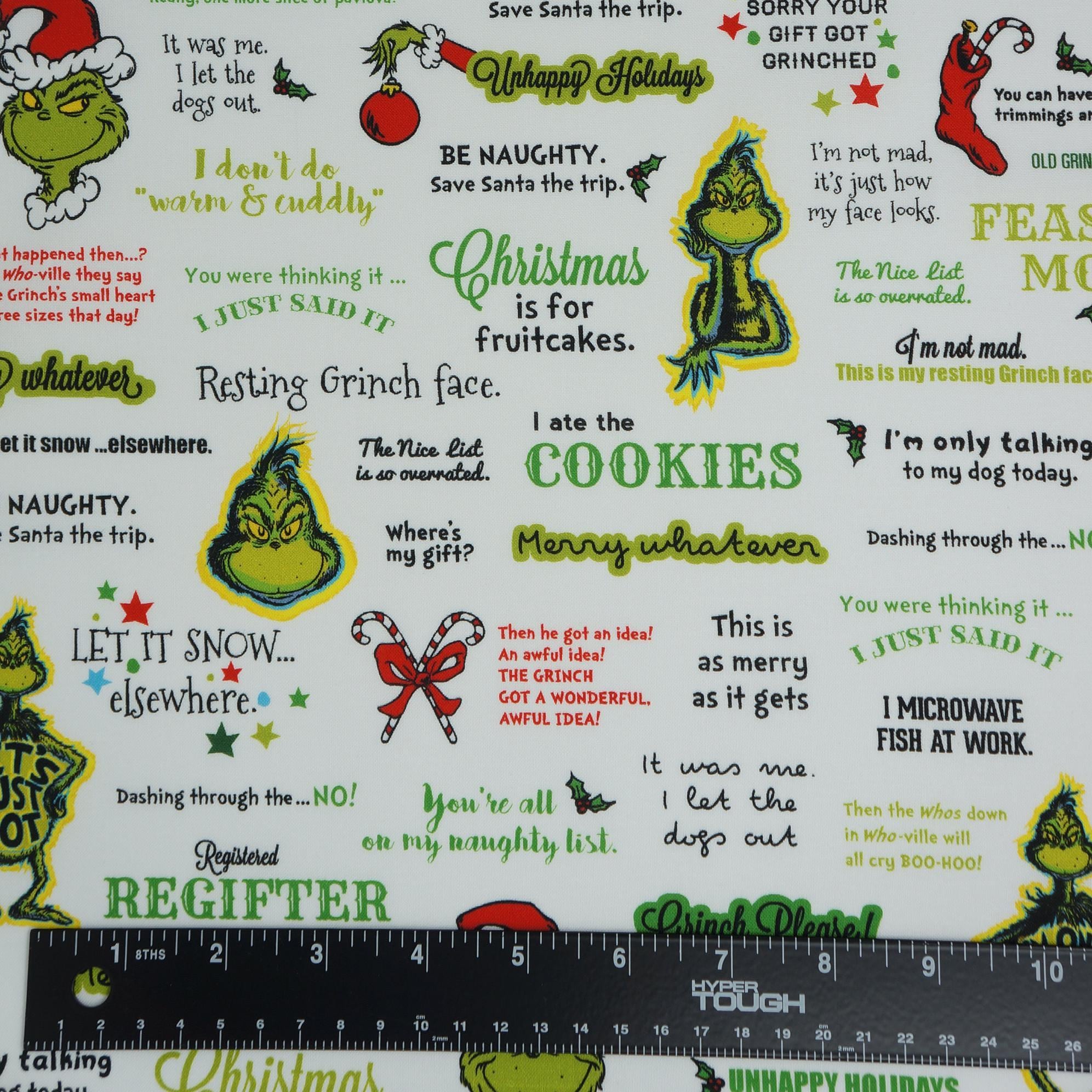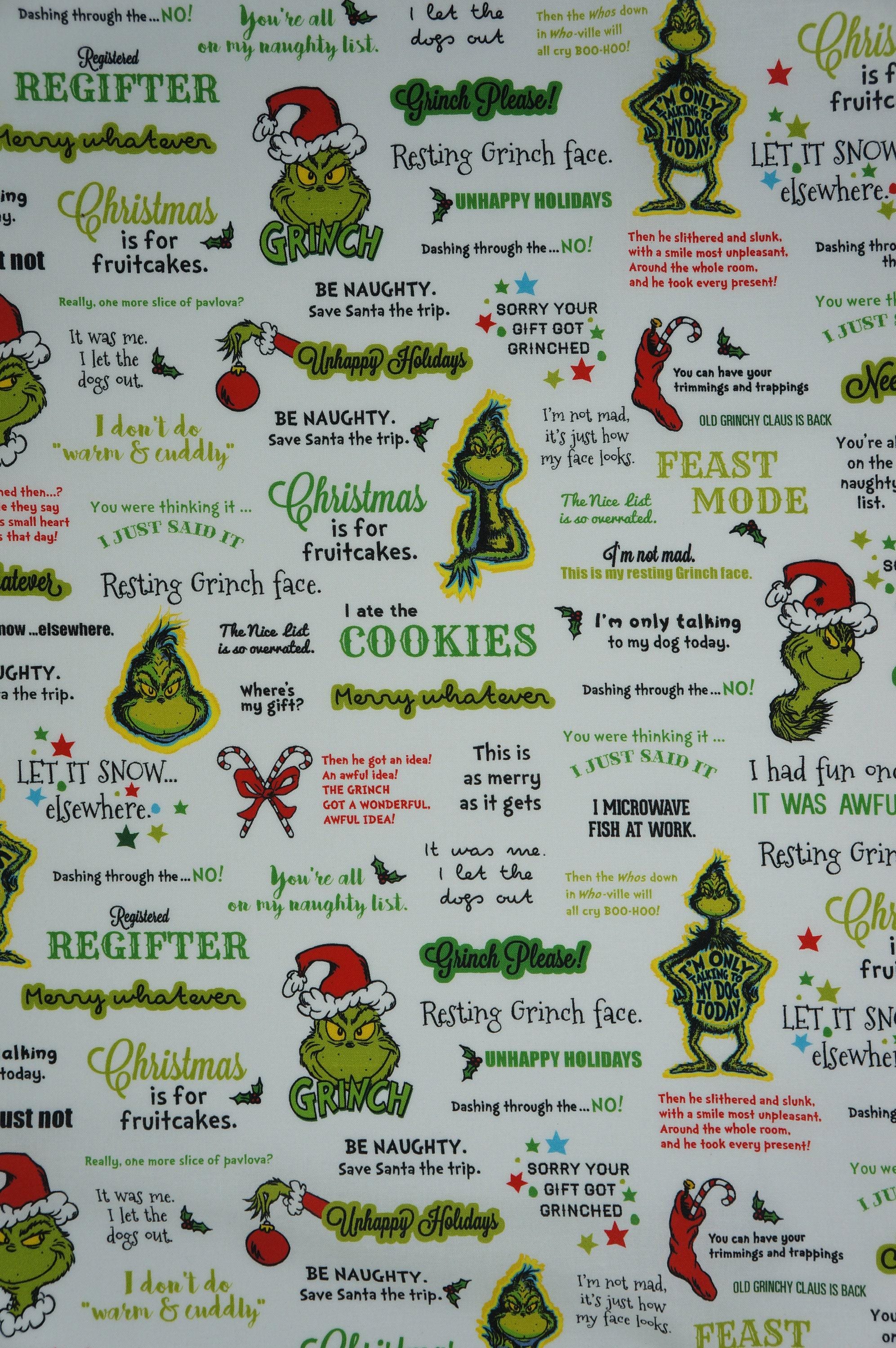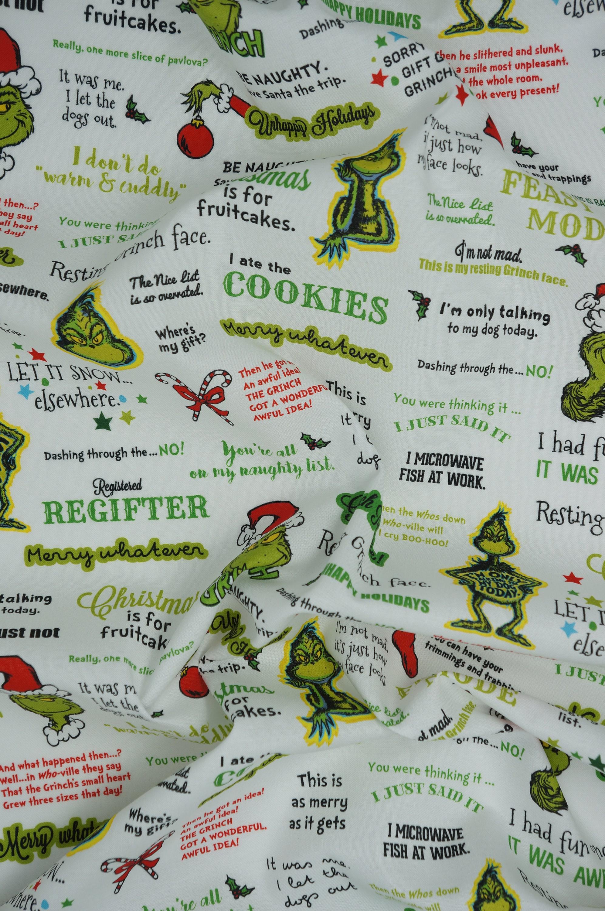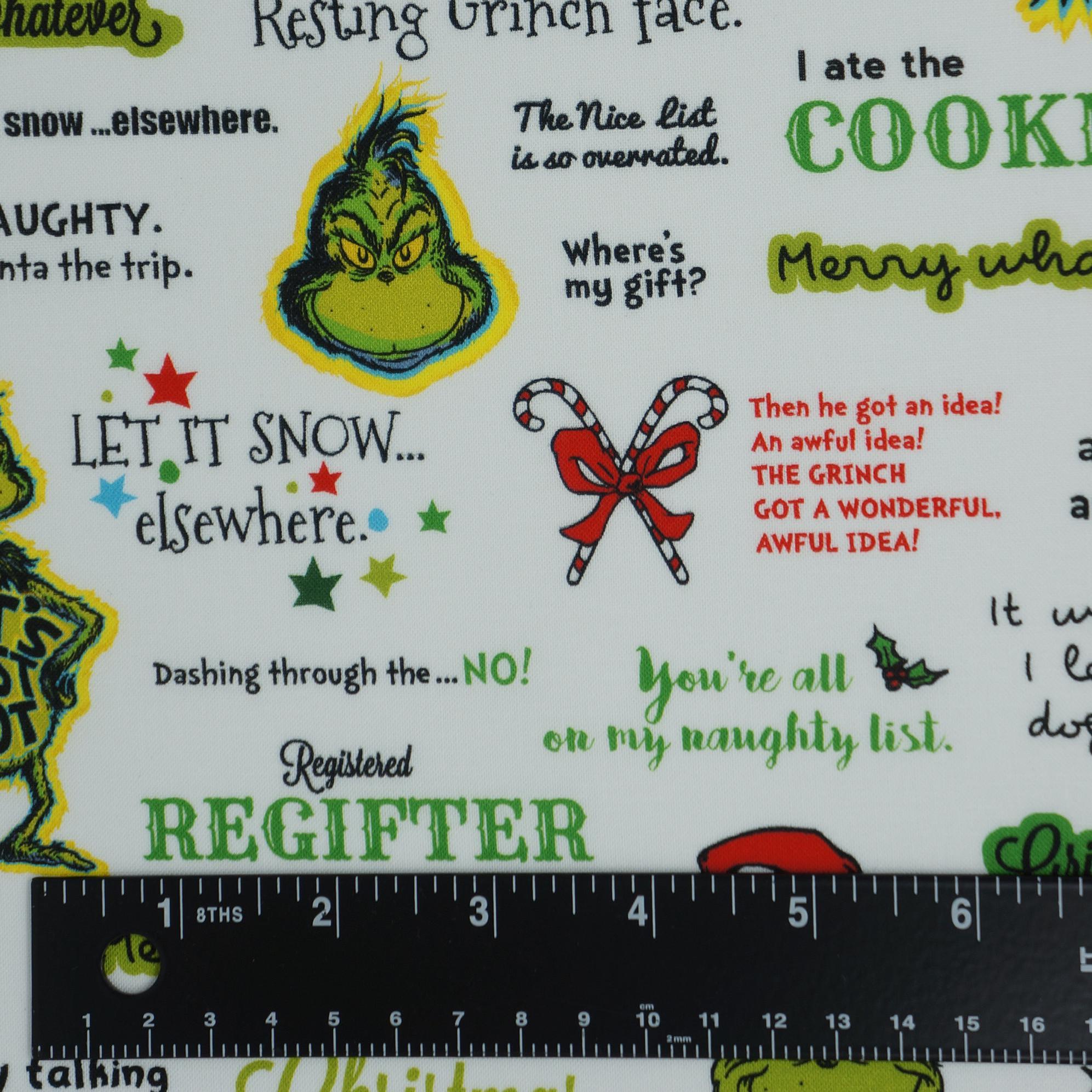 If you love the Grinch and his grumpy ways, you will love this Grinchy Words on White Dr. Seuss How the Grinch Stole Christmas Licensed Quilting Cotton Fabric by Robert Kaufman. This fabric features words and phrases such as "Resting Grinch Face", "Registerd Regifter", and "I don't do warm & cuddly." The fabric also has images of the Grinch in his Santa hat, ready to steal Christmas from the Whos. This fabric is perfect for making quilts, pillows, bags, or any other festive project that celebrates the true meaning of Christmas. You can also use it to wrap your gifts and surprise your friends and family with some Grinchy humor. This fabric is 100% Quilt Shop Quality cotton and measures 44 inches wide. It is sold by the yard and comes in a bright white color that contrasts with the green and red of the Grinch. Order yours today and have a merry Grinchmas!