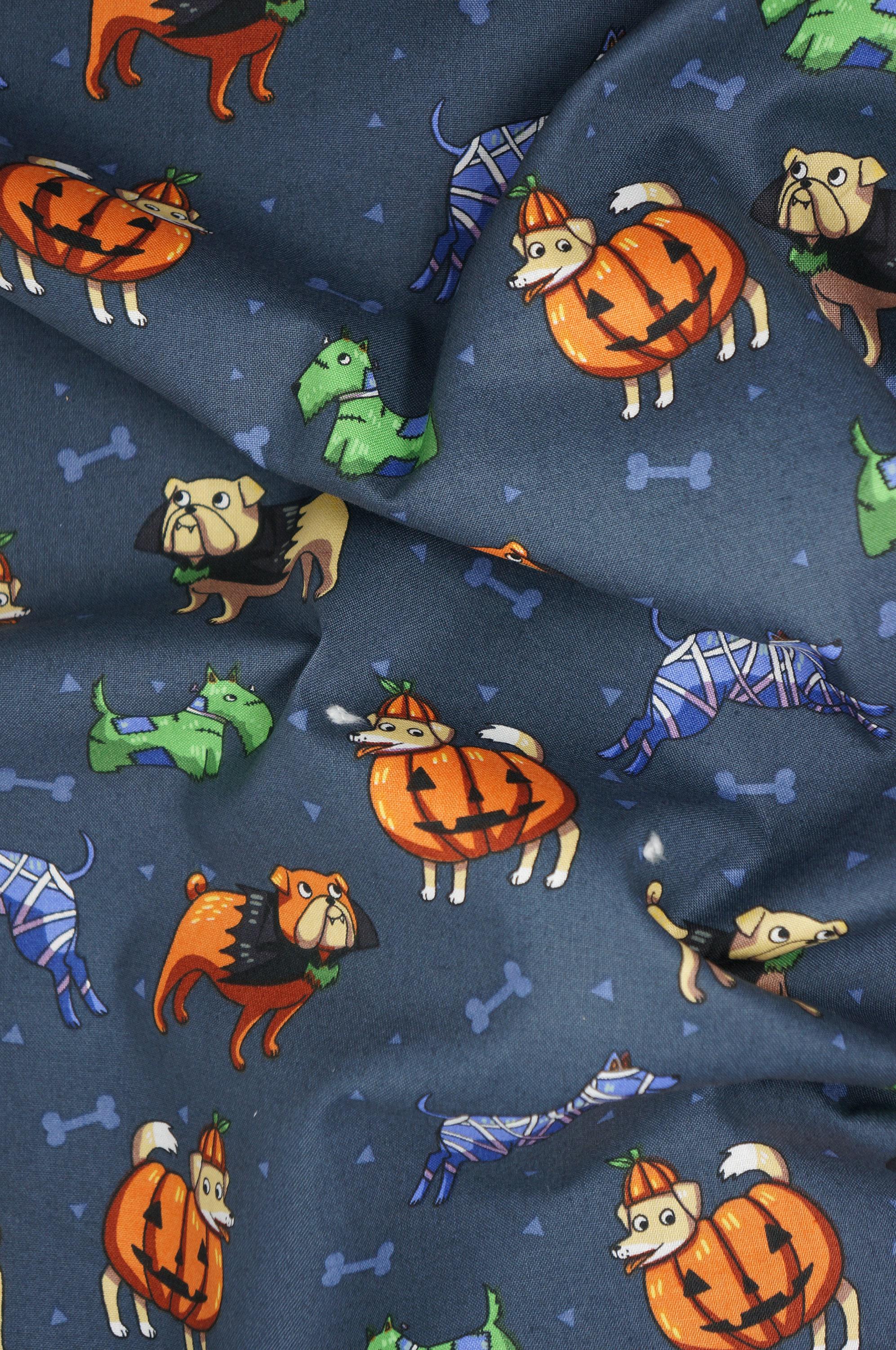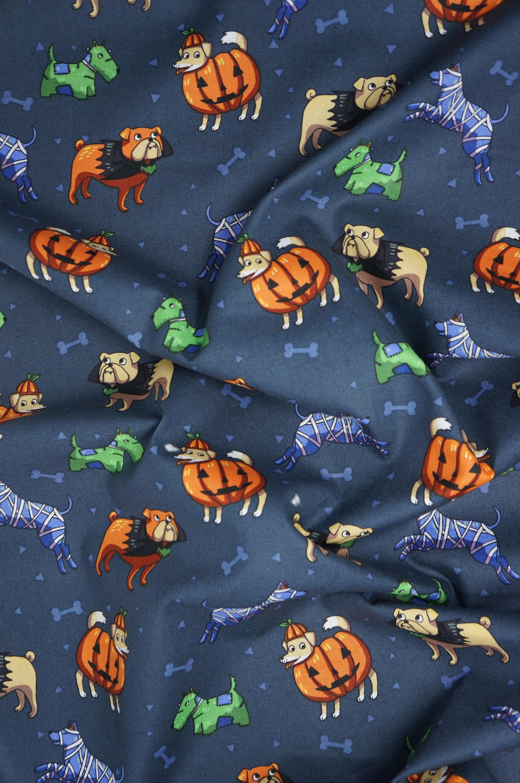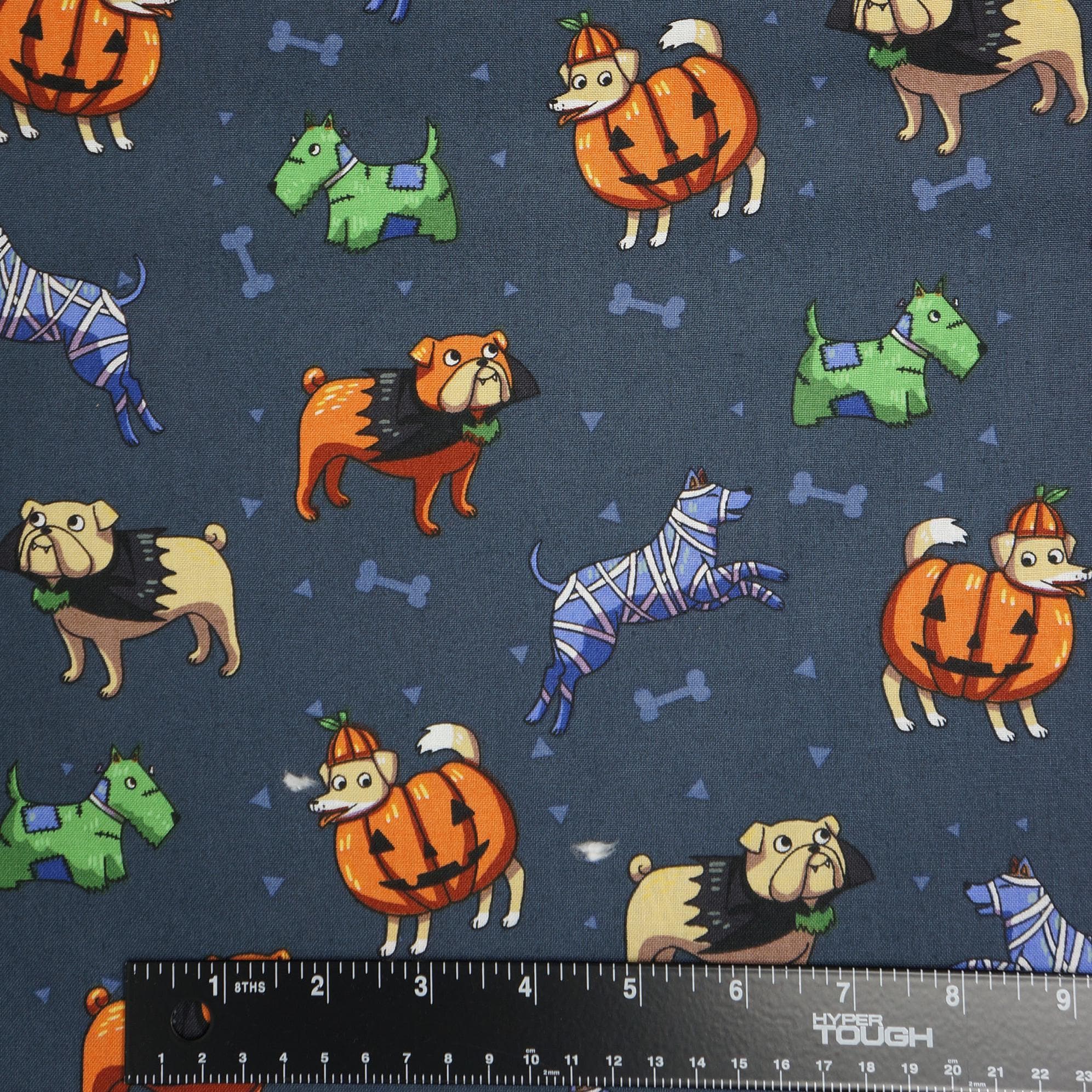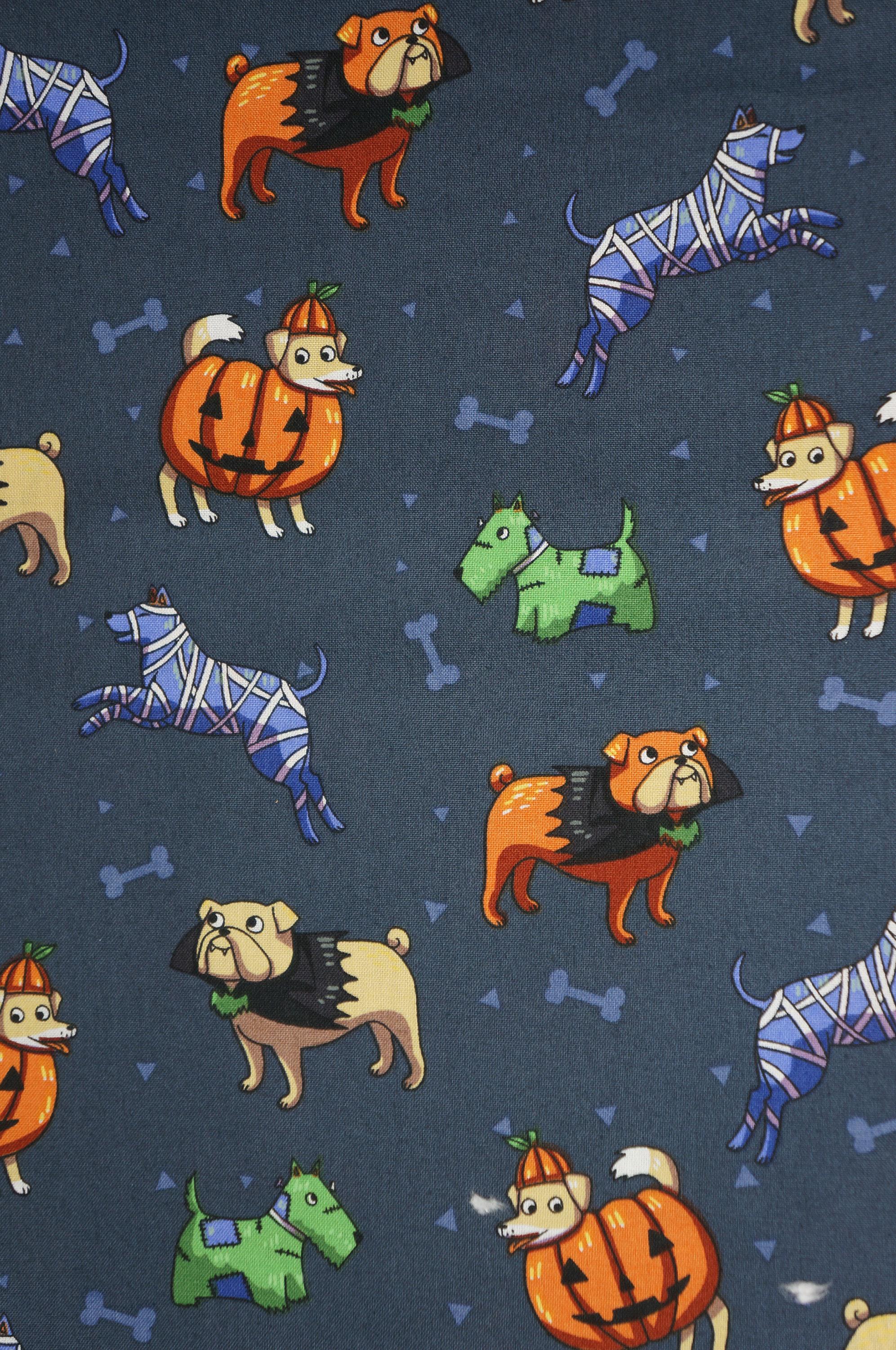 If you love dogs and Halloween, you will adore this novelty cotton fabric featuring dogs in costumes on a navy background. You can see Dracula dog, mummy dog, costume dog and pumpkin dog having fun and looking cute. This fabric is perfect for making quilts, pillows, bags, masks and more. It is soft, durable and easy to sew. Treat yourself or your dog-loving friends with this fun and festive fabric!