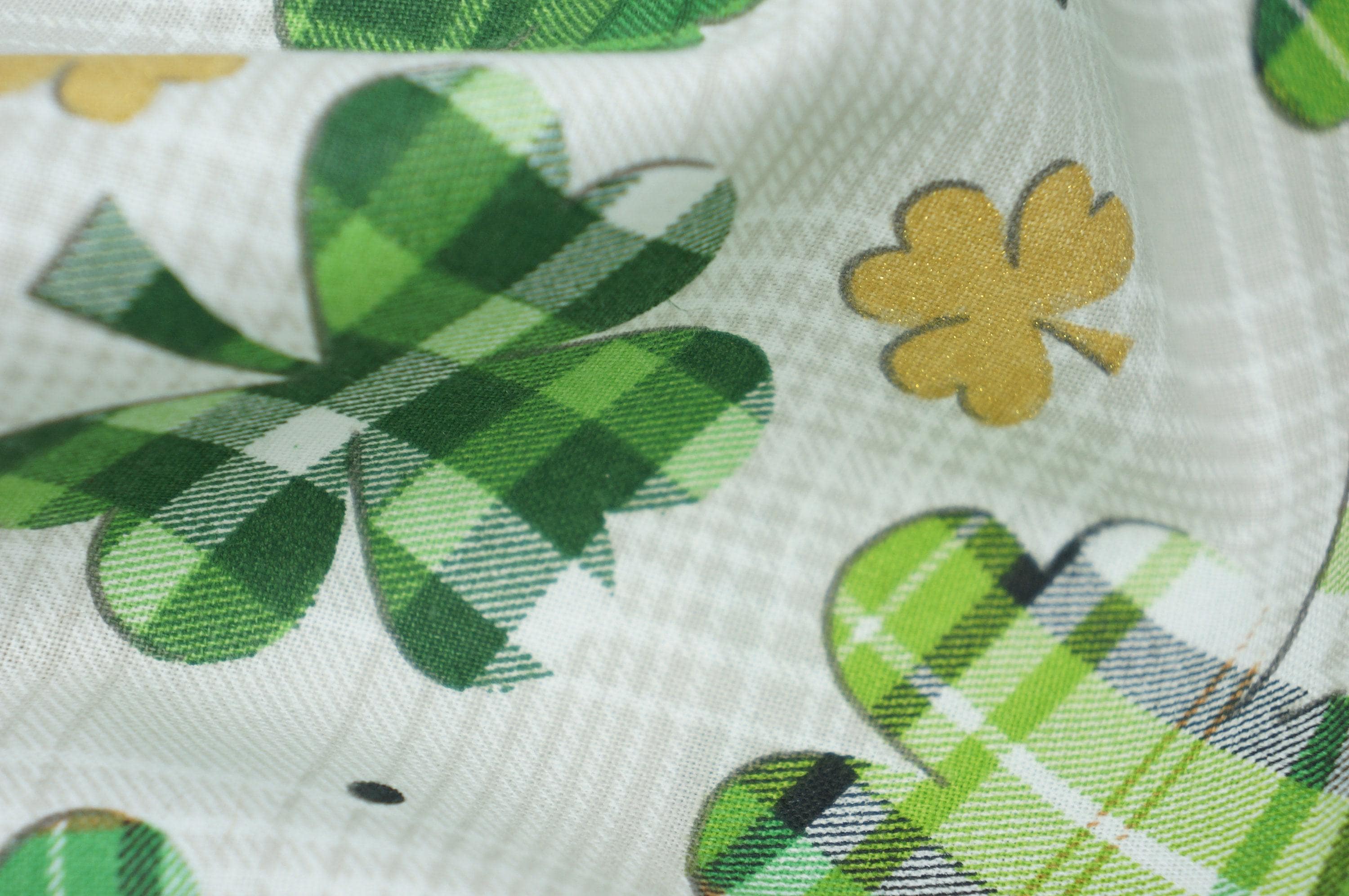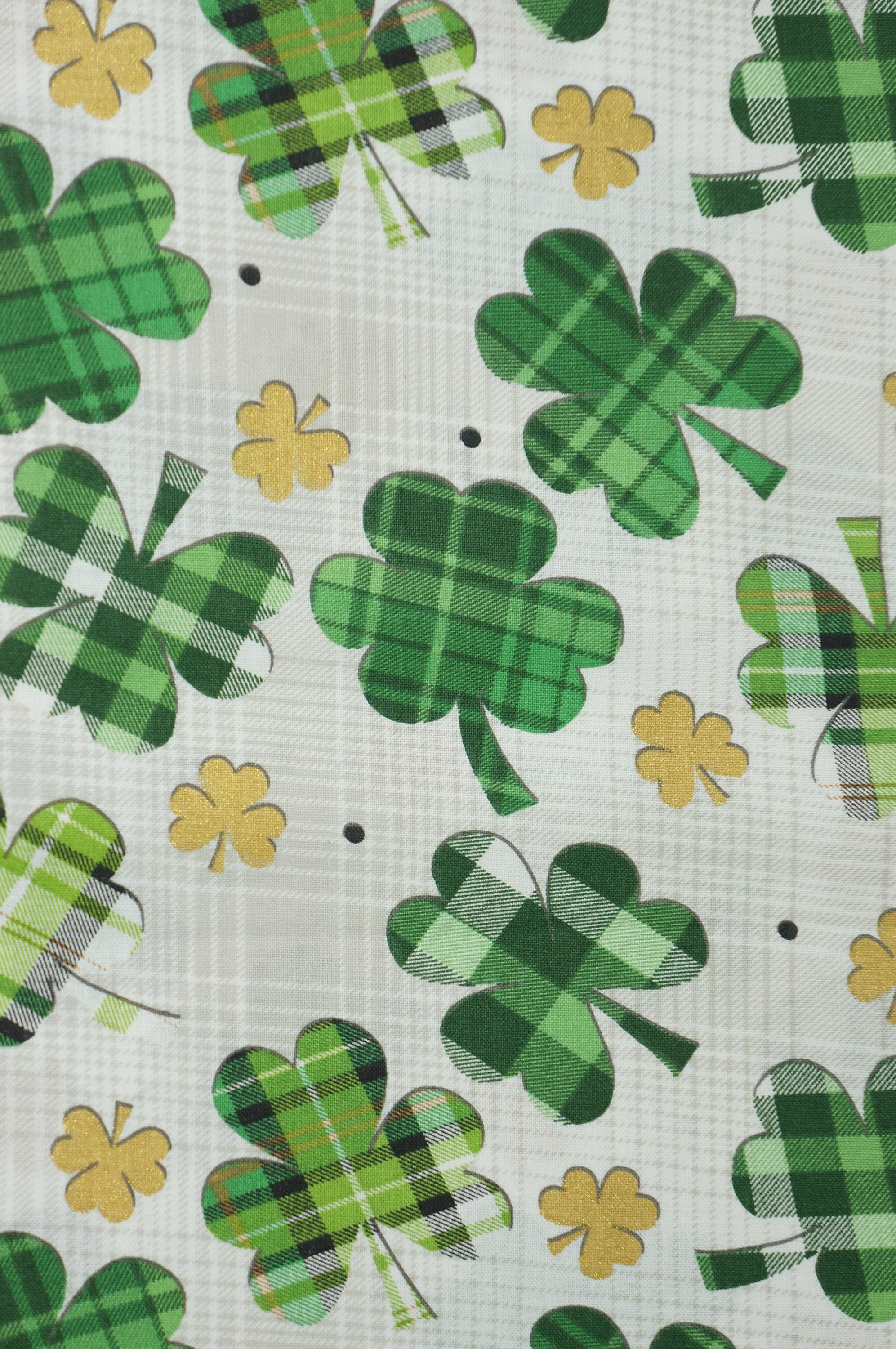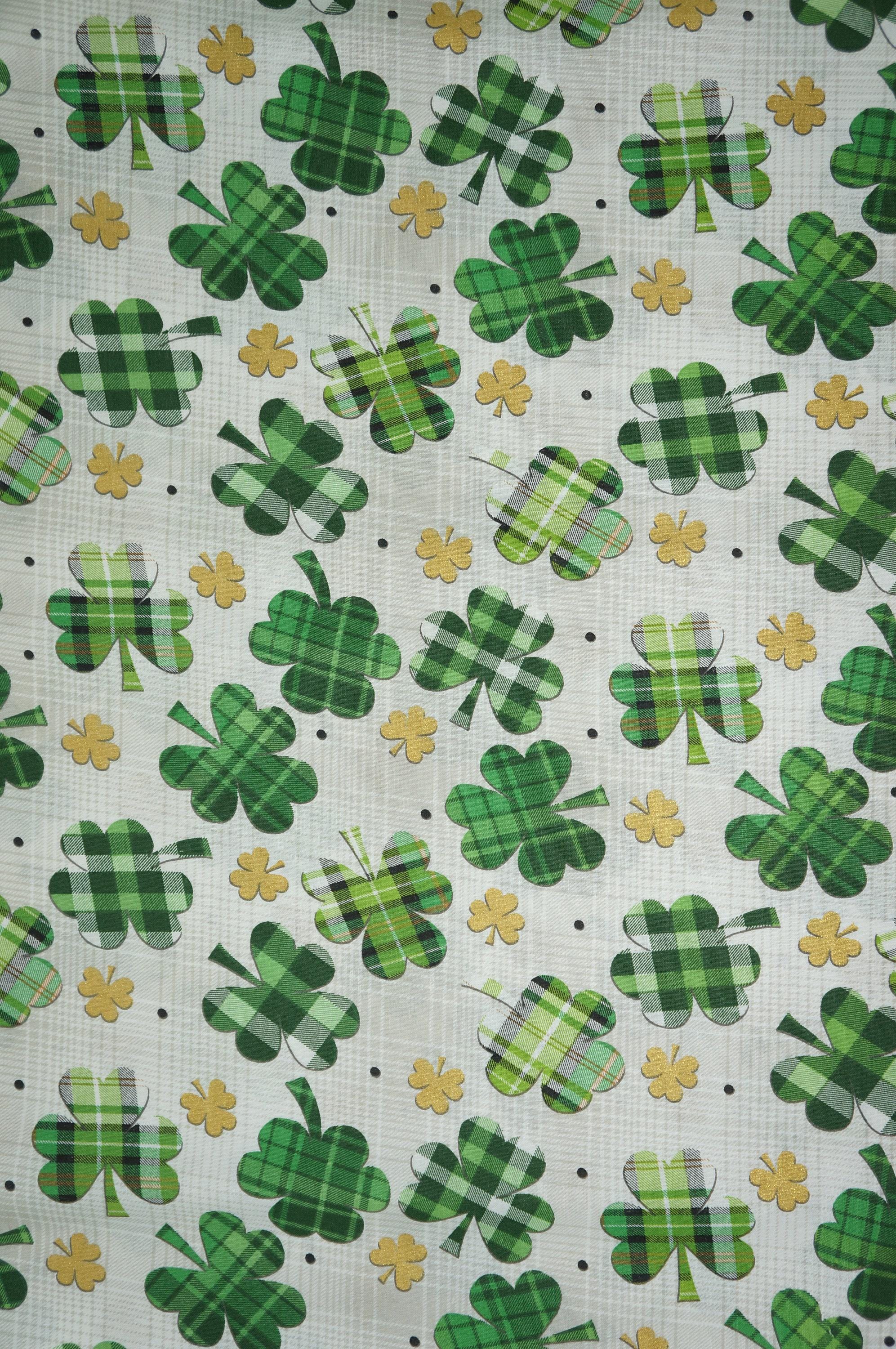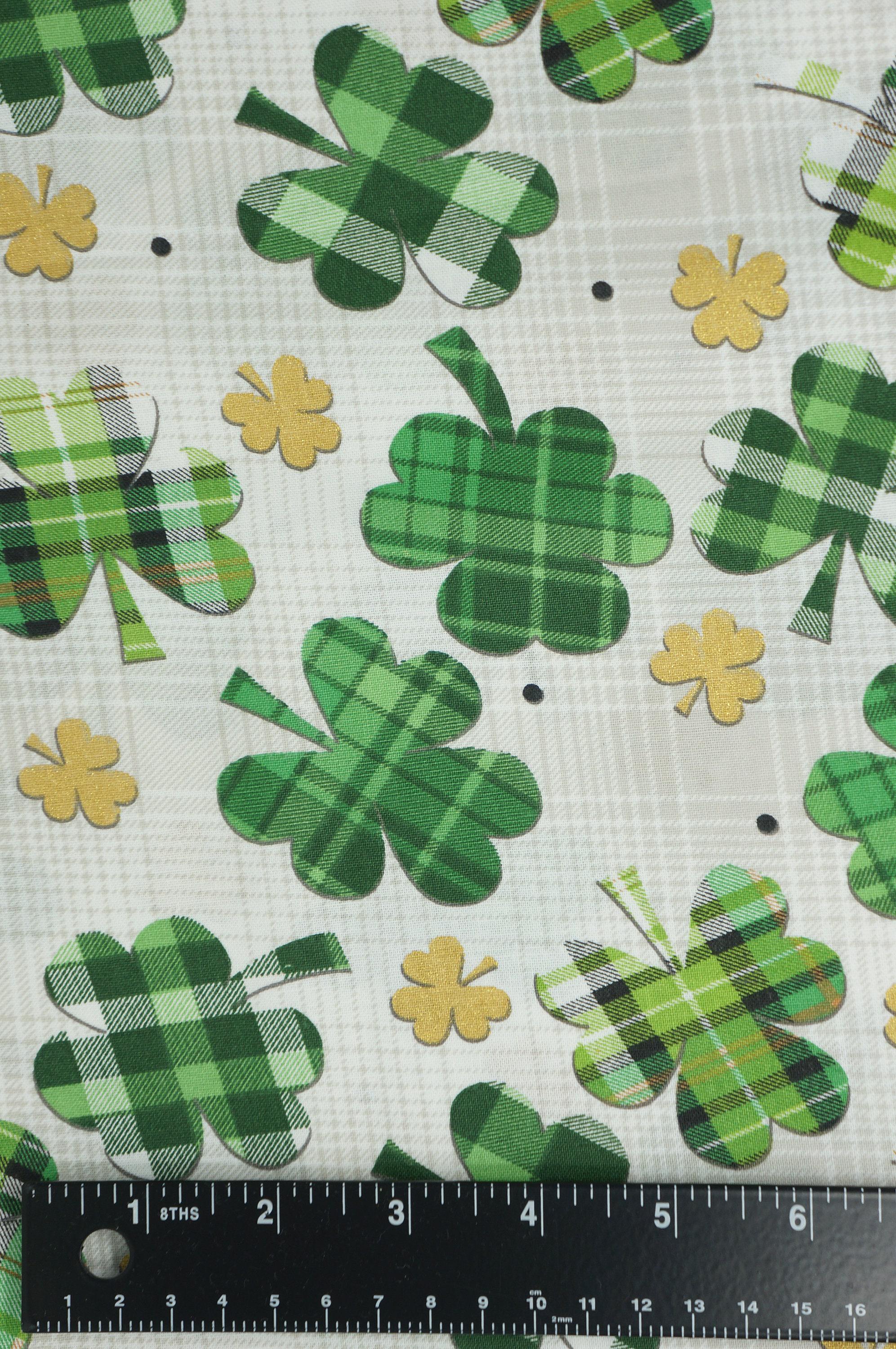 Celebrate St Patrick's Day with this festive fabric! This novelty cotton fabric features gingham and plaid shamrocks on a white/gray plaid background with gold metallic clover accents. It's perfect for making quilts, pillows, table runners, bags, and more. Show off your luck of the Irish with this charming fabric!