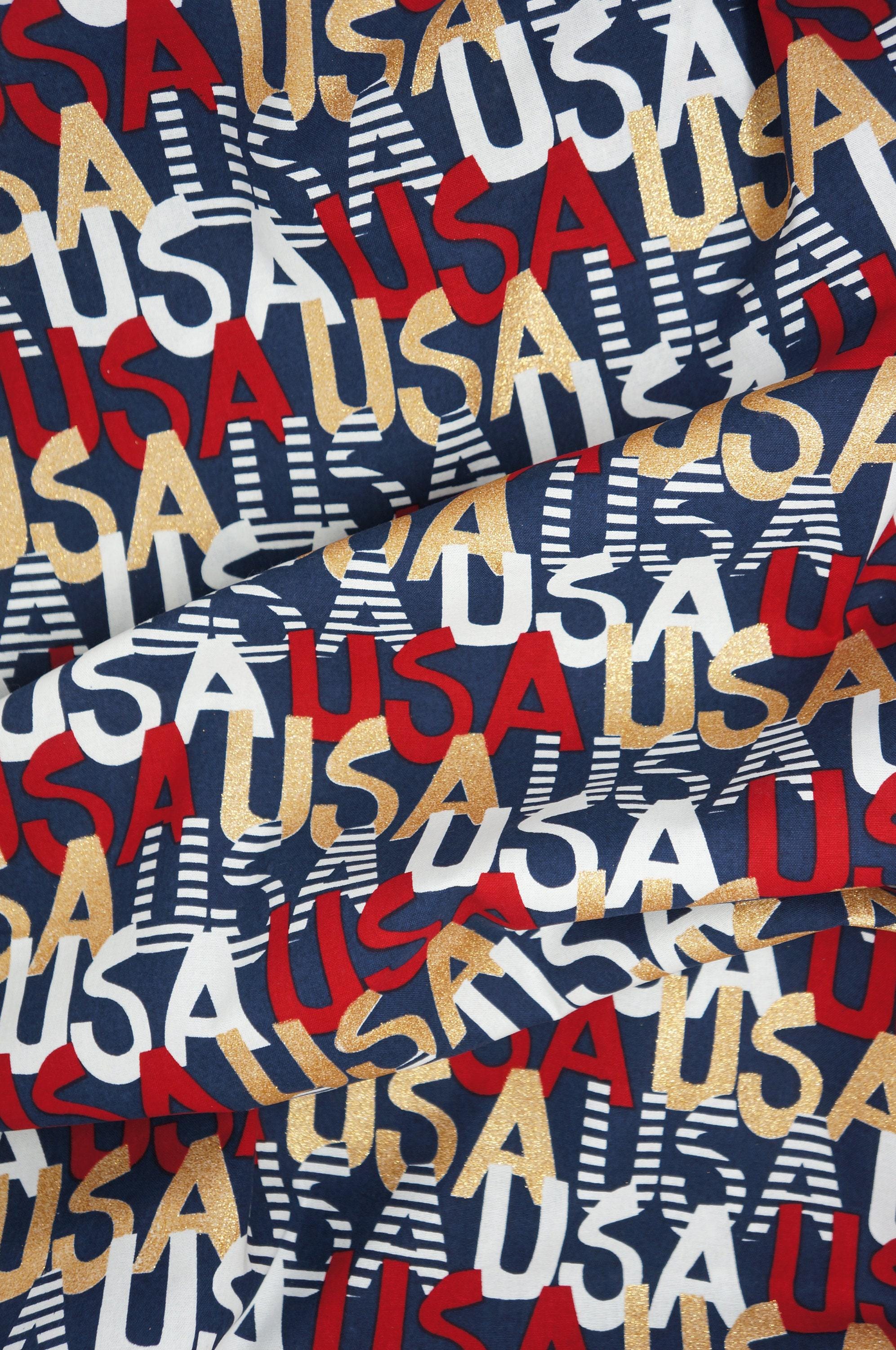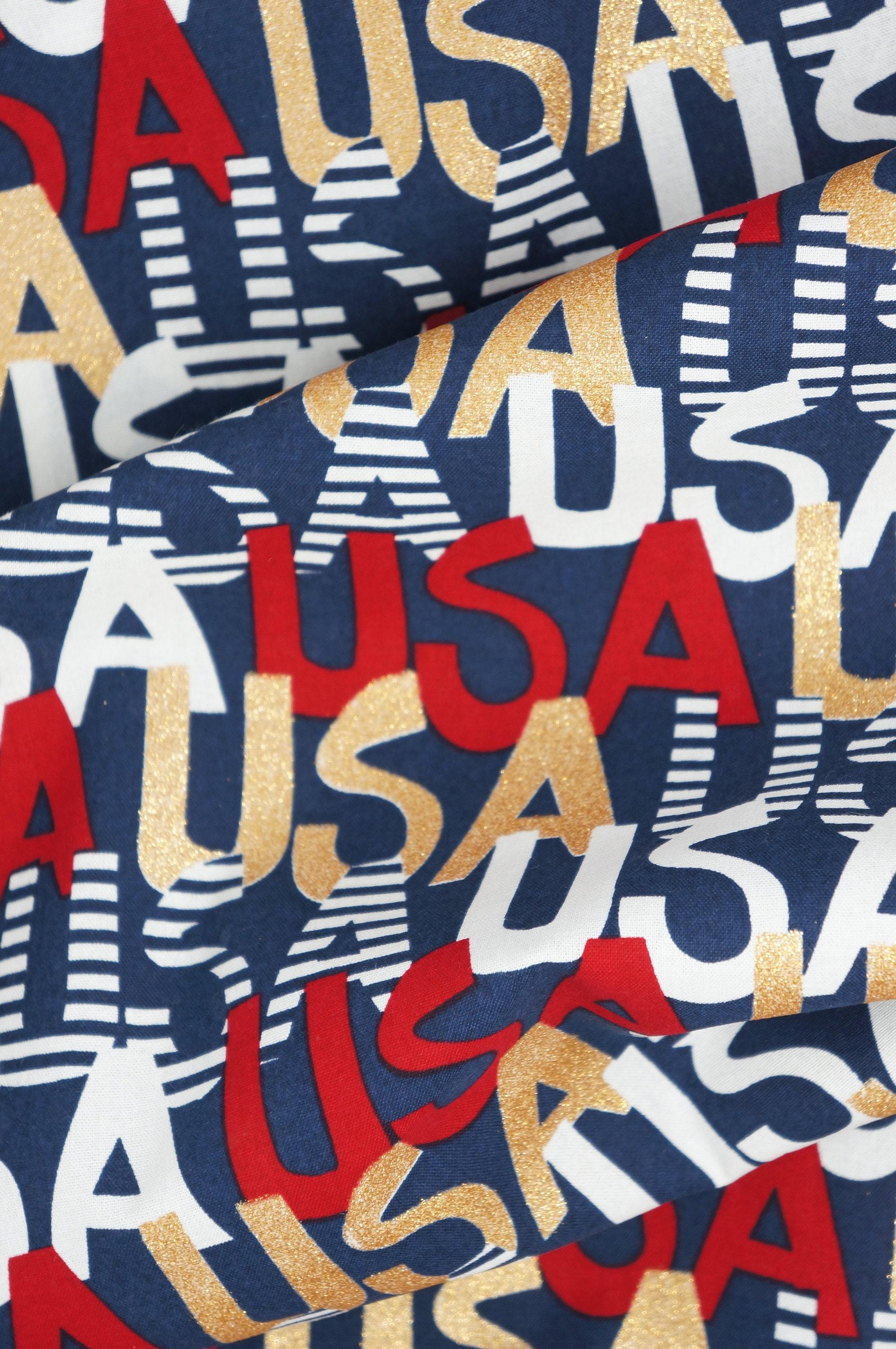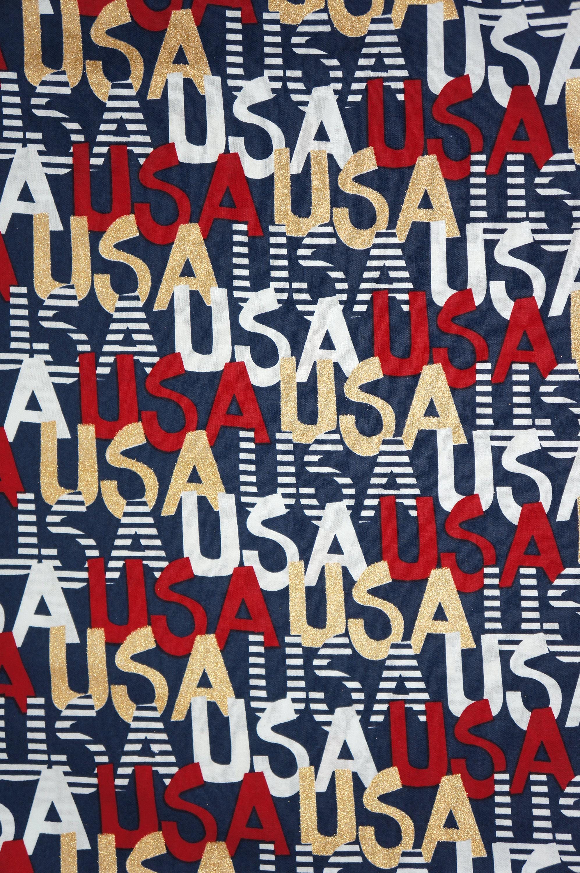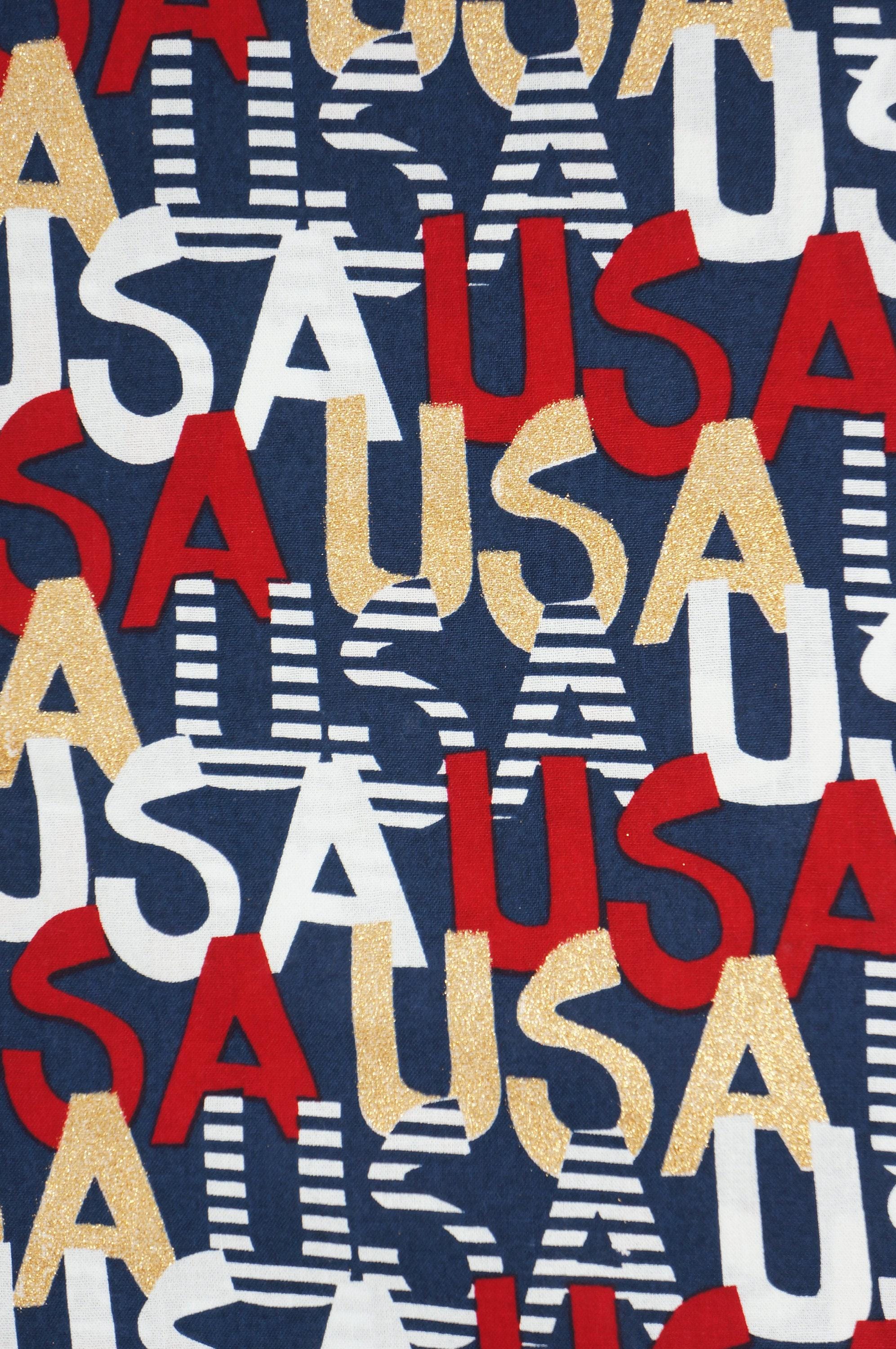 Celebrate Independence Day with this patriotic 4th of July USA fabric on navy novelty cotton fabric! This fabric features glittery USA letters in gold and with white and blue USA printed on a navy background. It's perfect for making quilts, pillows, table runners, bags and more. Show your love for your country with this festive and fun fabric!
