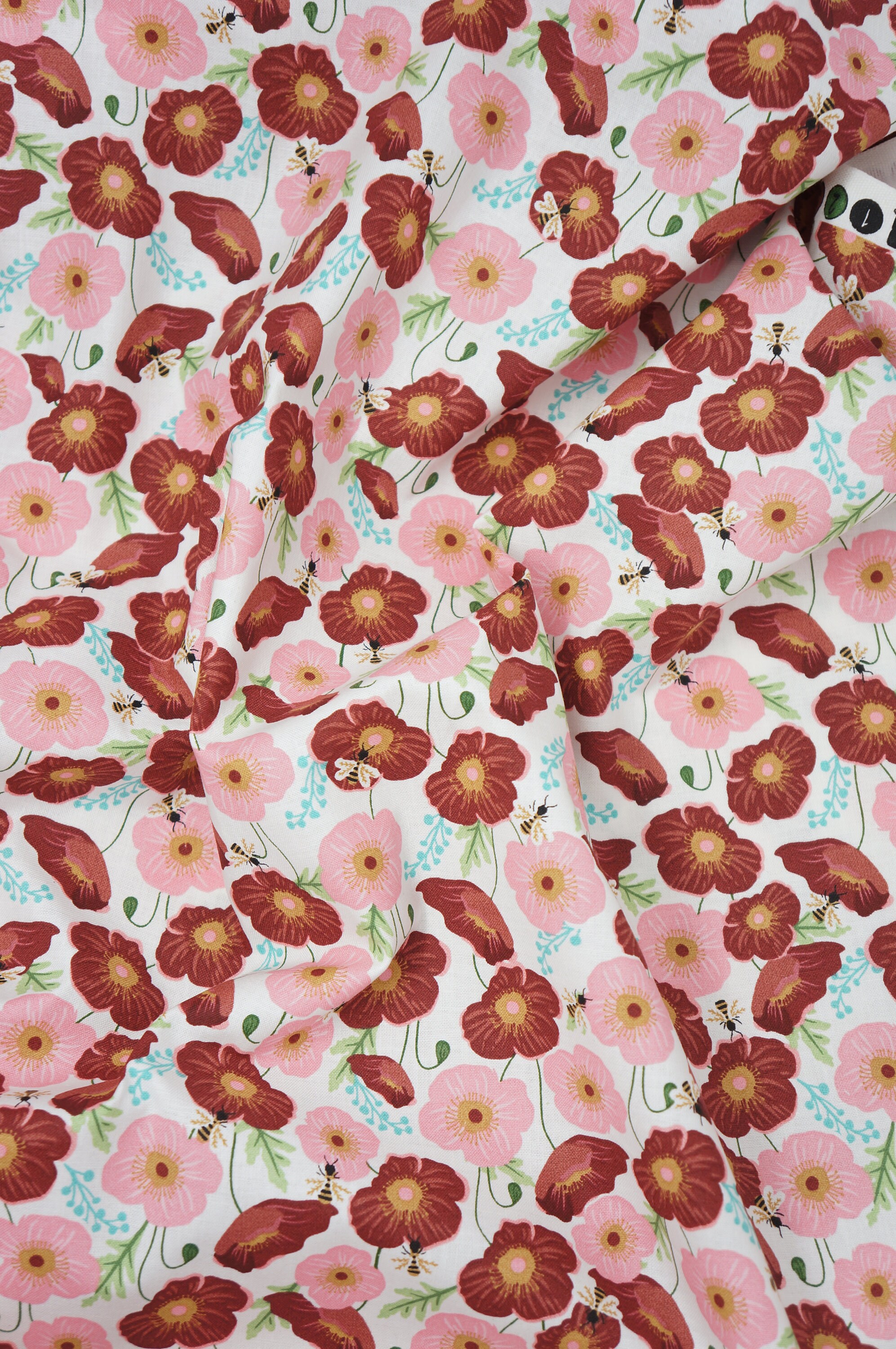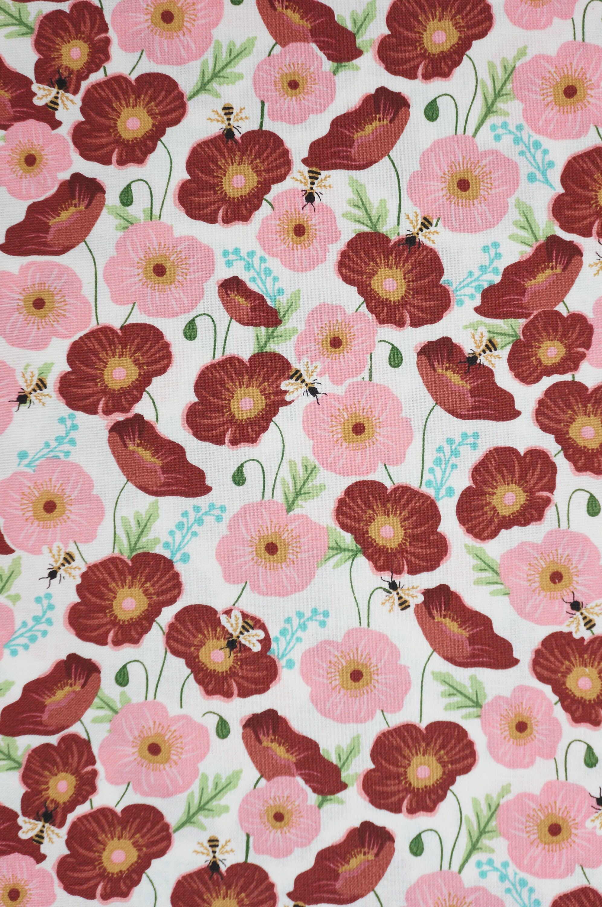 If you love bees and flowers, you will adore this beautiful quilting cotton fabric! It features pink and red poppies with bees buzzing around them on a white background. This fabric is perfect for making quilts, pillows, curtains, bags, and more. The floral bee fabric is soft, durable, and easy to sew. You will enjoy the bright colors and the lovely design of this fabric. Order yours today and create something amazing with this bee-utiful fabric!