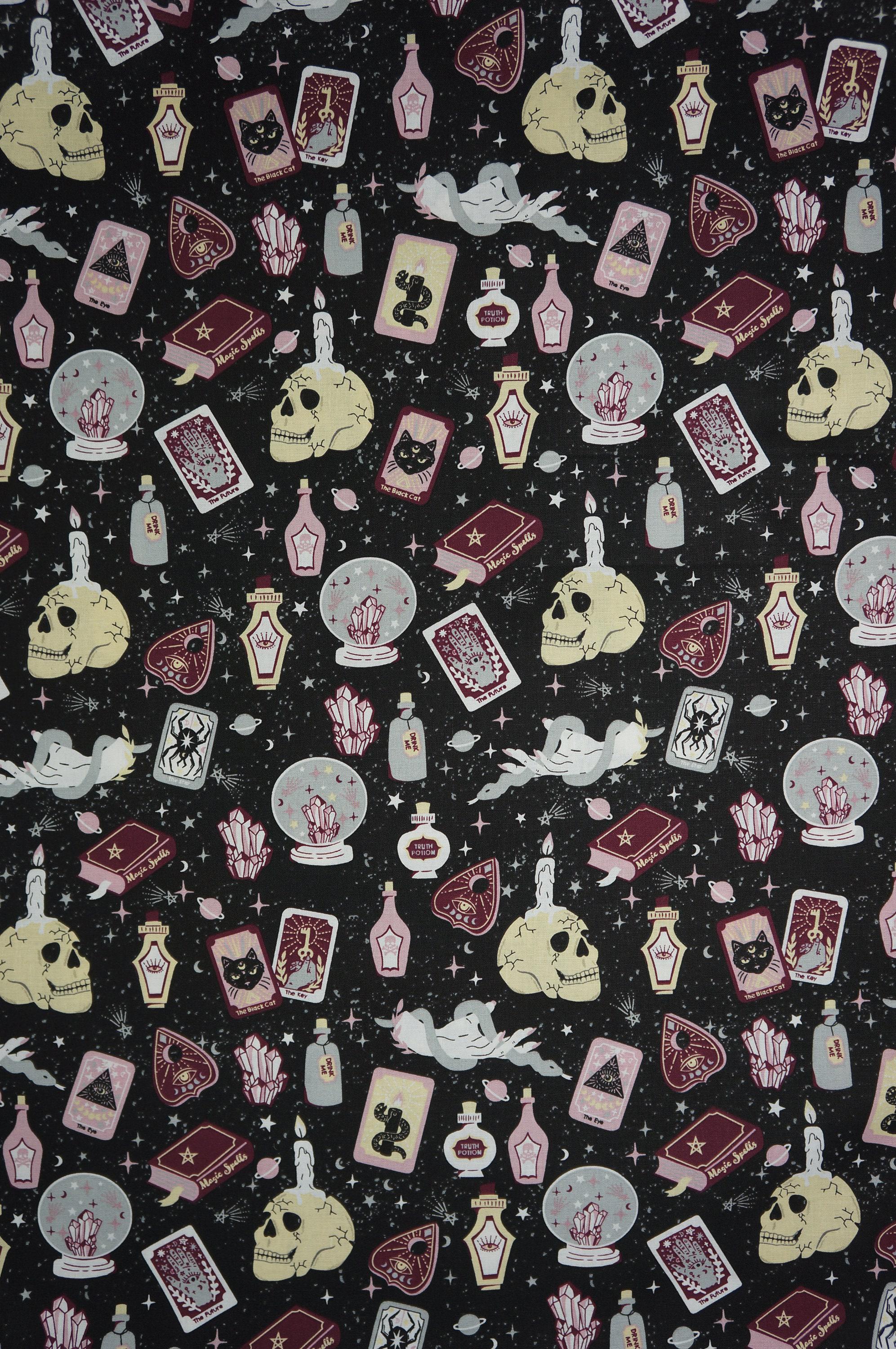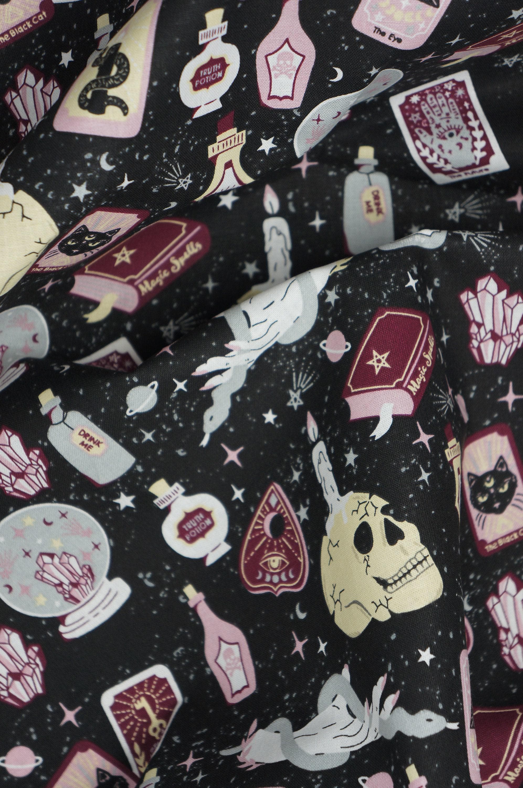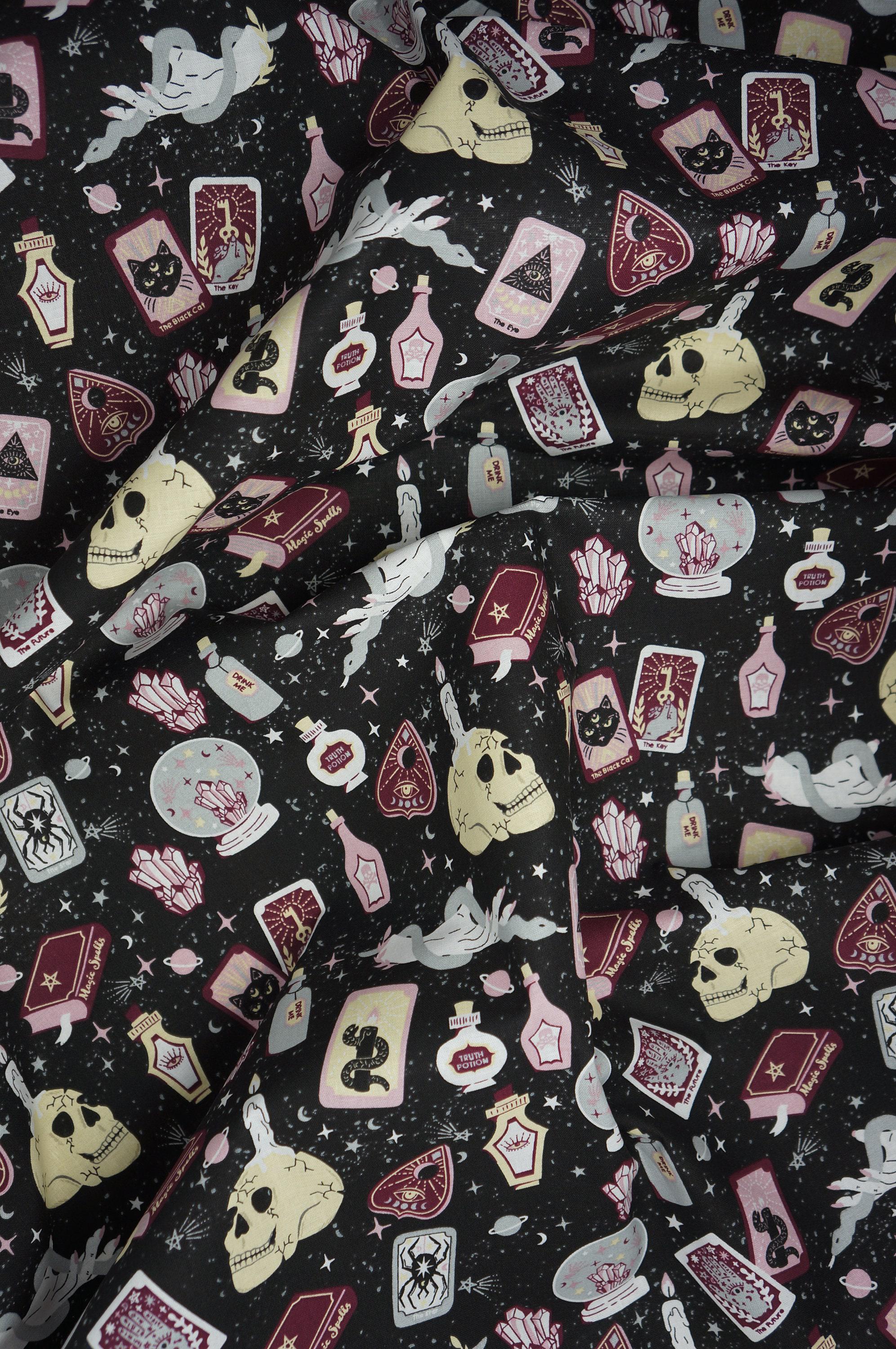 If you are looking for a fun and spooky fabric to make your Halloween crafts, look no further than Mystical Objects Halloween on Black Novelty Cotton Fabric! This fabric features colorful prints of palm reading, crystal ball, fortune telling, and skulls on a black background. You can use this fabric to make quilts, pillows, costumes, bags and more. This fabric is durable and easy to sew. It will add a touch of mystery and magic to your Halloween projects!