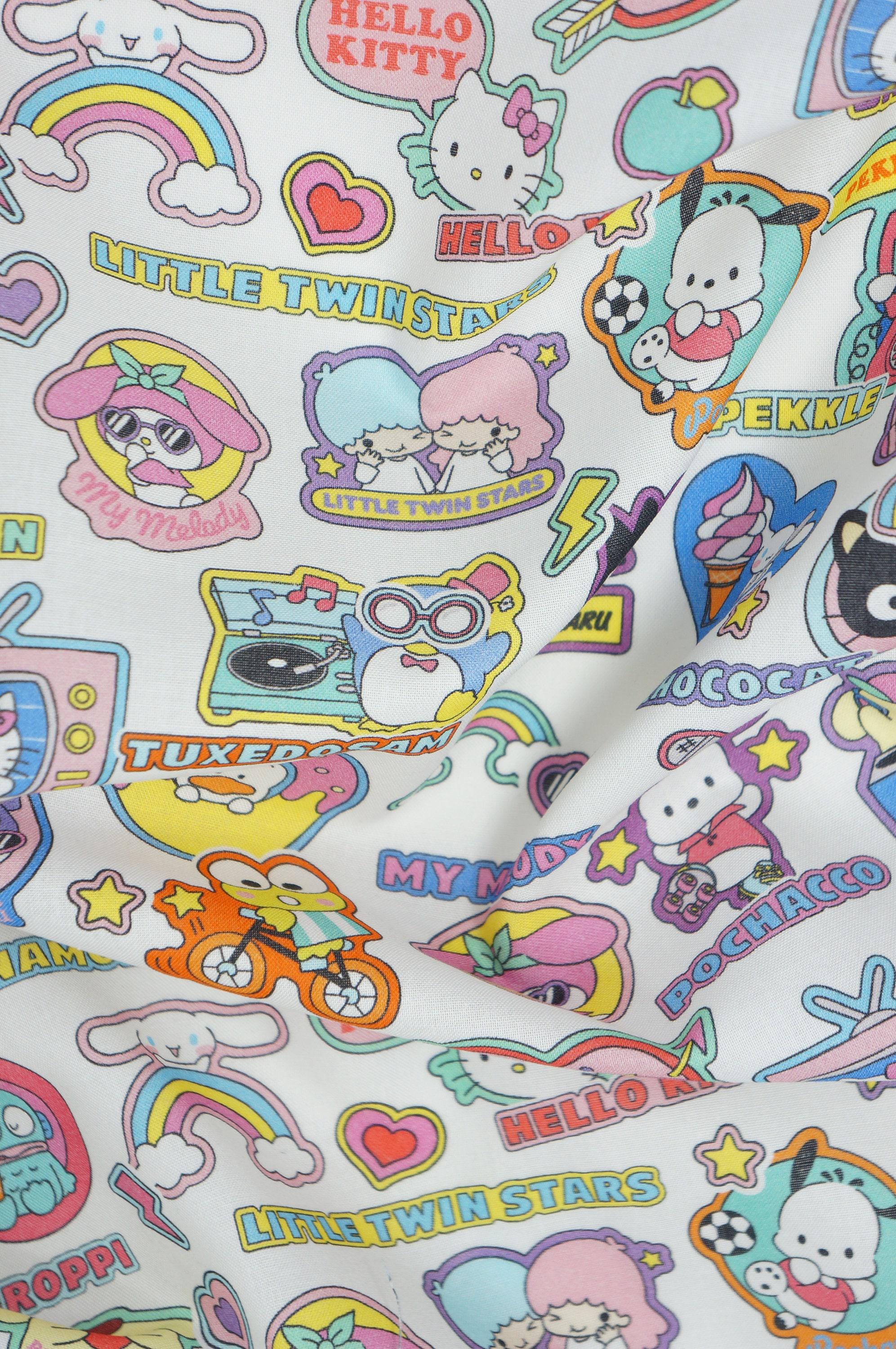 If you love Hello Kitty and her friends, you will adore this Hello Kitty fabric by Springs Creative. This novelty cotton fabric features Hello Kitty and her friends stickers on a white background. This fabric is perfect for making quilts, pillows, bags, accessories, and more. You can also use it to decorate your room, your car, or your office with cute and colorful Hello Kitty style. This fabric is soft, durable, and easy to sew. Don't miss this chance to get this adorable Hello Kitty fabric and show your love for the kawaii kitty!