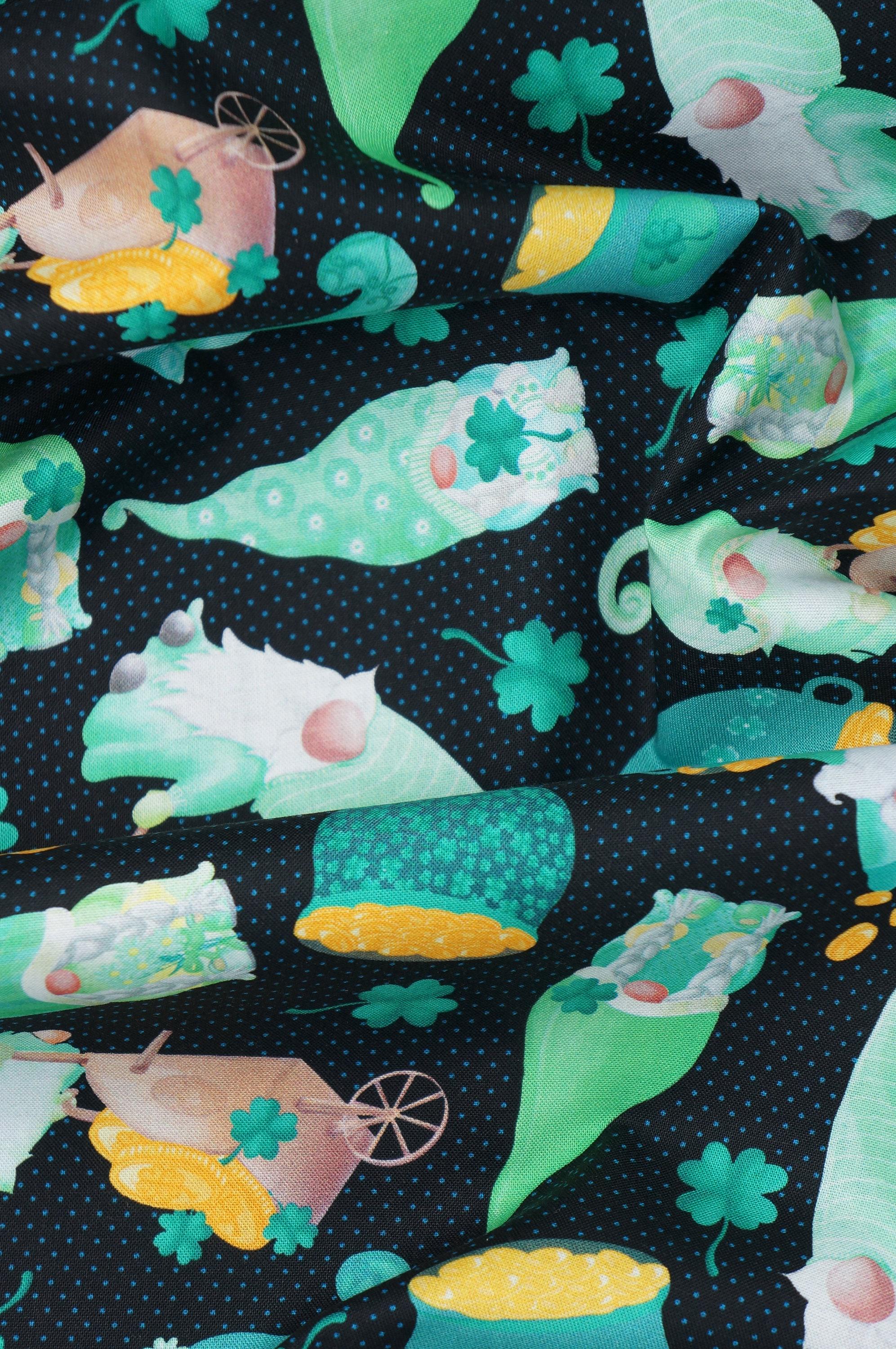 Are you looking for a fun and festive fabric to celebrate St Patrick's Day? Look no further than the Luck of the Gnomes Fabric by Andi Metz for Kanvas Studio! This adorable quilting cotton fabric features tossed gnomes on a black background with green pin dots. The gnomes are wearing green hats and holding shamrocks, and pots of gold. This fabric is perfect for making quilts, pillows, table runners, bags, and more. Add some charm and luck to your sewing projects with the Luck of the Gnomes Fabric!