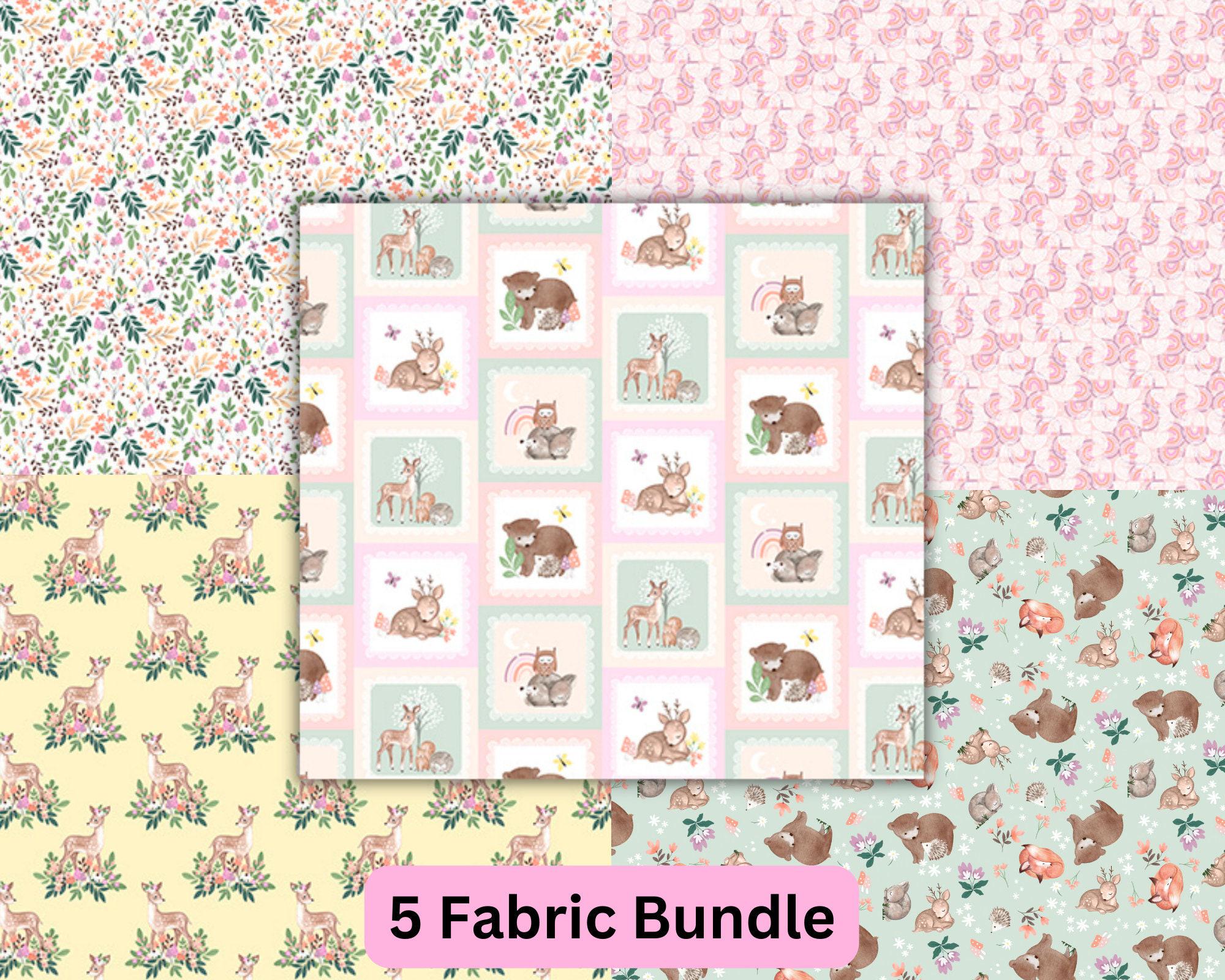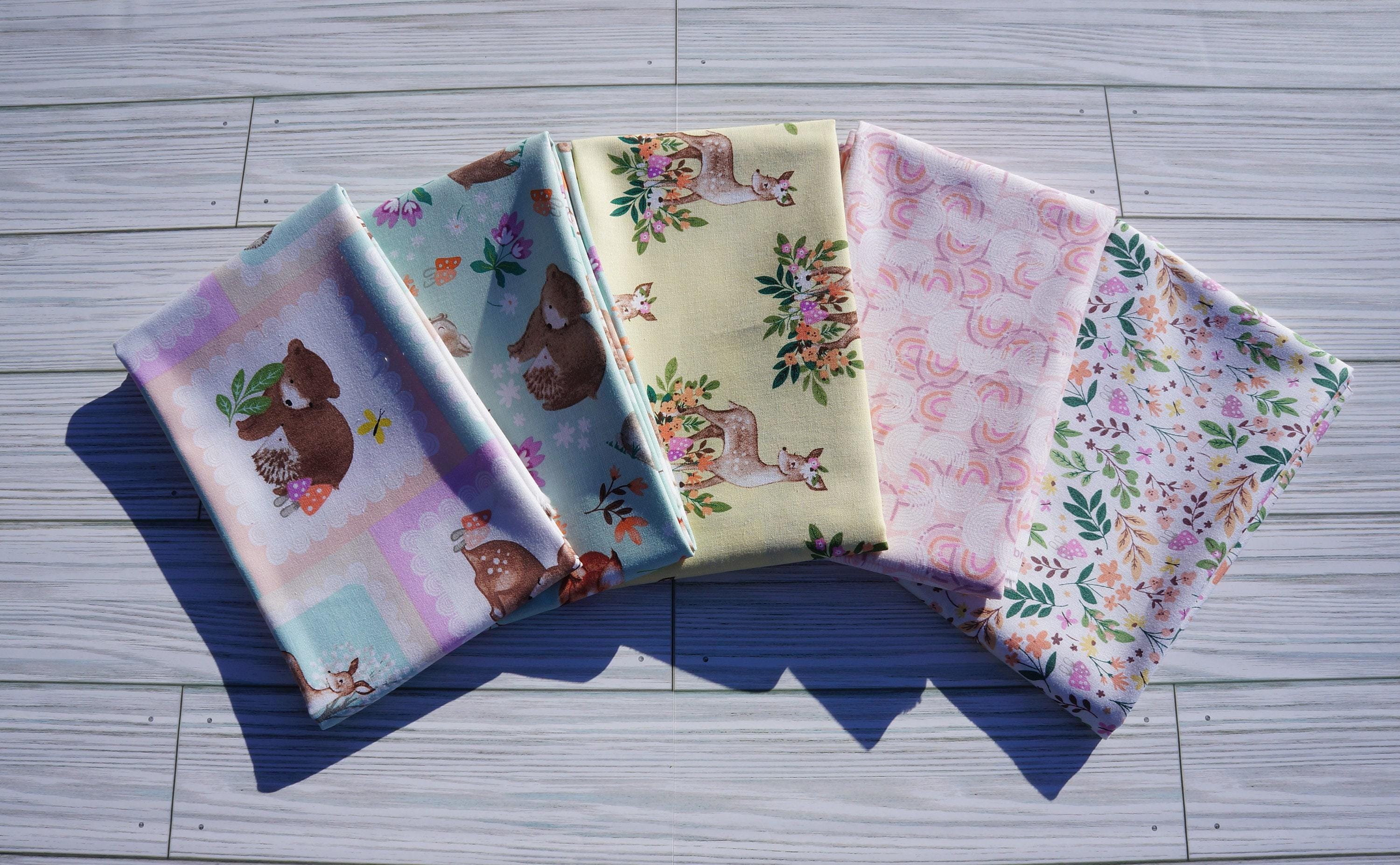 If you love cute and whimsical woodland animals, you will adore this fabric bundle! It features five different prints from the Woodland Wander Pink Collection by Jo Taylor for 3 Wishes Fabric. You can choose between a fat quarter or a half yard bundle, depending on your project needs. The fabric is 100% cotton and has a soft and smooth feel. You can use it to make a charming nursery quilt, a cozy pillow, a sweet tote bag, or anything else you can imagine! The colors are bright and cheerful, with shades of pink, green, yellow, and white. The animals are adorable and friendly, with foxes, rabbits, deer, squirrels, and birds. This fabric bundle will make you smile every time you see it!