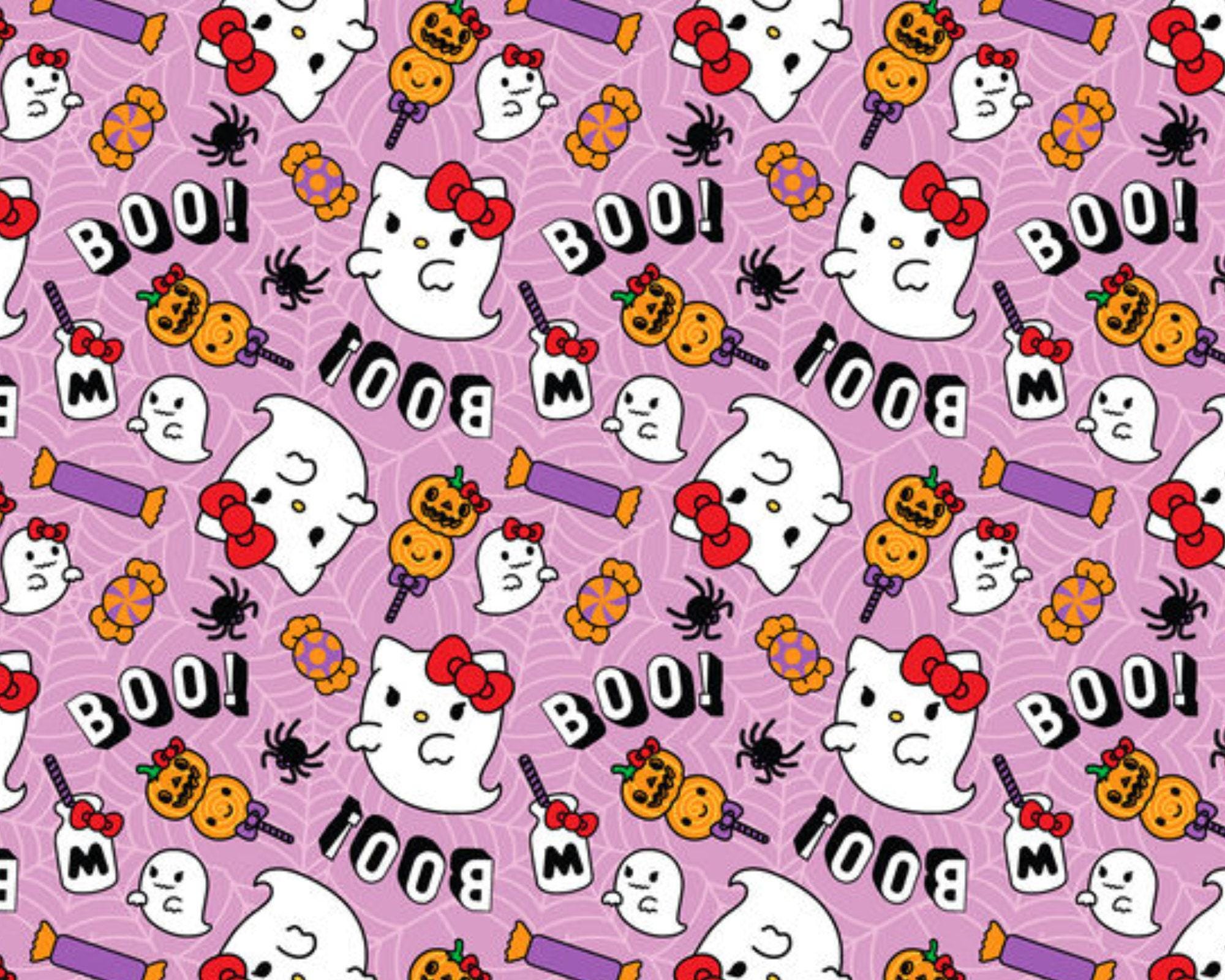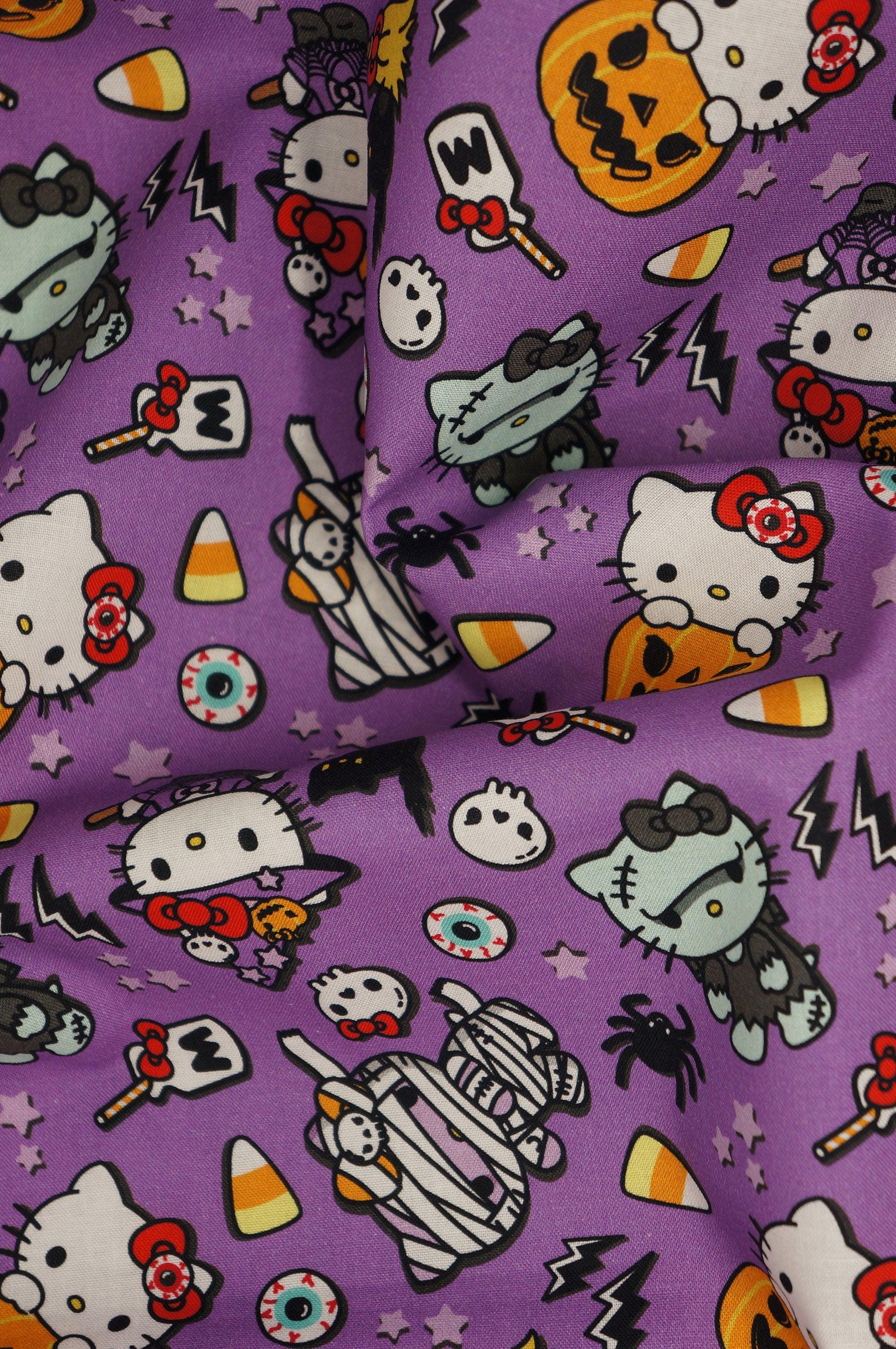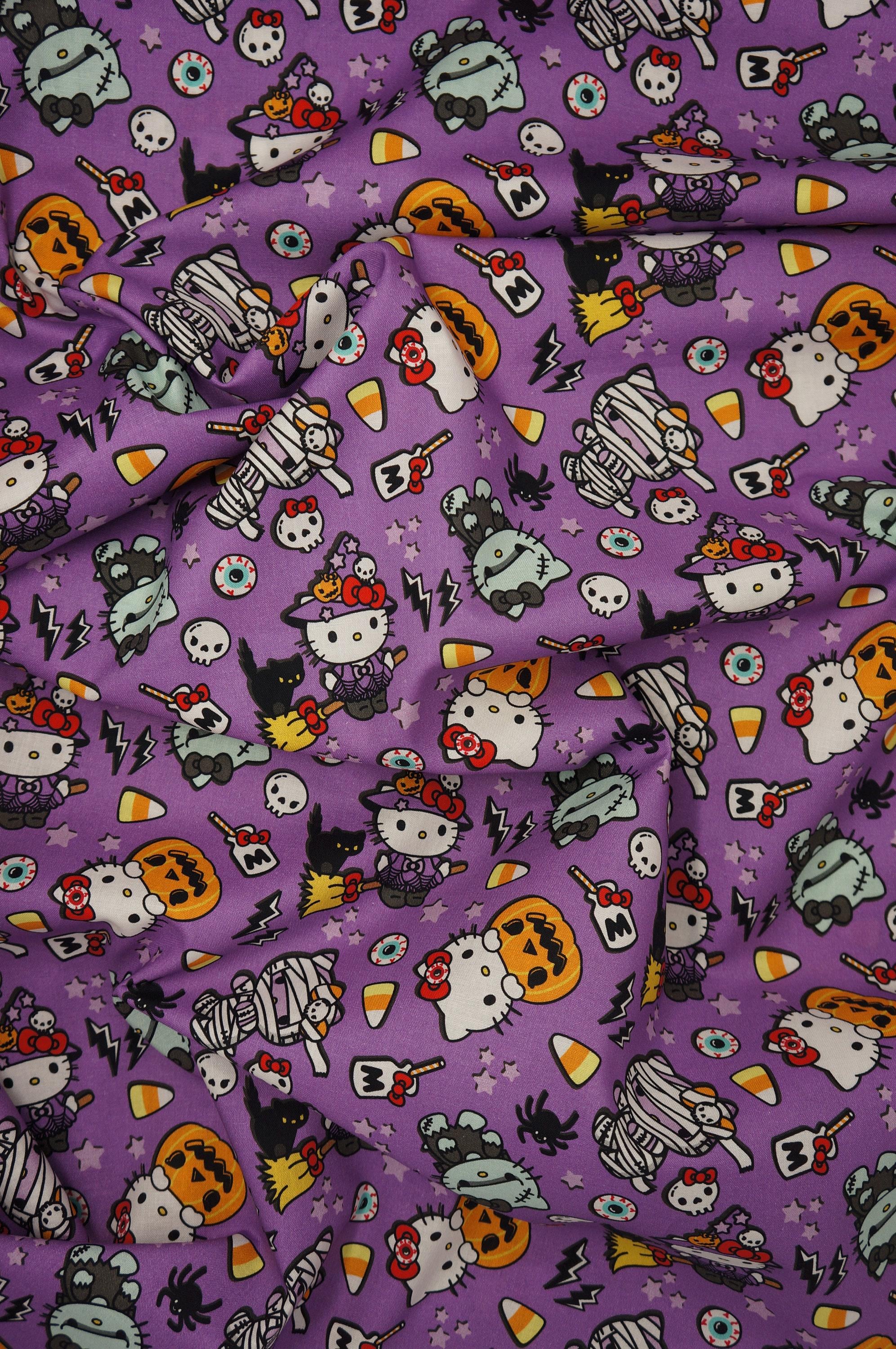 Are you looking for a fun and adorable way to celebrate Halloween with your favorite kitty? Look no further than the Hello Kitty Halloween Fabric, featuring the cutest designs of Hello Kitty in different costumes. Features Hello Kitty dressed in Halloween costumes as a witch, Frankenstein's monster, a mummy and a pumpkin on a purple background with various Halloween icons. This fabric is soft, durable and easy to sew. You'll love making costumes, accessories, quilts and more with this Hello Kitty Halloween Fabric!