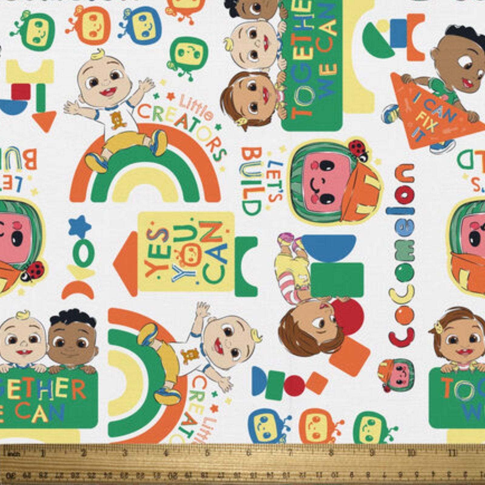 Are you looking for a fun and colorful fabric to make your kids happy? Your favorite kids will love this Cocomelon fabric featuring JJ, Cody and Nina on a white background. This fabric is made of 100% cotton and is licensed by David Textiles, Inc. You can use it to make quilts, pillows, curtains, bags, home decor and more! This fabric is perfect for any Cocomelon fan or anyone who wants to add some joy and creativity to their sewing projects. Don't miss this opportunity to get this amazing fabric. Order now and get ready to build with JJ, Cody and Nina!