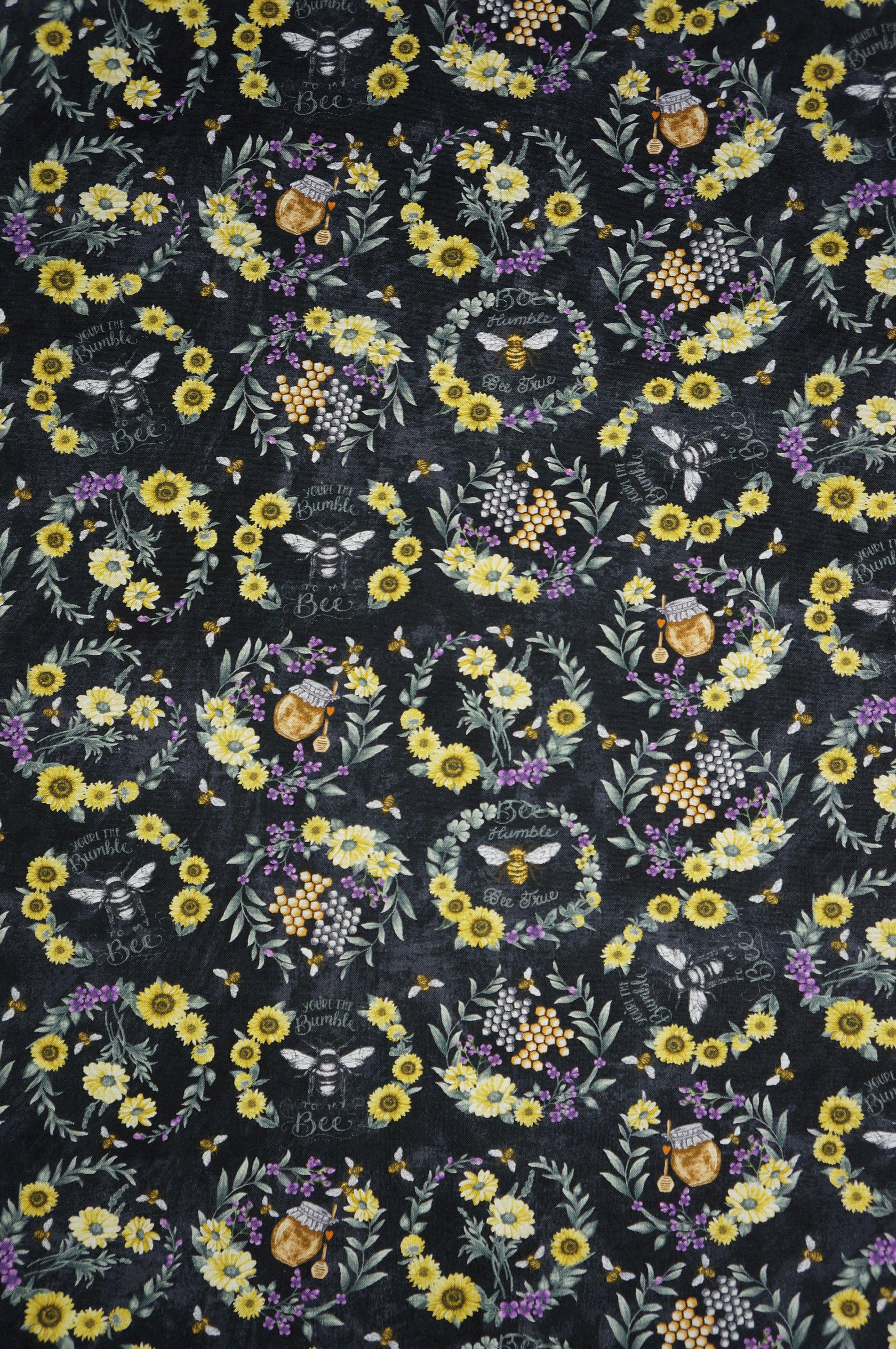 If you love bees and floral, you will adore this Bee themed fabric! This fabric features a stunning design of bees, honeycomb and floral wreaths on a chalkboard black background. The color pallet features shades of yellow, brown and green and purple, creating a striking contrast with the black chalkboard background. This fabric is made of high-quality quilting cotton by Hi Fashion Fabrics. It is perfect for making quilts, pillows, bags, and more. You will feel the joy of nature and the warmth of the sun every time you use this fabric!