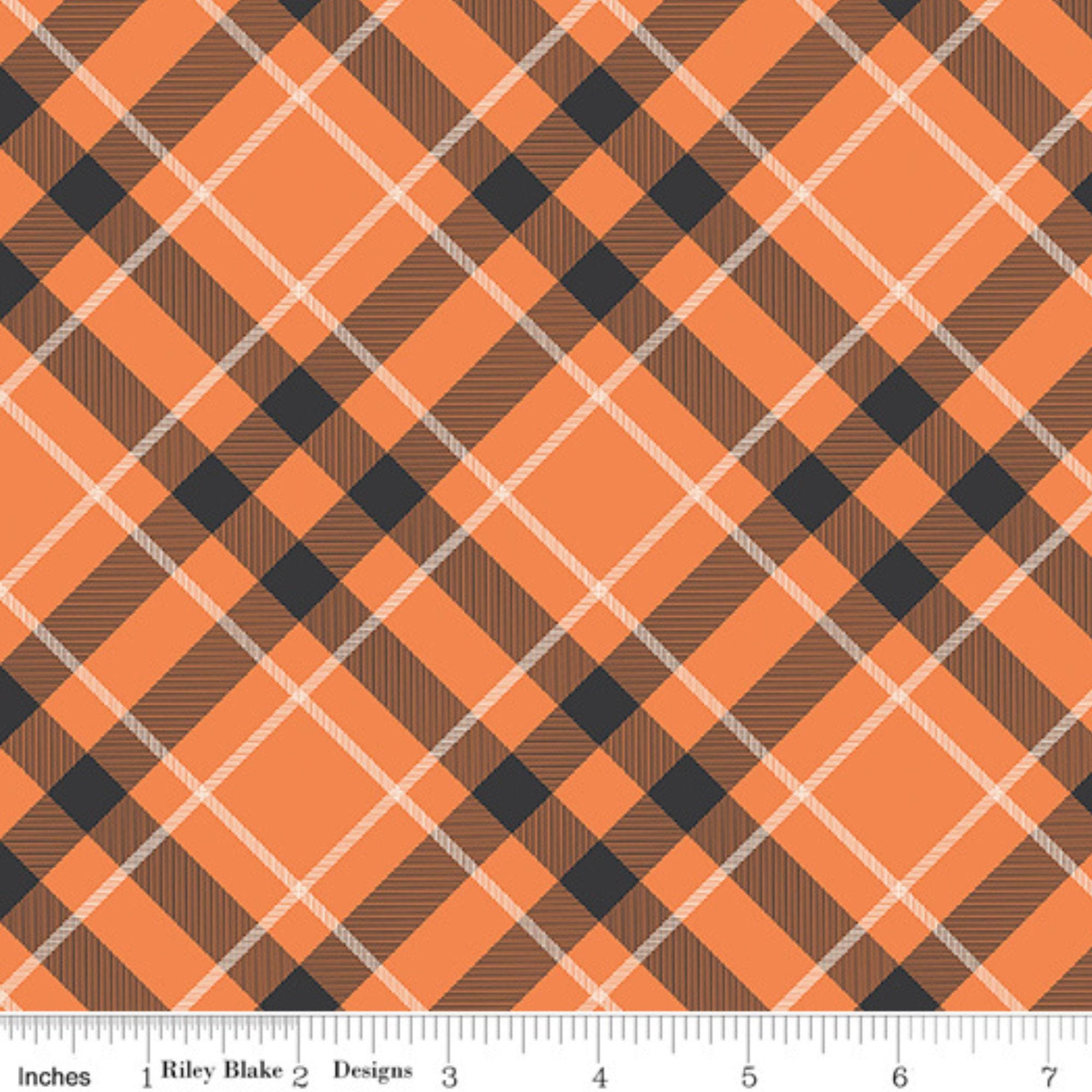 If you're looking for a fun and festive fabric for your Halloween projects, look no further than this orange and black plaid from Riley Blake. This fabric features a classic plaid pattern on the diagonal. The plaid orange is part of the Hey Bootiful collection by My Mind's Eye, a whimsical and spooky line of quilting cotton fabrics that celebrate the Halloween spirit. Whether you use it for quilts, pillows, costumes, or decorations, this fabric will add some charm and cheer to your Halloween crafts.