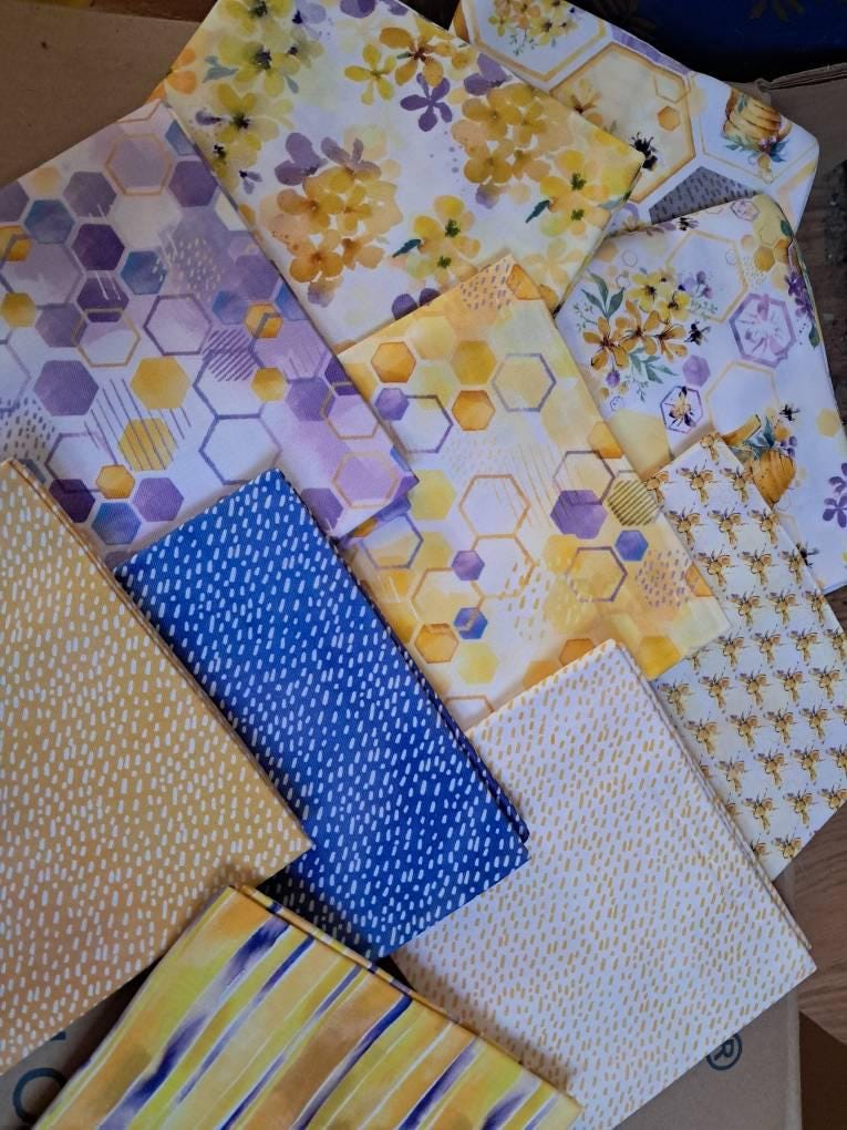 If you love bees and quilting, you will adore this Honey Bee Fabric fat quarter bundle from the Welcome to our Hive Collection by Camelot. This pack contains 10 pieces measuring 18"x21"in beautiful colors and patterns inspired by nature and honey. You can use them to create stunning quilts, pillows, table runners, wall hangings and more. The fabric is 100% cotton and easy to sew with. Add some sweetness and charm to your home with this Welcome to our Hive fat quarter bundle!