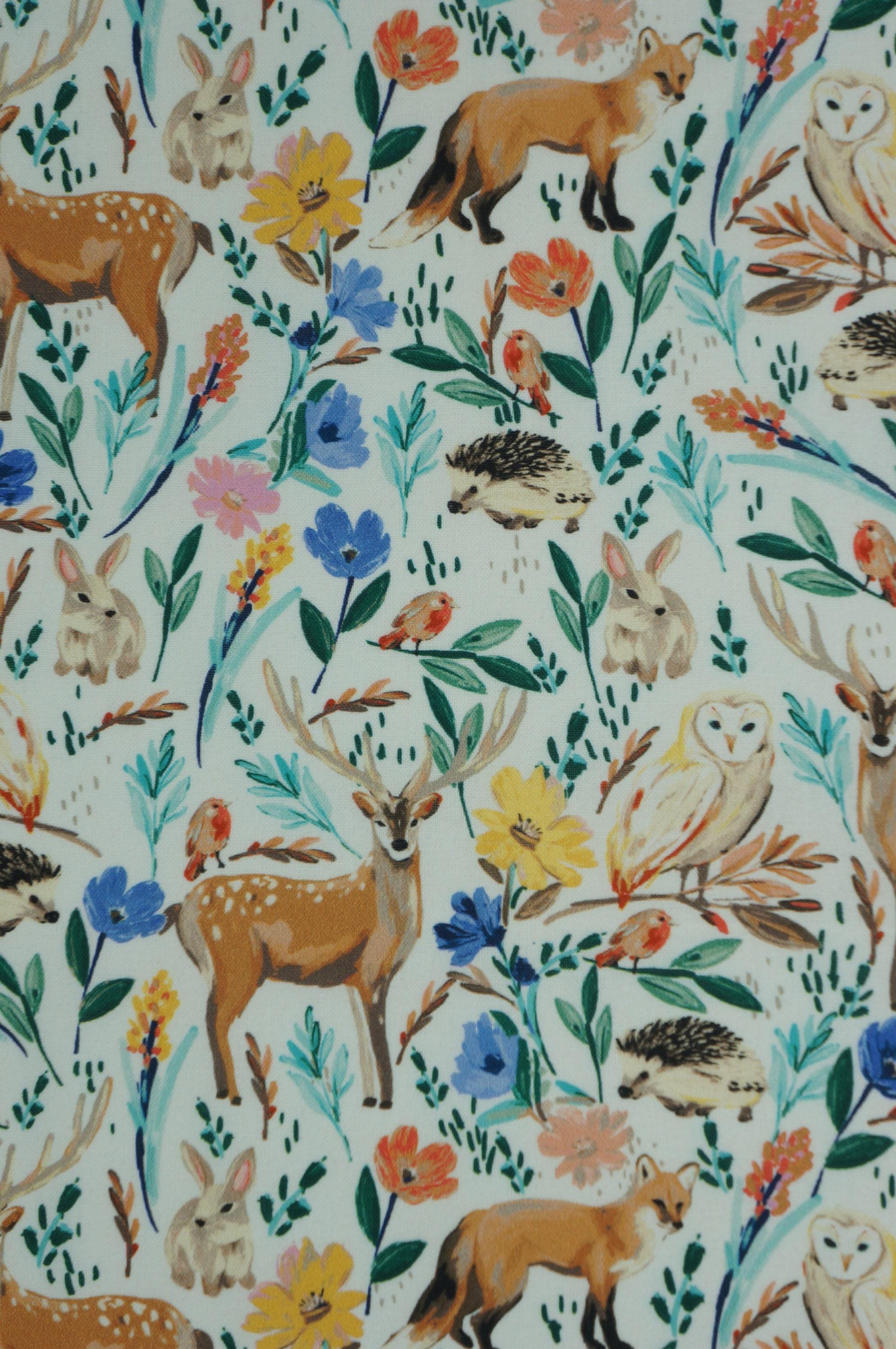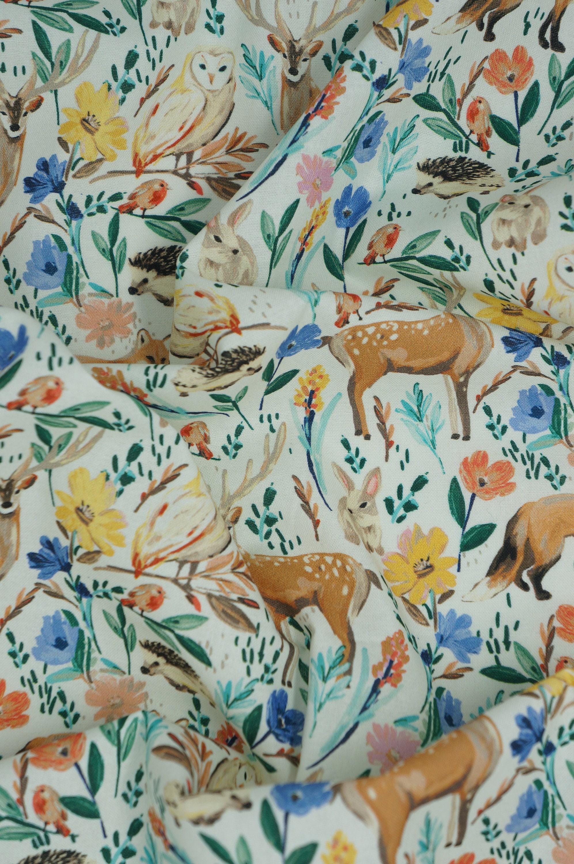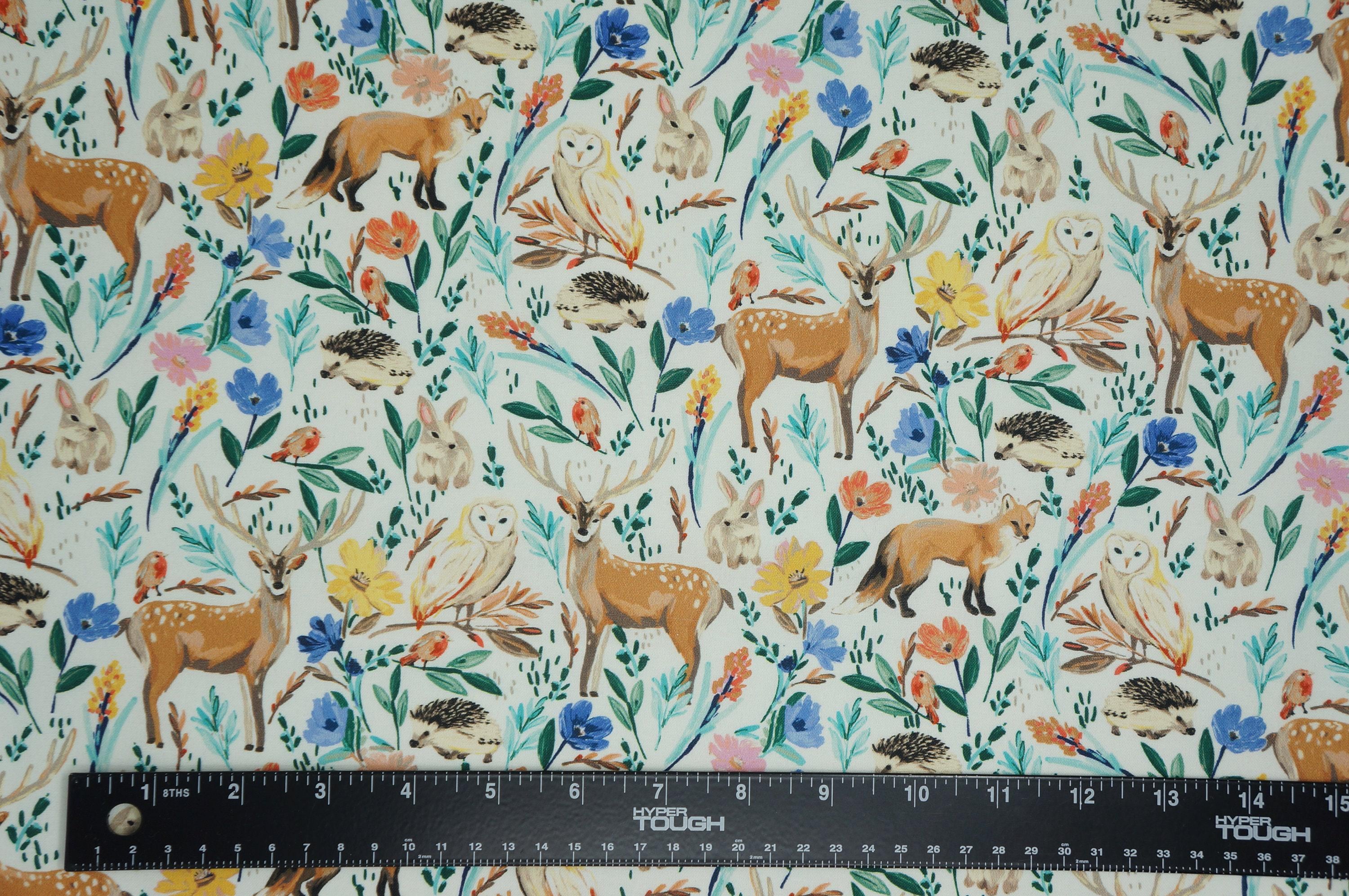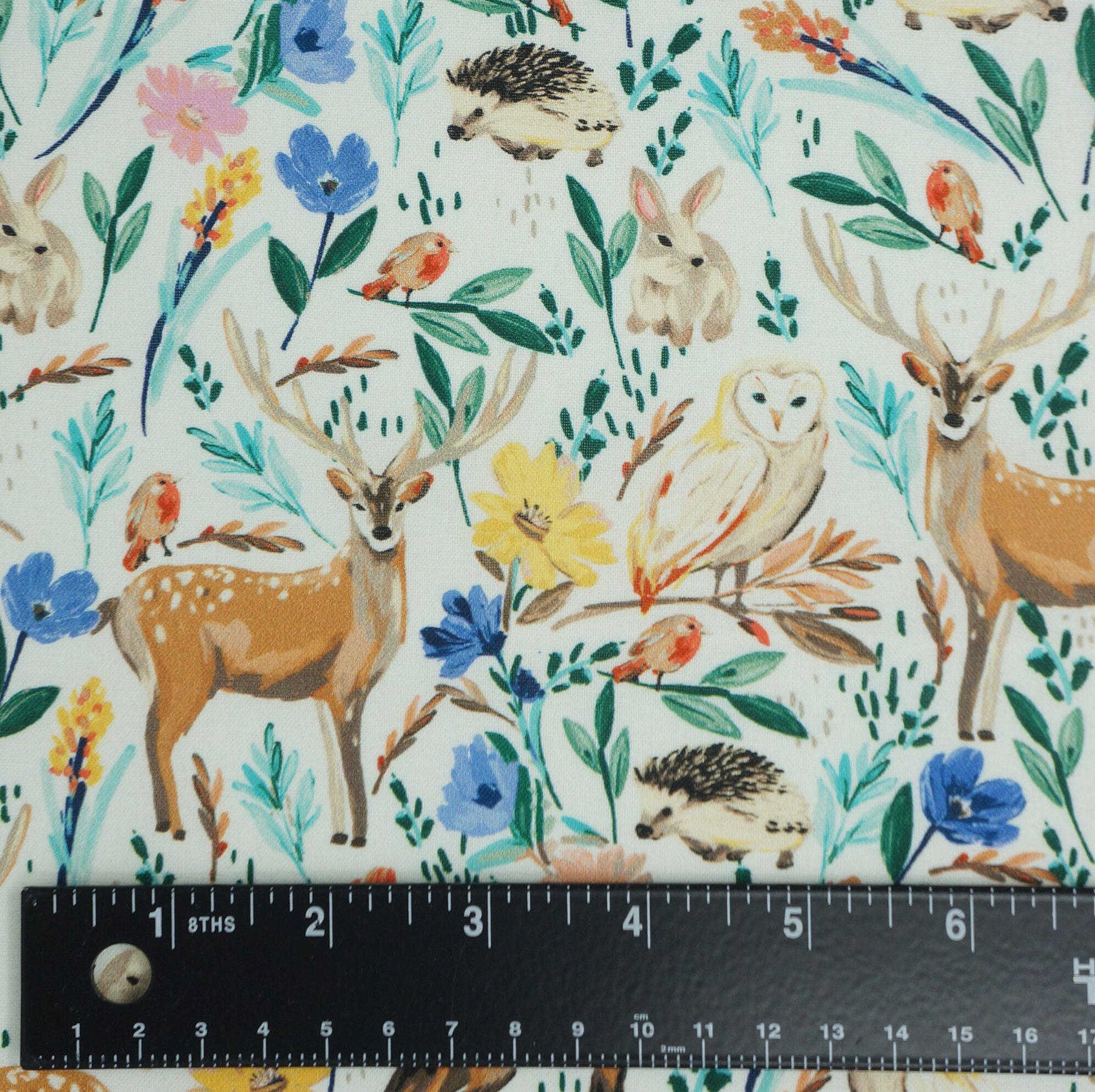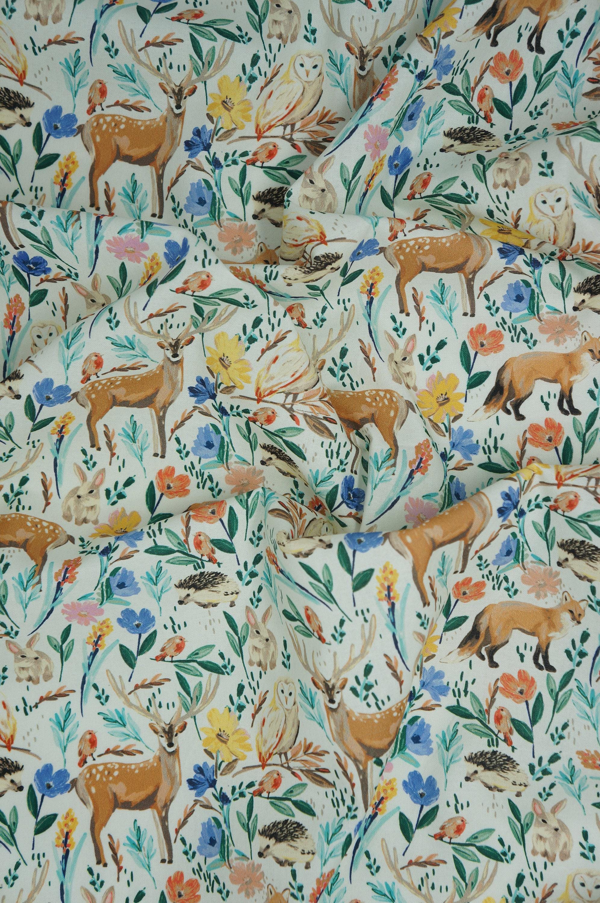 Step into a whimsical woodland wonderland with our Watercolor Forest Animals print novelty cotton fabric! This enchanting fabric is a delightful ode to nature, showcasing graceful deer, cunning foxes, wise owls, and adorable hedgehogs frolicking amidst blooming flowers, all set against a serene white background. Perfect for adding a touch of charm to your next DIY project, whether it's crafting cozy throw pillows, delightful curtains, or enchanting quilts. Let your creativity roam free and bring the magic of the forest into your home décor with this enchanting fabric!