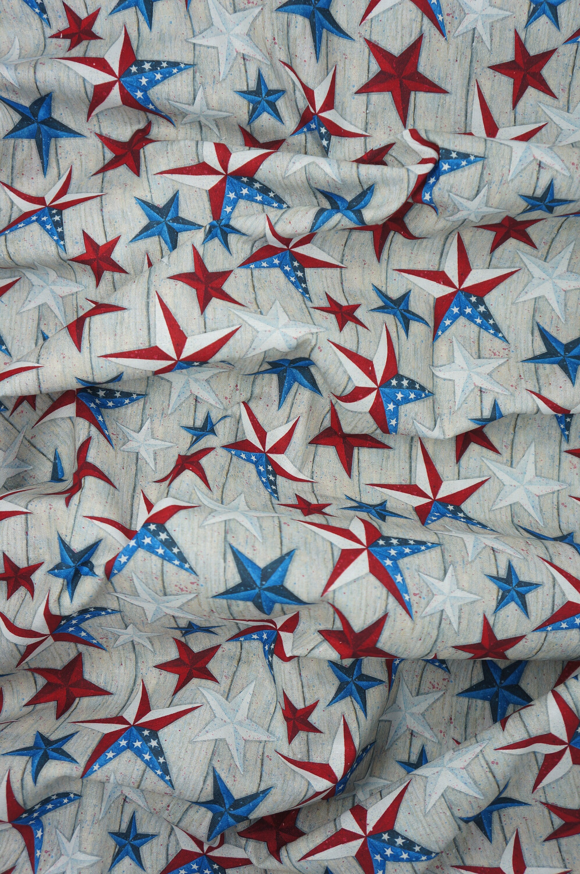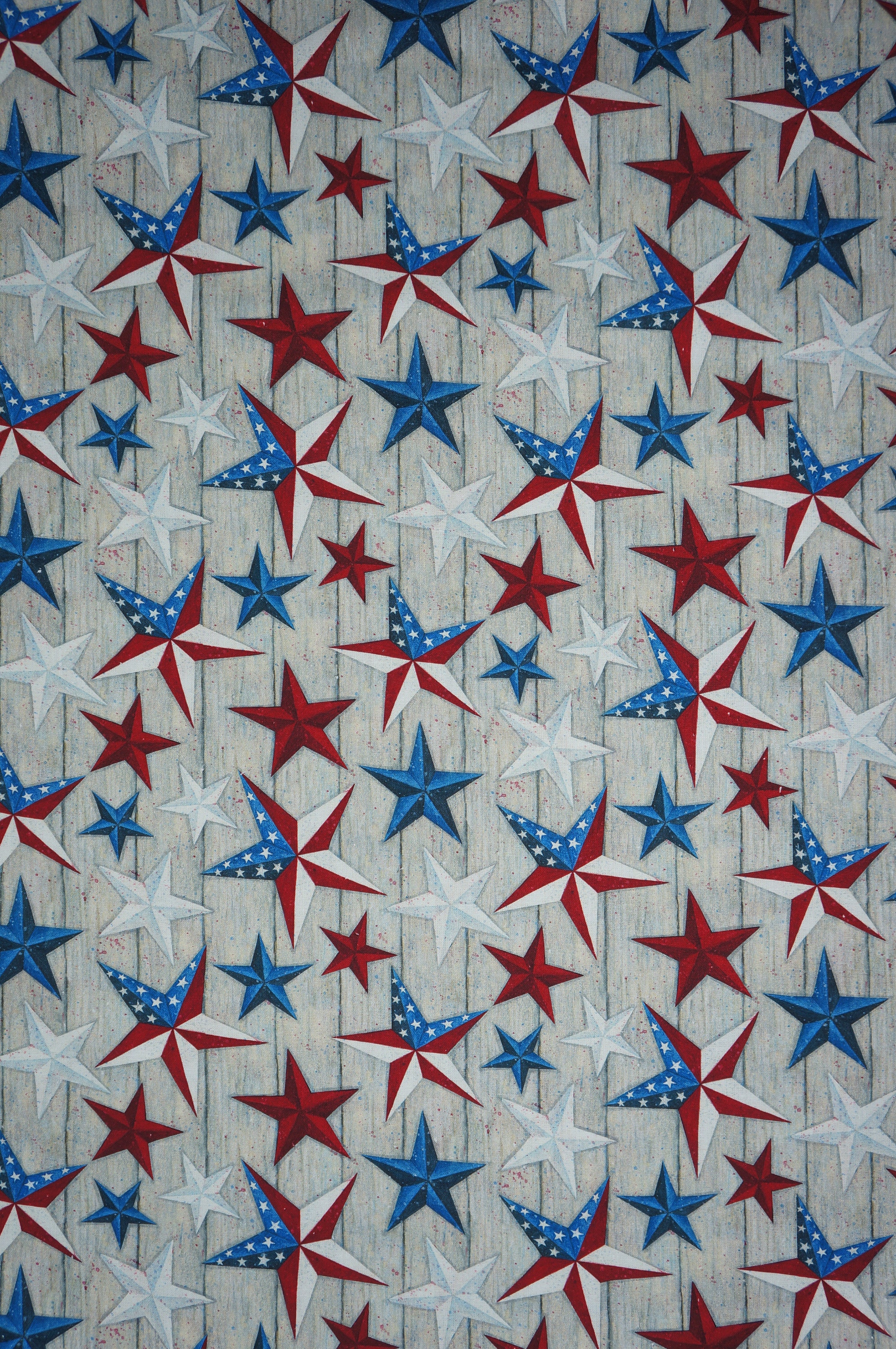 Really nice patriotic fabric. I wish more companies would use gray in their background colors. This fabric looks like the stars are on a wood panel. The fabric does NOT have any bad odors and is heavy like all cotton should be.