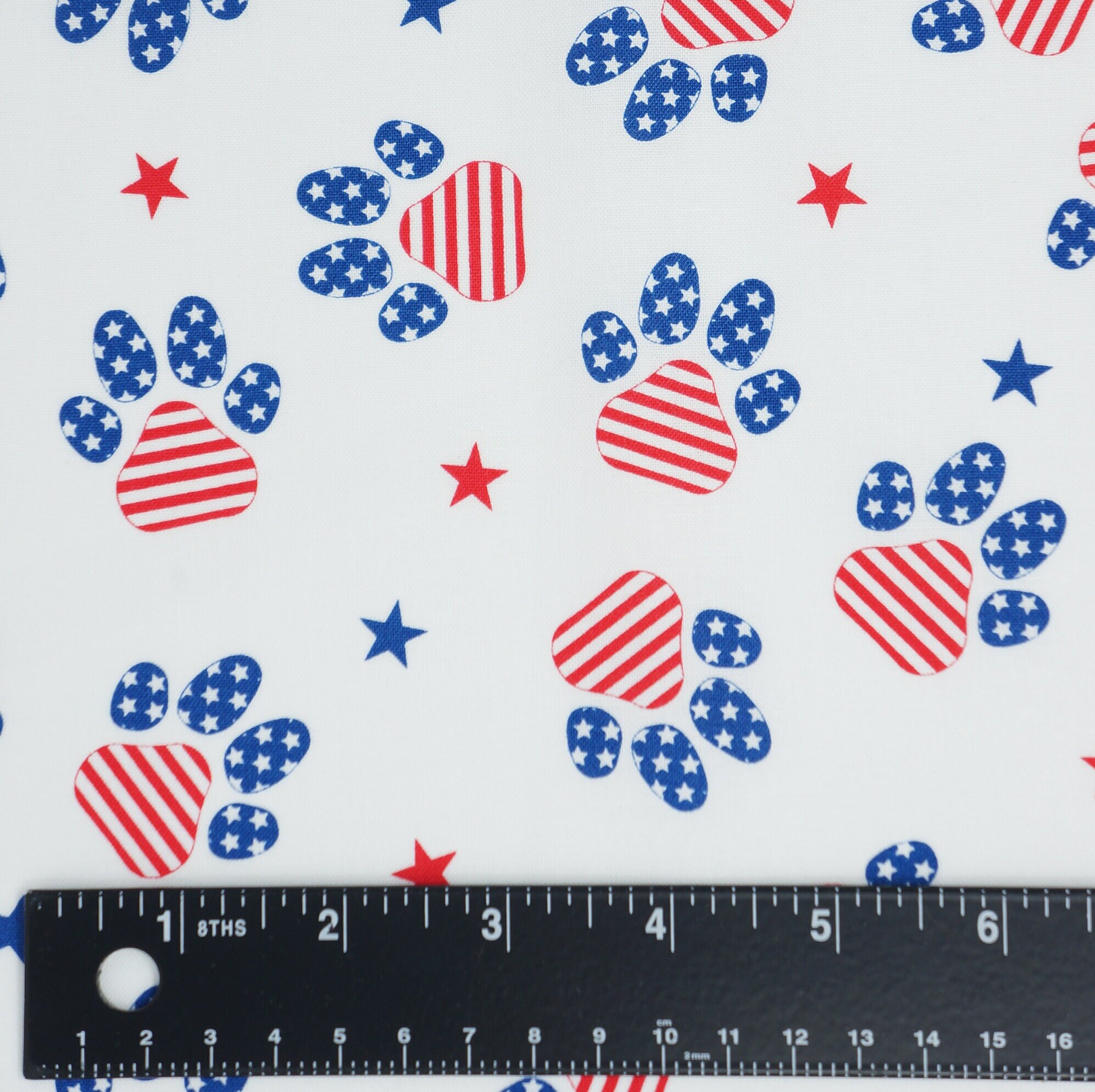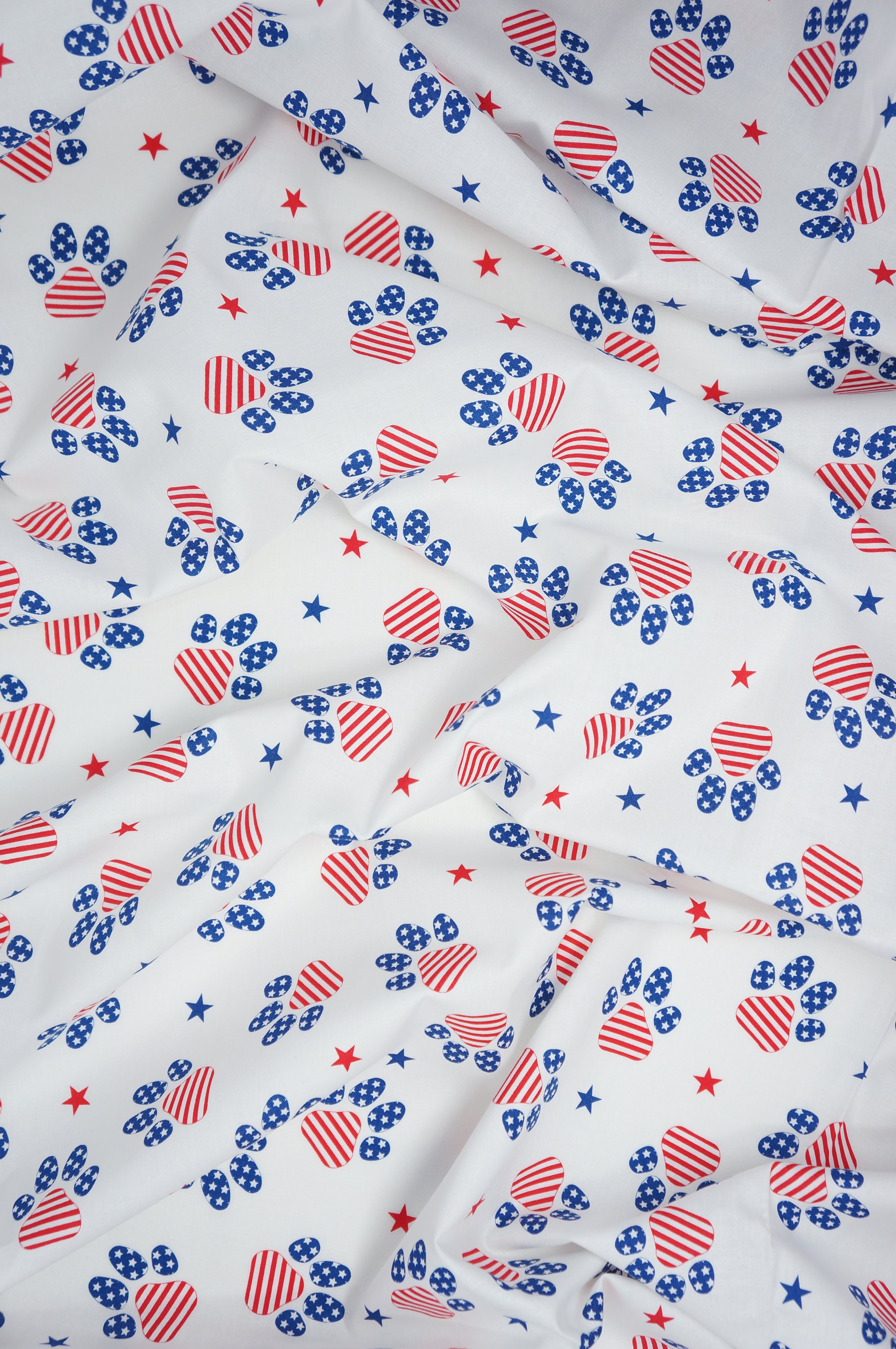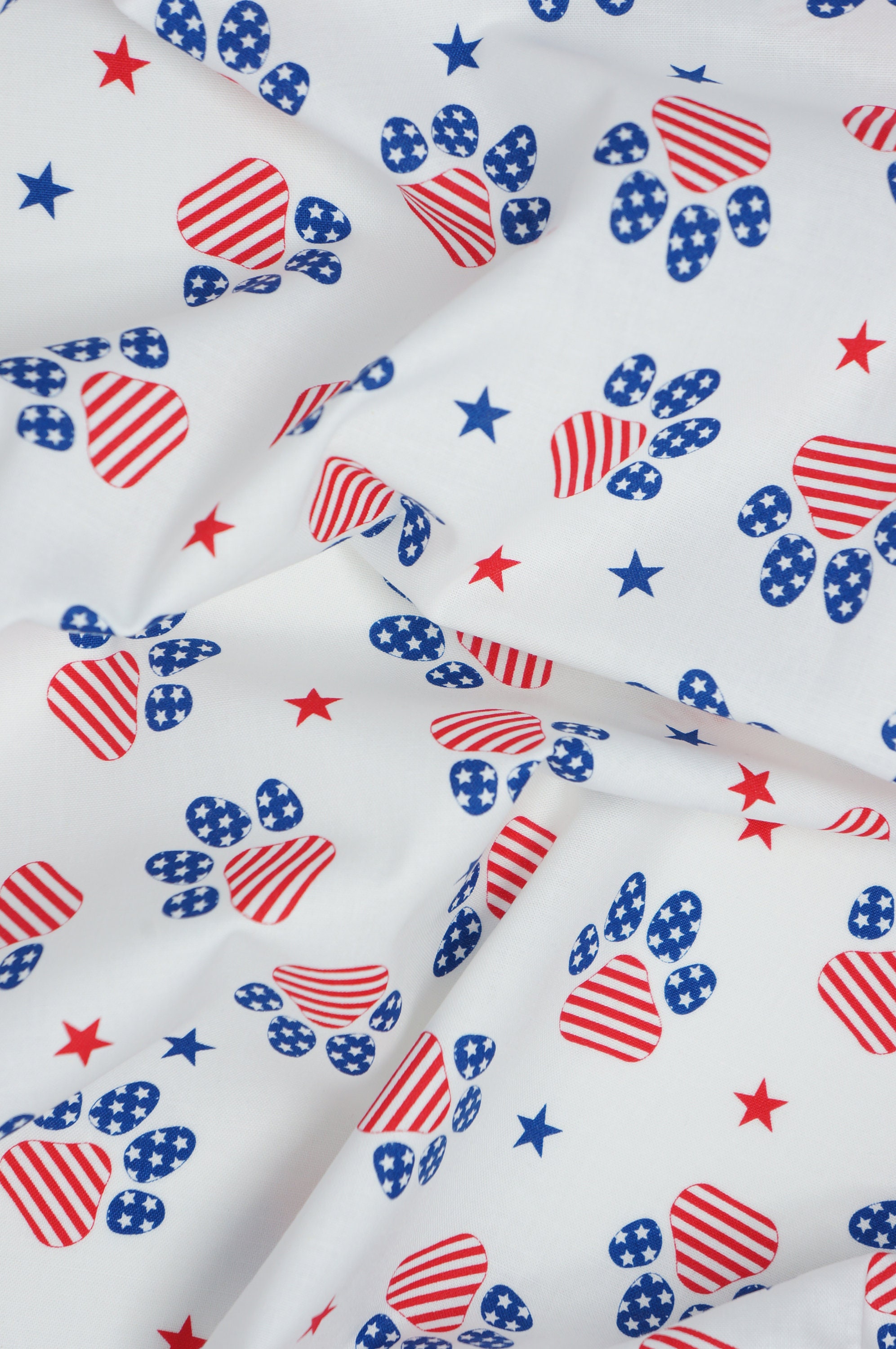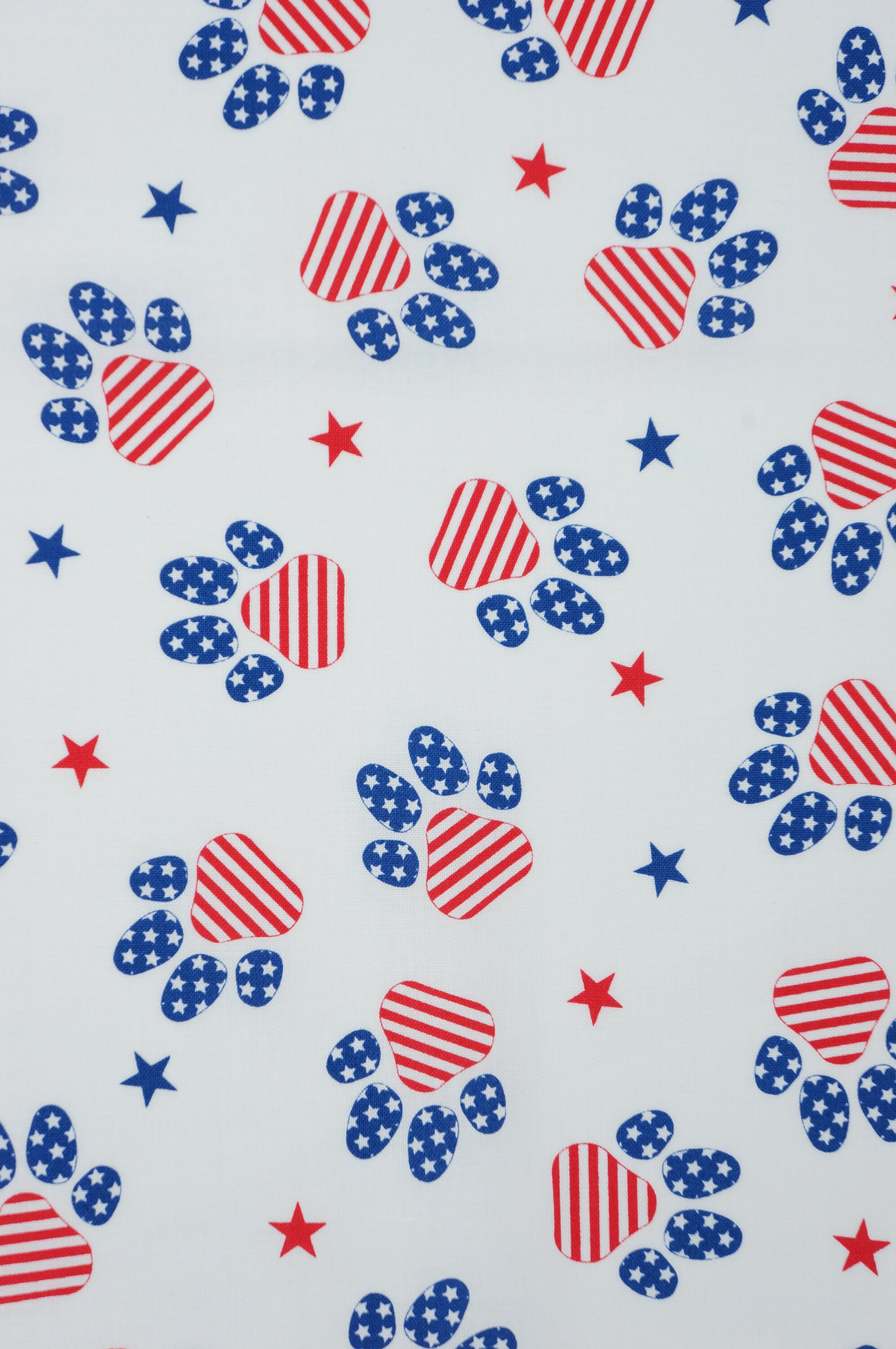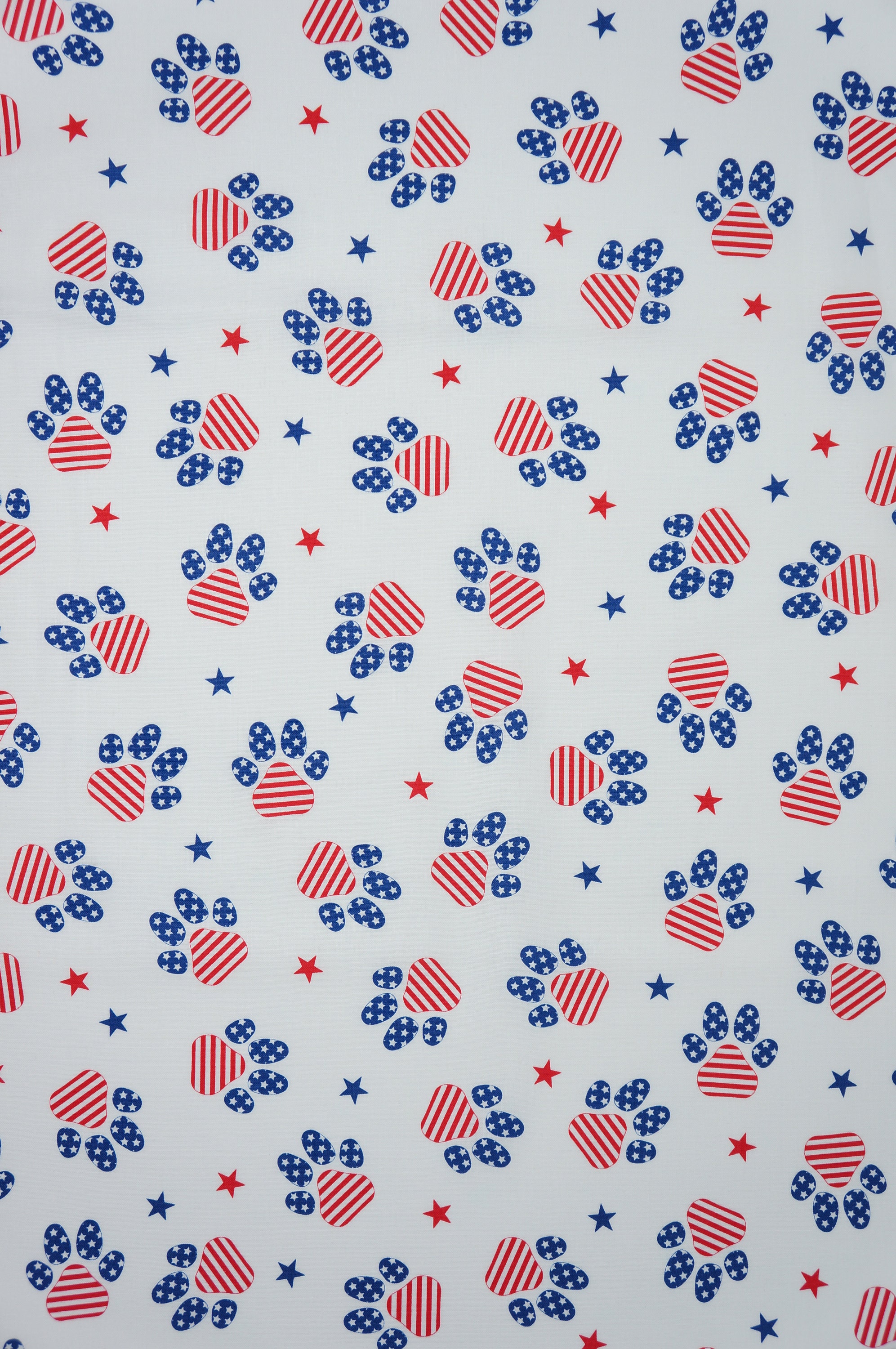 Show your love for your furry friends and your country with this patriotic paw prints fabric by Singer! This novelty cotton fabric features dog and cat paw prints in red, white and blue on a white background. It's perfect for making quilts, pillows, bags, masks and more for Independence Day or any day. This fabric is soft, durable and easy to sew. Order yours today and celebrate the 4th of July with your four-legged companions!