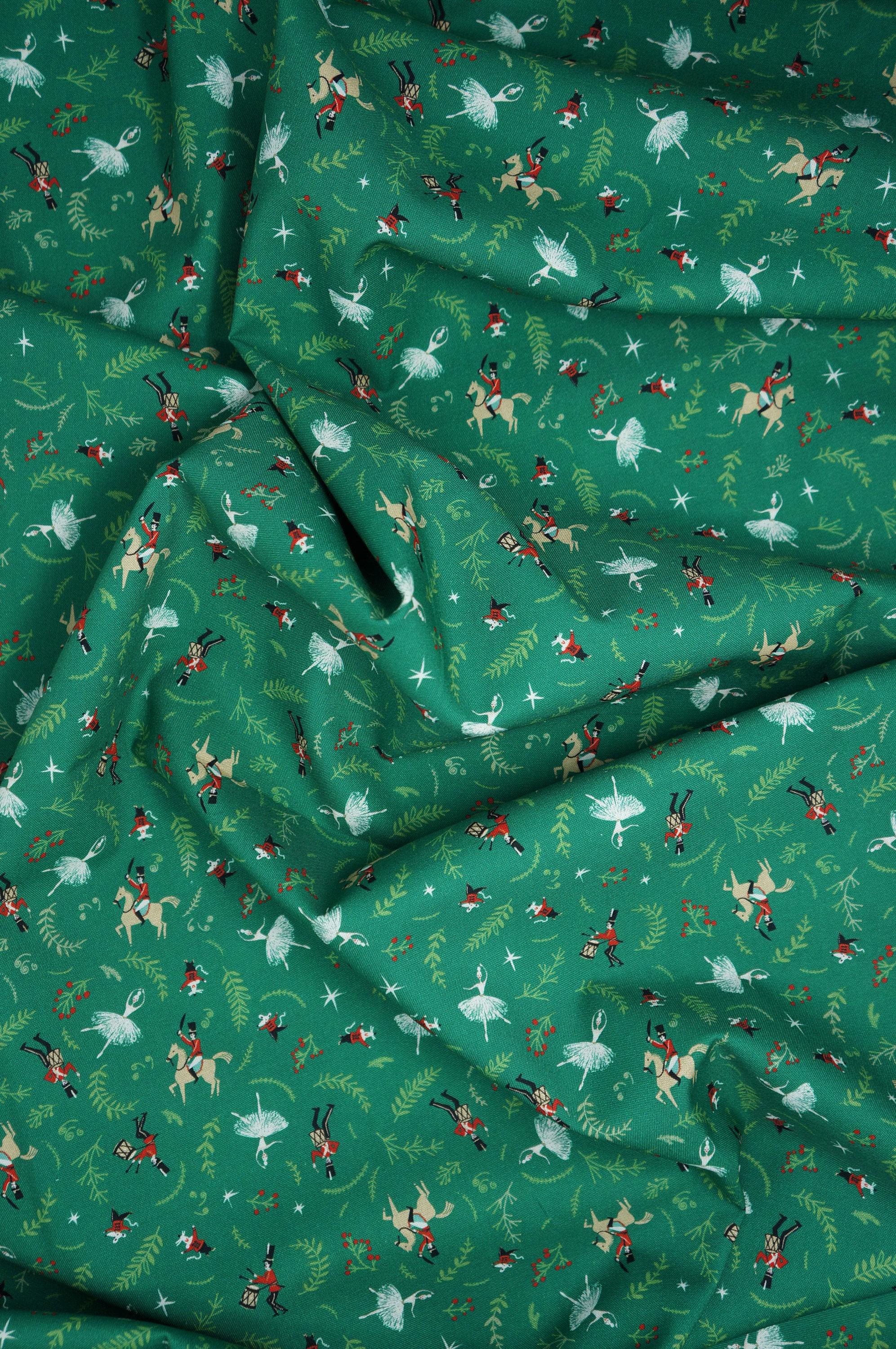 If you love the Nutcracker Ballet, you will adore this Nutcracker Dance on Green by Timeless Treasures Quilting Cotton Fabric! This festive fabric features the nutcracker dancing along with a beautiful ballet dancer in white on a green background, along with Christmas greenery and stars. It's perfect for making Christmas quilts, pillows, table runners, and more. This high quality fabric is 100% cotton, durable, soft and easy to sew. Order yours today and get ready to celebrate the magic of the Nutcracker Ballet!