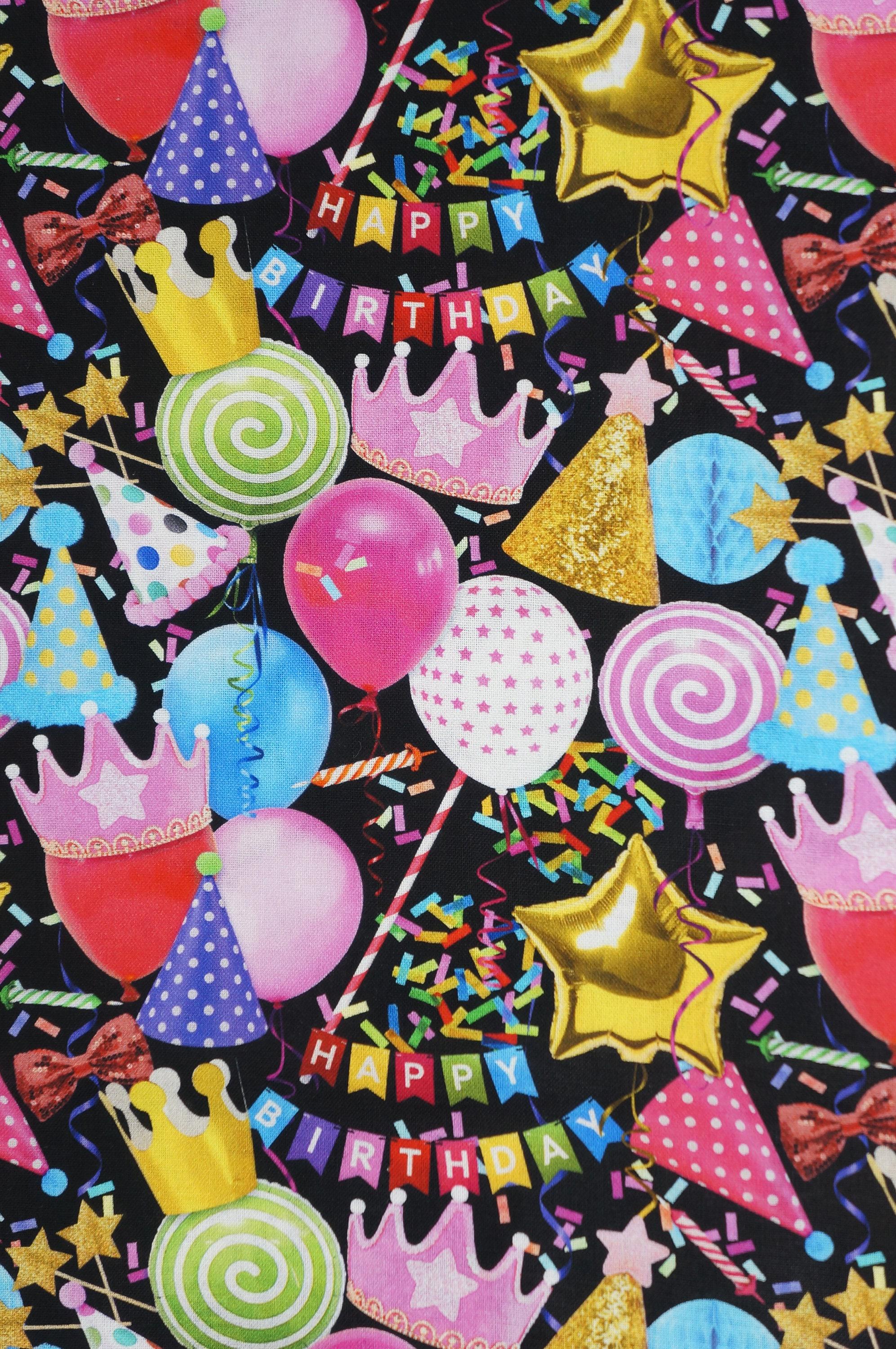 Celebrate your special day with this festive and fun fabric! This novelty cotton fabric features colorful balloons, party hats, confetti, streamers and a banner the words "Happy Birthday" on a black background. It's perfect for making party decorations, banners, tablecloths, napkins, gift bags and more. This fabric is 100% cotton and easy to sew and wash. It measures 43 inches wide. Order now and get ready to party!