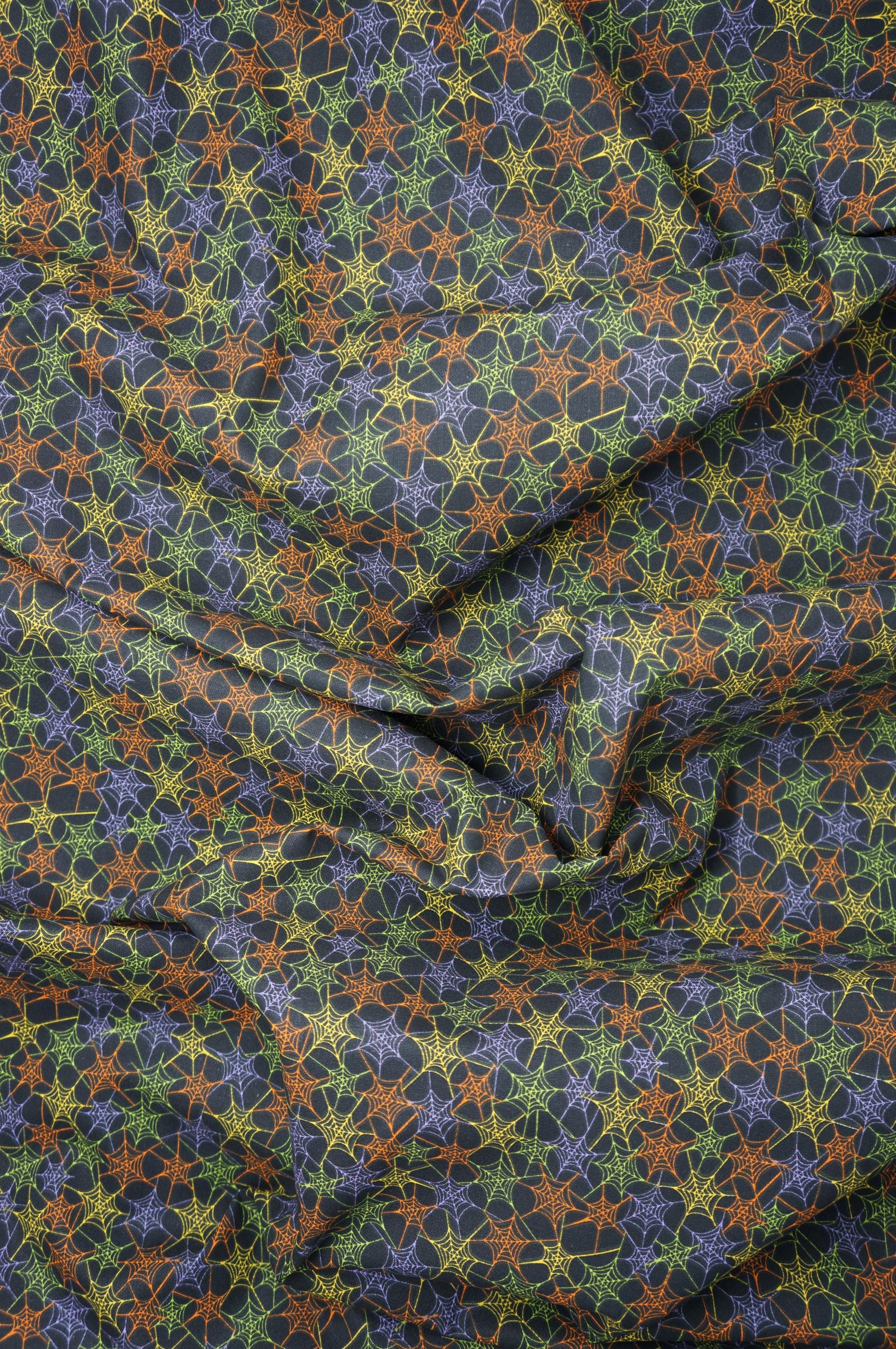 If you're looking for a spooky fabric for your Halloween projects, look no further than Multicolored Spider Webs on Black Halloween Novelty Cotton Fabric. This fabric is soft and durable, and it features a charming design of multicolored spider webs black background. The spider webs are purple, orange, green and yellow. You can use this fabric to make costumes, decorations, quilts, pillows, and more. Multicolored Spider Webs on Black Novelty Cotton Fabric will add some cute spookiness to your Halloween crafts.