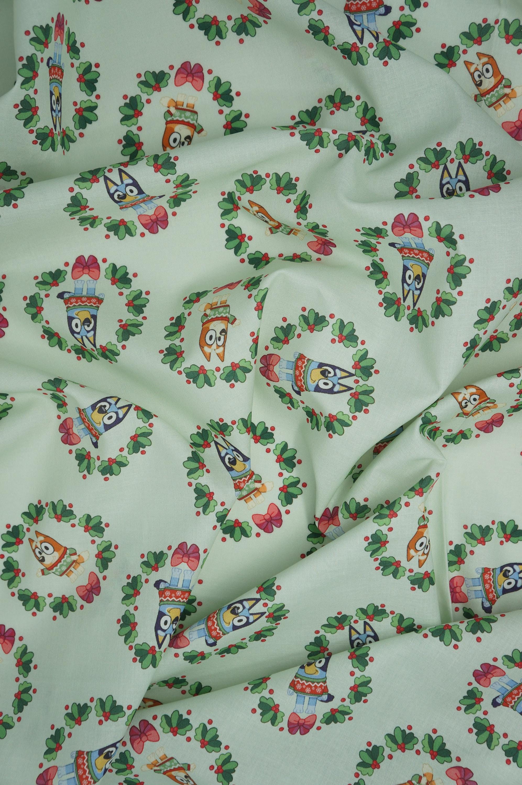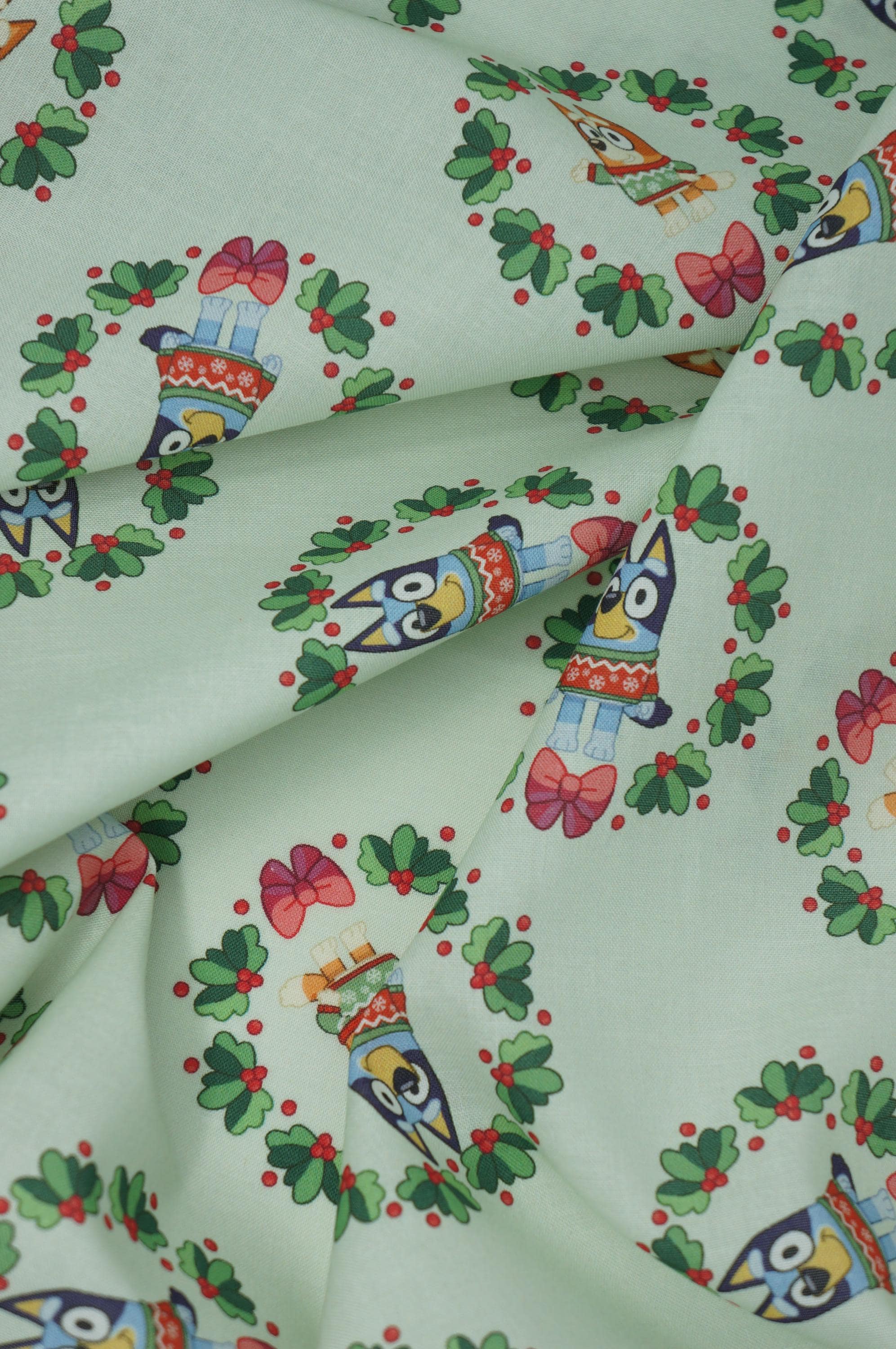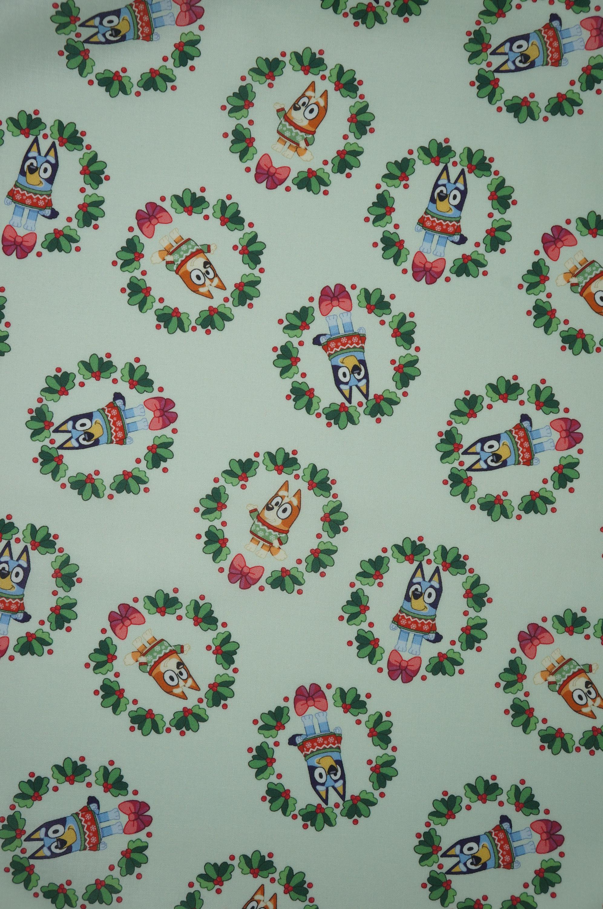 Get ready to bring the holiday cheer with our delightful Disney Junior Christmas Bluey Novelty Cotton Fabric! Licensed by Ludo Studios and manufactured by Springs Creative, this enchanting fabric showcases everyone's favorite pups, Bluey and Bingo, nestled in festive holiday wreaths on a charming light green background. Perfect for the little ones who are crazy about Bluey, this cotton fabric is ideal for crafting holiday outfits, adorable decorations, or special Christmas gifts. Let your creativity shine this season with a fabric that's as joyful and fun as the holiday itself!