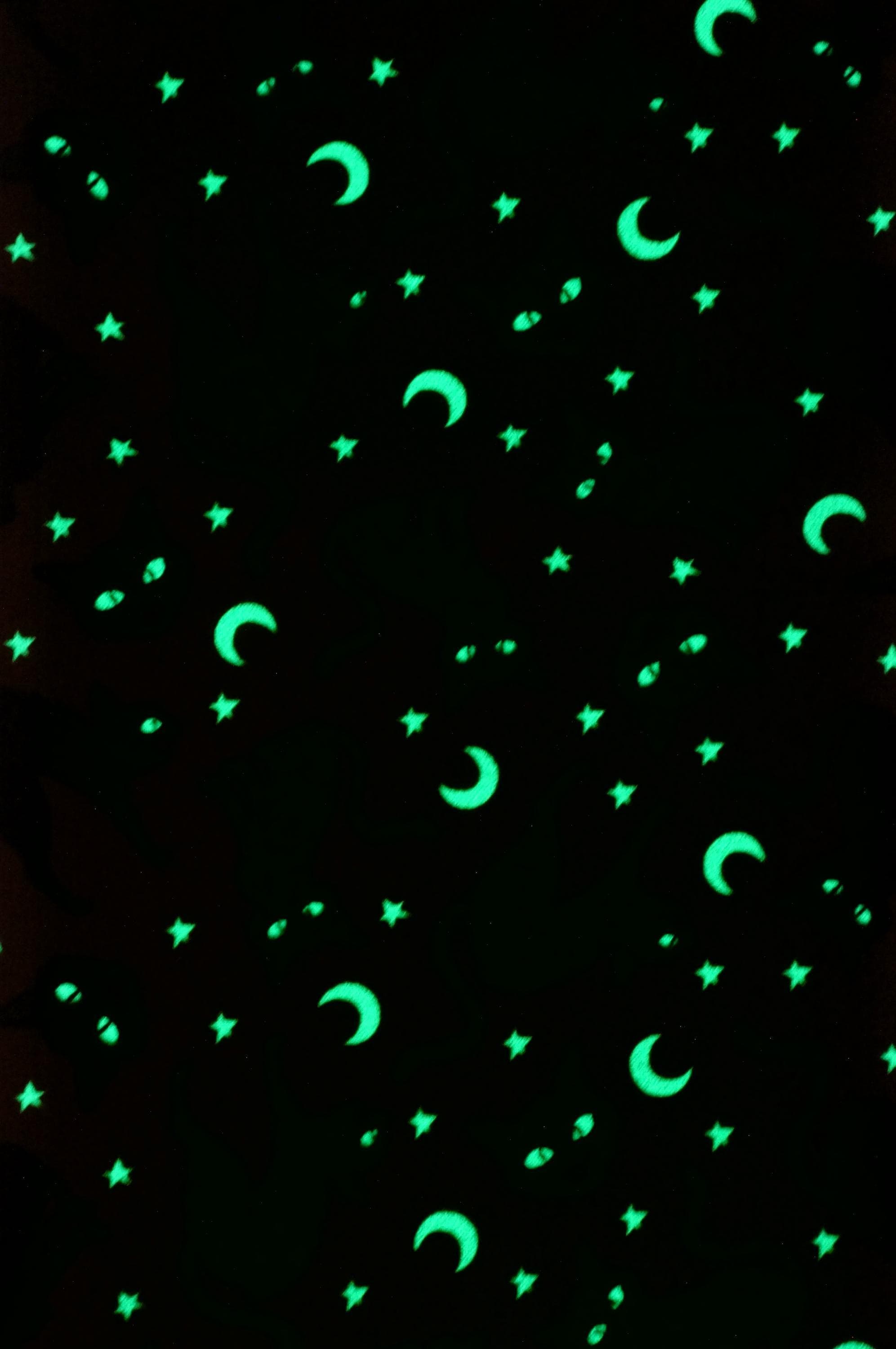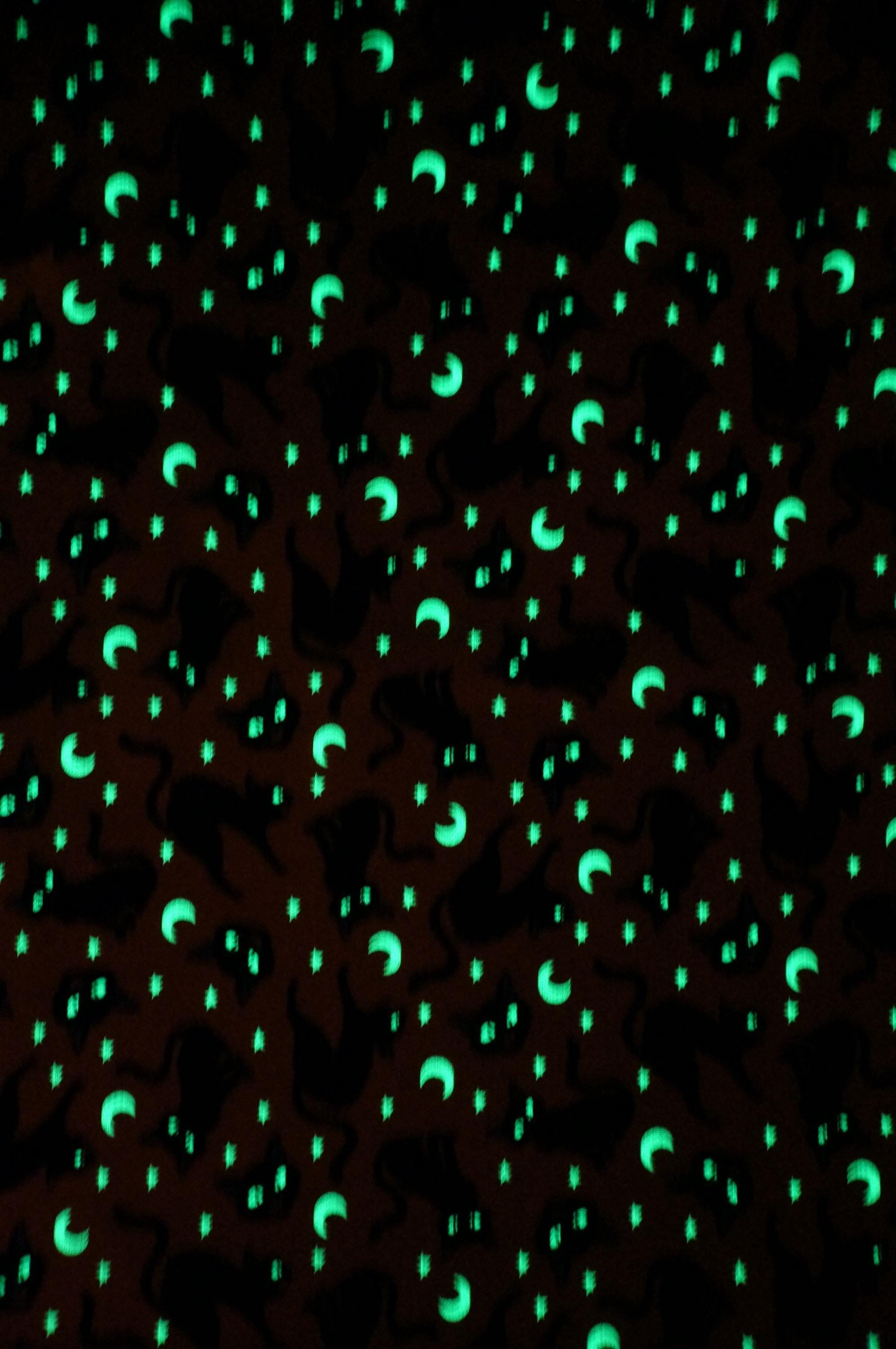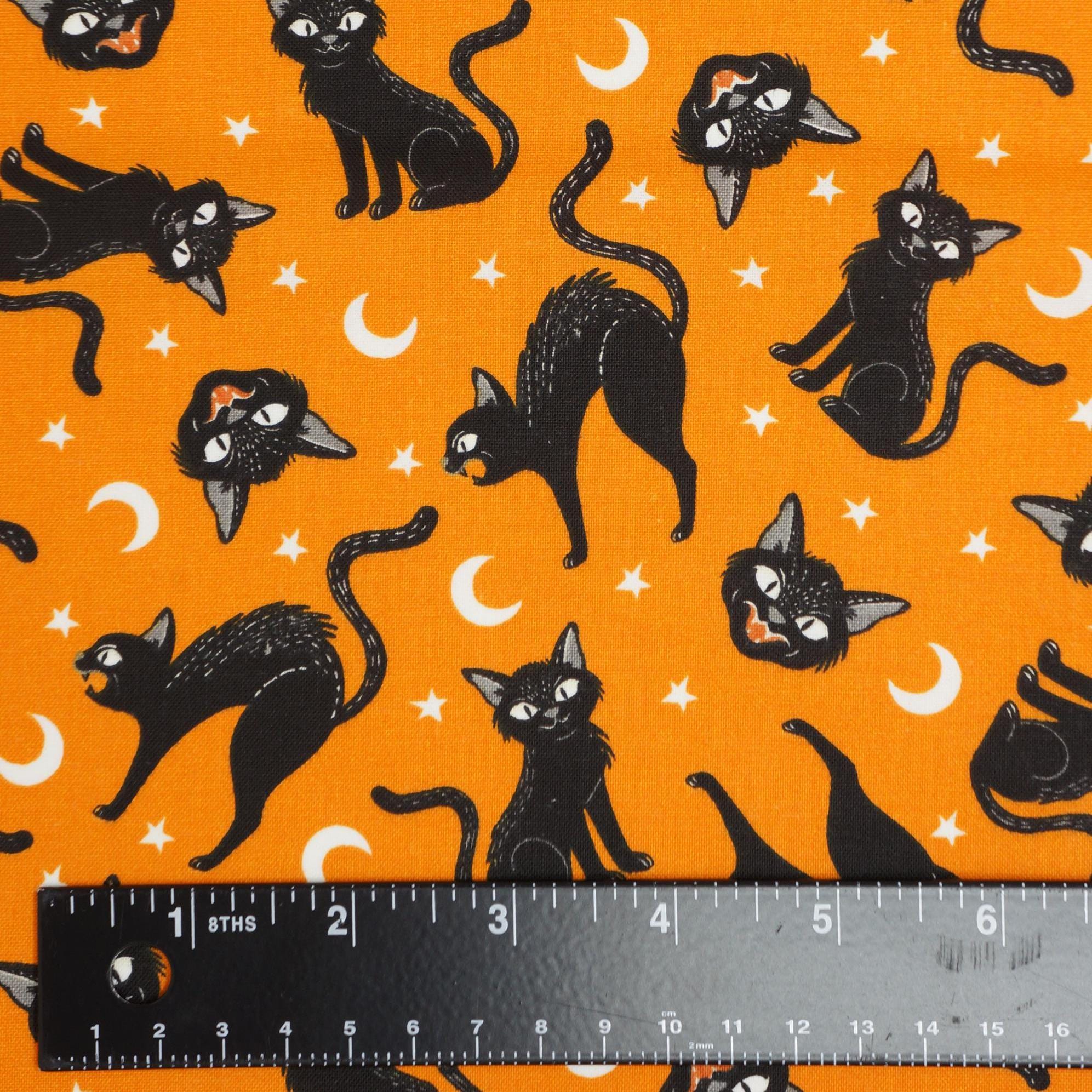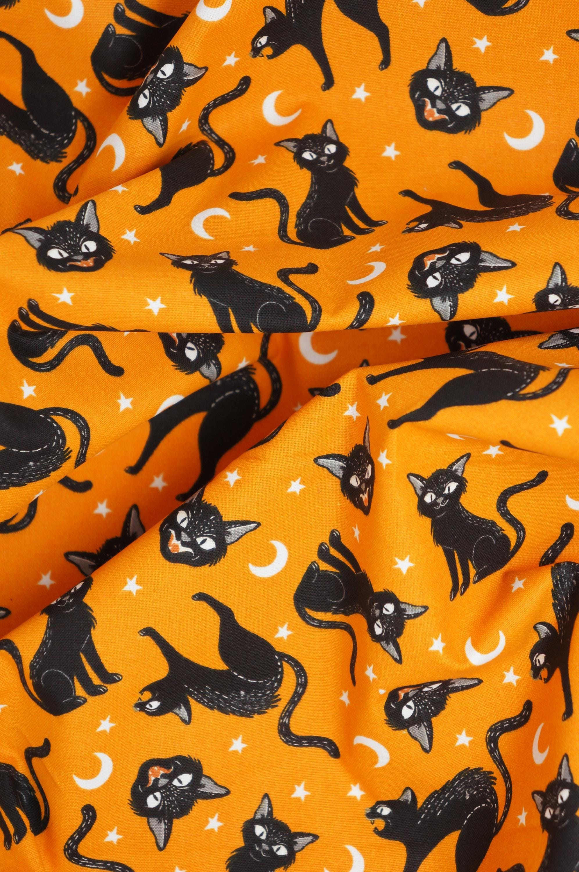 If you love Halloween, you will adore this fabric glow in the dark Halloween Cat fabric. It features cute black cats, moons and stars on an orange background. Activate the glow with a bright light, turn out the lights, and the stars and moons glow in the dark! This fabric is made of 100% cotton and is perfect for making trick or treat bags, costumes, quilts, pillows and more. Celebrate the spooky season with this fun and festive fabric!
