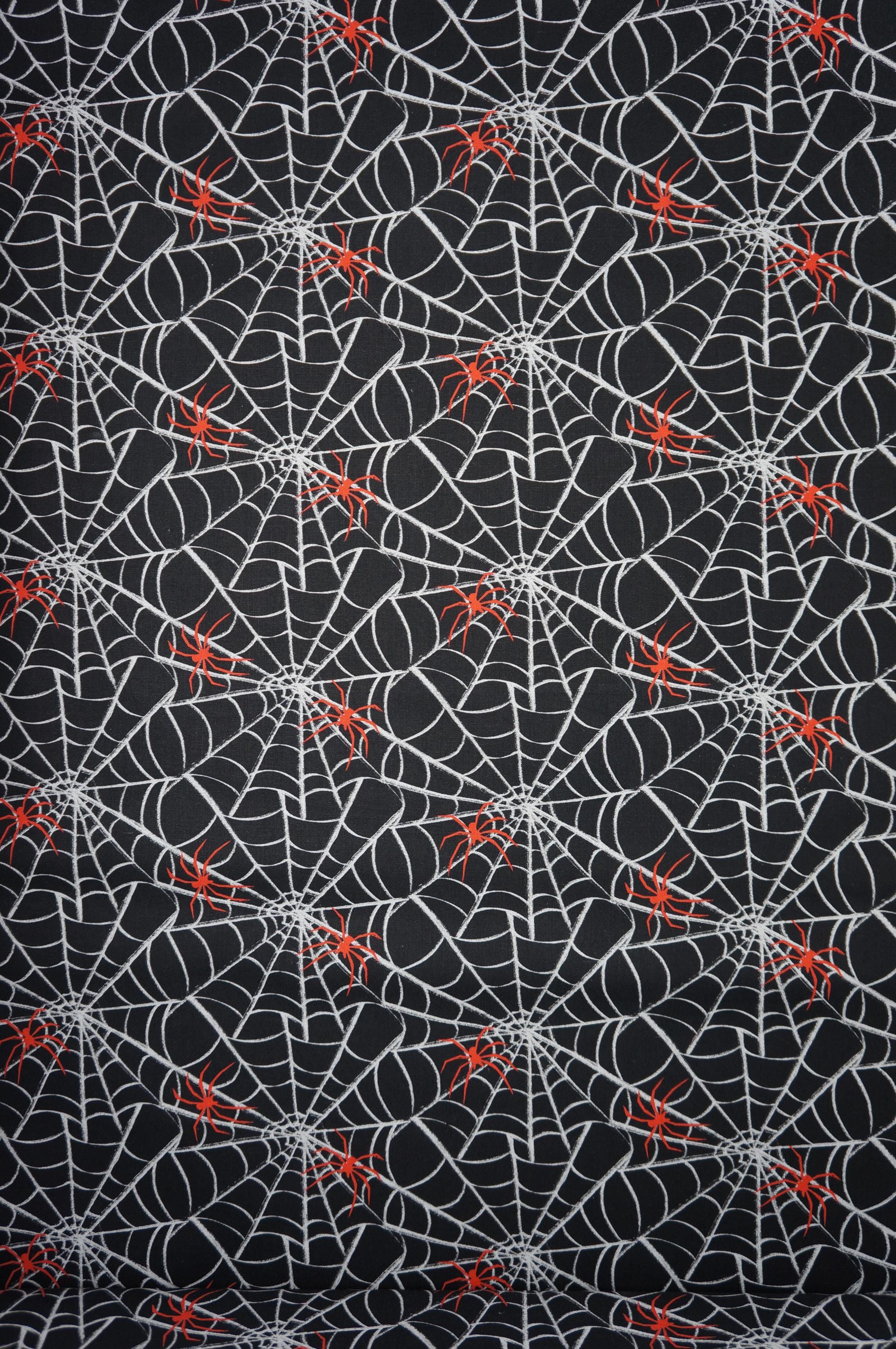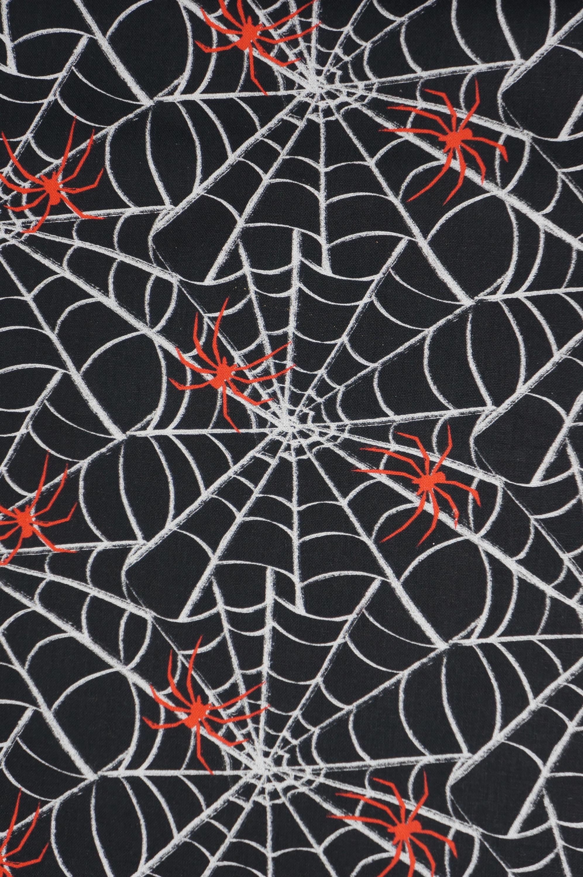 If you're looking for a spooky fabric for your Halloween projects, look no further than the Web to Weave novelty cotton fabric designed by Concord House for Springs Creative. This fabric is soft and durable, and it features a charming design of ghostly white spider webs black background with red spiders climbing on the webs. You can use this fabric to make costumes, decorations, quilts, pillows, and more. This spiderweb fabric will add some ghostly spookiness to your Halloween crafts.
