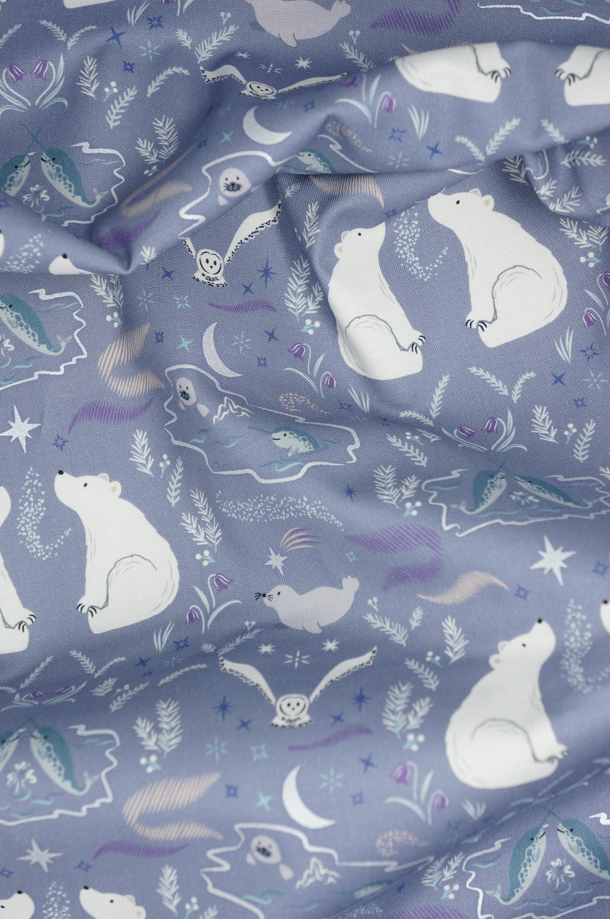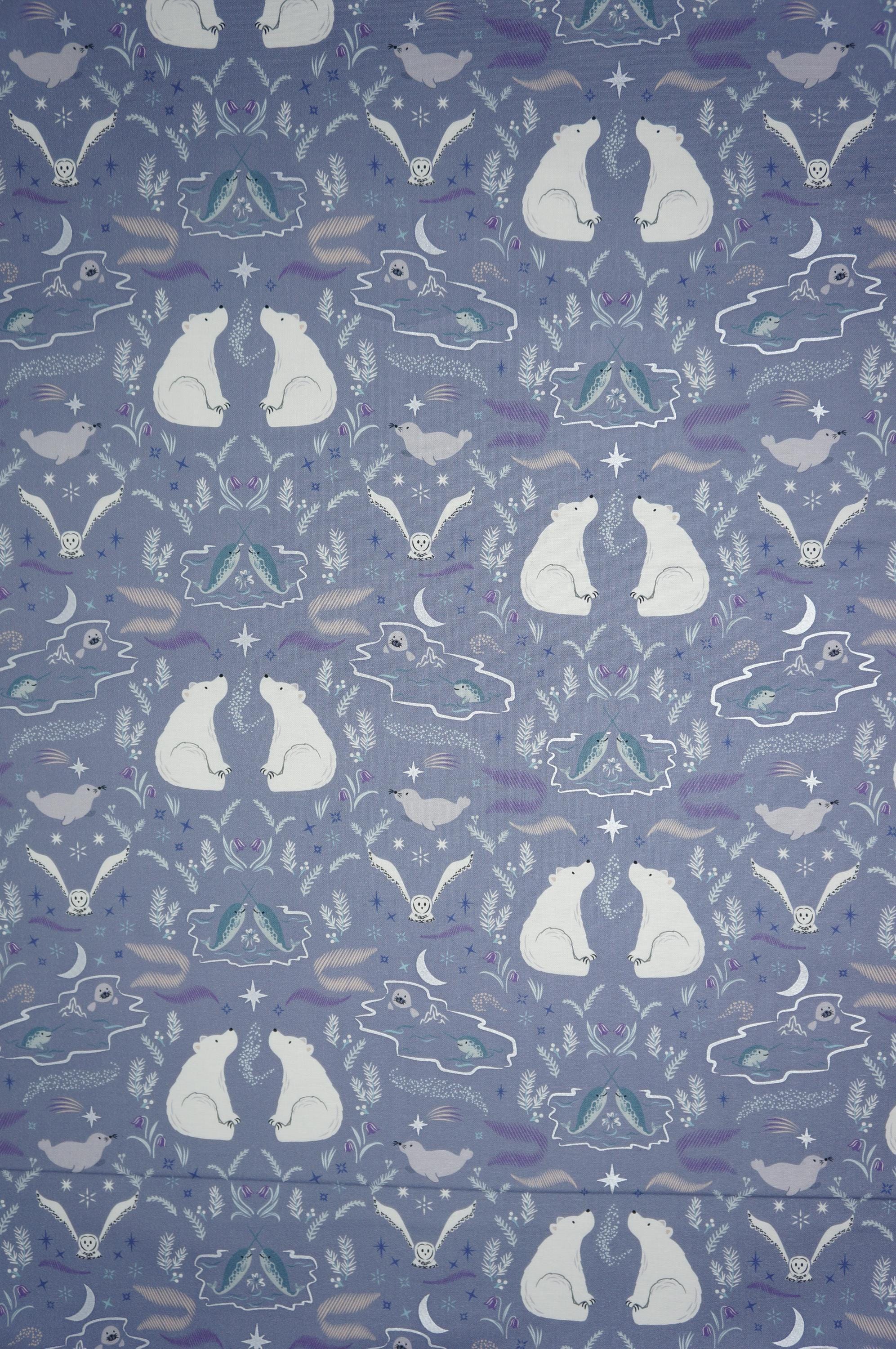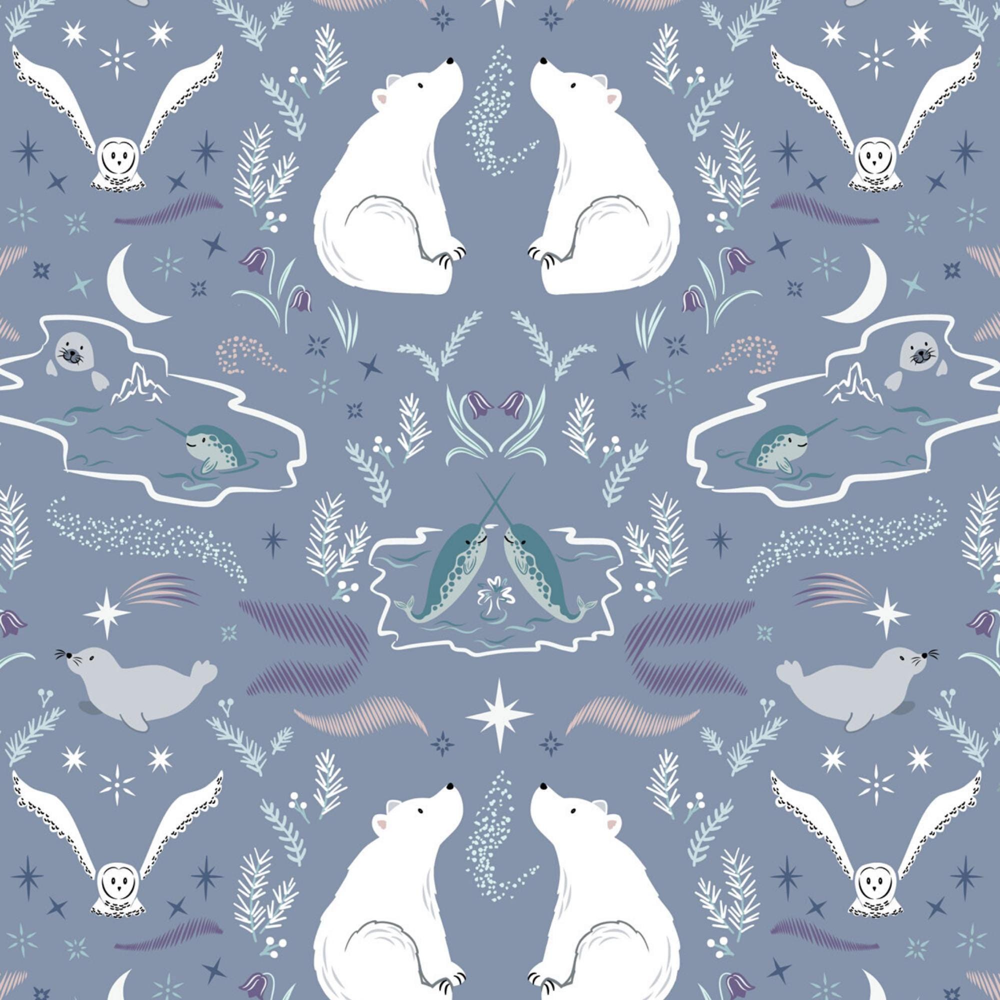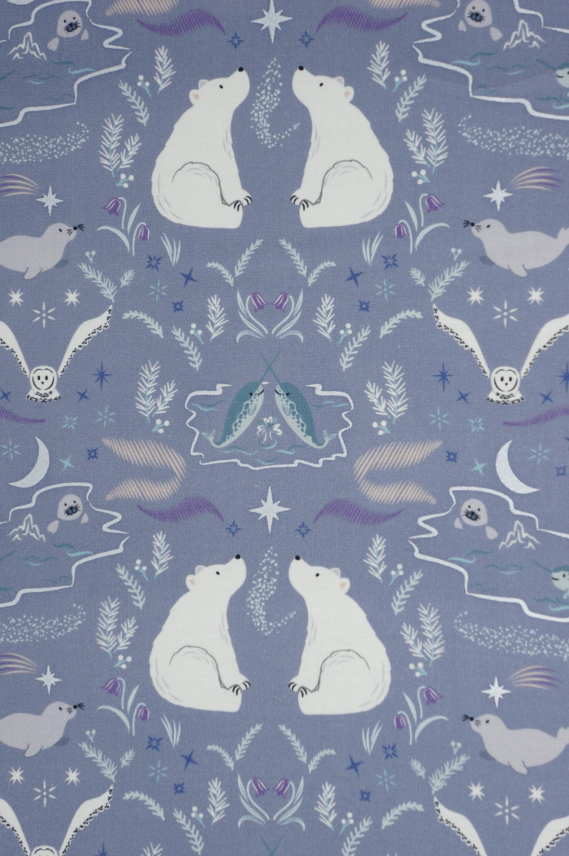 Introducing the Arctic Animal Quilting Cotton Fabric from the True North Collection by Cassandra Connolly – a whimsical, nature-inspired masterpiece perfect for your next quilting project! This enchanting fabric captures the beauty of the Arctic, featuring majestic polar bears, playful narwhals, adorable seals, and wise owls, all set against a serene pearl blue(purplish blue) background. Delight in the magical northern light flourishes, tundra floral accents, and twinkling stars that bring the frosty wonderland to life. Crafted from high-quality cotton, this fabric is not only soft and durable but also an absolute dream for quilting, crafting, and more. Add a touch of Arctic charm to your creations today!