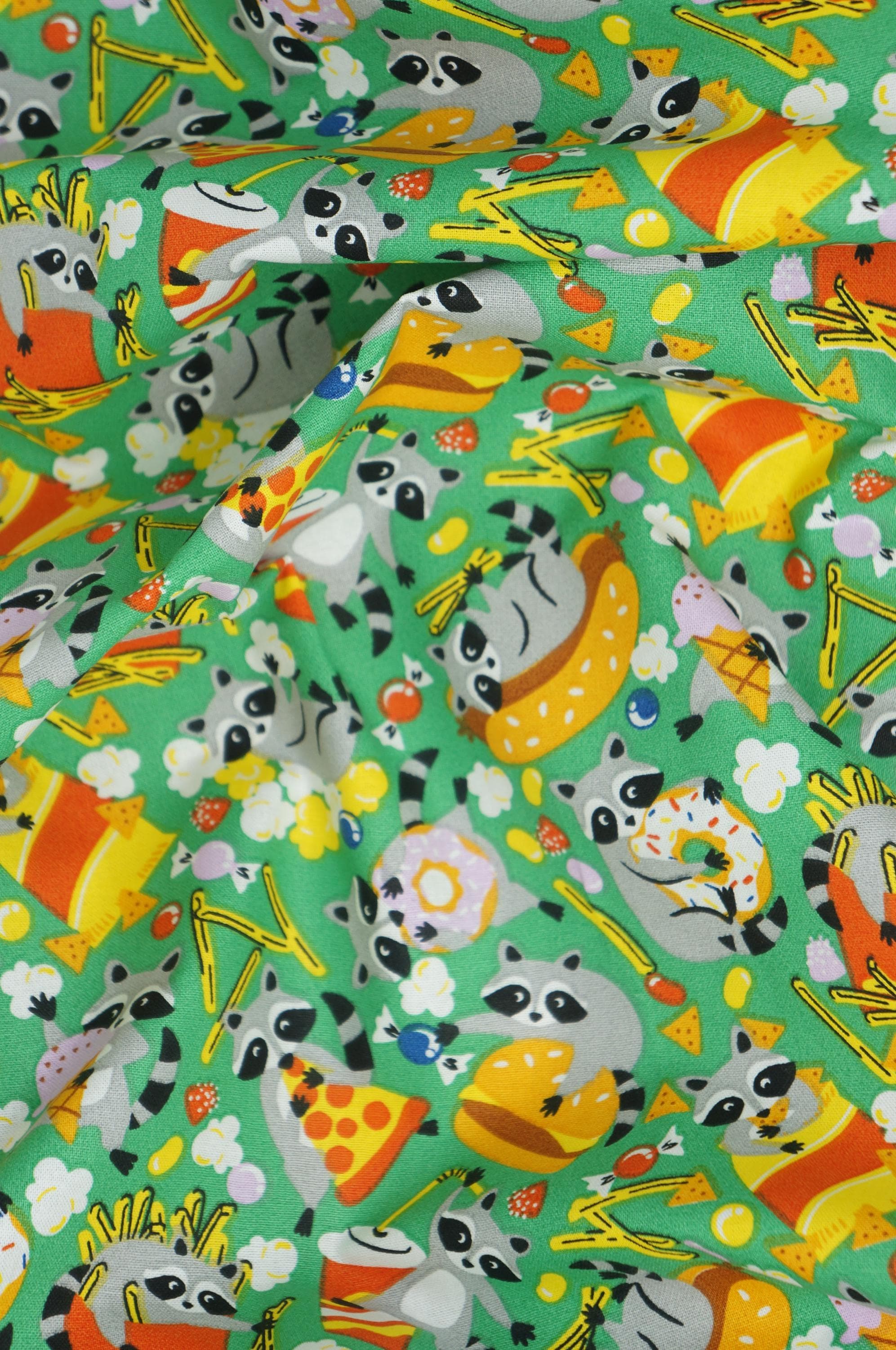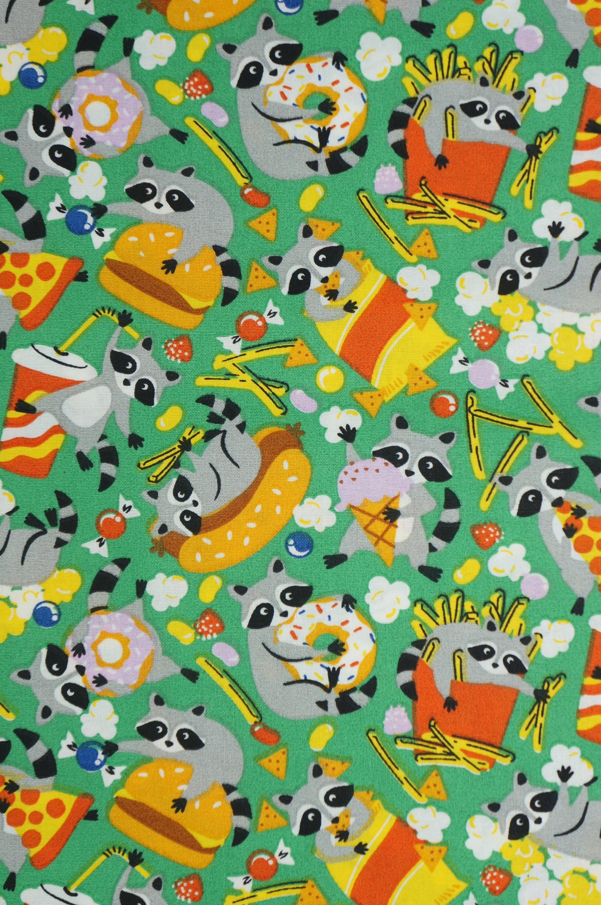 Get ready to add some playful charm to your next sewing project with this Raccoons Eating Junk Food on Green Novelty Cotton Fabric! This delightful fabric showcases mischievous "Trash Pandas" or "Trash Bandits" at their finest, eating all sorts of delicious foods like pizza, donuts, French fries, and popcorn, all set against a vibrant green background. Whether you're crafting for a little one who loves all things raccoons or just want to inject some fun into your creations, this novelty cotton fabric is perfect for quilts, clothing, and home decor that’s sure to bring a smile to everyone’s face! Don't miss out on this quirky and adorable design—grab yours now and let your creativity run wild!