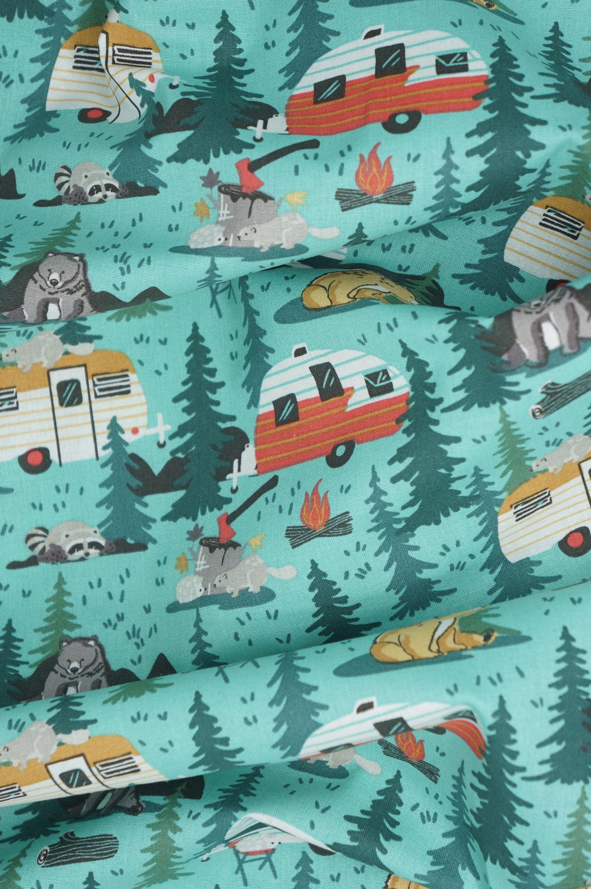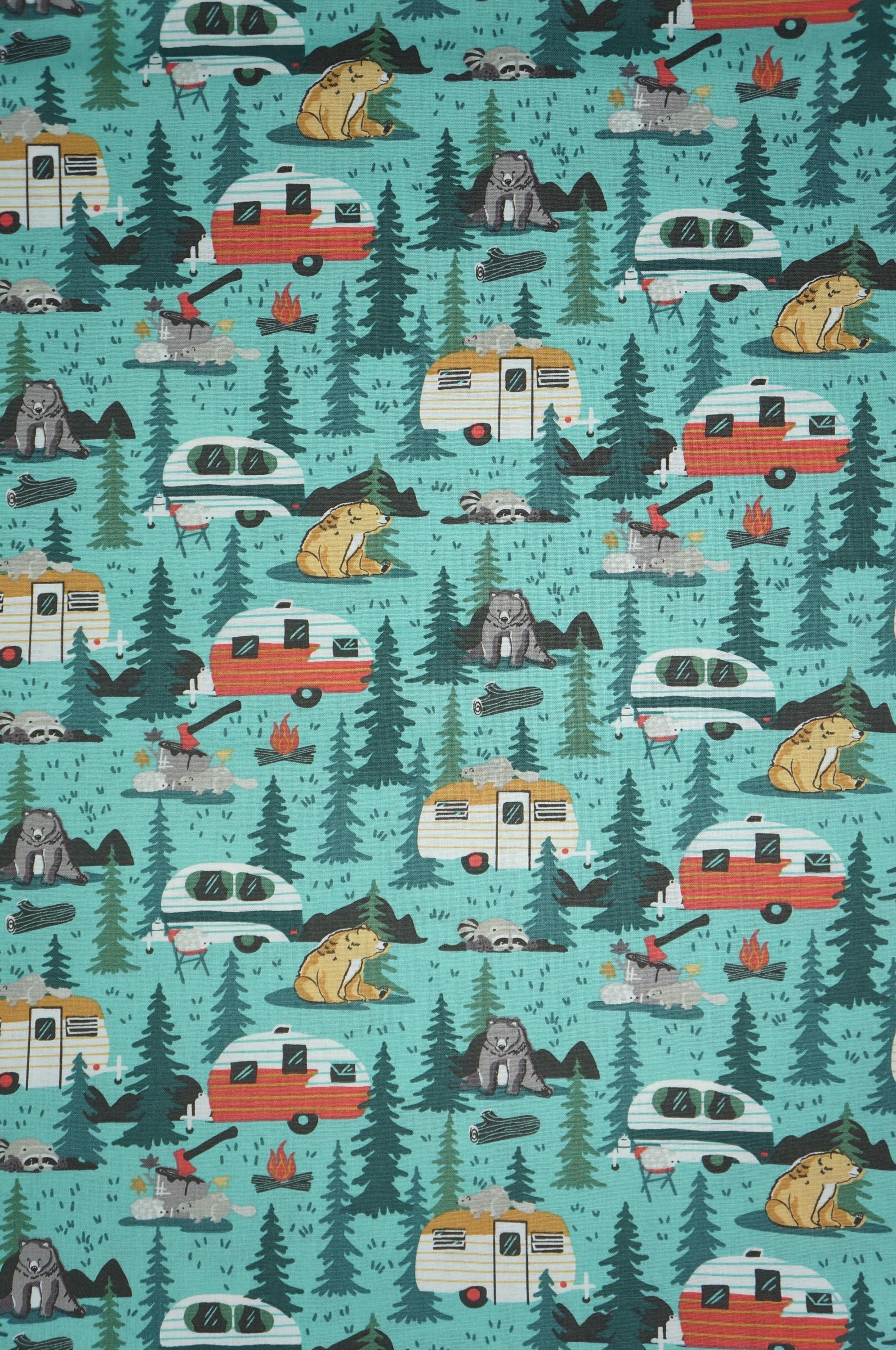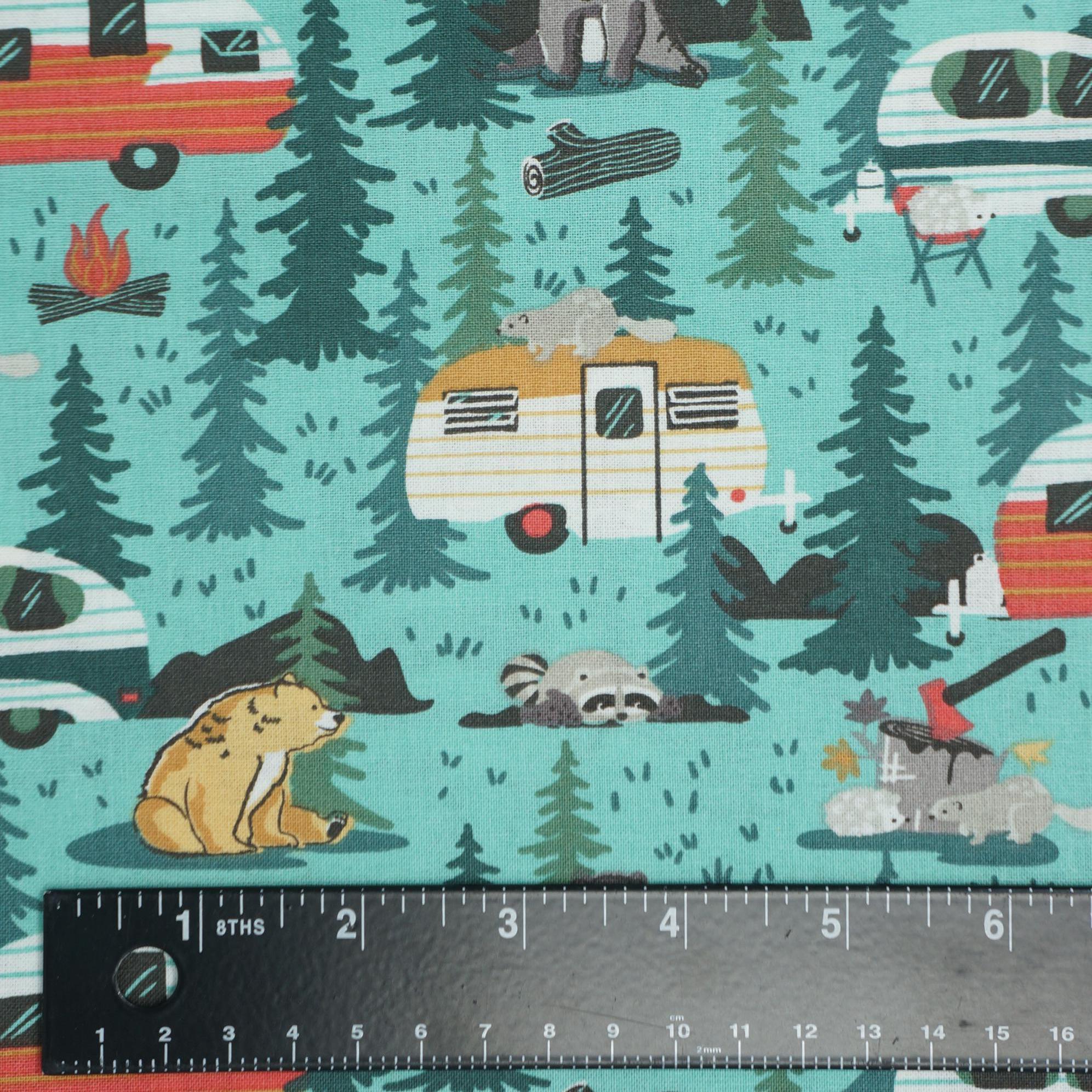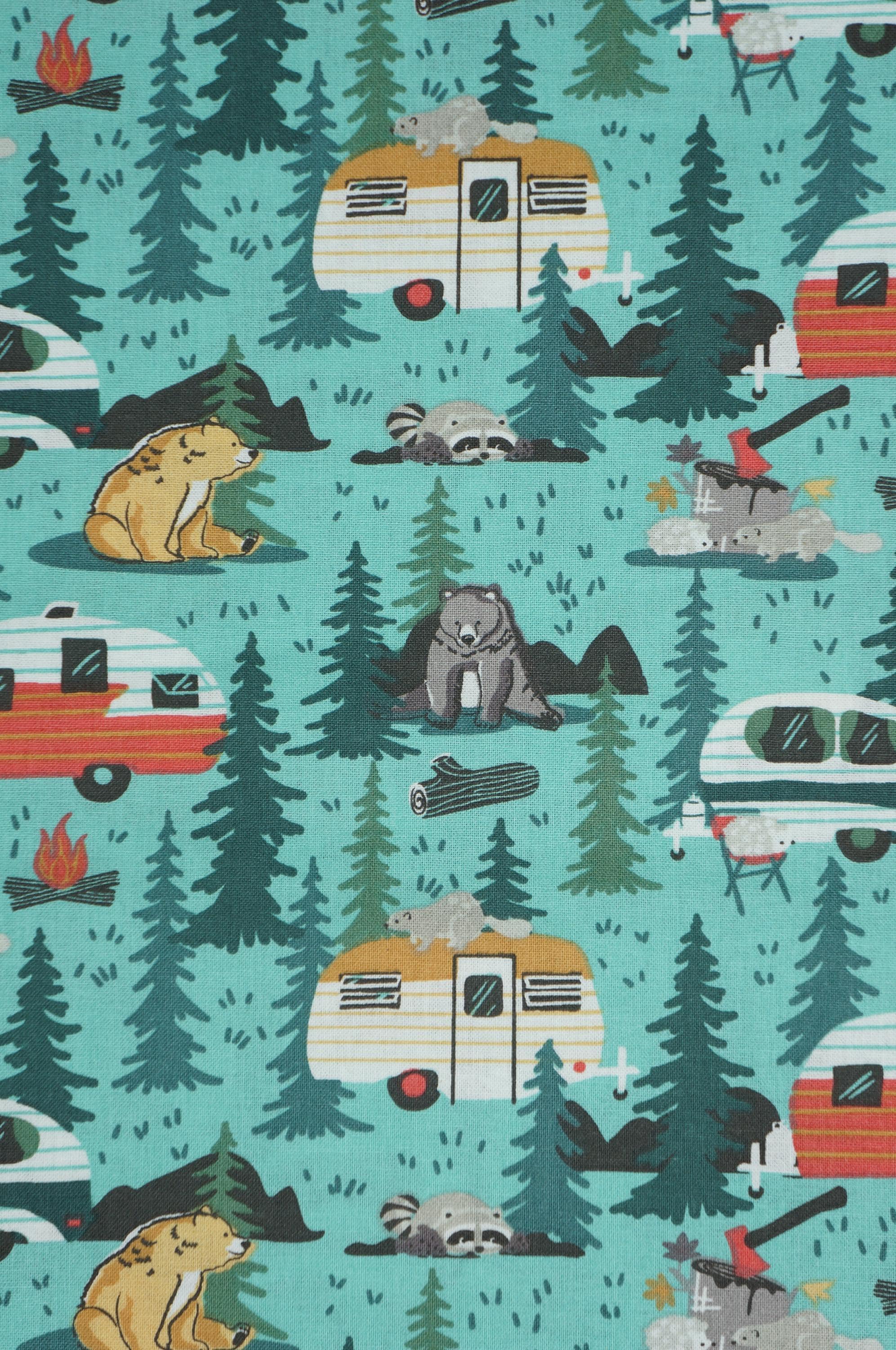 If you love camping and nature, you will adore this Camping Friends on Blue novelty cotton fabric! This fabric features adorable bears, racoons, hedgehogs, and beavers alongside retro campers in the woods on a green background. It's perfect for making blankets, home decor, pillows, and more. You will feel like you are in the great outdoors with this soft and durable fabric. Order yours today and get ready for some camping time!