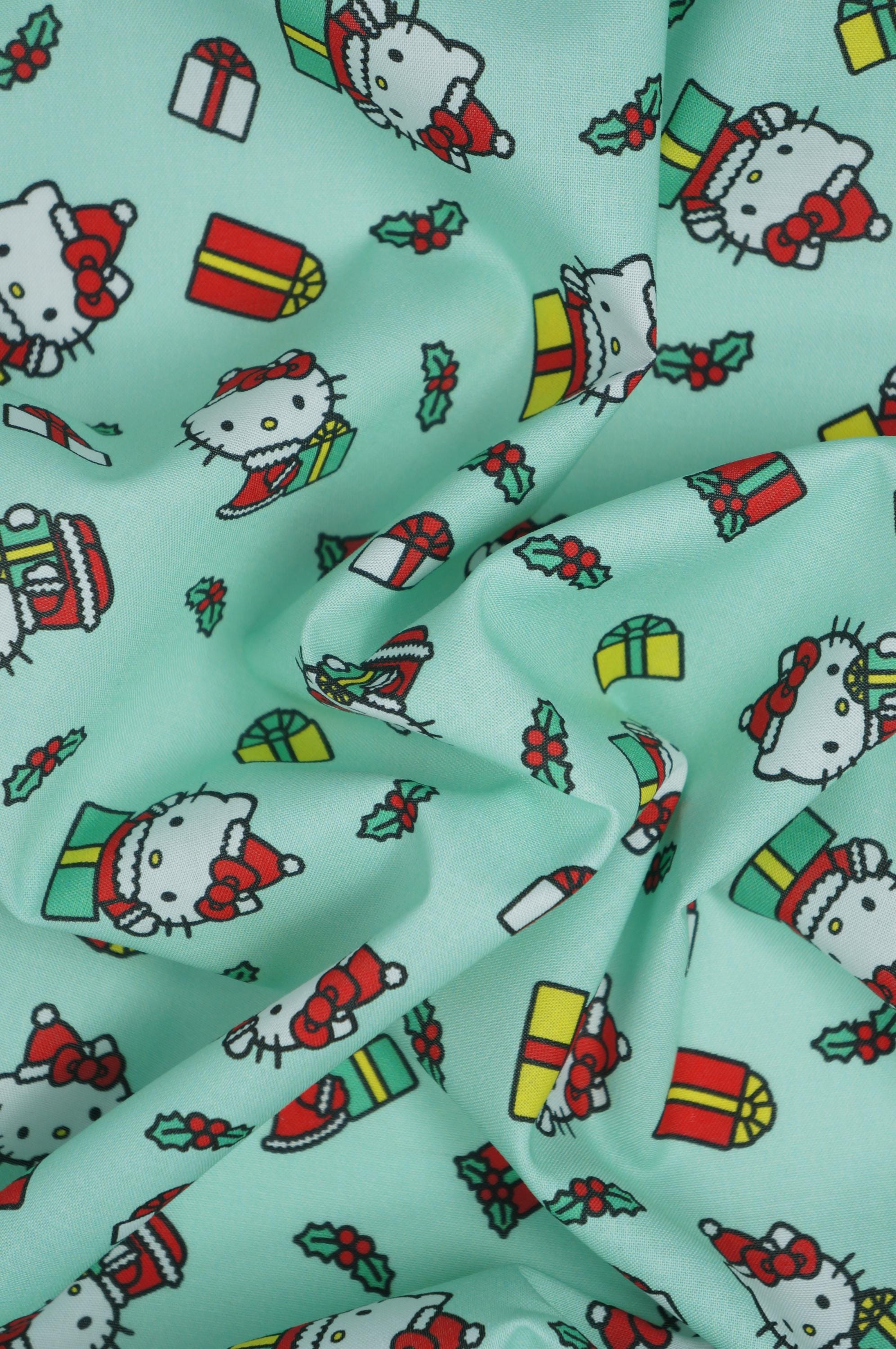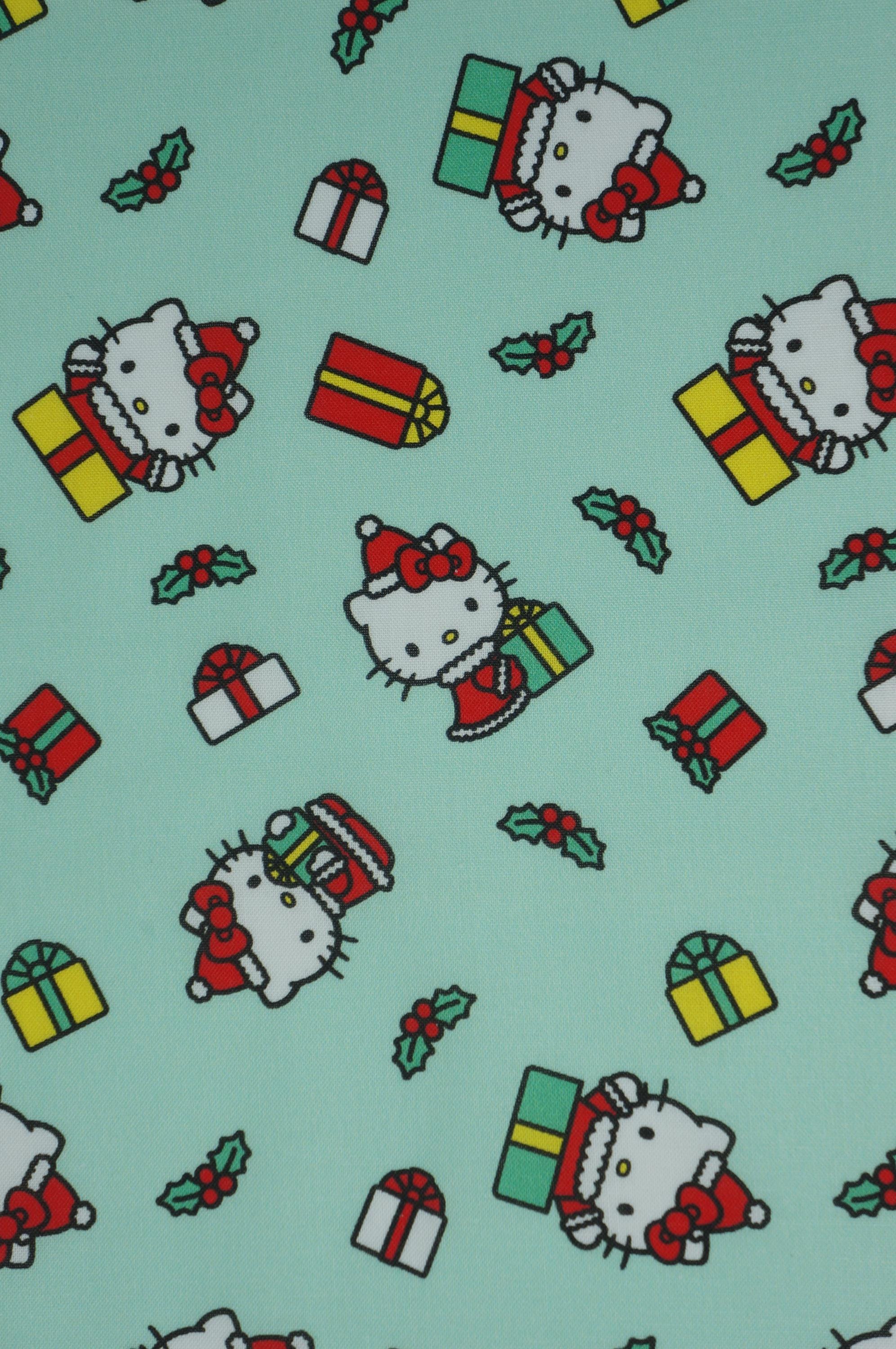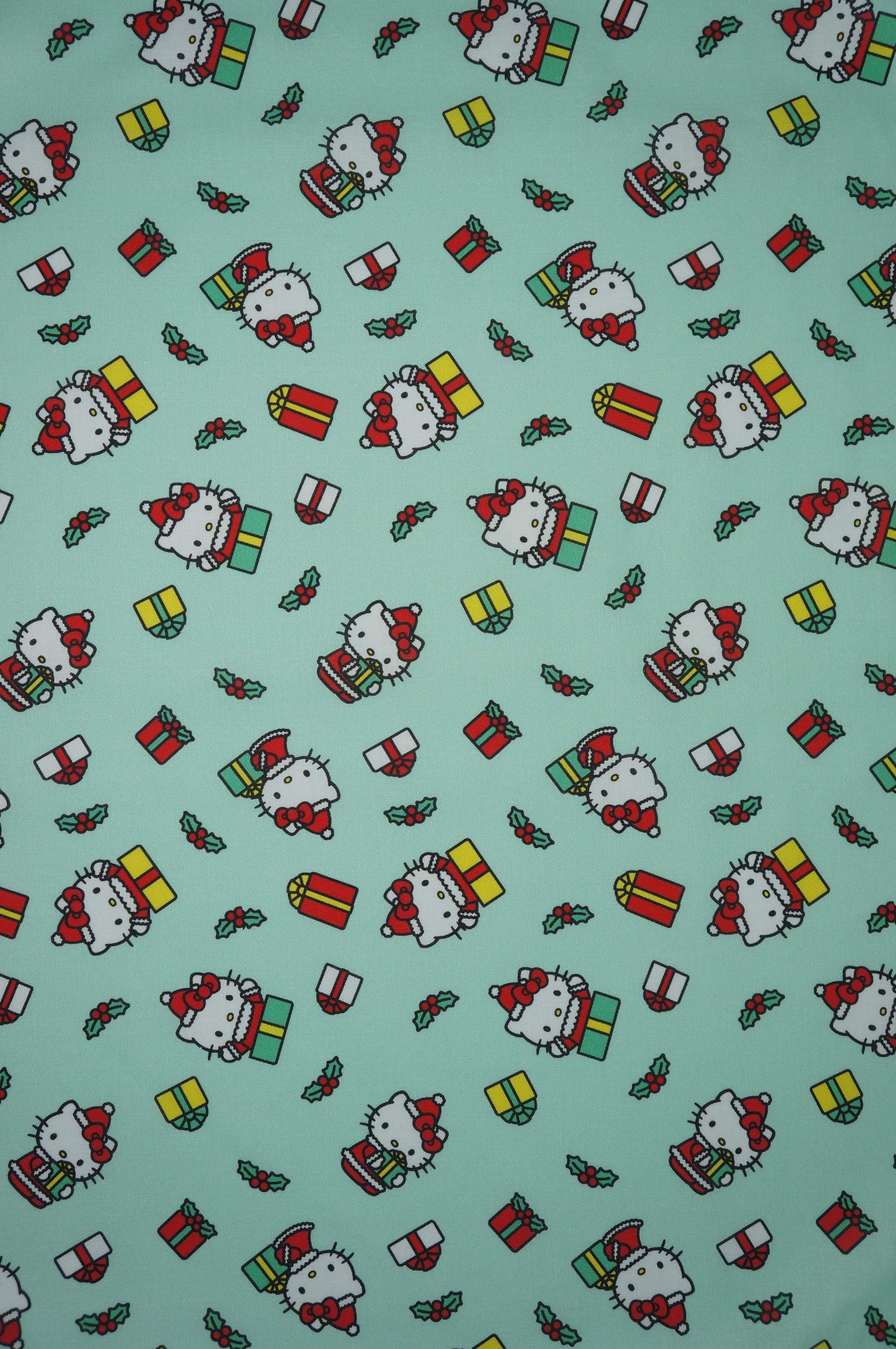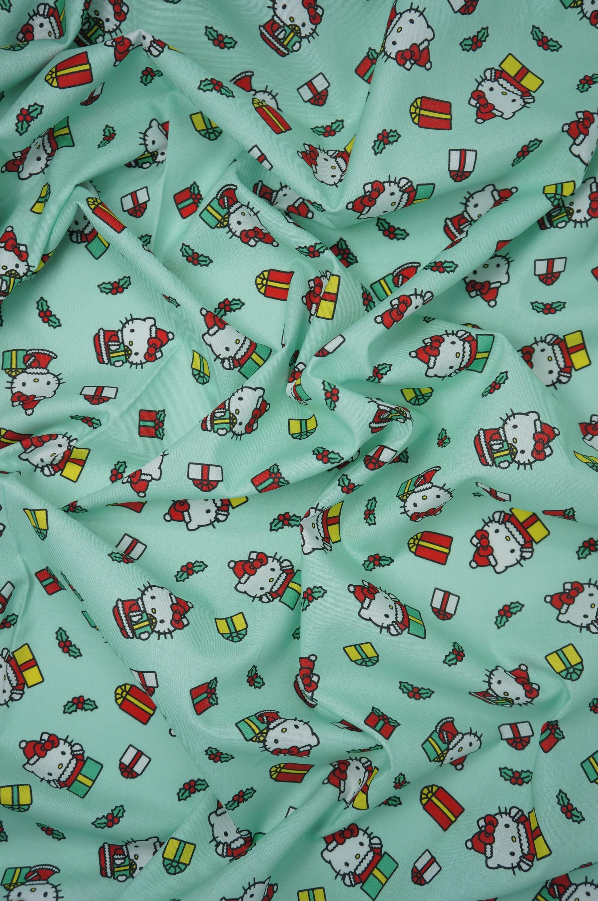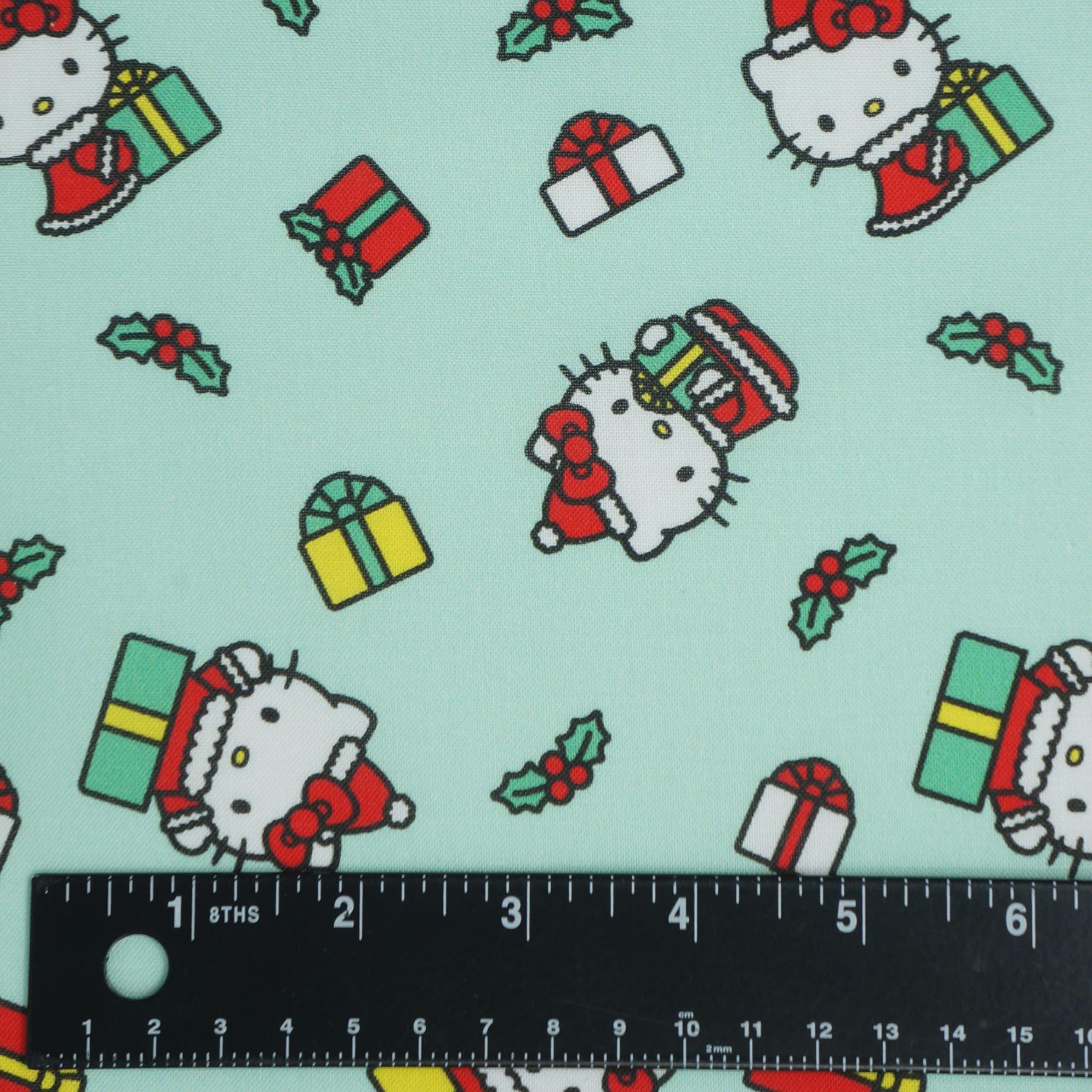 This is a fun and adorable fabric for Christmas! It's the Hello Kitty Christmas Presents on Green Novelty Cotton Fabric licensed by Sanrio for Springs Creative. You'll love the cute design of a tossed Hello Kitty holding a Christmas present on a green background surrounded by more presents and holly. This fabric is perfect for making stockings, decorations, quilts, and more. It's soft and durable, and it has the official Sanrio license. Don't miss this amazing fabric for your Christmas projects!