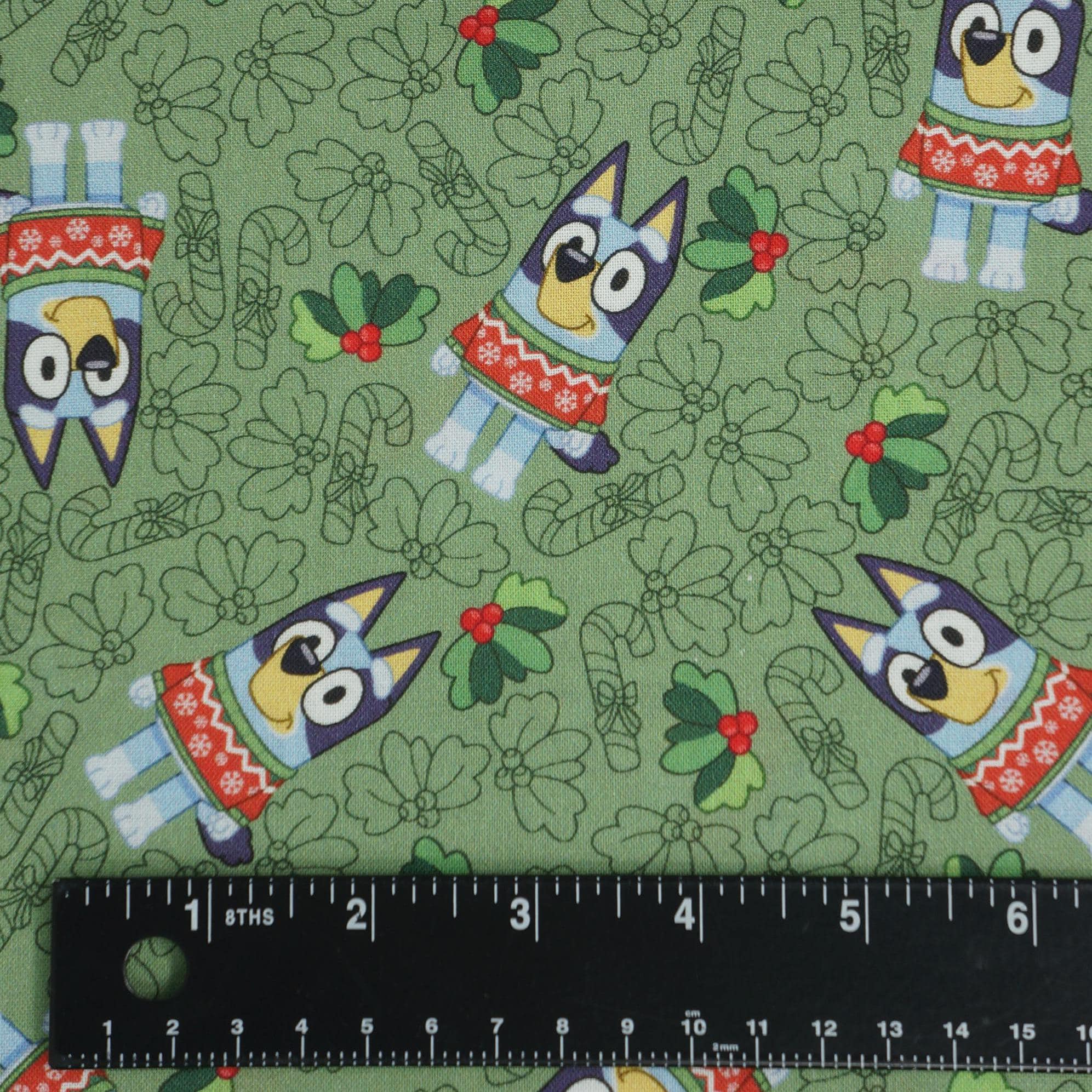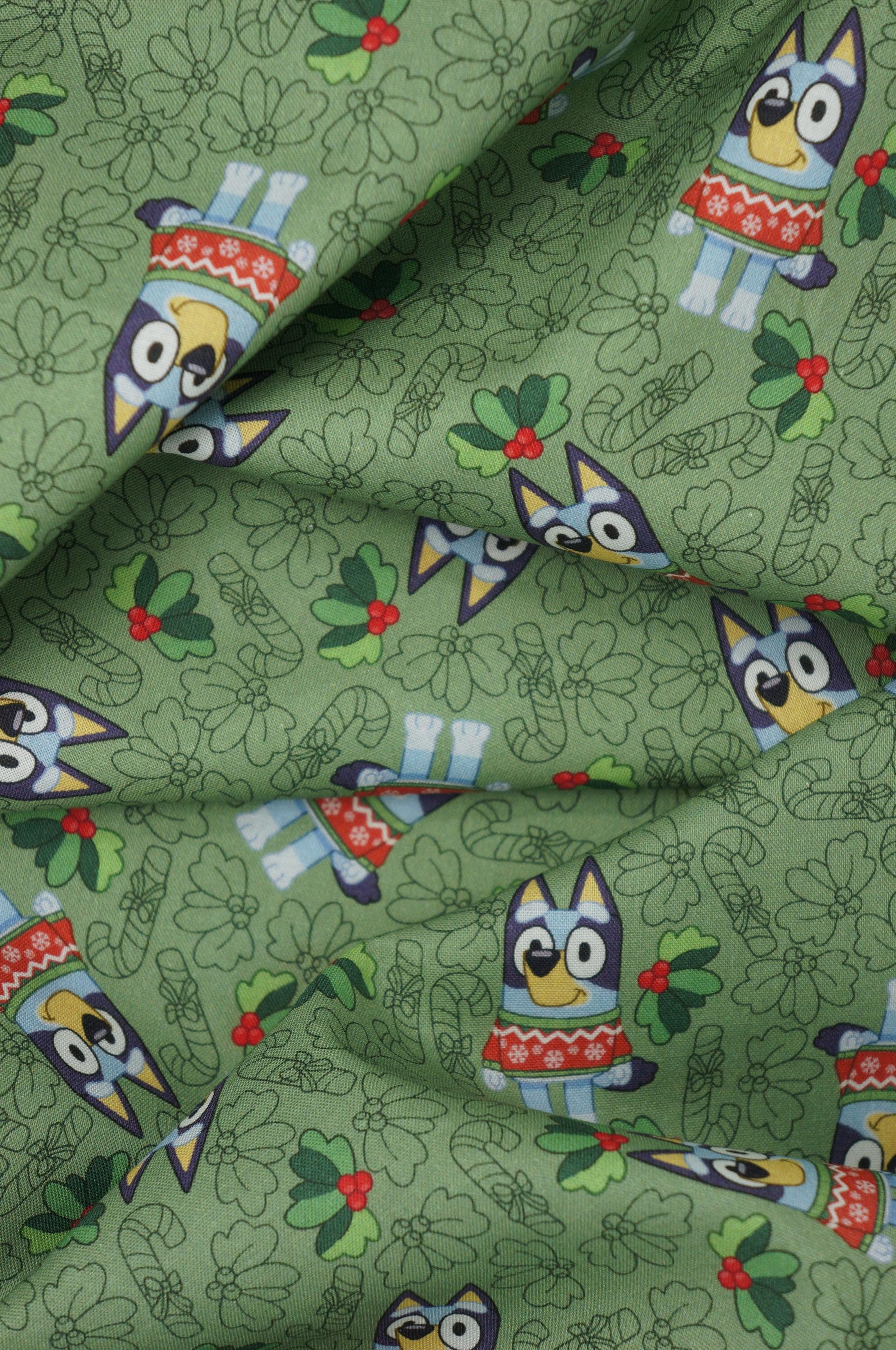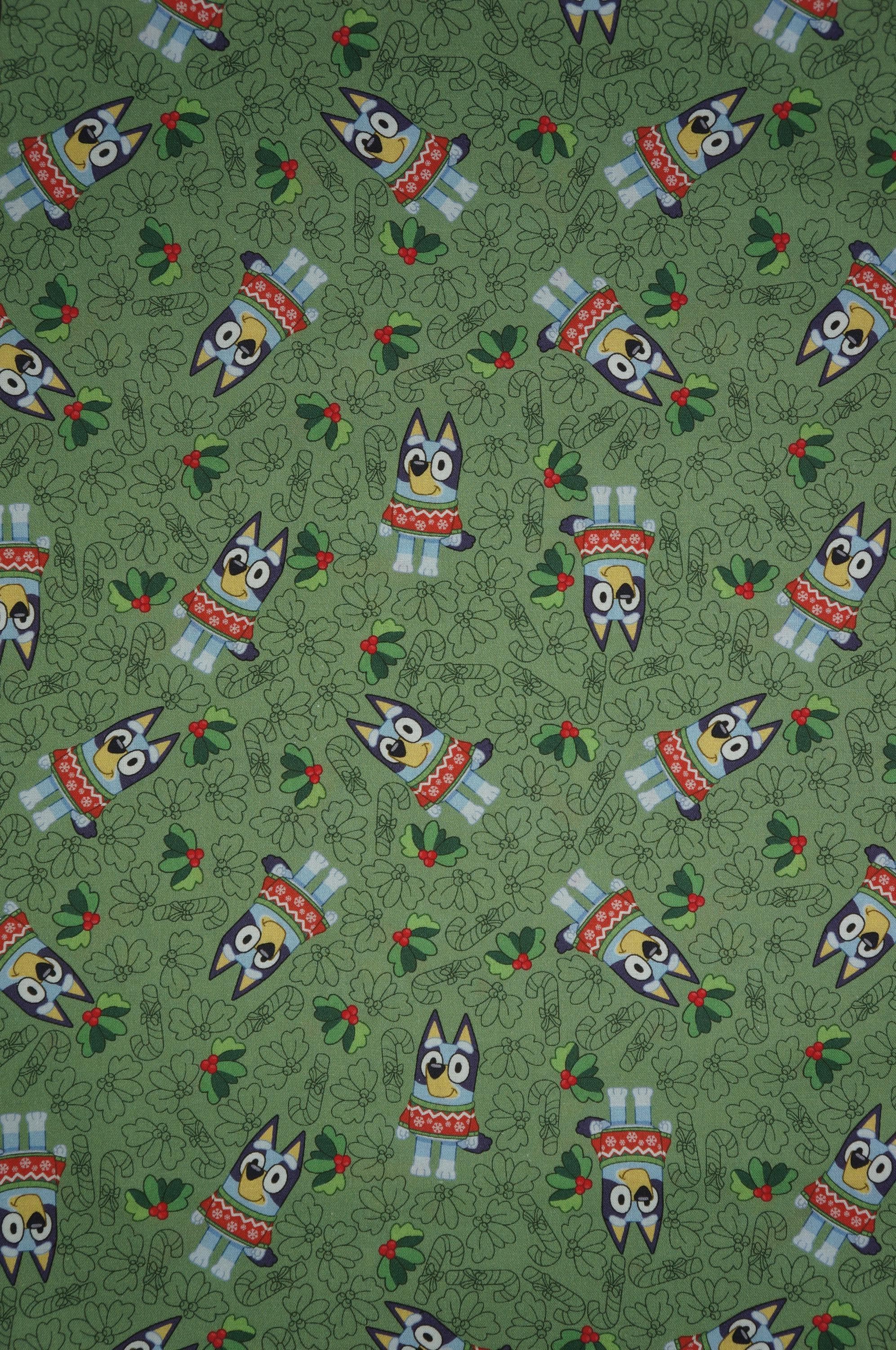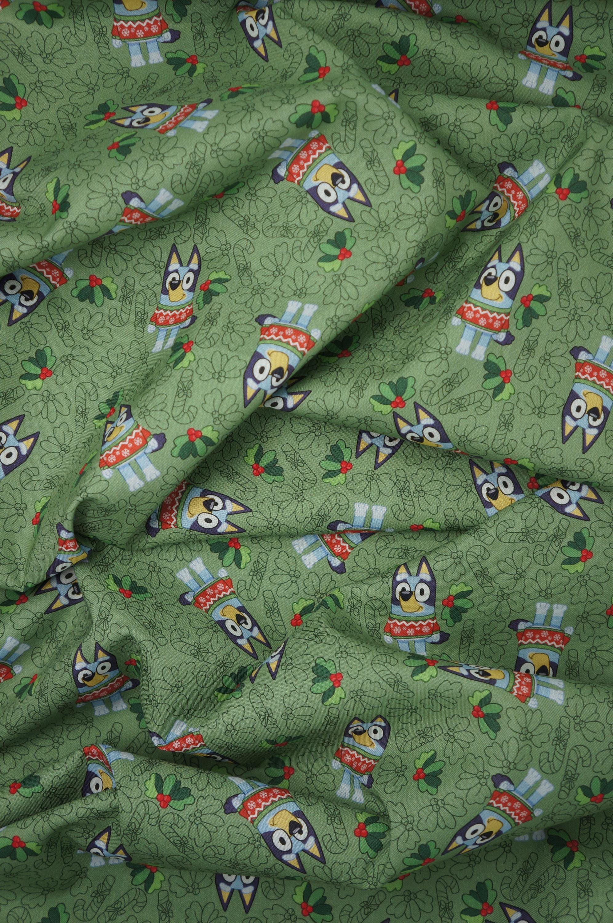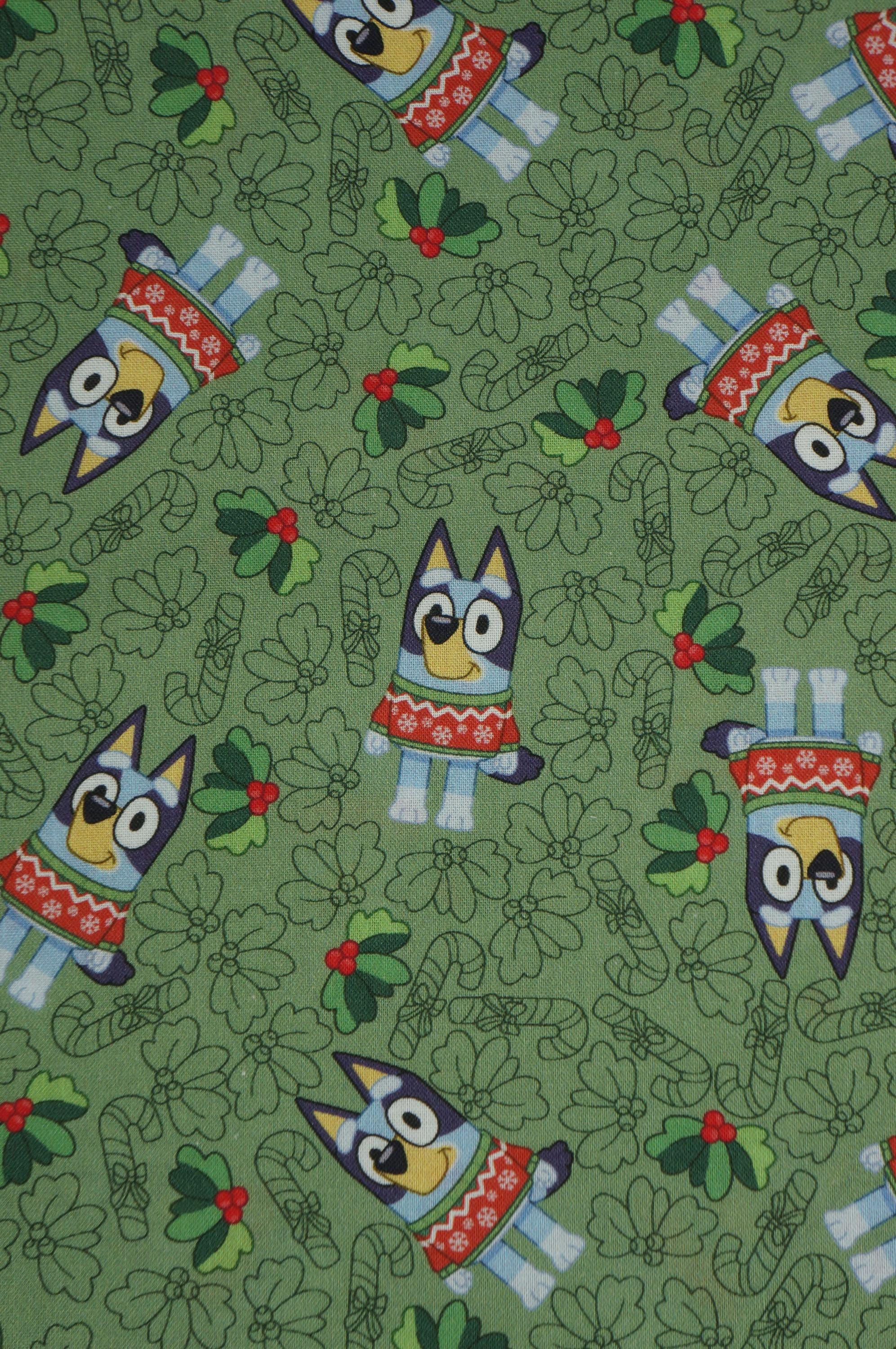Get ready to bring the holiday cheer with our delightful Christmas Bluey Novelty Cotton Fabric! Licensed by Ludo Studios and manufactured by Springs Creative this enchanting fabric showcases everyone's favorite pup, Bluey, dressed in her favorite holiday sweater surrounded by holly and candy canes on a charming green background. Perfect for the little ones who are crazy about Bluey, this cotton fabric is ideal for crafting holiday outfits, adorable decorations, or special Christmas gifts. Let your creativity shine this season with a fabric that's as joyful and fun as the holiday itself!