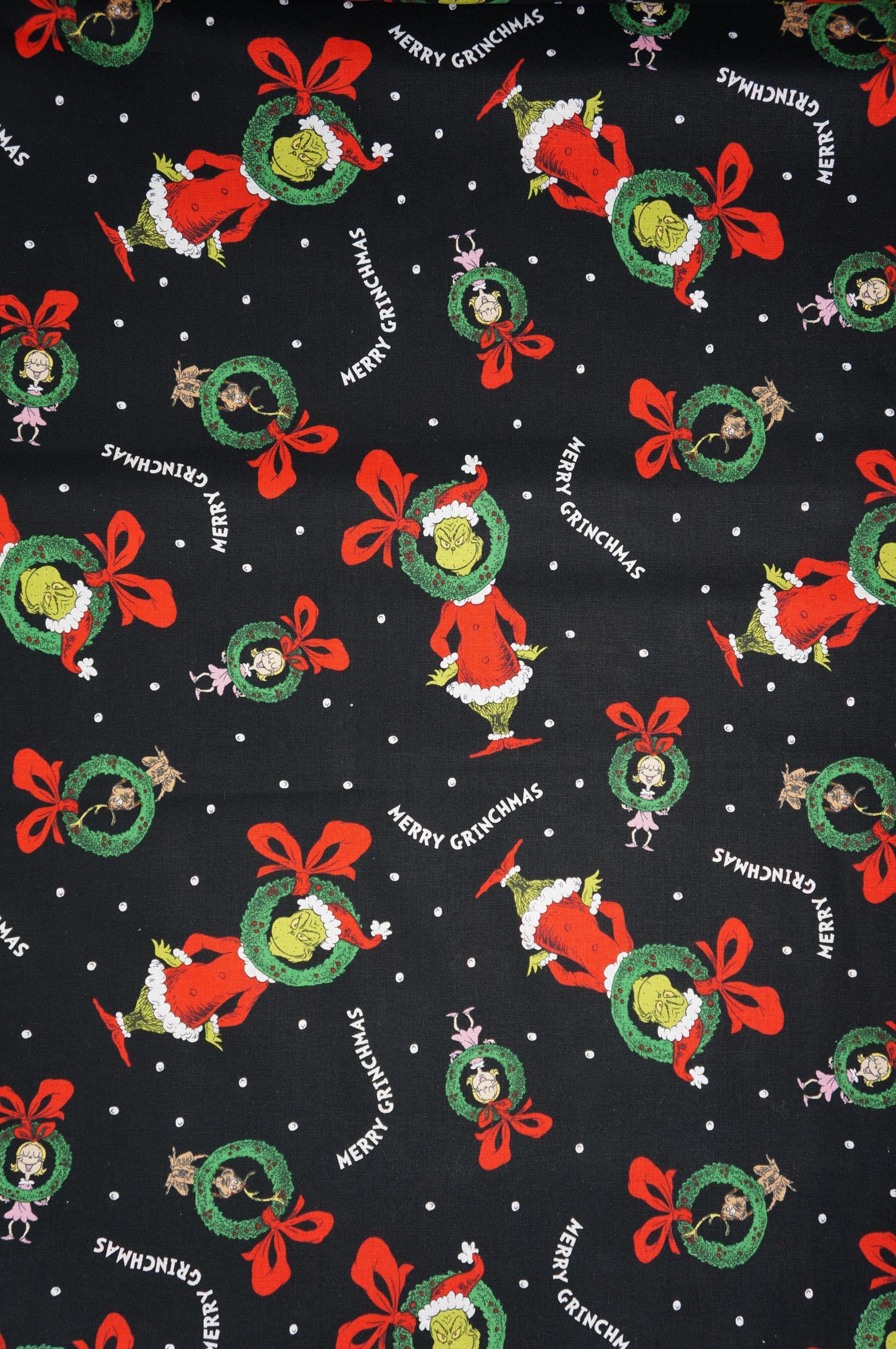 Are you looking for a fun and festive way to celebrate the holidays? Then you'll love this Grinch Fabric, featuring the Grinch, his faithful dog max, and Cindy Lou Who with wreaths on black! This novelty grade fabric is made from 100% cotton and is licensed by Robert Kaufman. It's perfect for making home decor, pillows, crafts, and more. The Grinch Fabric is sure to bring a smile to your face and a touch of whimsy to your home. Order yours today and have a Merry Grinchmas!