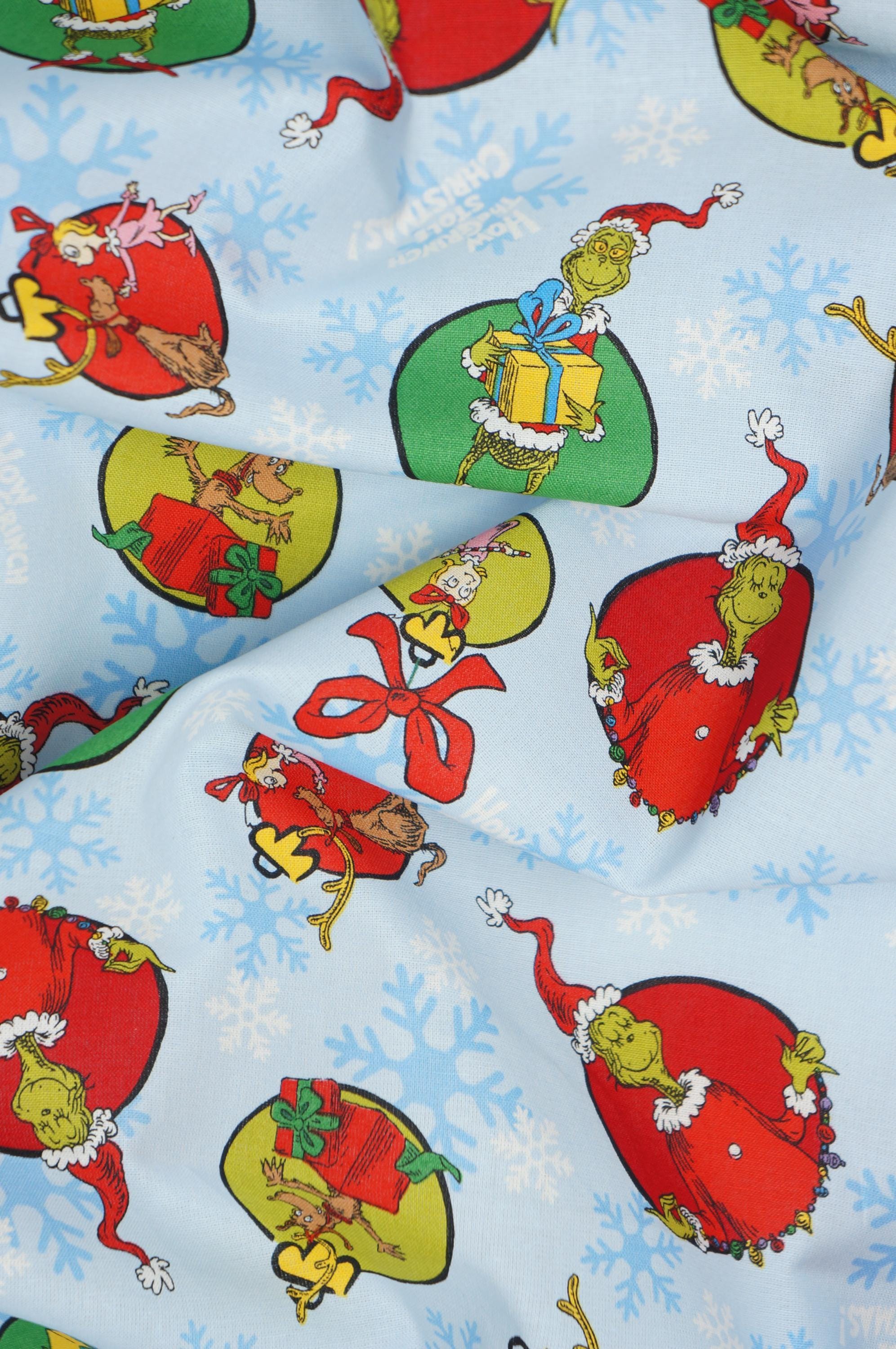 Celebrate the festive season with this adorable Grinch Grinchmas Cheer cotton fabric! This novelty quality cotton fabric features colorful images of the Grinch and his friends on holiday ornaments from the classic Dr. Seuss book How the Grinch Stole Christmas on a blue background with snowflakes. The fabric is designed and licensed by Robert Kaufman. Whether you want to make home decor, a pillow, craft, a table runner, or a gift bag, this fabric will add some whimsy and cheer to your projects. Don't let the Grinch steal your holiday spirit - order this fabric today and enjoy the magic of Dr. Seuss!