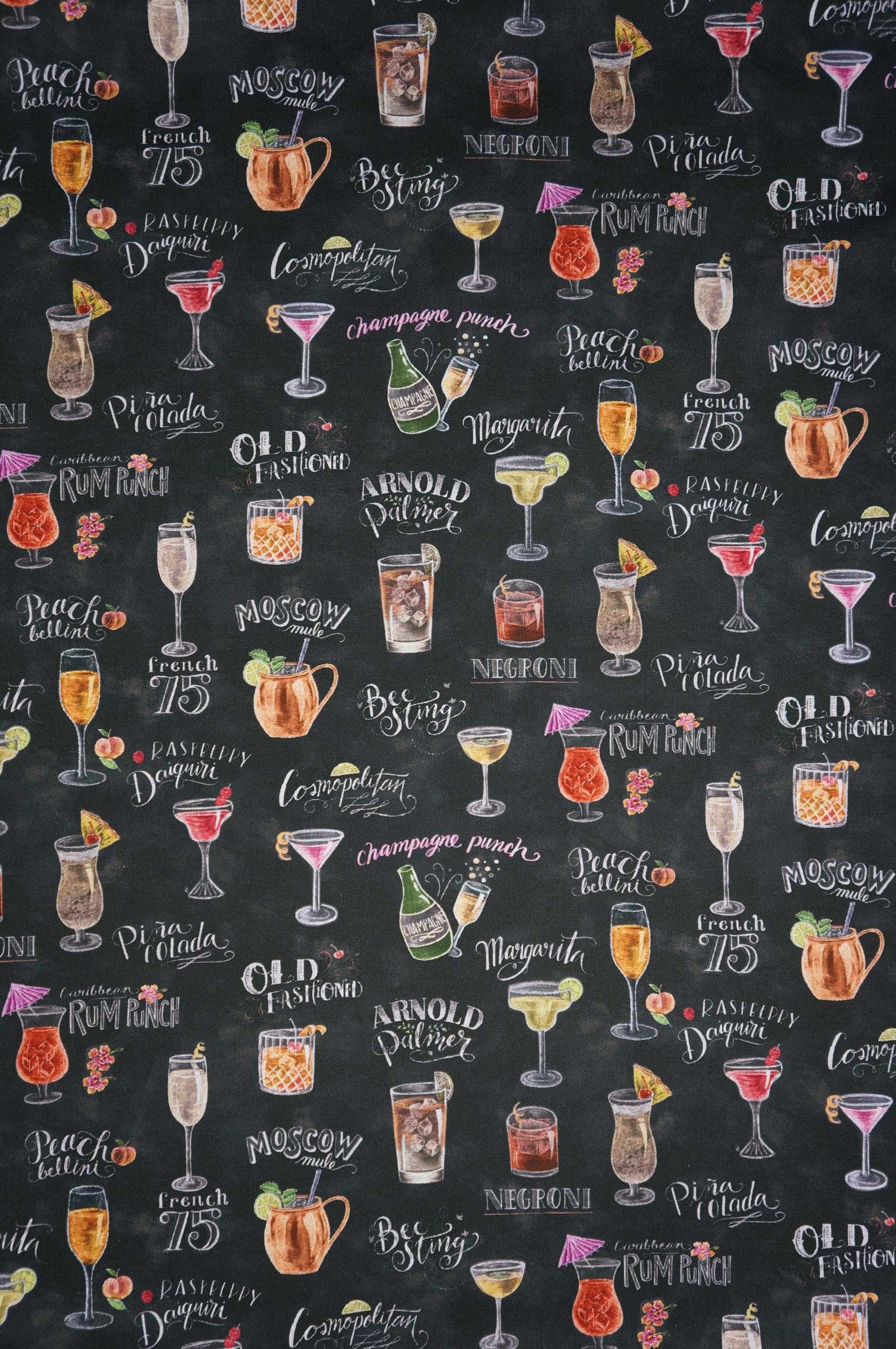 Cheers to the Happiest Hour! This fun collection by Lily & Val evokes the lively atmosphere and conviviality of everyone’s favorite time of day - happy hour. Inspired by the excitement and relaxation of gathering with friends or enjoying a refreshing drink, this collection features playful designs and cheerful colors that celebrate the joy of socializing and unwinding. This fabric features craft cocktails with their names listed near the cocktail on a chalkboard black background. Crafted from durable cotton with a soft, silky feel, it’s ideal for quilts, table runners, kitchen accessories, and more! Whether you're a wine lover or just adore unique, eye-catching designs, this fabric is sure to inspire your next masterpiece!