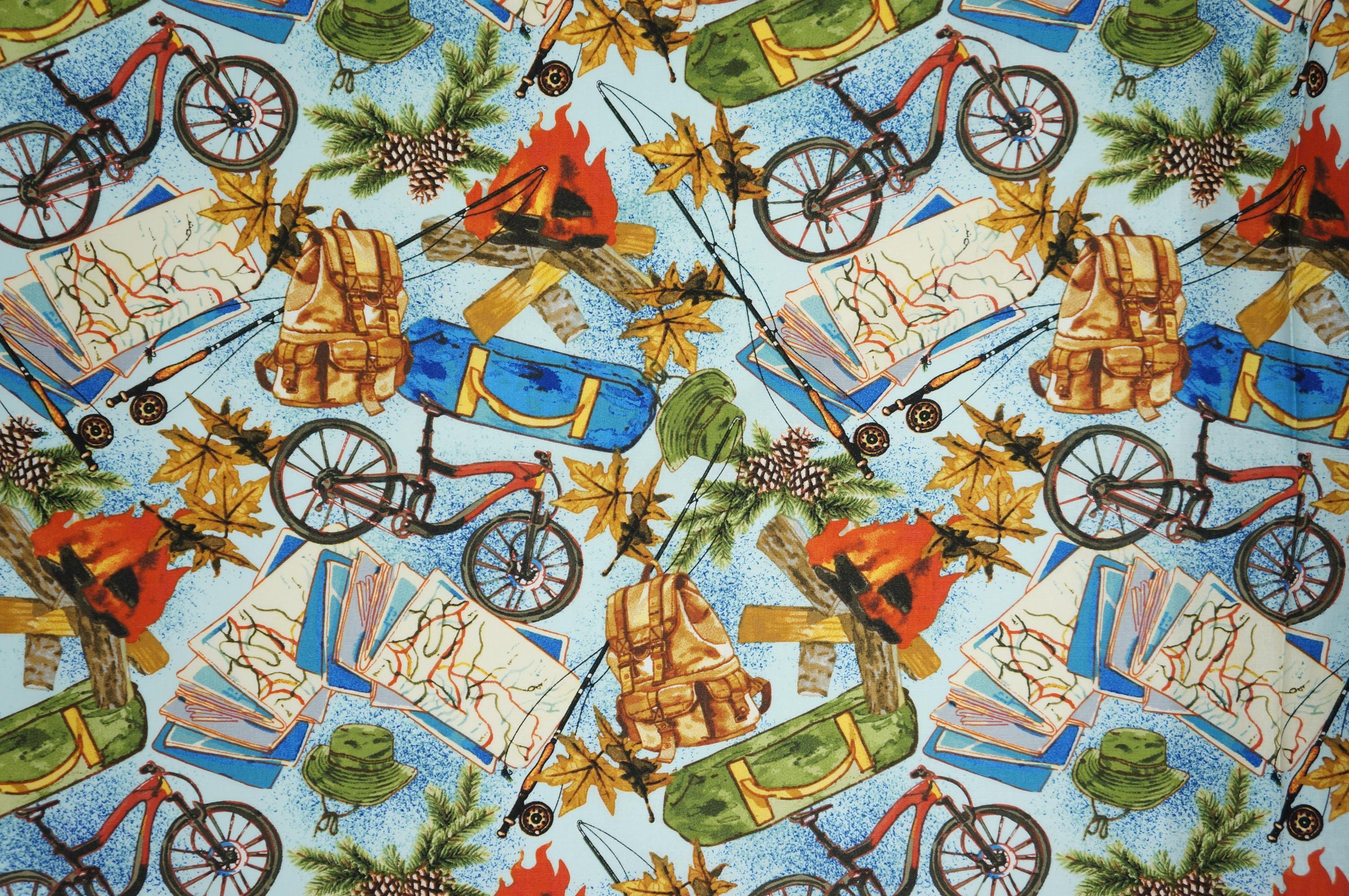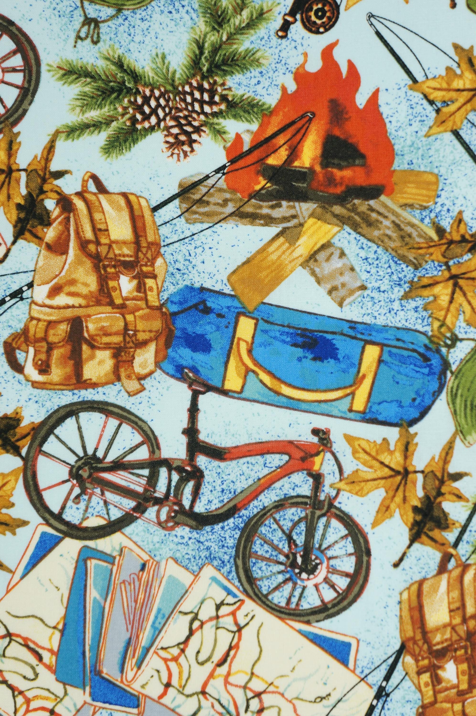 Are you ready for an adventure in the great outdoors? Then you'll love this Camping Fabric, featuring adorable illustrations of bikes, campfires, maps, backpacks and more on a blue background! This fabric is perfect for making quilts, pillows, bags, or anything else you can imagine. This novelty cotton fabric by David Textiles is soft, durable, and easy to sew. Don't miss this chance to get your hands on this Camping Gear Fabric and show your love for nature!