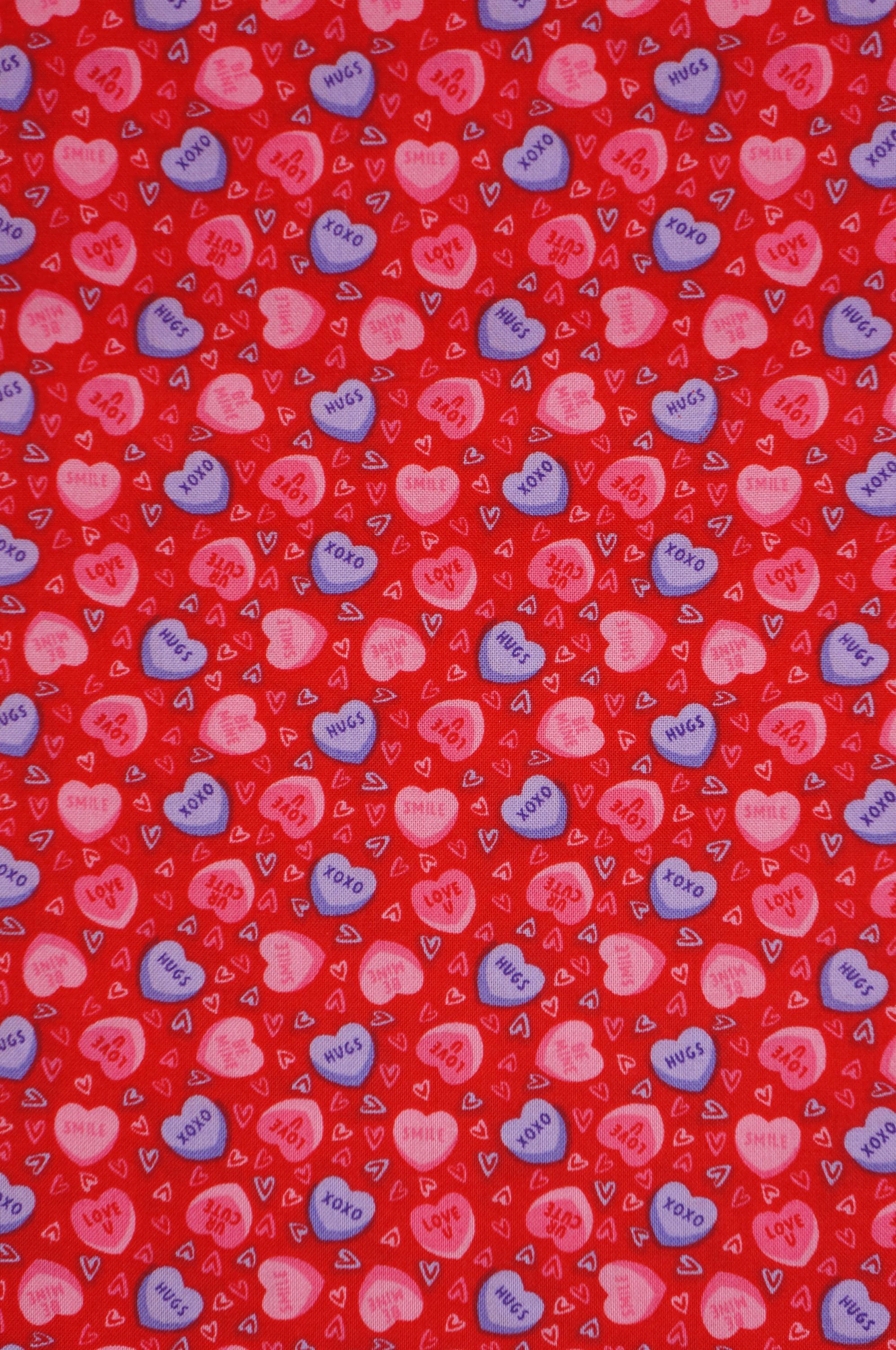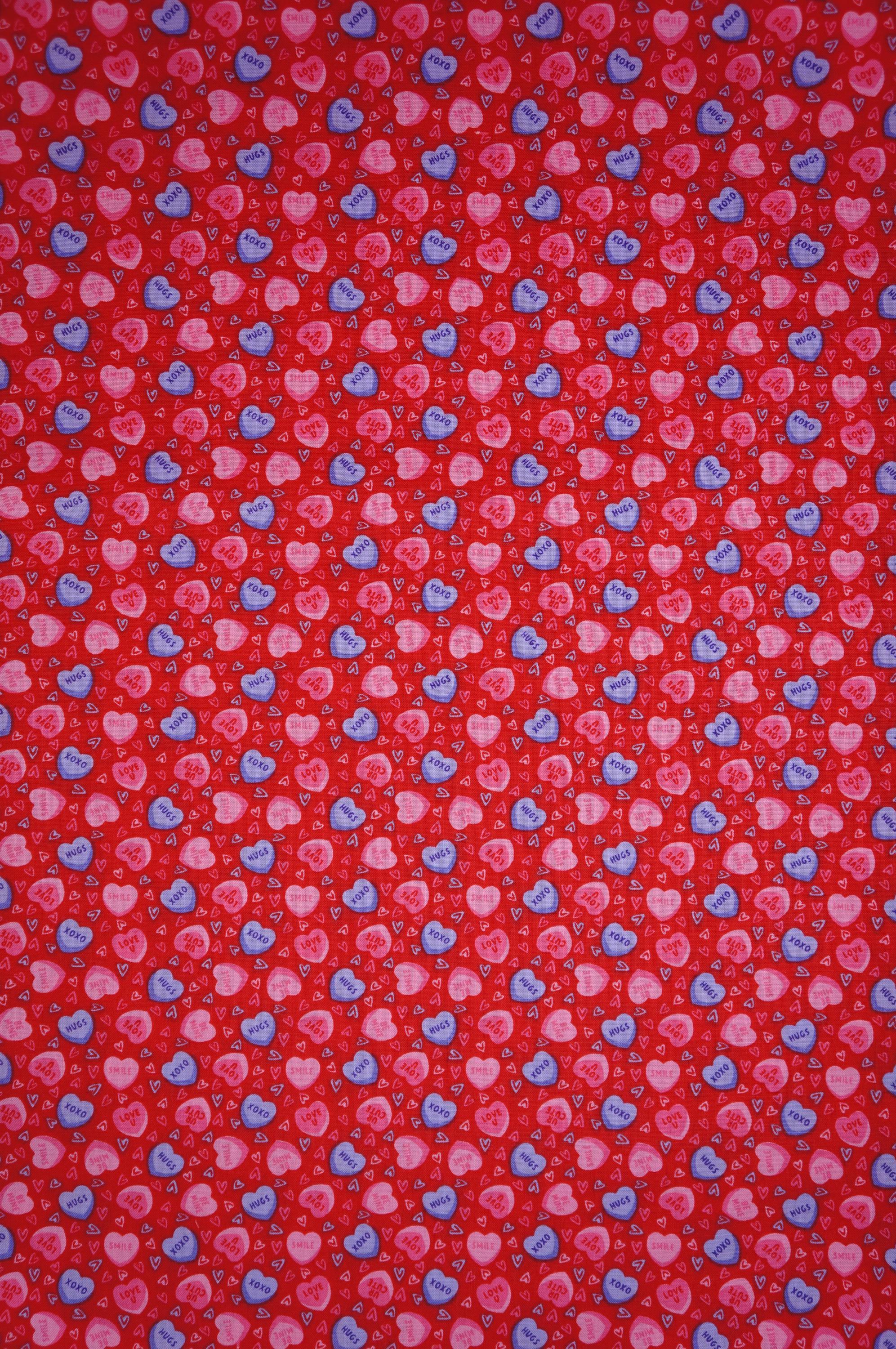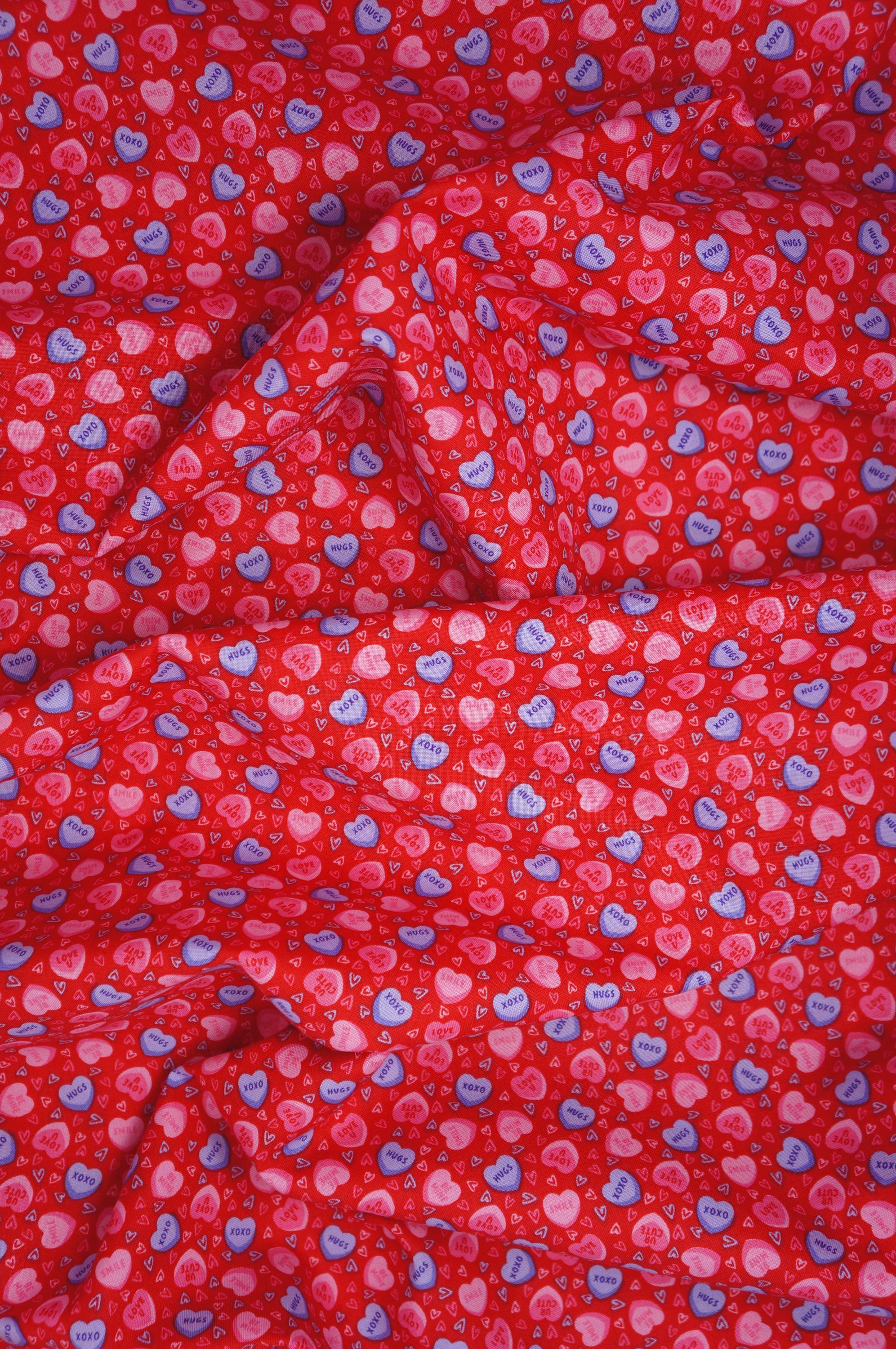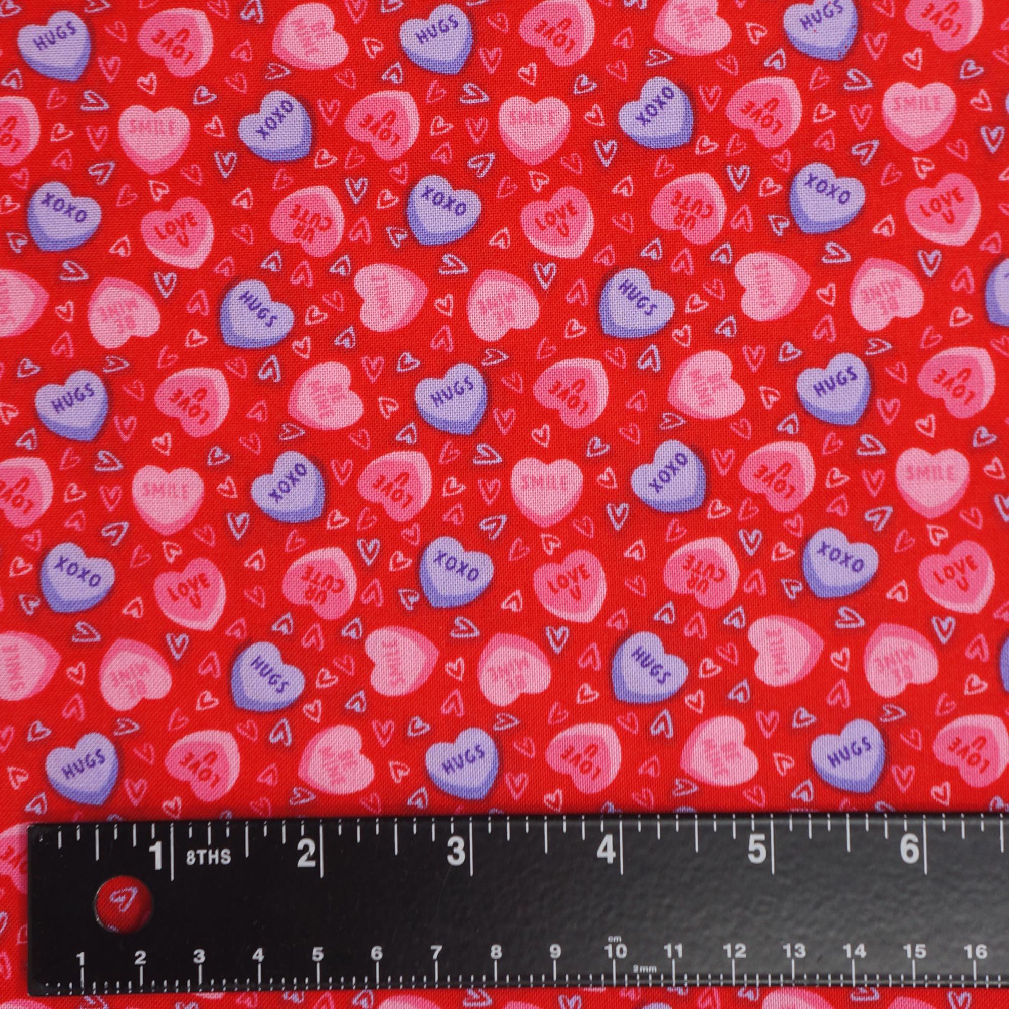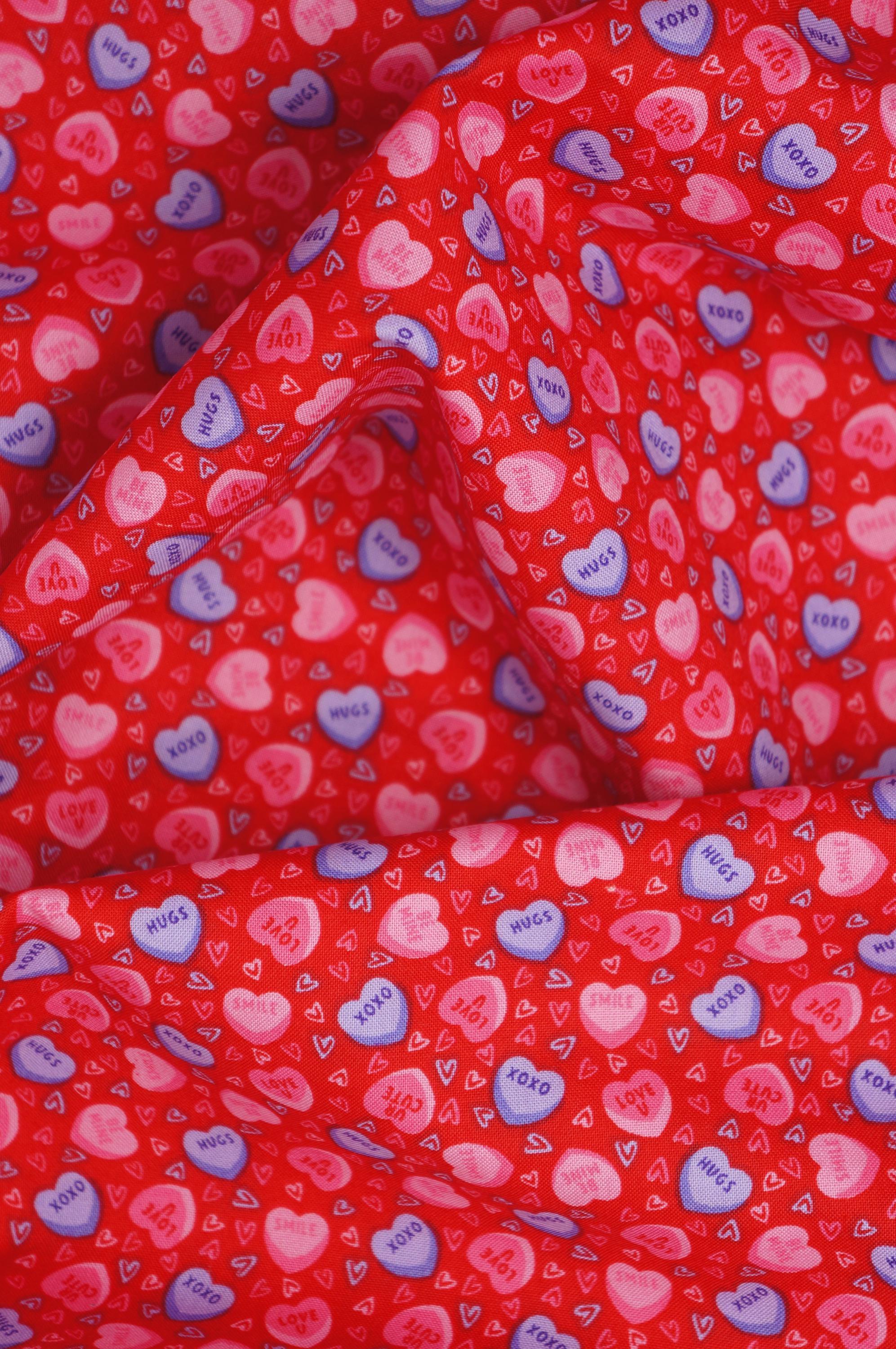 If you love candy hearts and Valentine's Day, you will adore this fabric! This Candy Heart Novelty Cotton Fabric is a sweet and colorful print that features pink and purple conversation hearts with cute messages like "XOXO", "UR Cute", "Smile", "Be Mine" and "Love U" on a red background. This Joann branded fabric is perfect for making quilts, pillows, bags, and more for your loved ones. Show them how much you care with this candy hearts fabric!