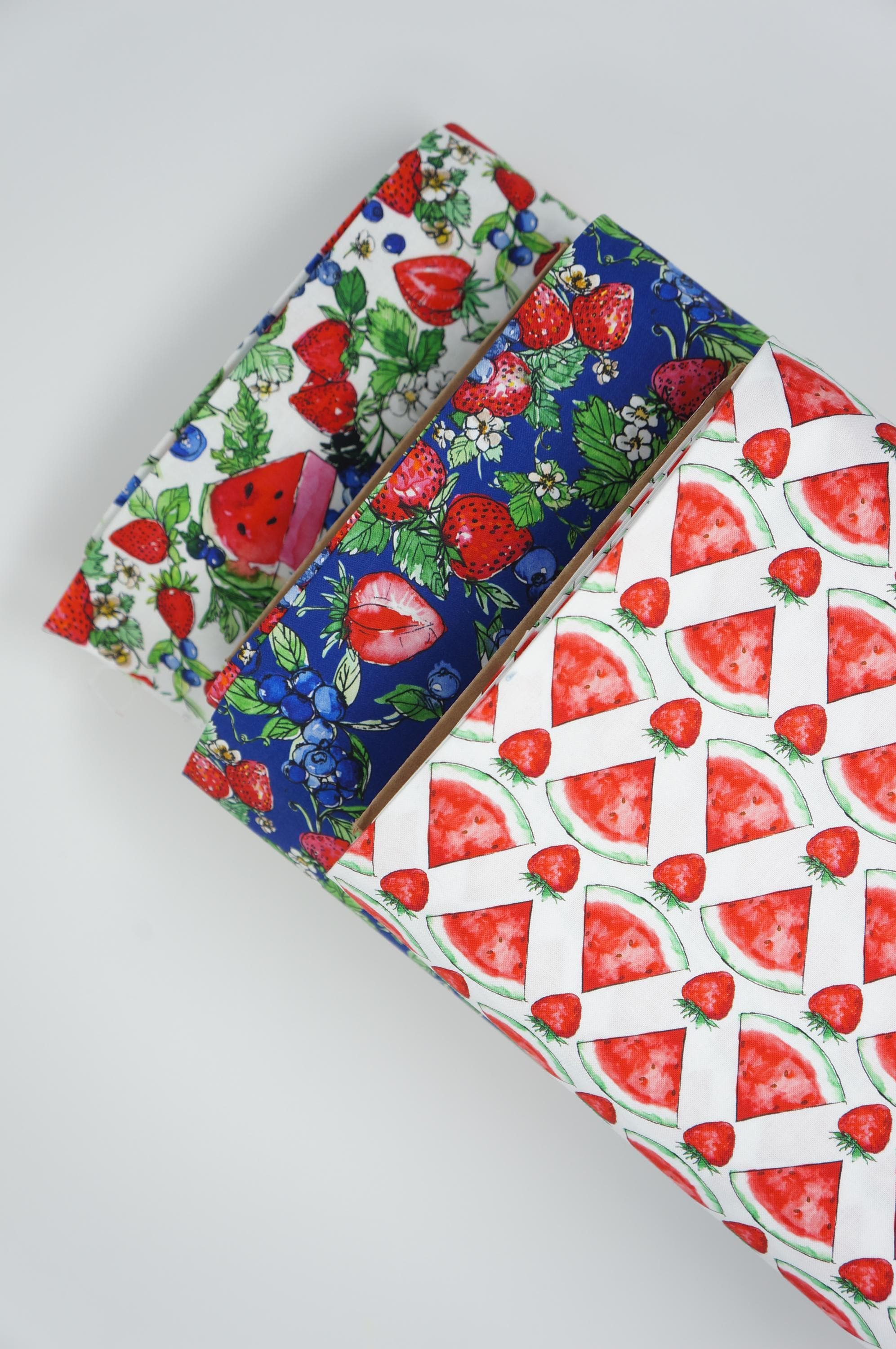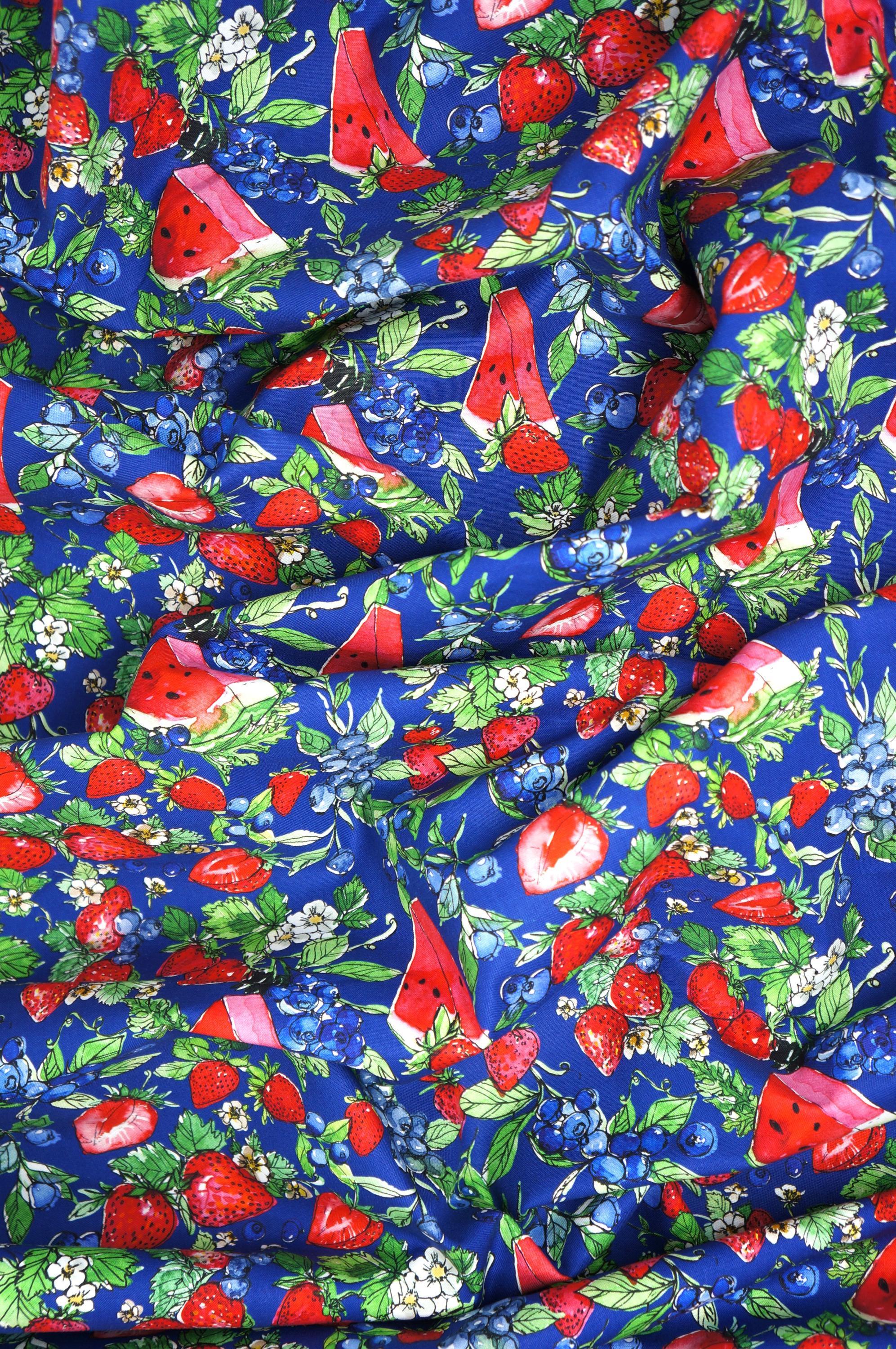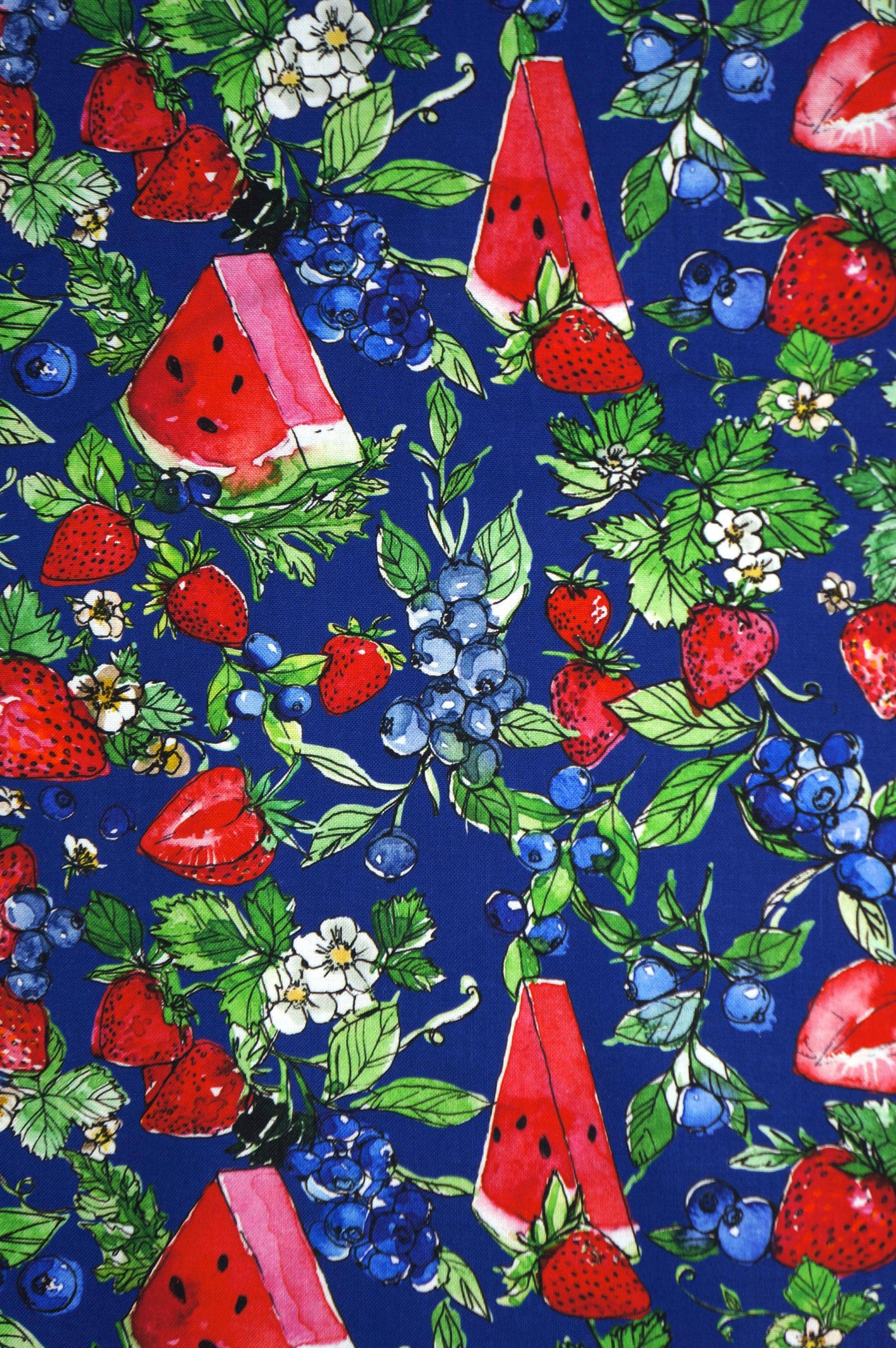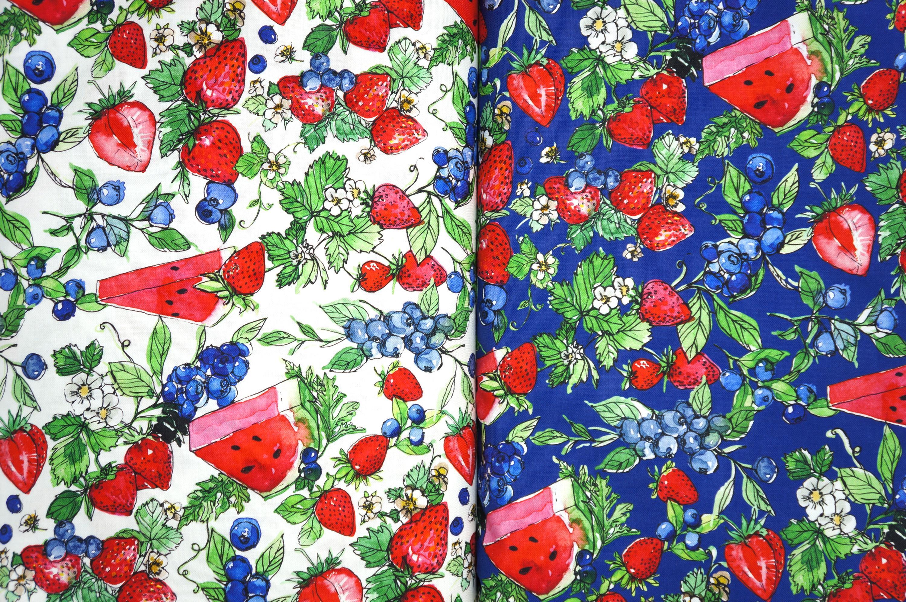 If you love strawberries, watermelon and blueberries, you will adore this quilting cotton fabric from the Sweet Summer Collection by Camelot! This quilting cotton fabric features juicy strawberries, watermelon, blueberries, and their greens on a Navy background. It's perfect for summer projects, such as quilts, pillows, bags, and more. This fabric is high quality soft, durable, and easy to sew. You can also use it for food-themed crafts and decorations. This fabric will make you smile every time you see it!