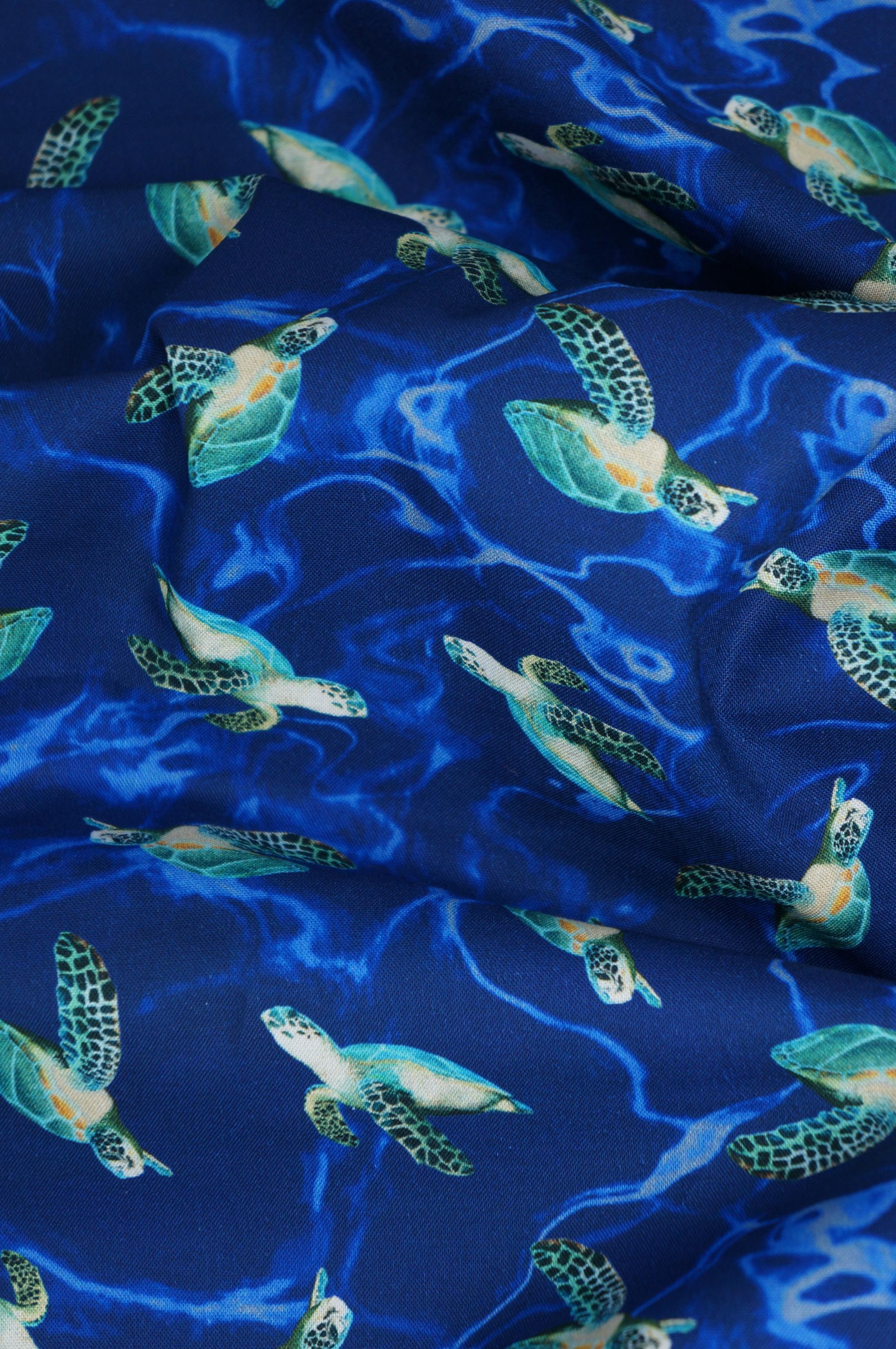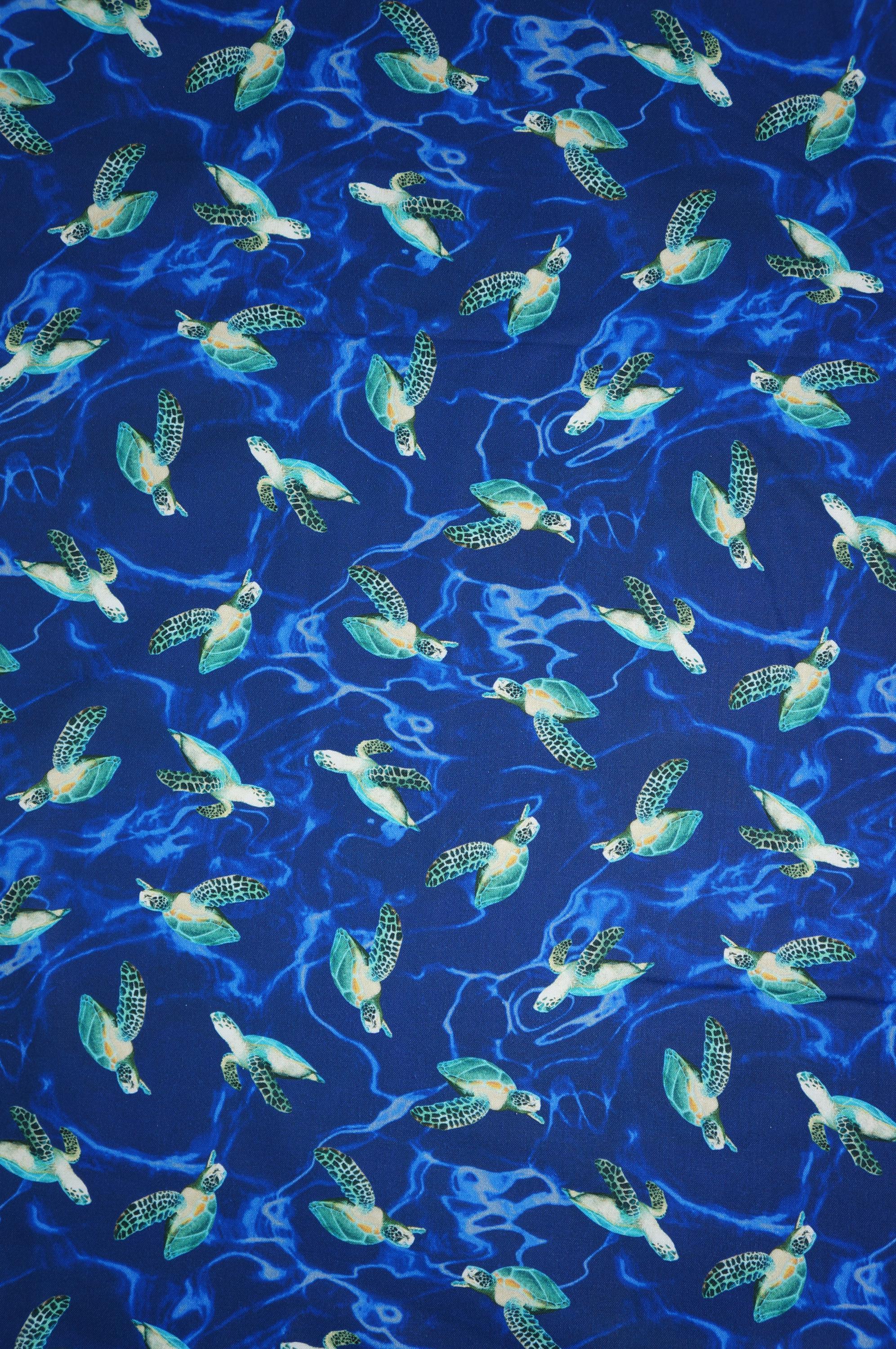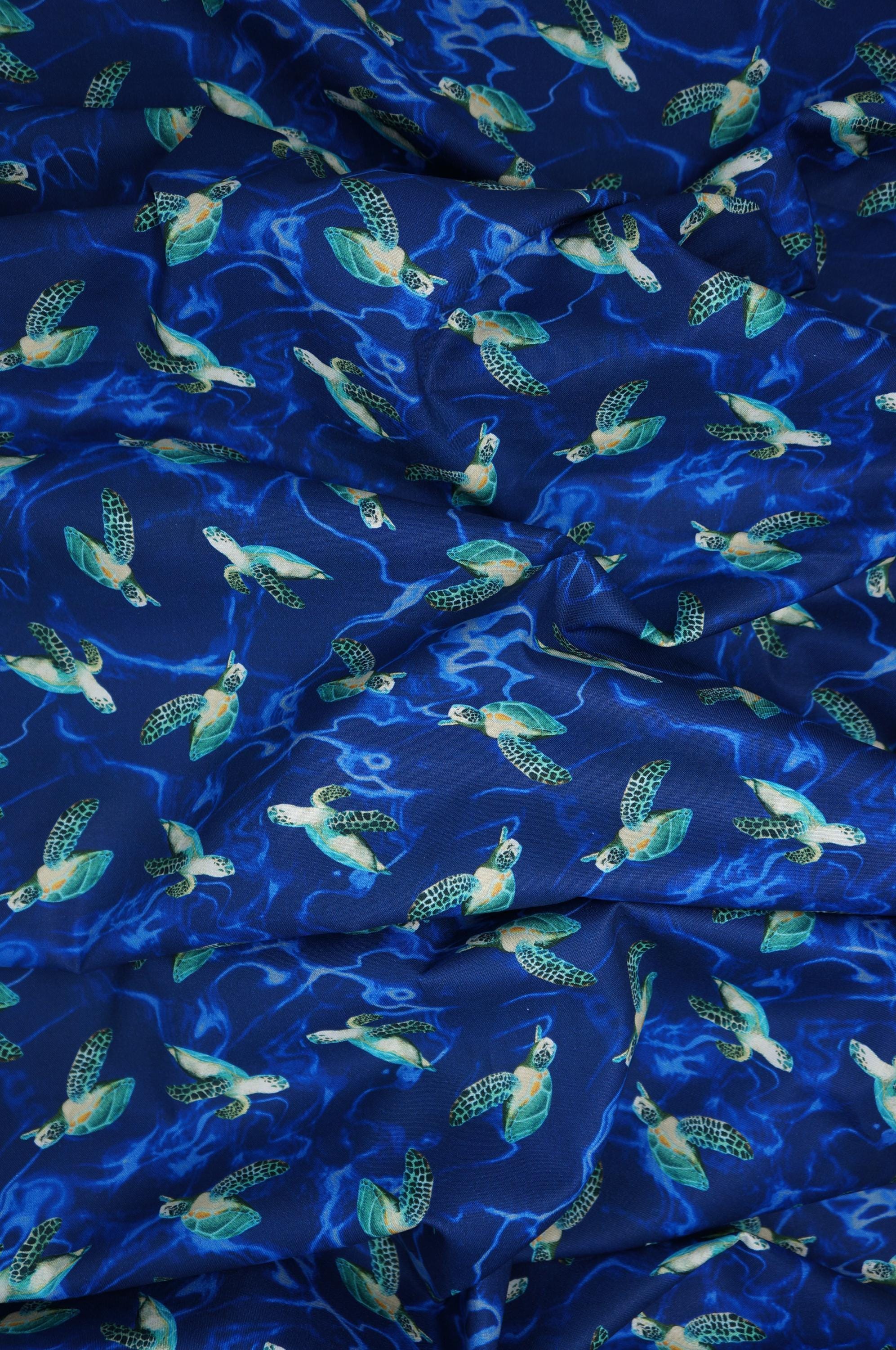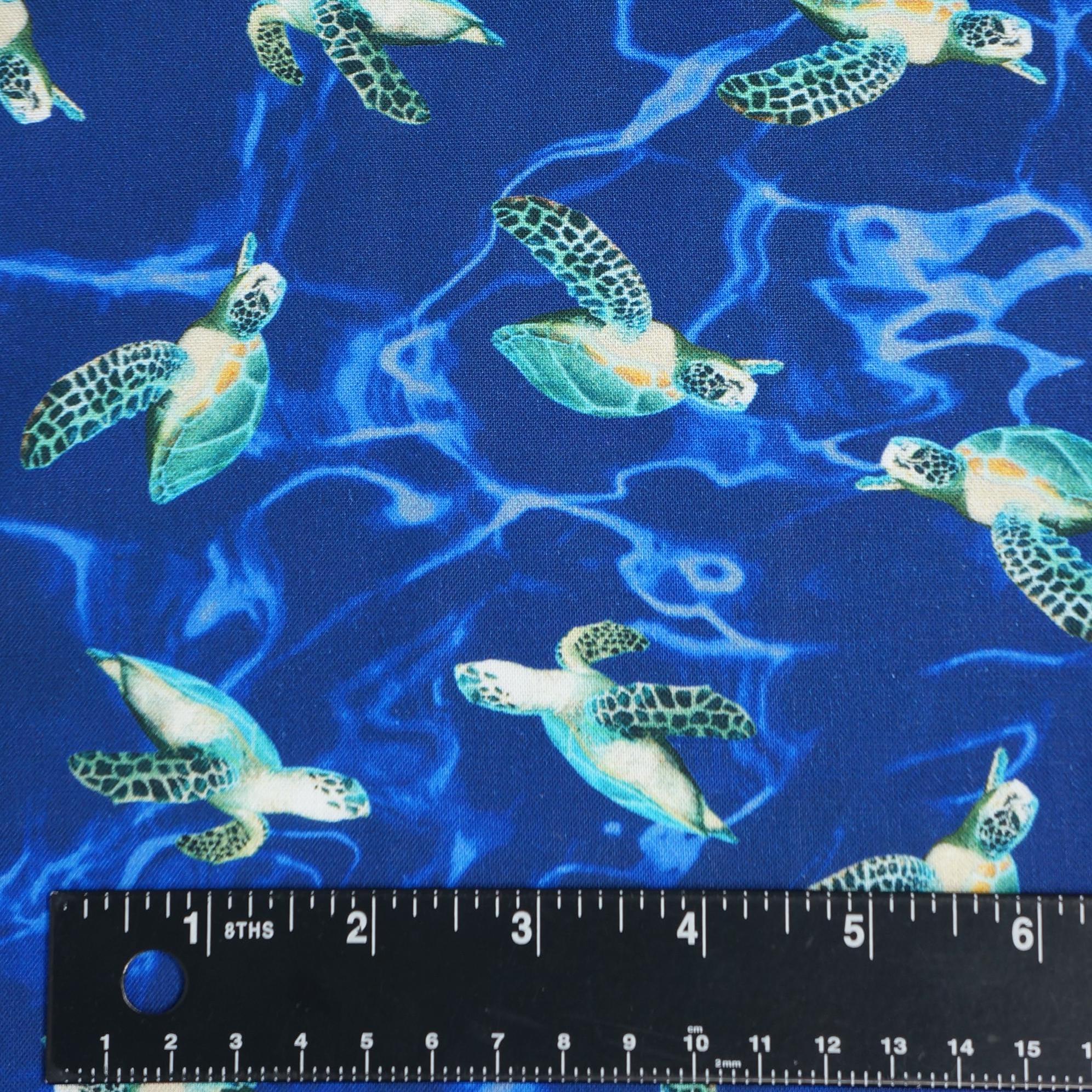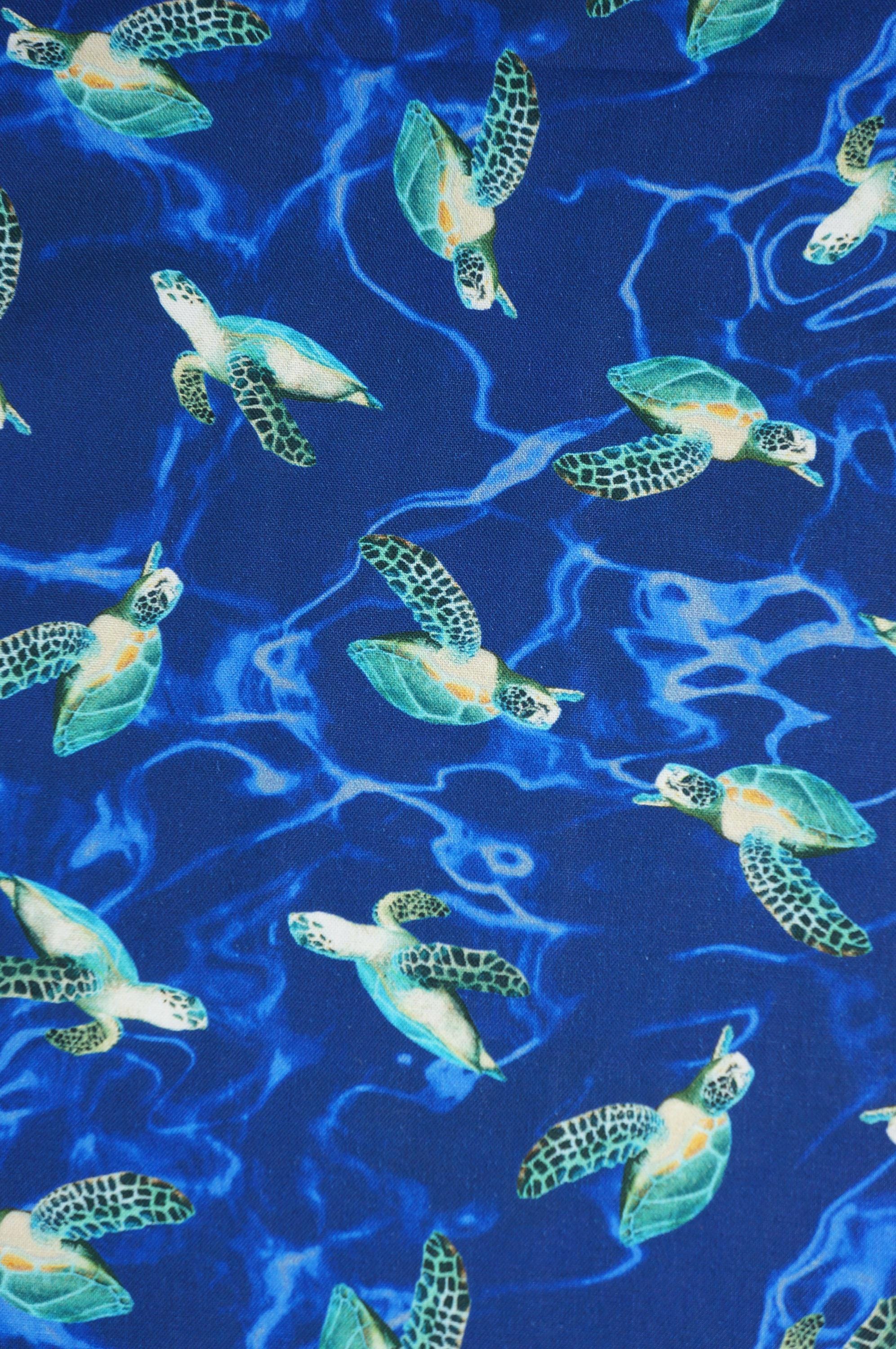 If you love turtles and the ocean, you will adore this Sea Turtle Quilting Cotton Fabric from Windham. This fabric features a stunning digital print of swimming realistic turtles on a dark blue watery looking background. The fabric is made of 100% high quality cotton and is perfect for quilting, apparel, home decor and more. Don't miss this chance to bring some turtle magic into your life!