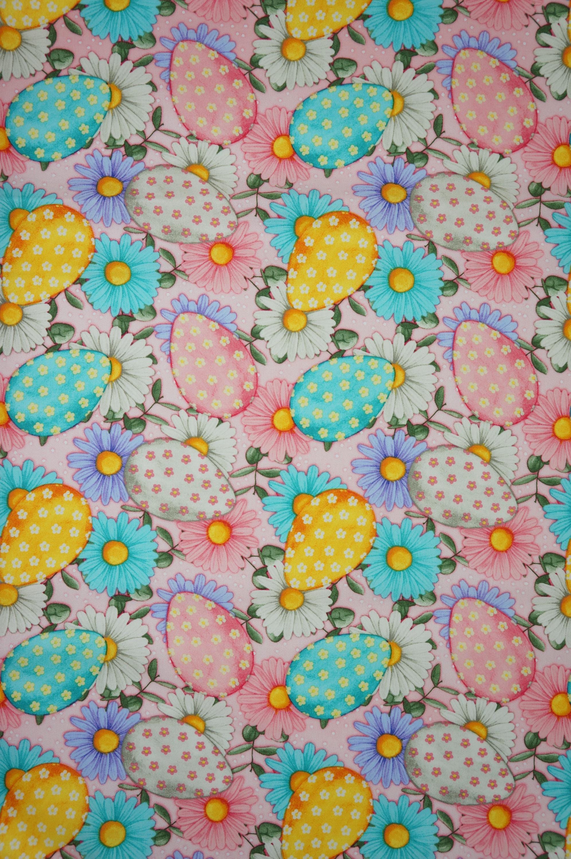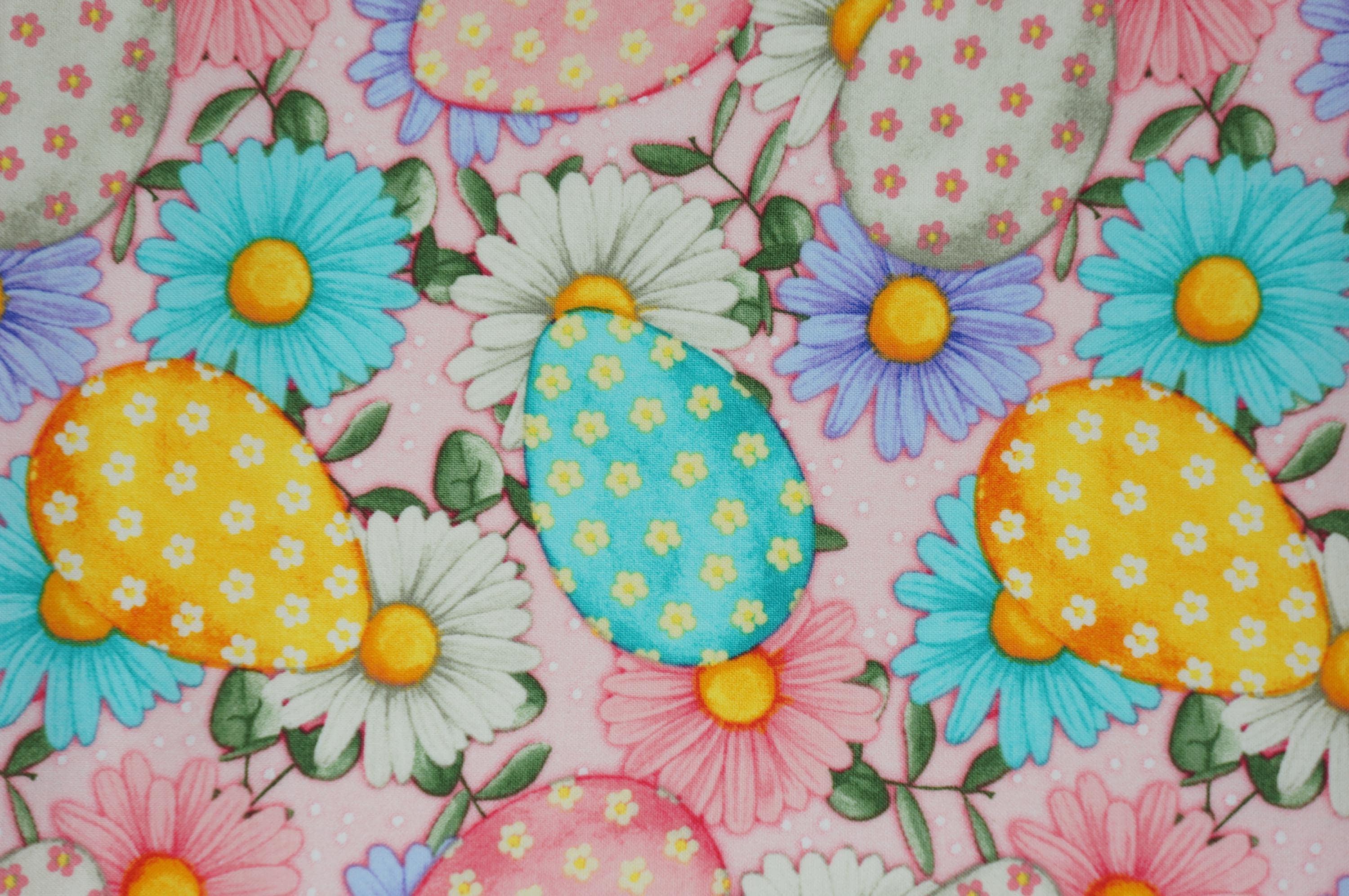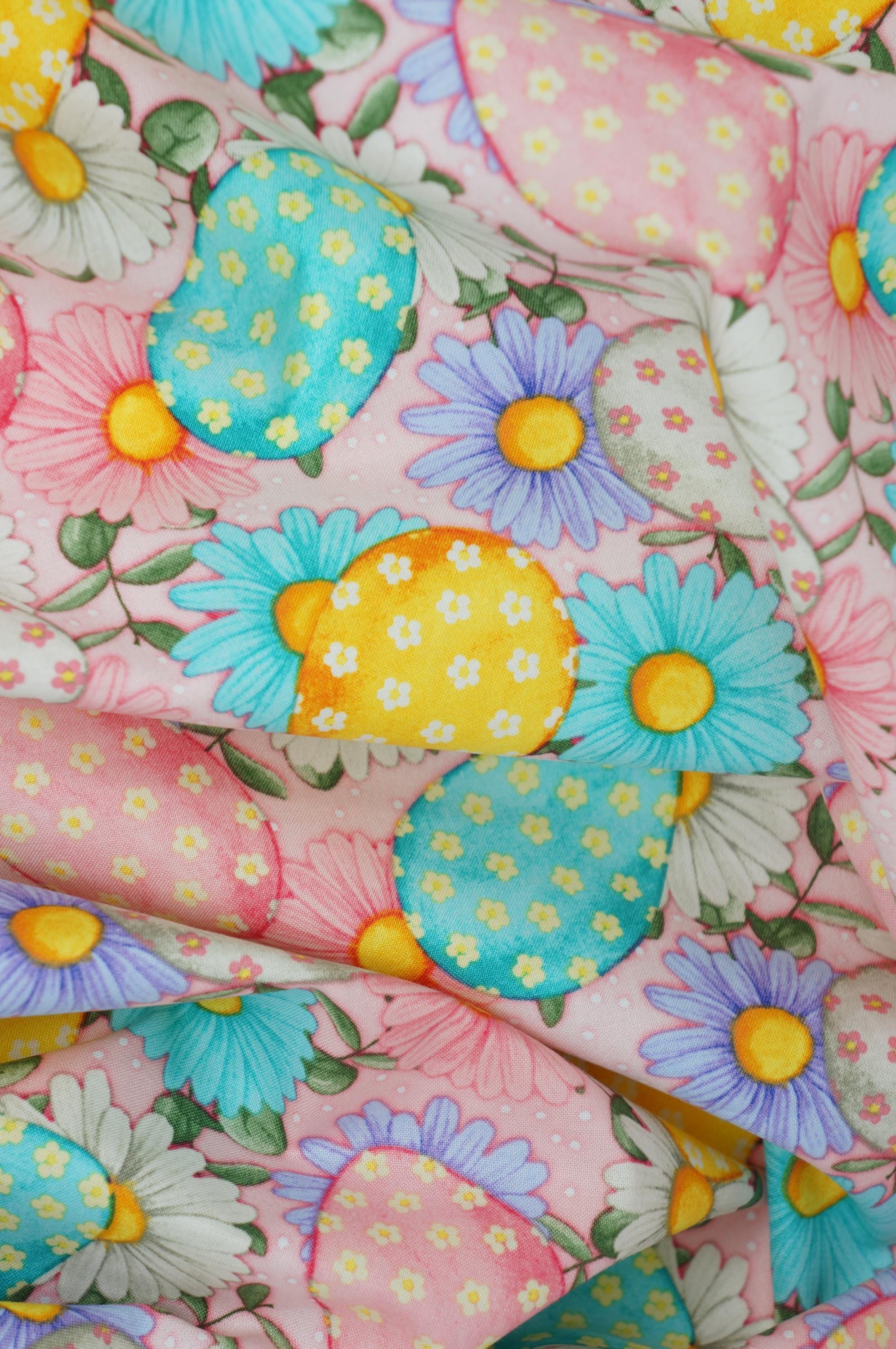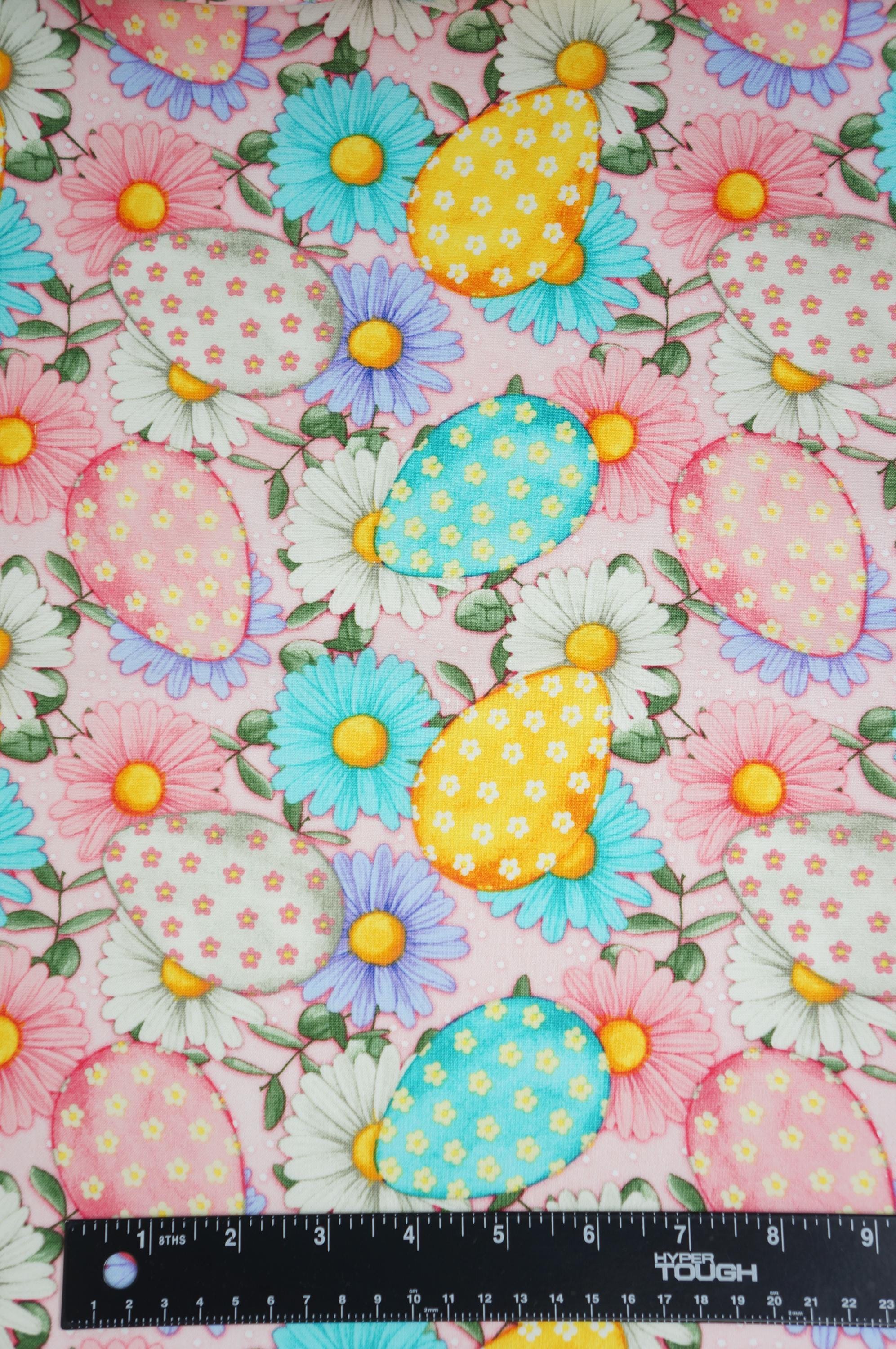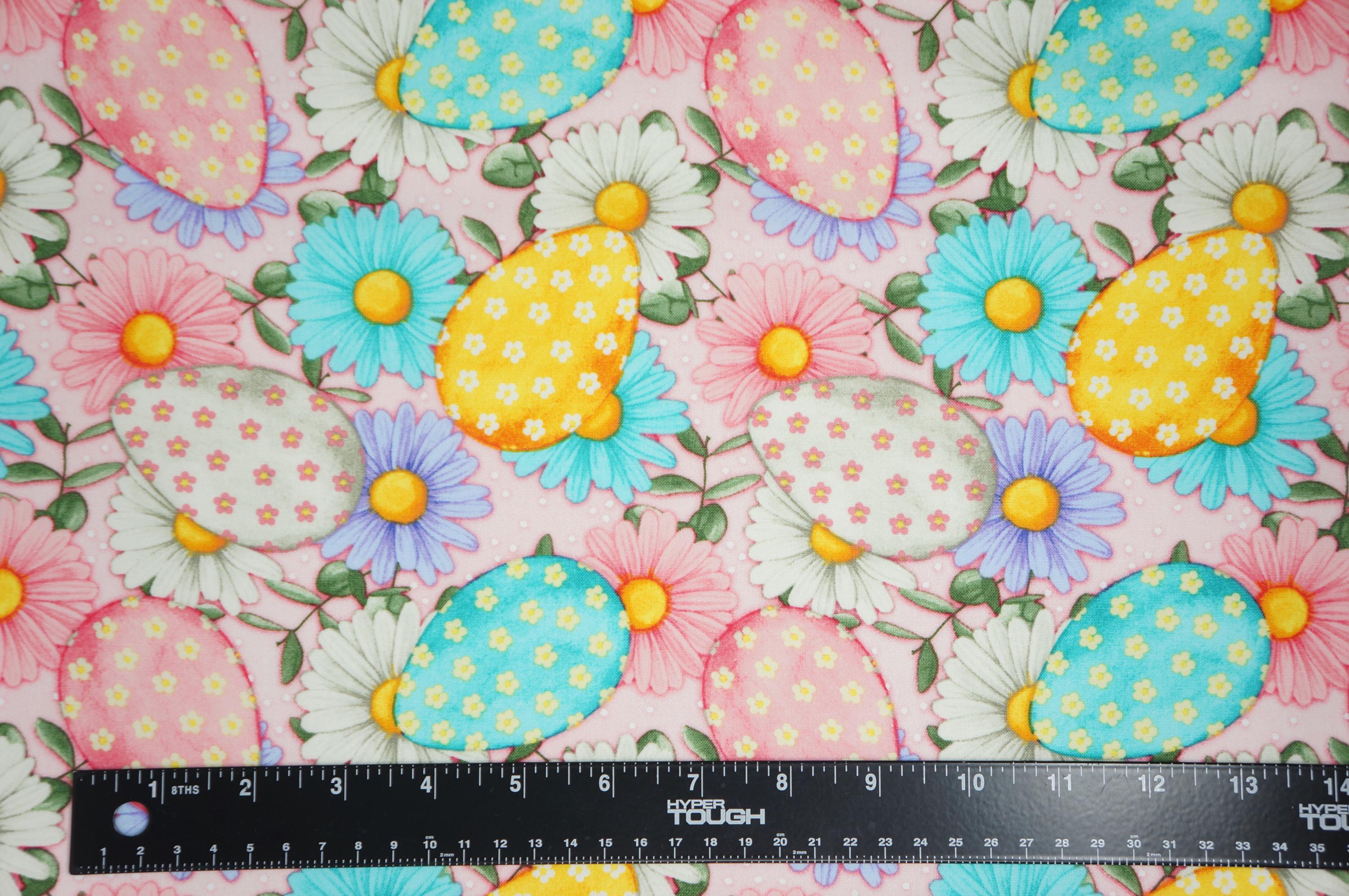 Celebrate Easter with this adorable novelty cotton fabric from David Textiles. This fabric features colorful pink, white, yellow and blue eggs and purple, blue, white and pink daisies on a light pink background! This fabric is perfect for making quilts, pillows, table runners, bags, and more. This fabric is 100% cotton and is durable and easy to sew. Order now and get ready for the Easter celebration!