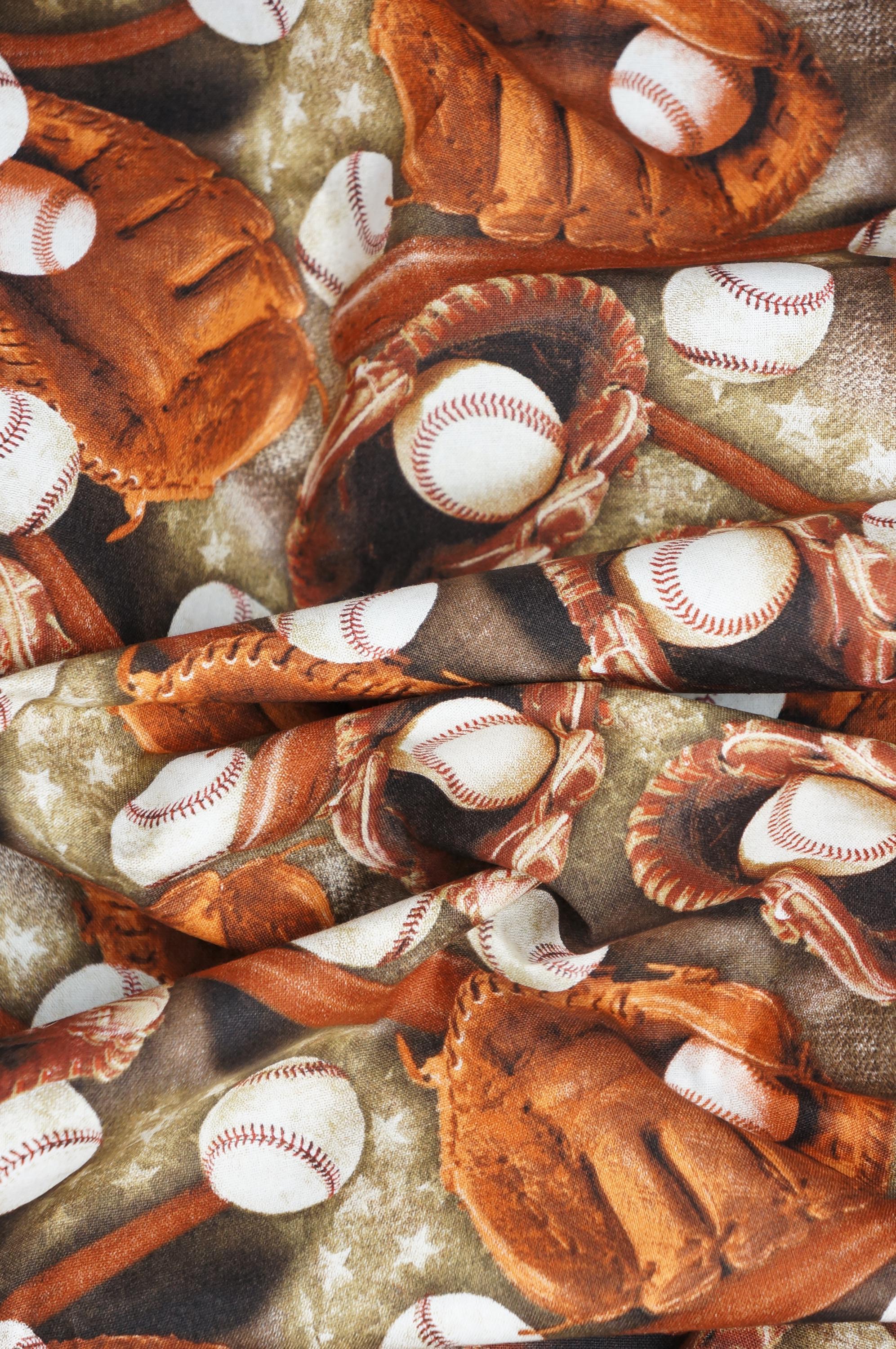 If you love baseball, you will love this fabric! Baseball Stars by David Textiles novelty cotton Fabric is a fun and realistic print that features baseballs and baseball gloves on a sandy brown background. This fabric is perfect for crafting, home decor, bag making and more. It is 100% cotton and 44 inches wide. Order yours today and get ready to hit a home run with your next project!