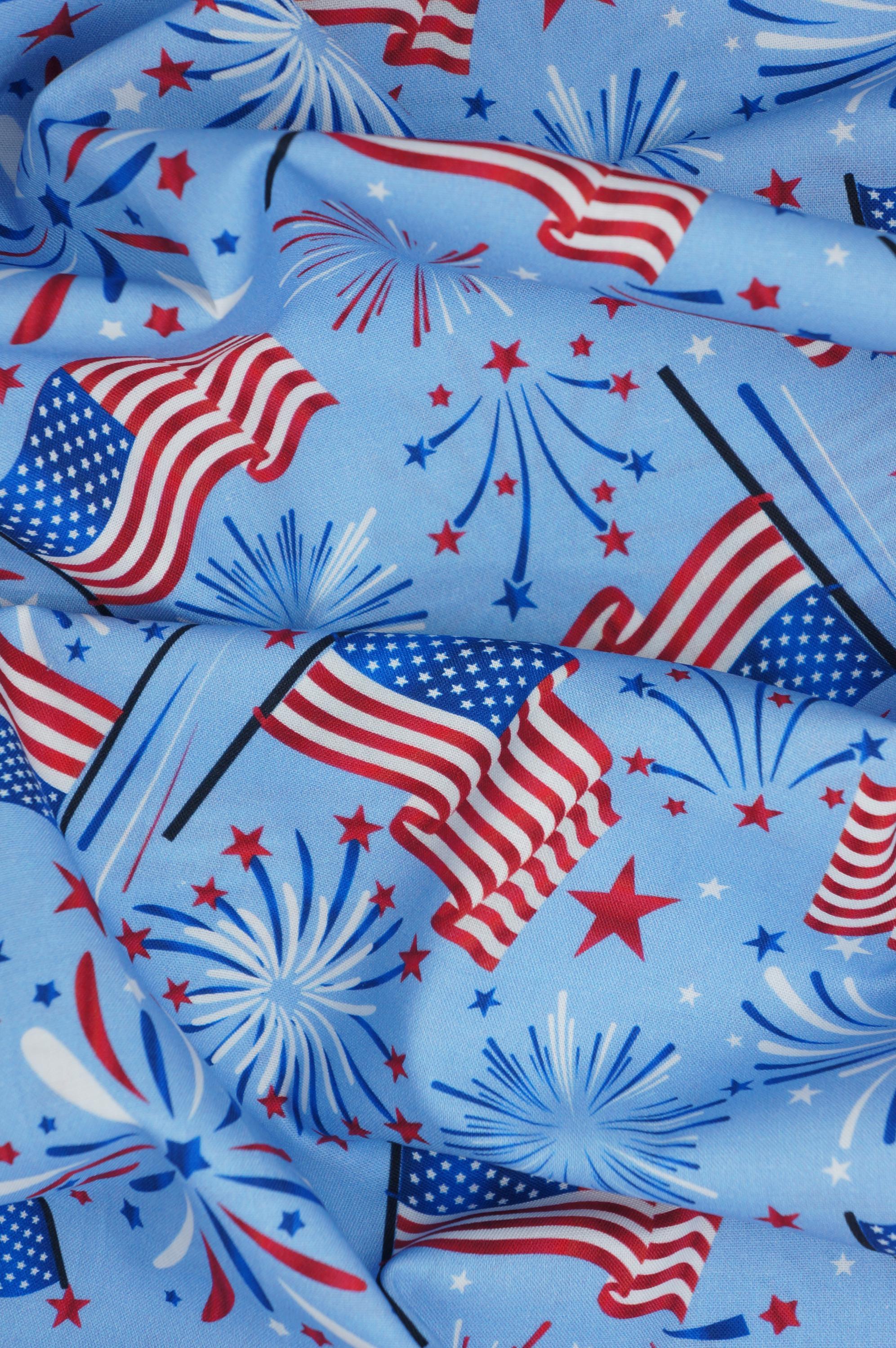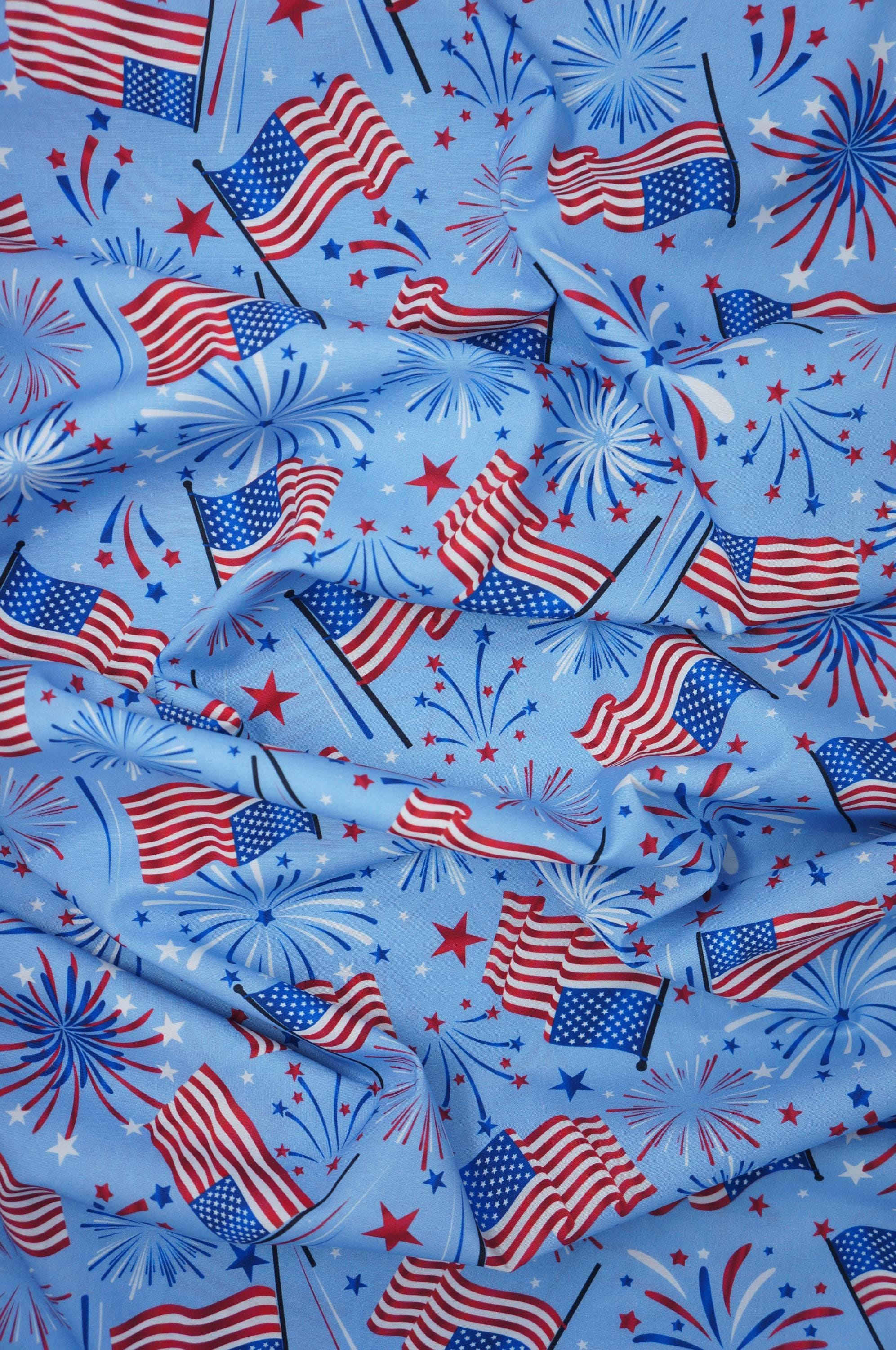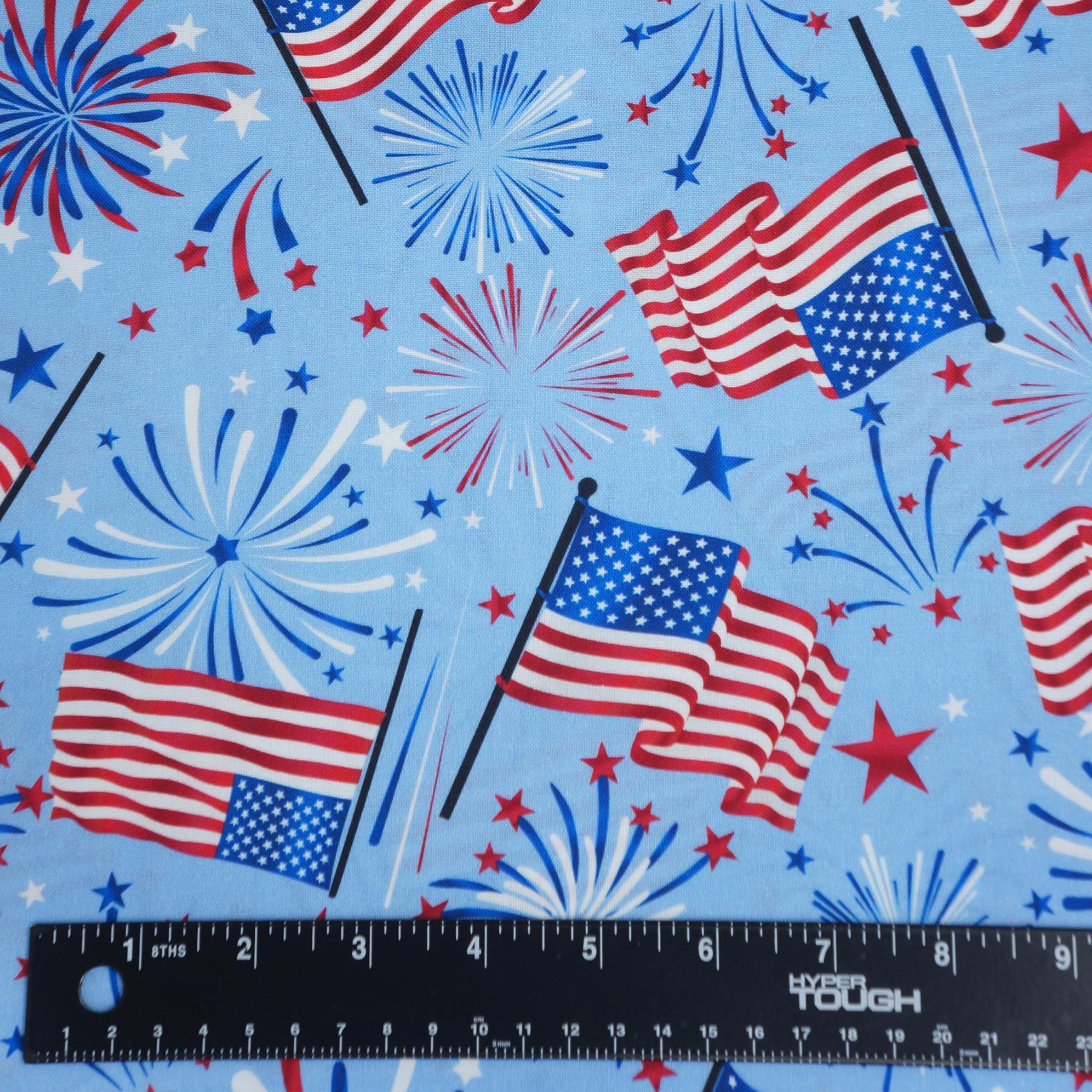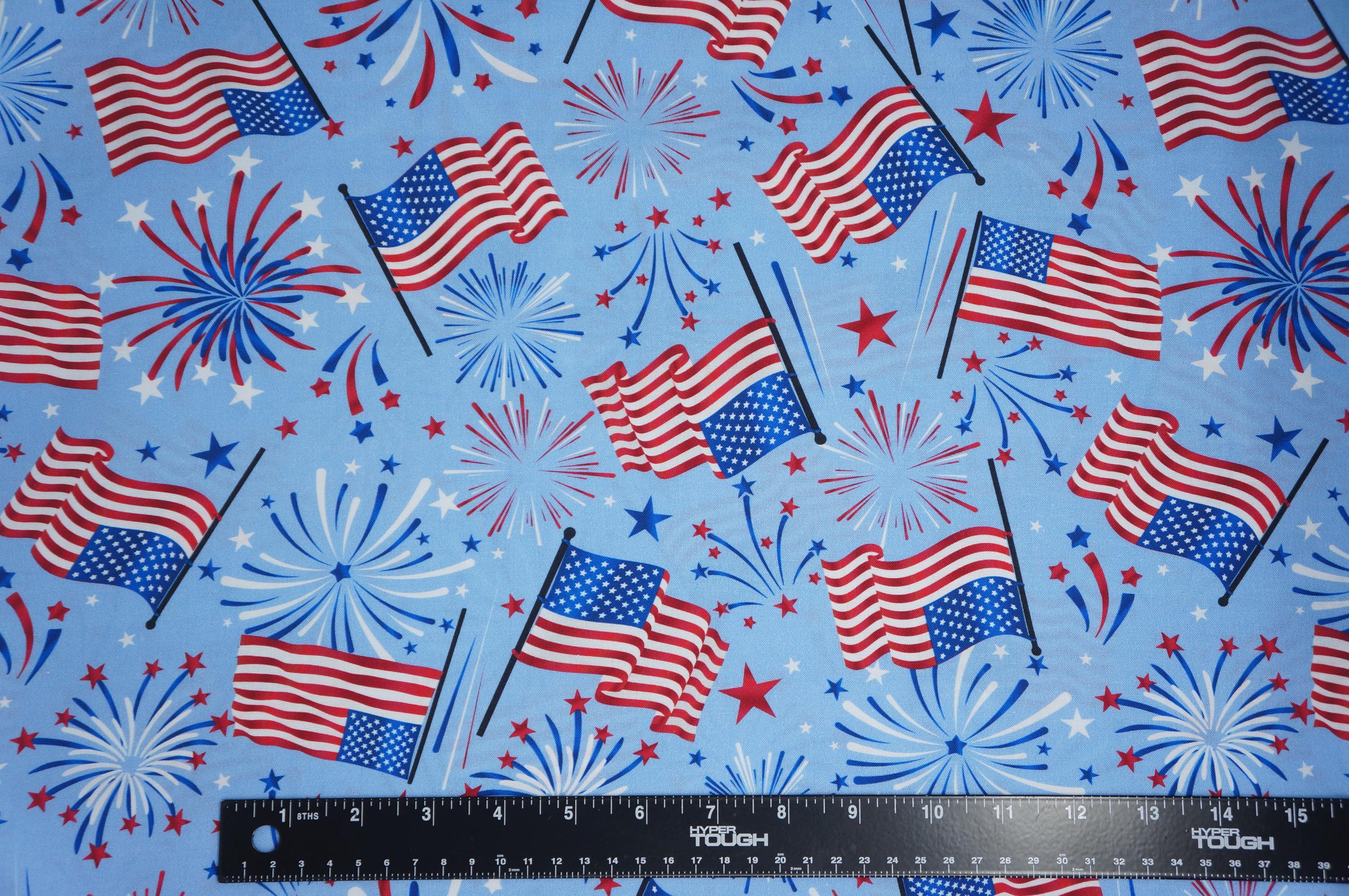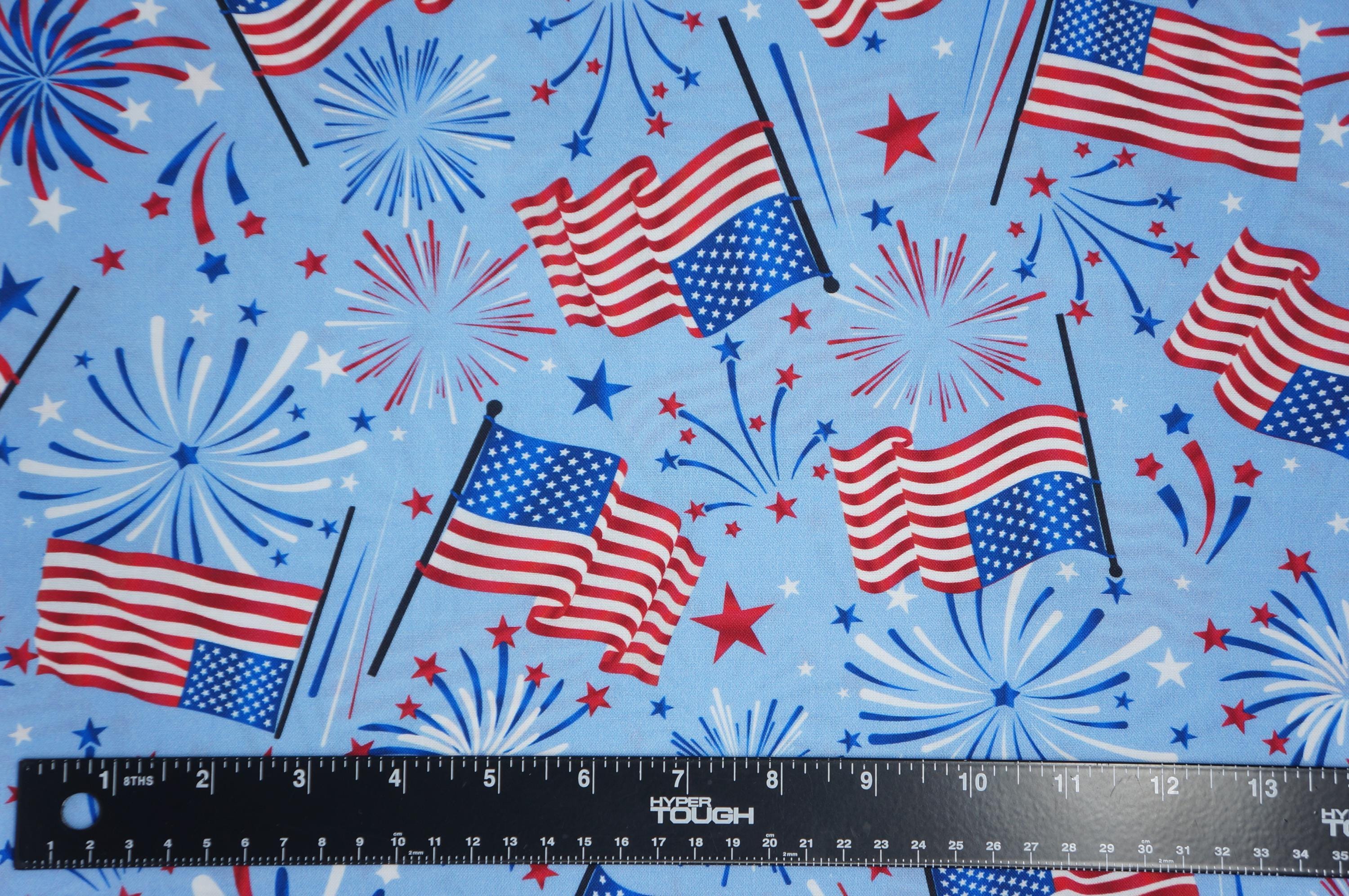 Celebrate Independence Day with this patriotic flag and fireworks on medium blue quilting cotton fabric designed by Gretta Lynn for Benartex! This fabric is from the True Heros collection and is perfect for making quilts, pillows, table runners, napkins, and more. It is 100% high quality quilting cotton and easy to sew and wash. The fabric features American flags, fireworks and stars scattered on a medium blue background, creating a festive and fun look. Whether you want to decorate your home, make a gift for someone special, or show your love for the USA, this fabric is a great choice. Order yours today and get ready for the 4th of July!