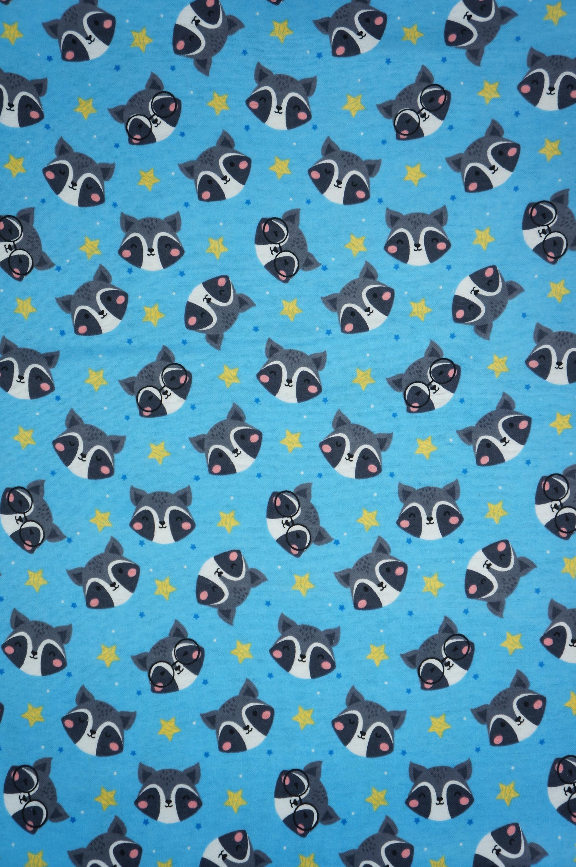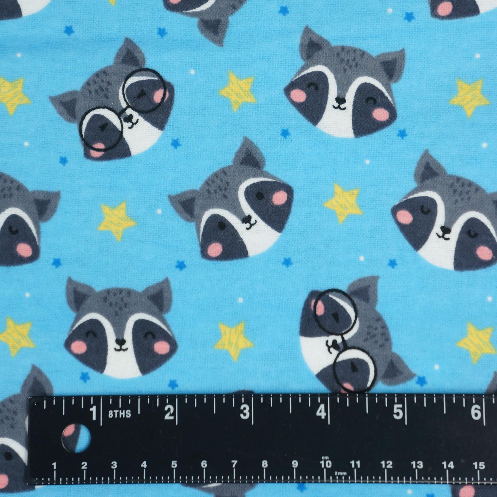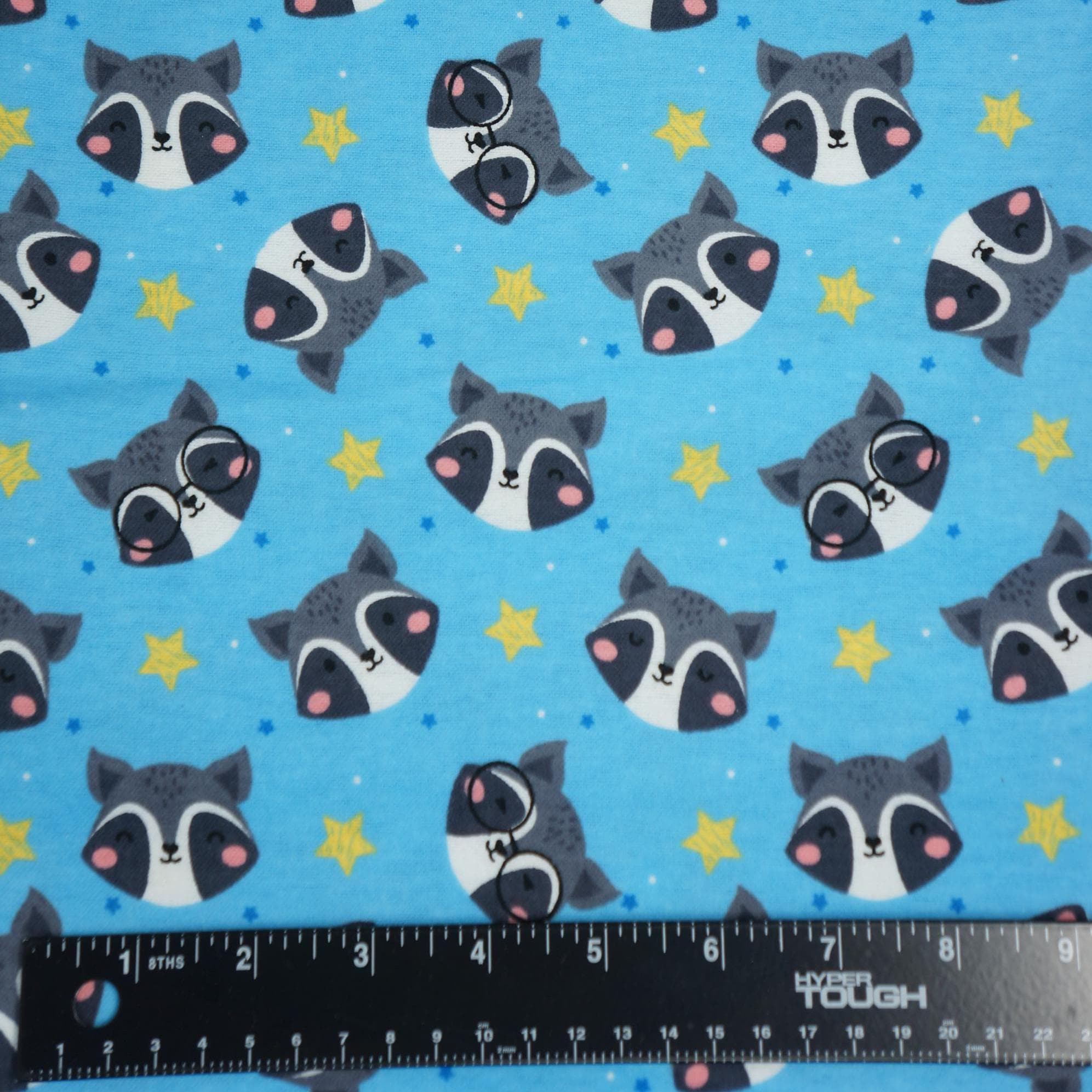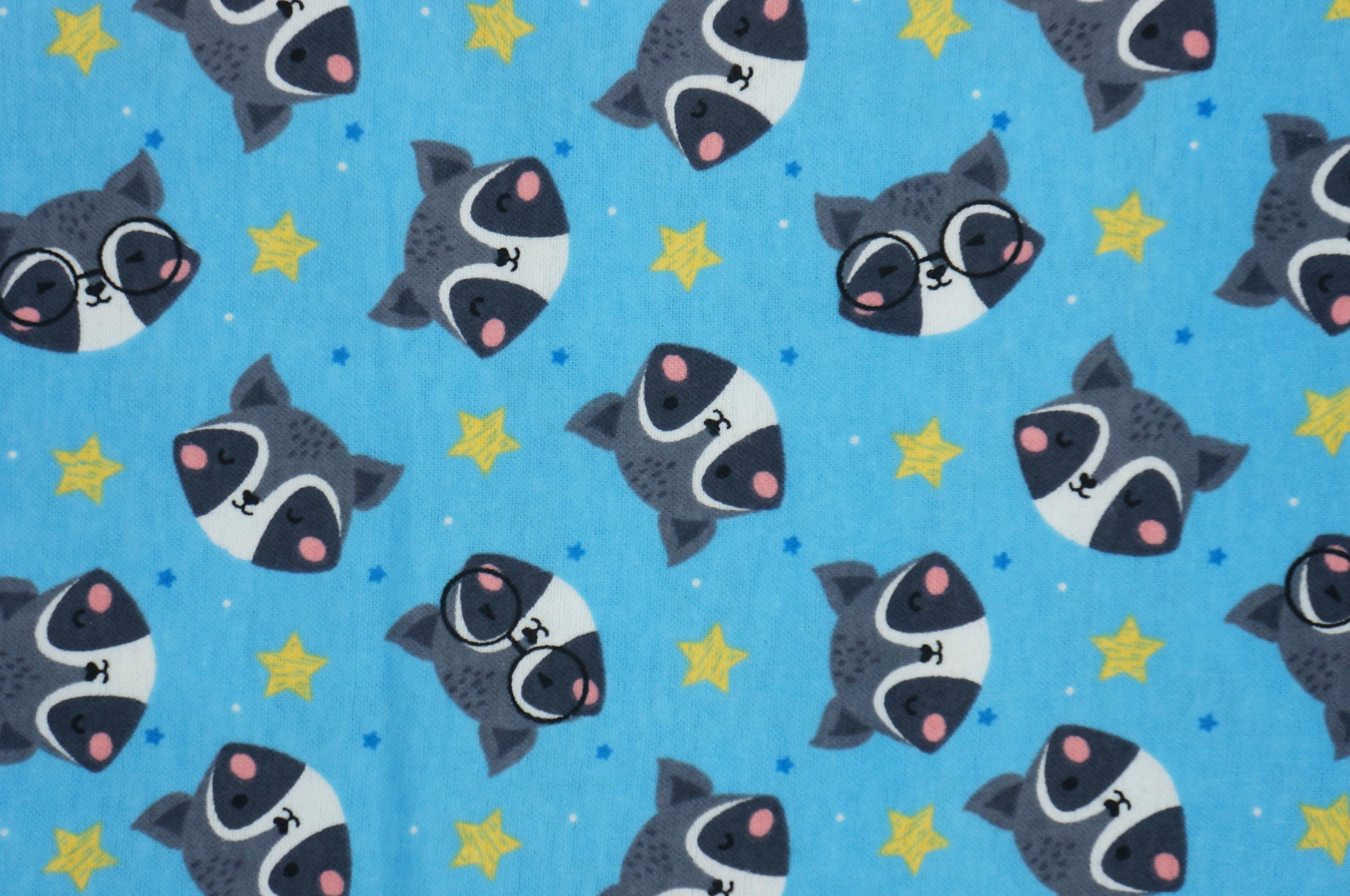 Get ready to add some playful charm to your next sewing project with this Raccoon flannel fabric by David Textiles! This delightful fabric features cute raccoon faces wearing glasses on a light blue background with stars and dots. Whether you're crafting for a little one who loves all things raccoons or just want to inject some fun into your creations, this novelty cotton flannel fabric is perfect for quilts, swaddles, burp clothes, reusable paper towels, and home decor that’s sure to bring a smile to everyone’s face! Don't miss out on this quirky and adorable design—grab yours now and let your creativity run wild!