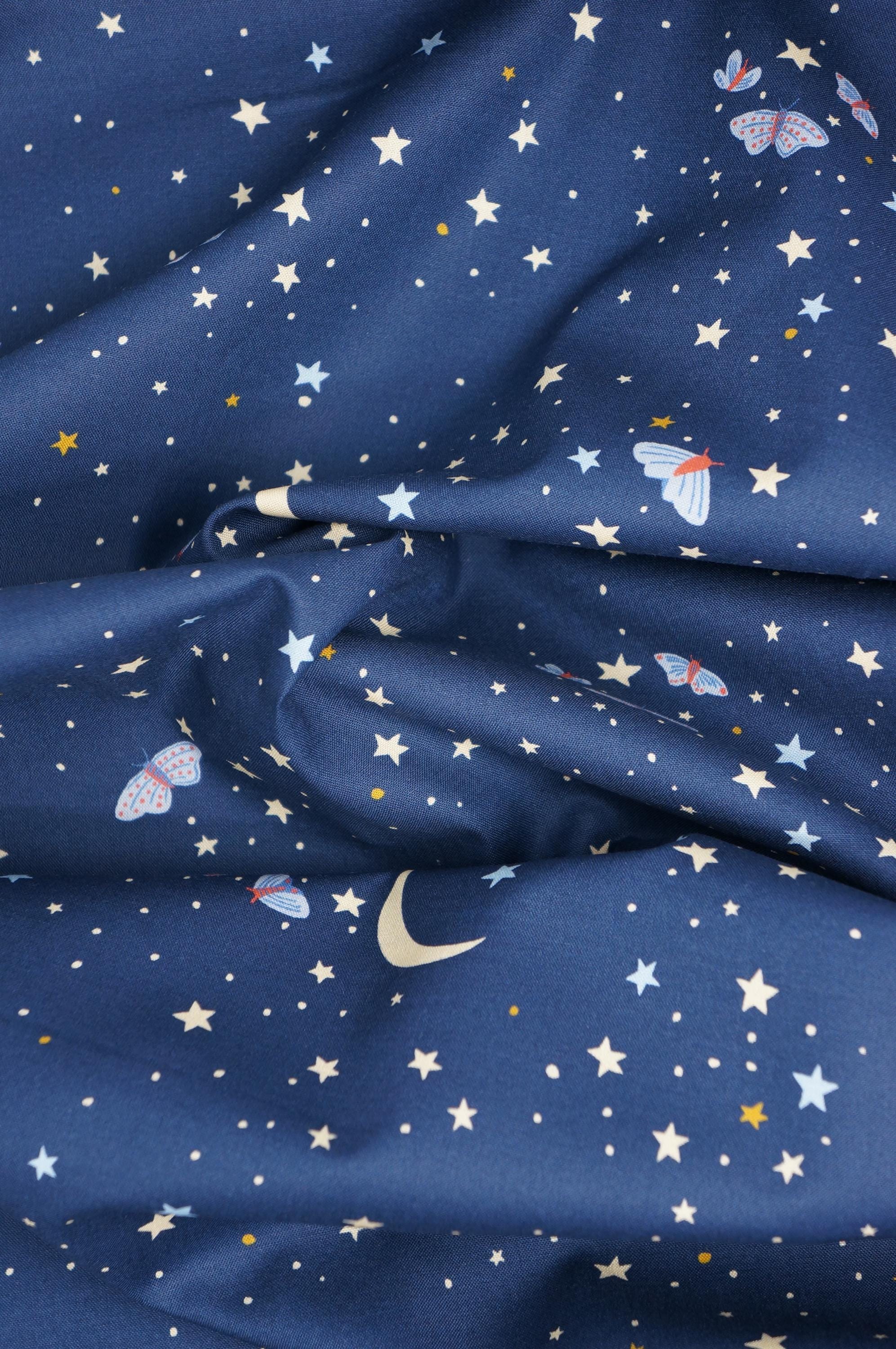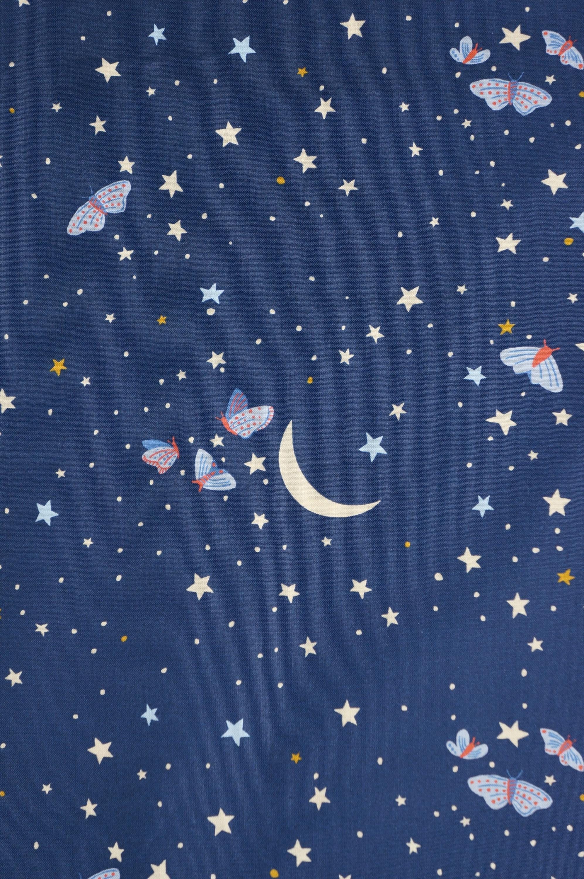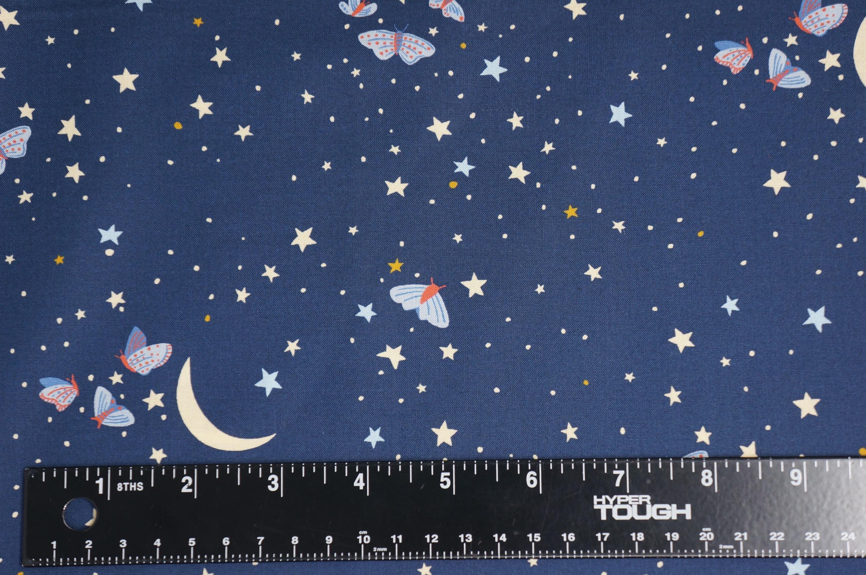 This enchanting organic quilting cotton fabric designed Jennifer Moore of Monaluna for Windham Fabrics captures the magic of a night under the moonlight, featuring a deep blue background that sets the scene for a celestial adventure. The design is adorned with delicate crescent moons and fluttering moths, all surrounded by a myriad of stars in various sizes and colors, creating a whimsical and dreamy atmosphere. Perfect for crafting projects that require a touch of nighttime wonder, this fabric's intricate pattern and soft color palette make it a versatile choice for both children's and adult-themed creations.