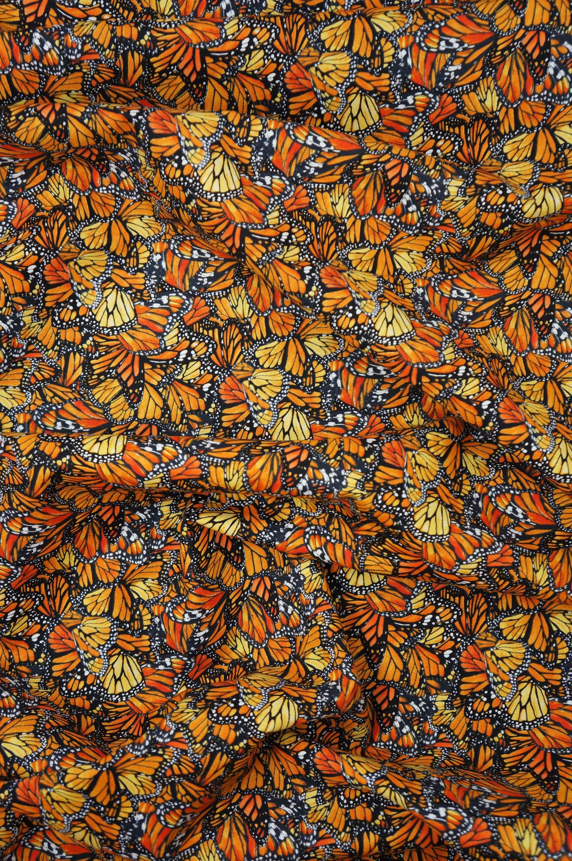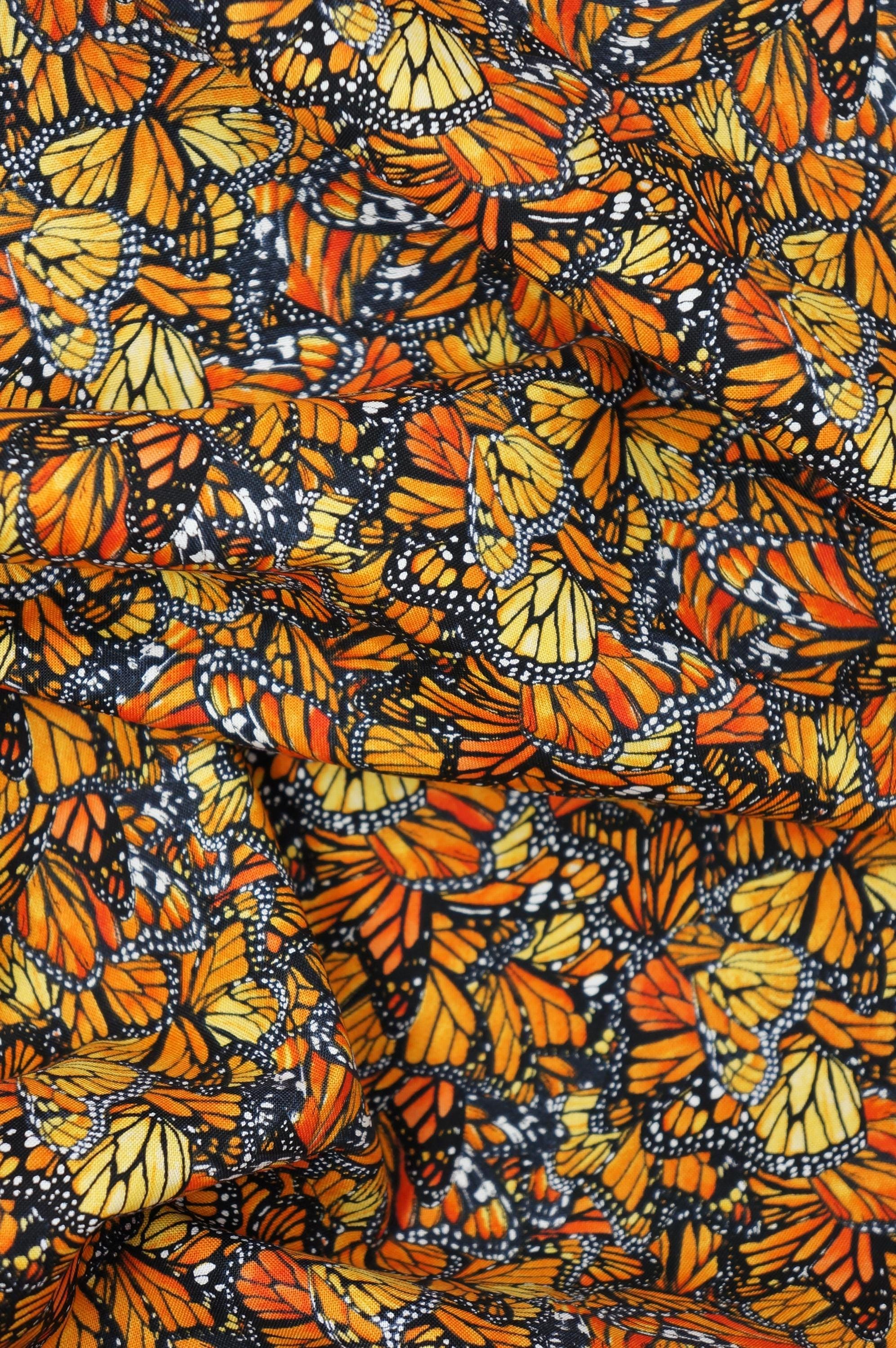If you love monarch butterflies, you will adore this Monarch Butterfly Dance Wings Quilting Cotton Fabric by Elizabeth Studios! This fabric features various orange and black monarch butterfly wing designs packed onto every inch of this fabric. It is perfect for quilting, sewing, crafting, and more. This fabric is made of high-quality cotton that is easy wash and sew. Create your own beautiful projects with this stunning butterfly fabric!