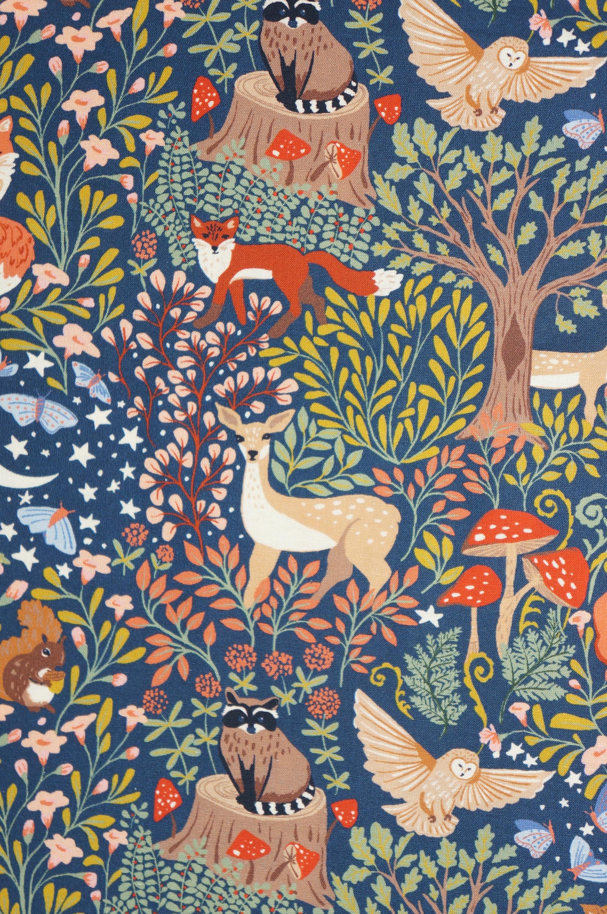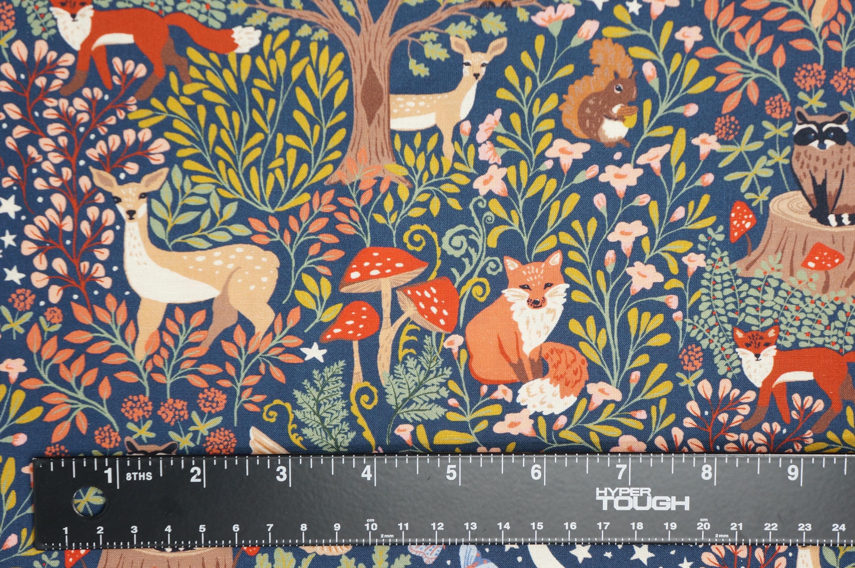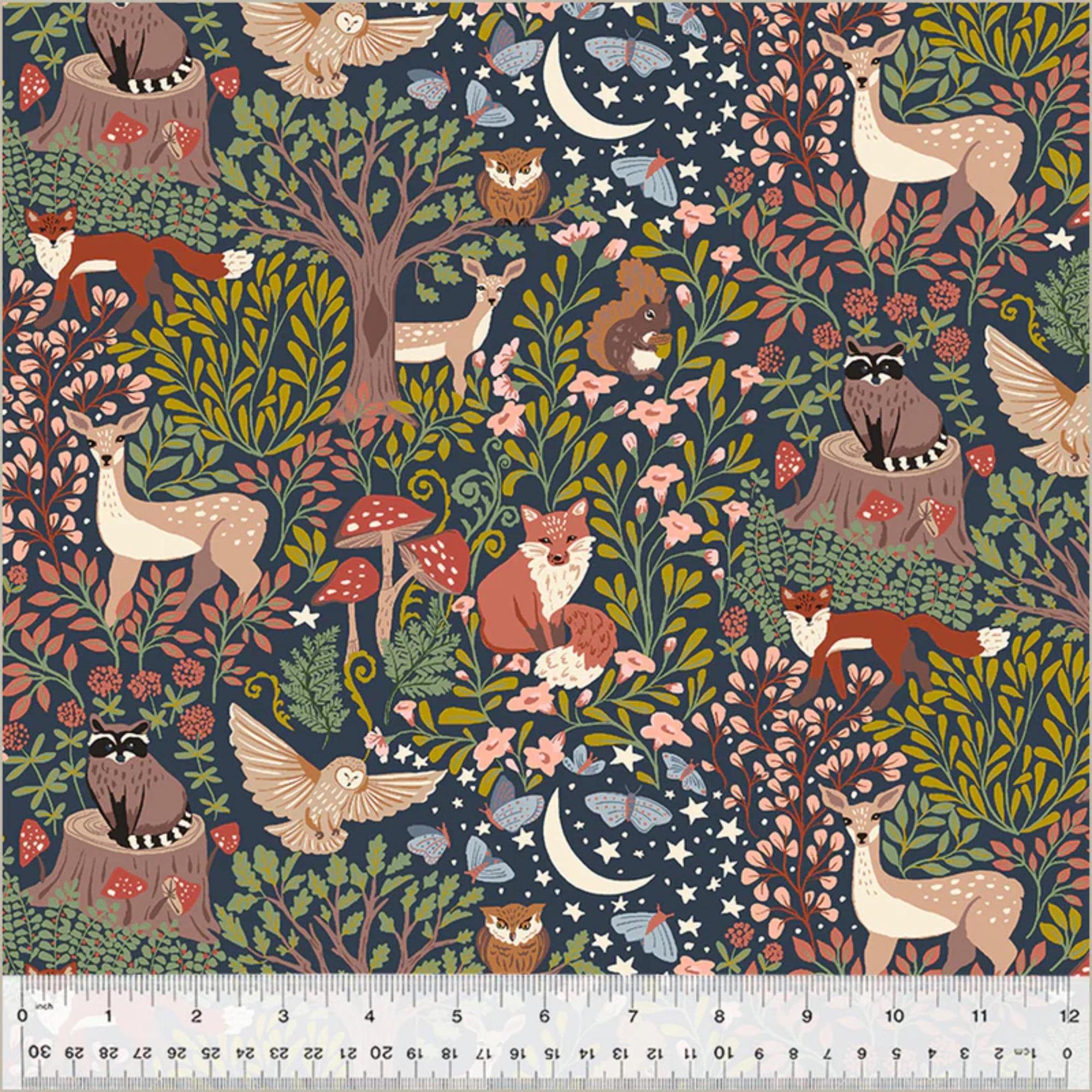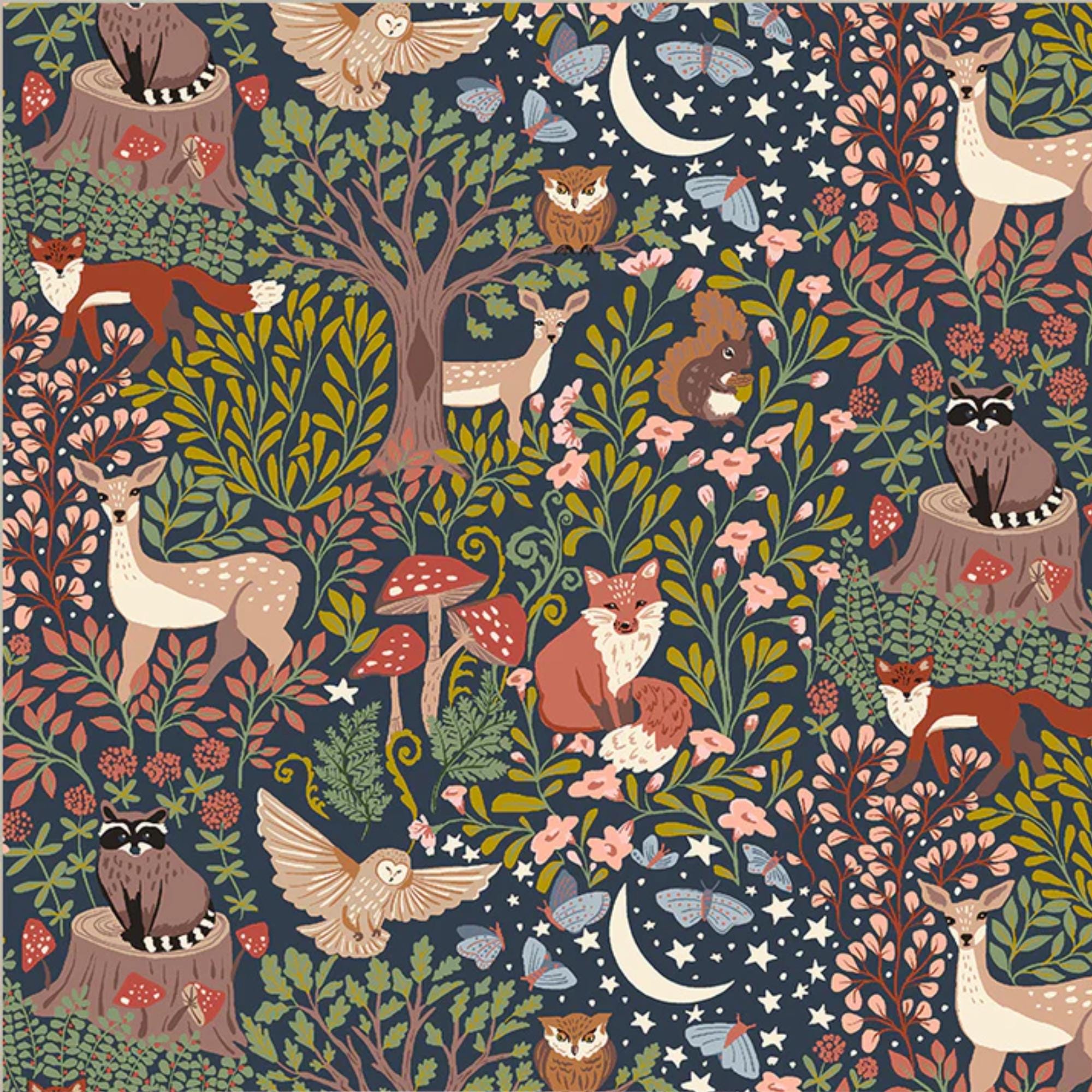 This enchanting organic quilting cotton fabric designed Jennifer Moore of Monaluna for Windham Fabrics transports you into a mystical forest at night, where the magic of nature comes alive. The scene is filled with a variety of woodland creatures including foxes, deer, raccoons, and owls, all set against a backdrop of lush trees, blooming flowers, and whimsical elements like stars, moons, and butterflies. The rich, deep navy-blue background contrasts beautifully with the vibrant colors of the flora and fauna, creating a captivating and serene atmosphere perfect for any project that seeks to bring a touch of enchantment