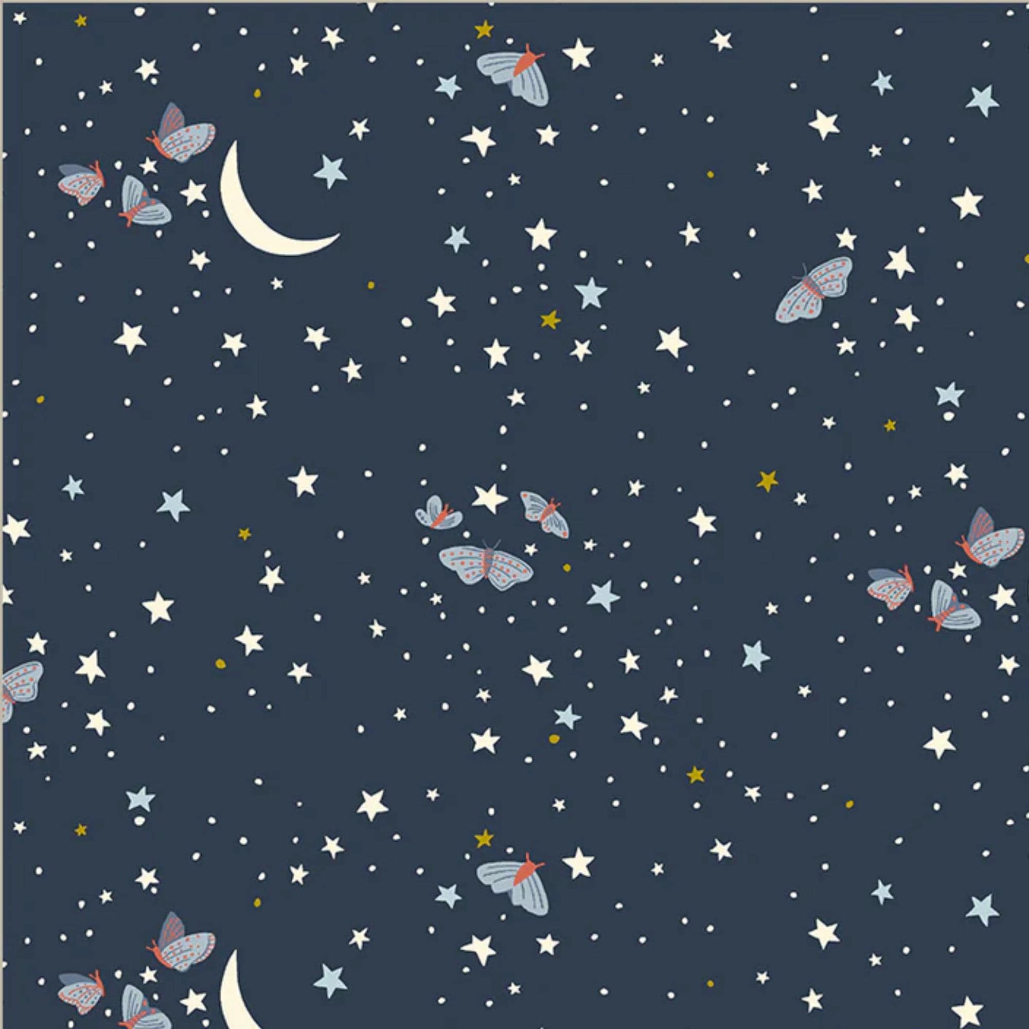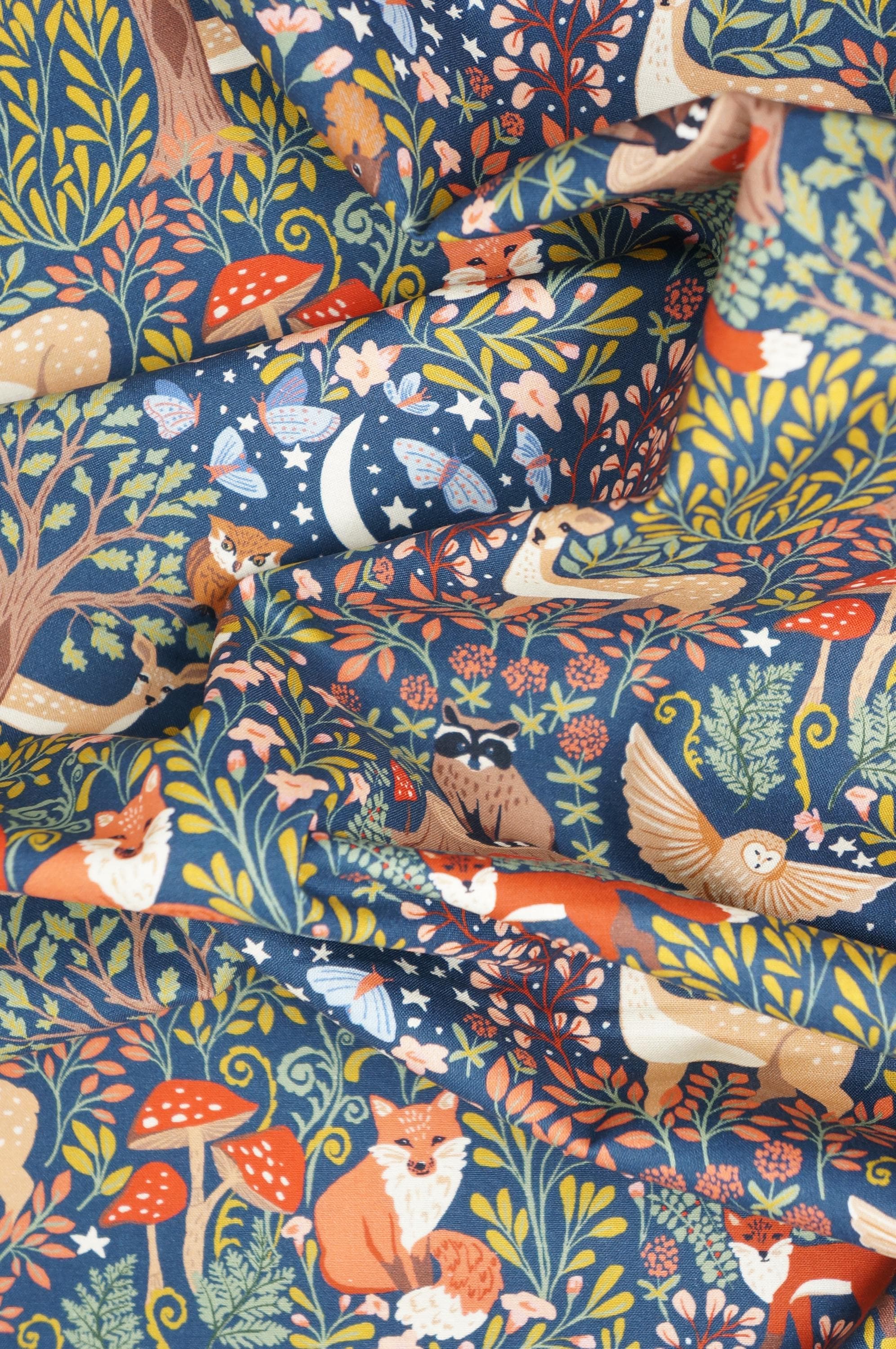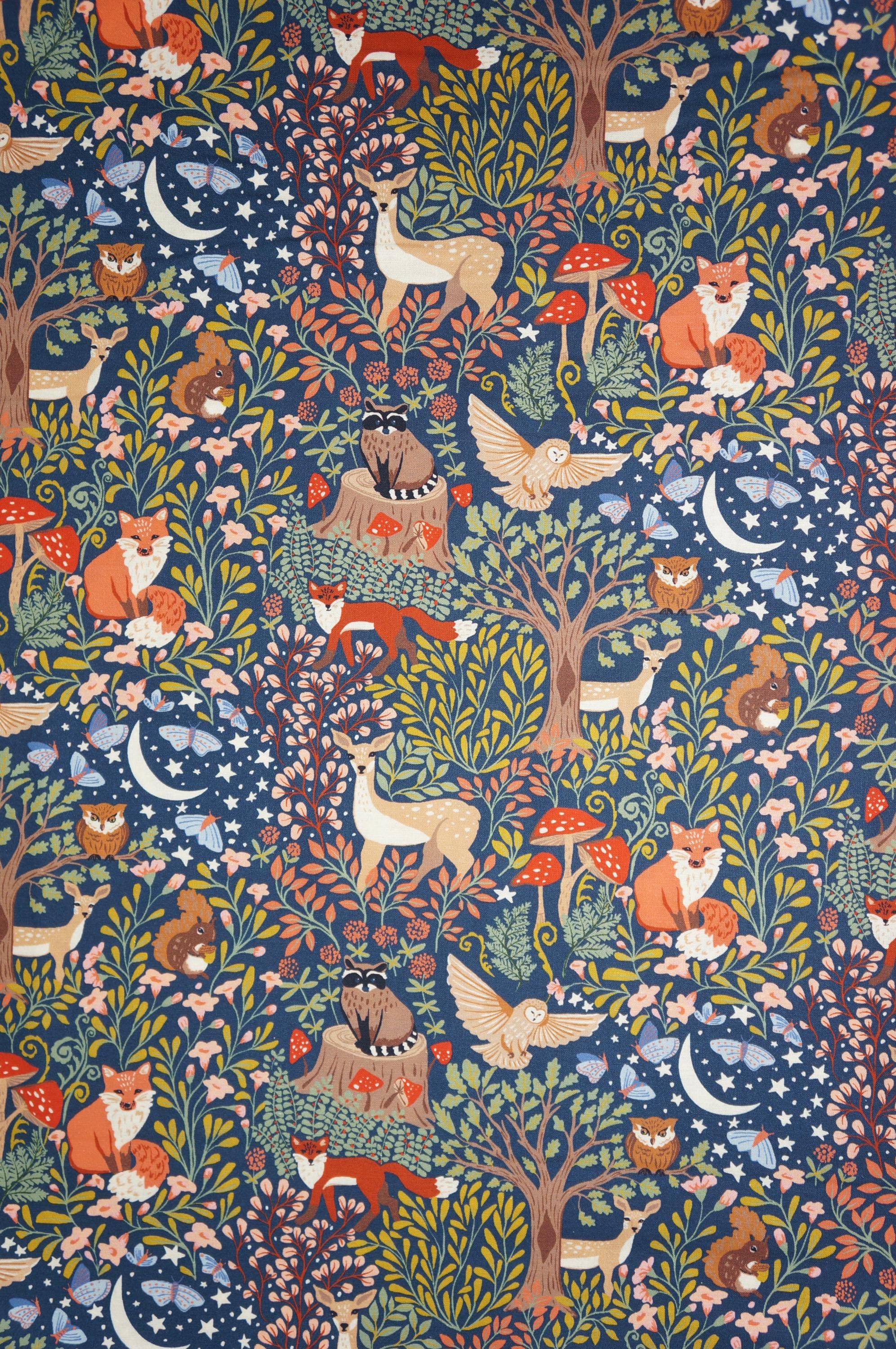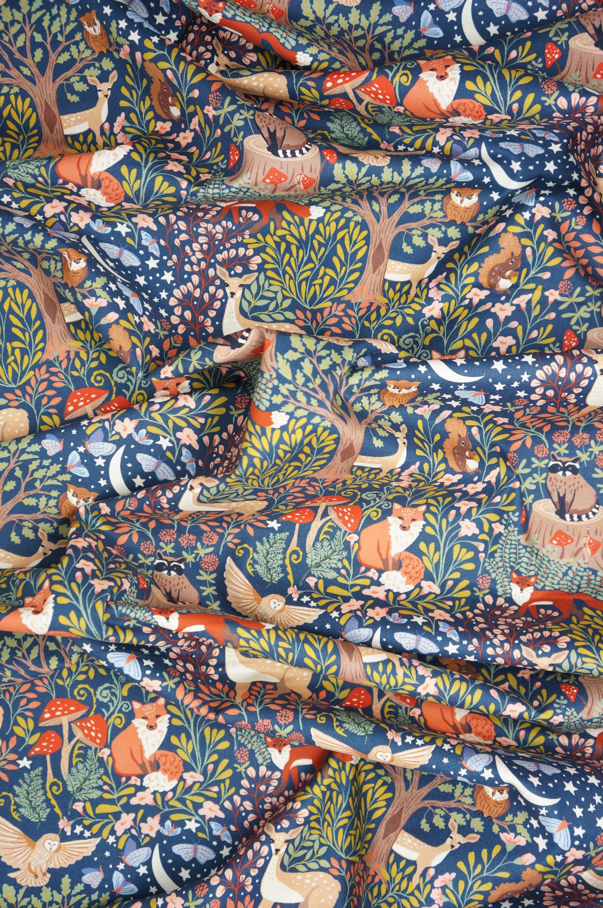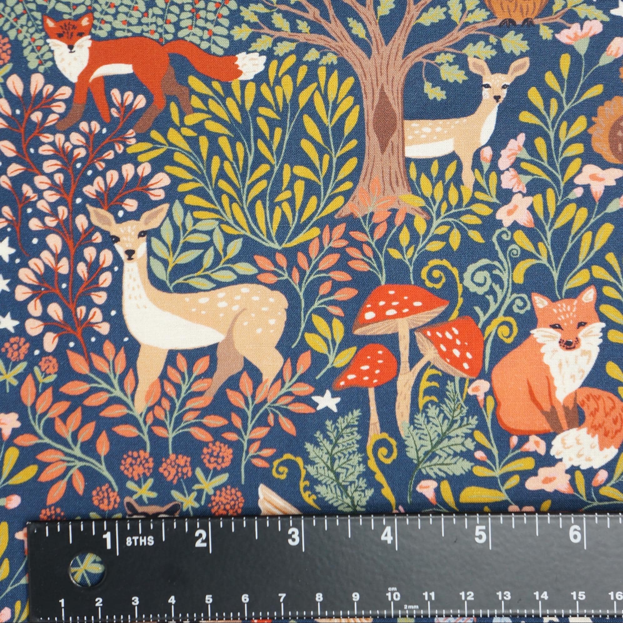 This enchanting organic quilting cotton fabric designed Jennifer Moore of Monaluna for Windham Fabrics transports you into a mystical forest at night, where the magic of nature comes alive. The scene is filled with a variety of woodland creatures including foxes, deer, raccoons, and owls, all set against a backdrop of lush trees, blooming flowers, and whimsical elements like stars, moons, and butterflies. The rich, deep navy-blue background contrasts beautifully with the vibrant colors of the flora and fauna, creating a captivating and serene atmosphere perfect for any project that seeks to bring a touch of enchantment