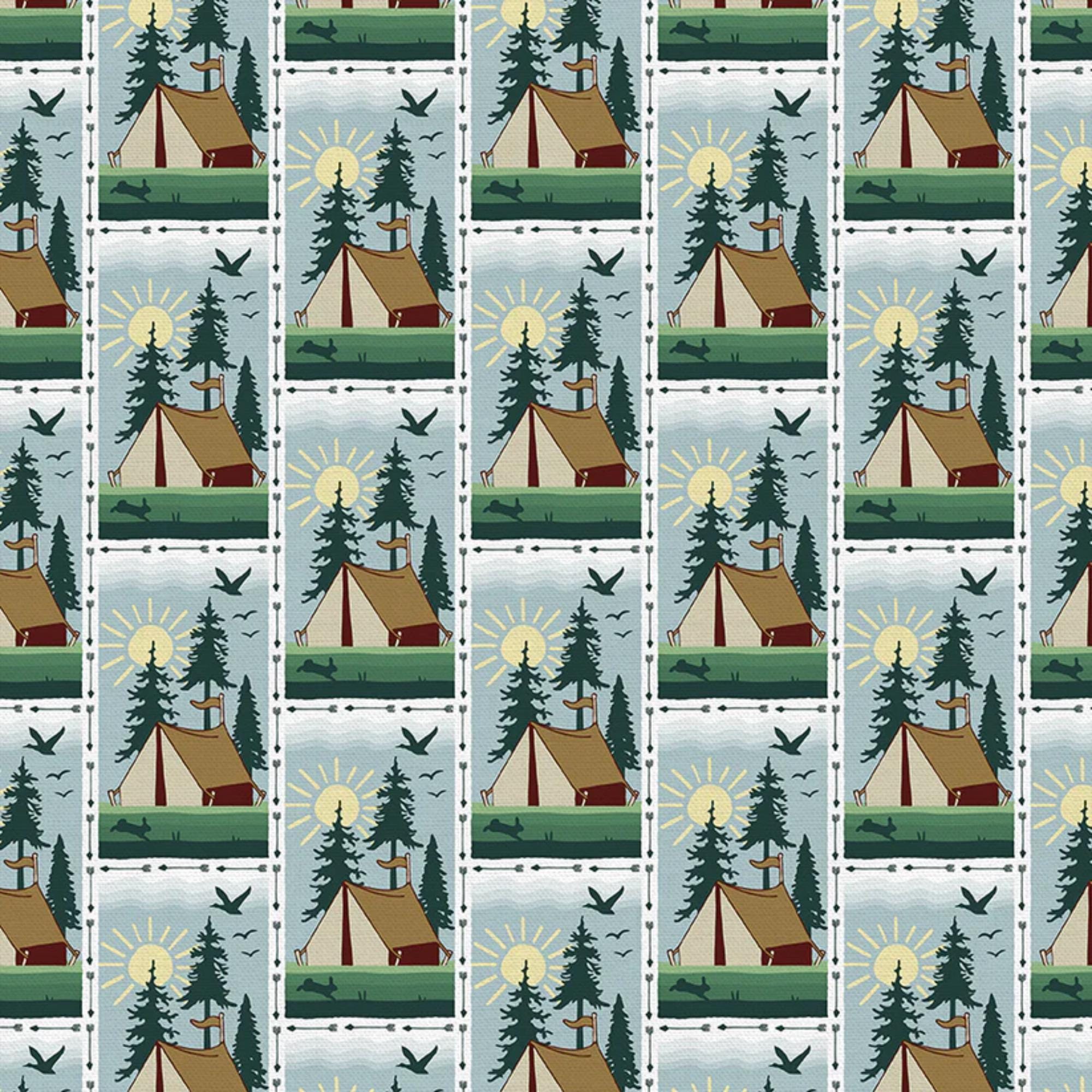 Hunter's Haven Campsite Scene is a vibrant quilting cotton fabric by Paintbrush studio that showcases a charming campsite scene, featuring vintage-style tents nestled among tall pine trees with the sun radiating behind them. The design is playful and nostalgic, with birds flying around, adding a touch of whimsy to the serene outdoor setting. The pattern repeats in a grid layout, providing a cohesive and visually appealing look perfect for various crafting projects.