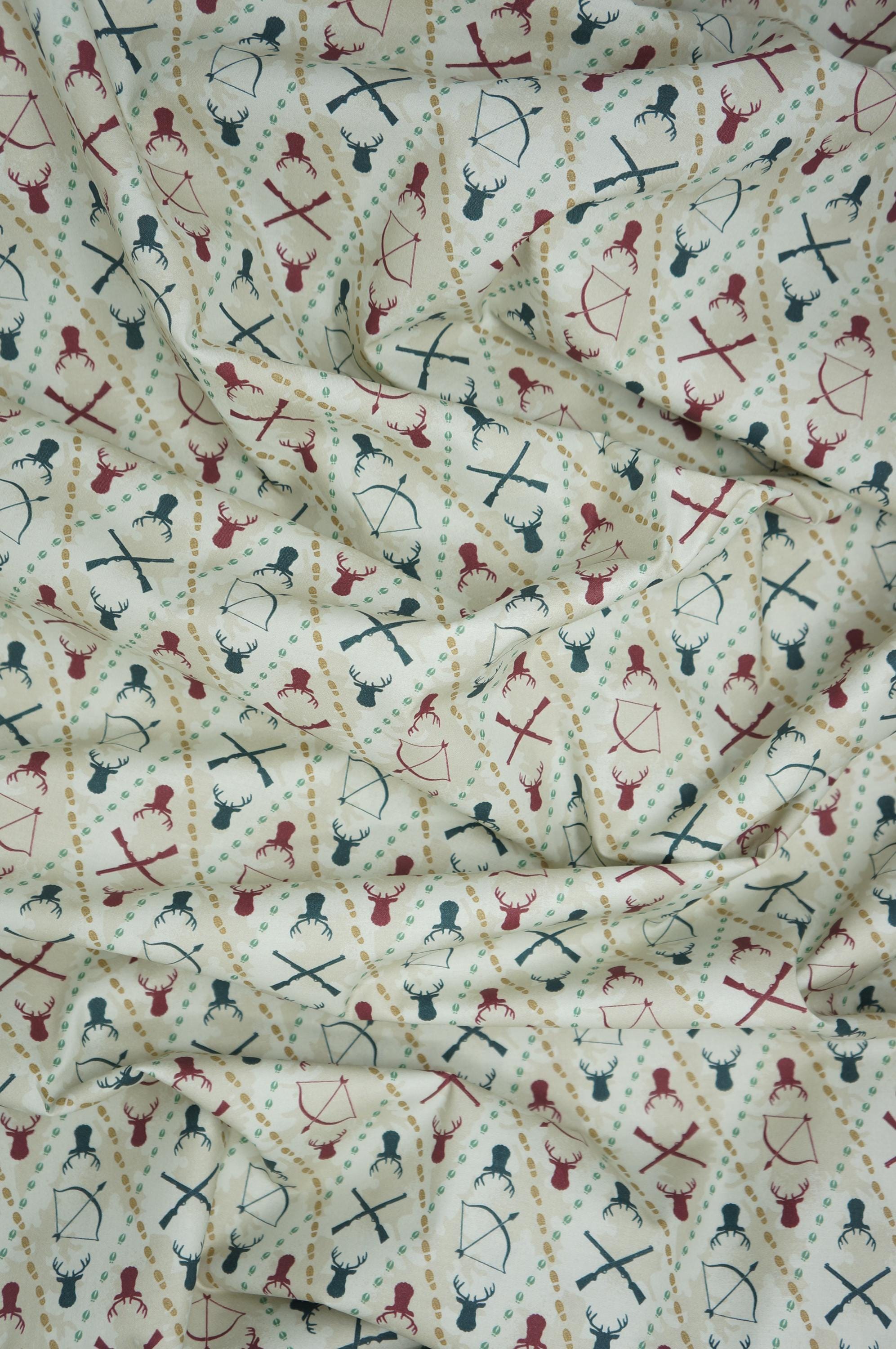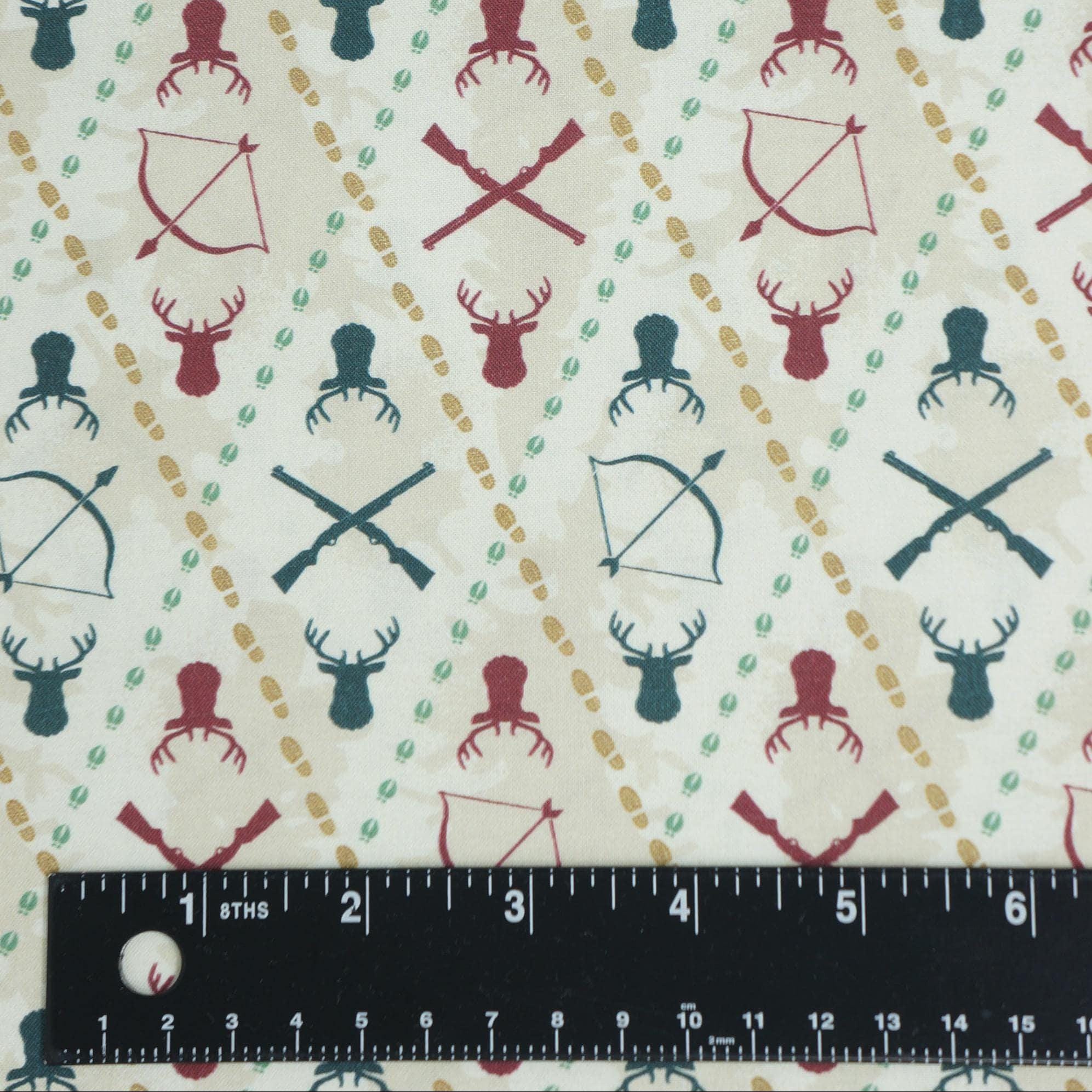 Hunter's Haven is a vibrant quilting cotton fabric by Paintbrush studio features a charming and rustic design with a pattern of bows, arrows, and deer silhouettes, creating a vintage hunting theme. The design is set on a light beige background with tone-on-tone shadows of evergreen trees and leaves, with the motifs in shades of dark green, red, and brown, arranged in a diamond grid pattern that adds a dynamic visual appeal. Ideal for quilting, apparel, or home decor projects, this fabric brings a touch of the outdoors into any project with its detailed and cohesive woodland aesthetic.