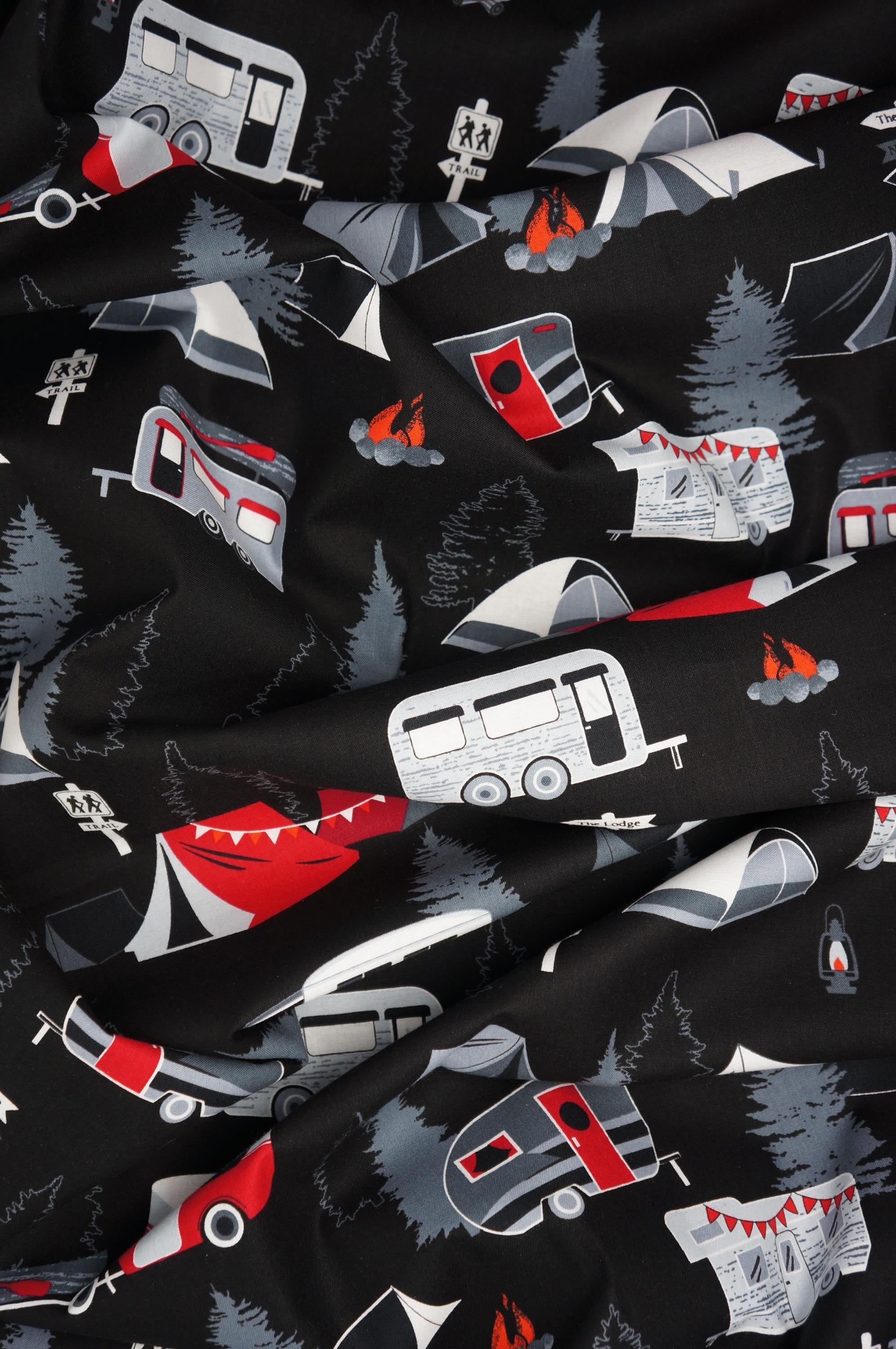 If you love camping and the great outdoors, you'll adore this Benartex quilting cotton fabric from the Great Outdoors Collection by Greta Lynn!! It features tents, campfires, campers, evergreens and other outdoor things on a black background in a color palette of black, gray, white and red. This fabric is made of high quality 100% cotton and is perfect for quilting, crafts, home decor, nurseries and more. You'll have so much fun creating projects with this whimsical and charming fabric. Order yours today and get ready for some woodland camping adventures!
